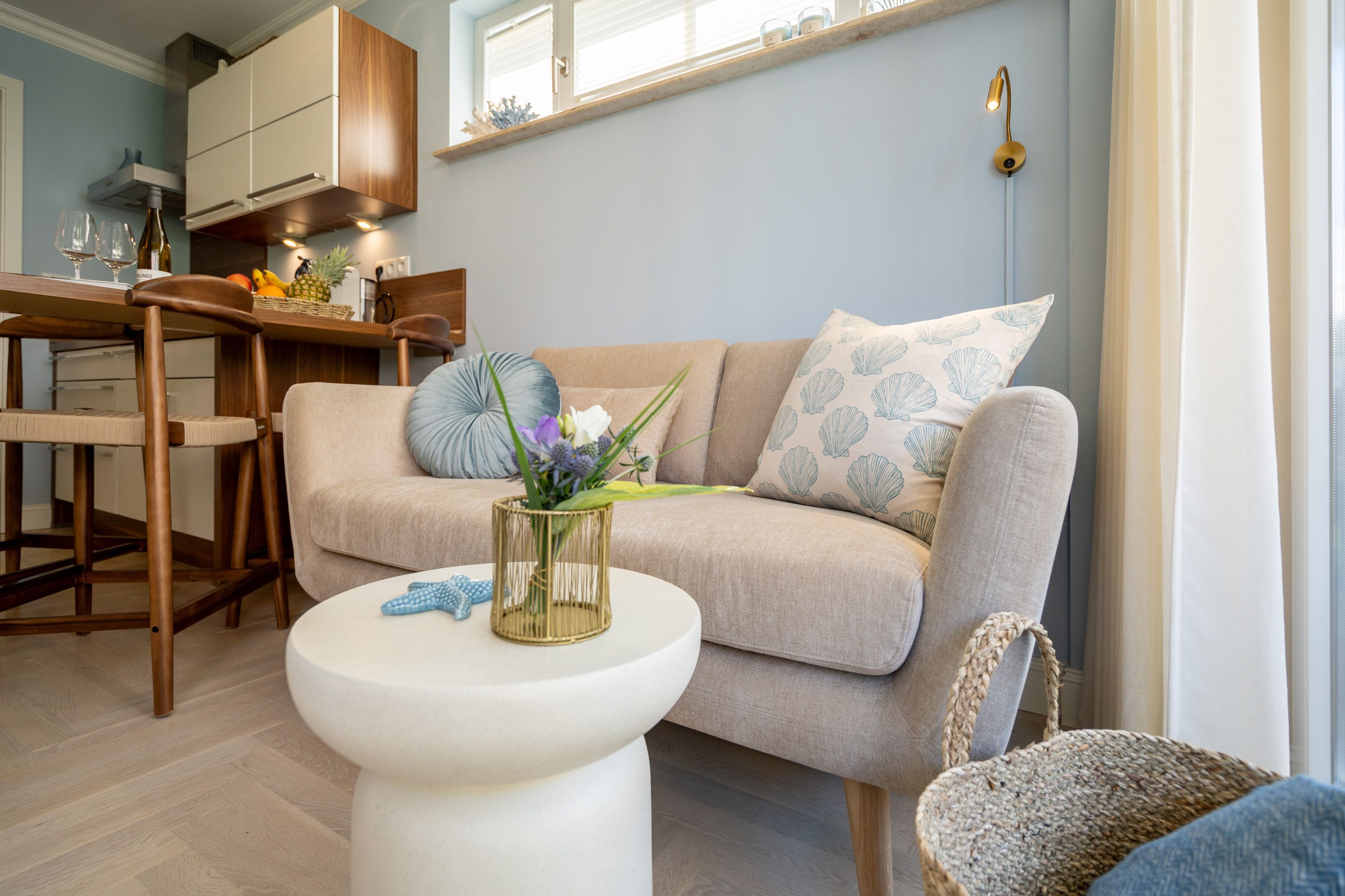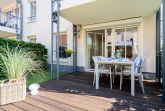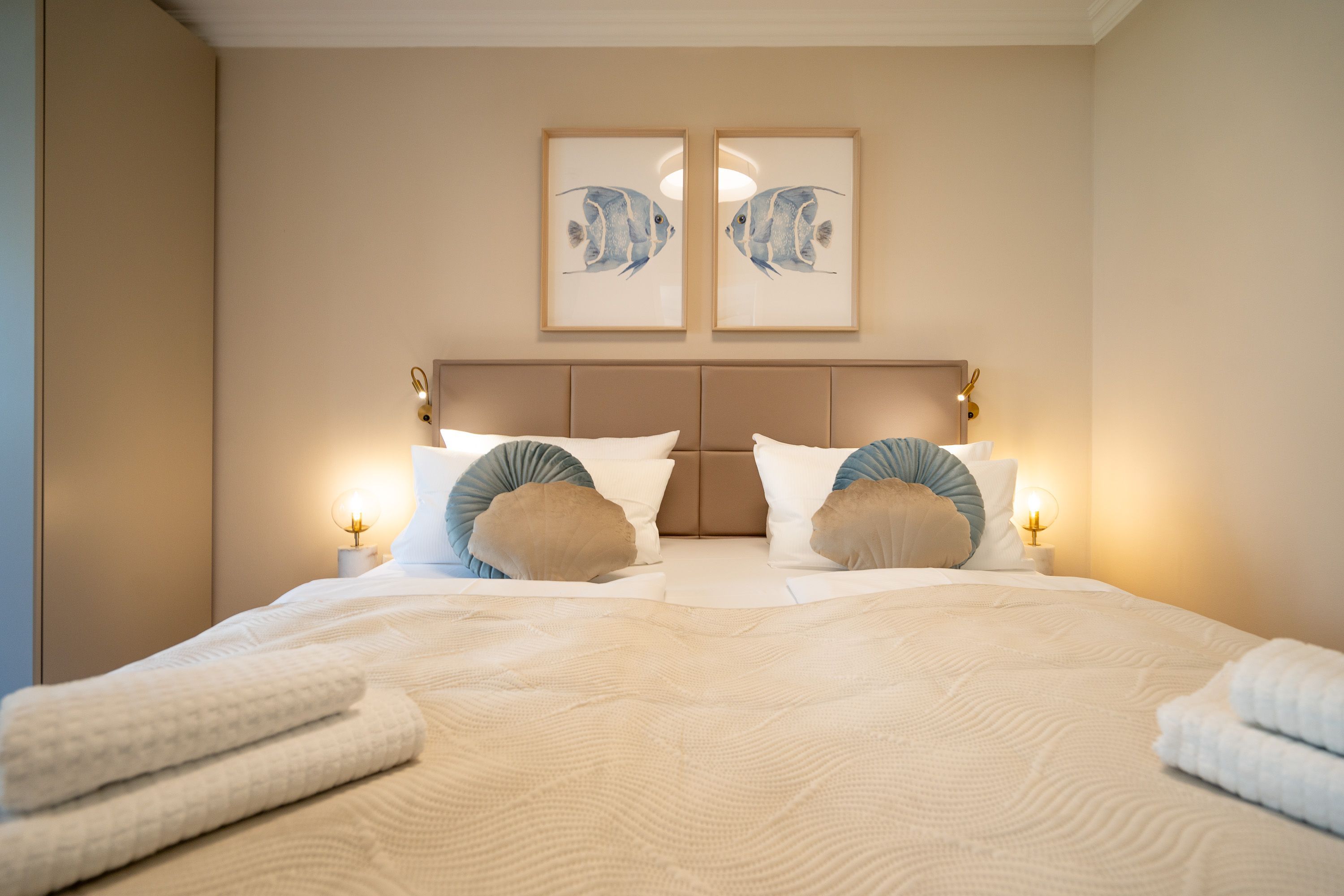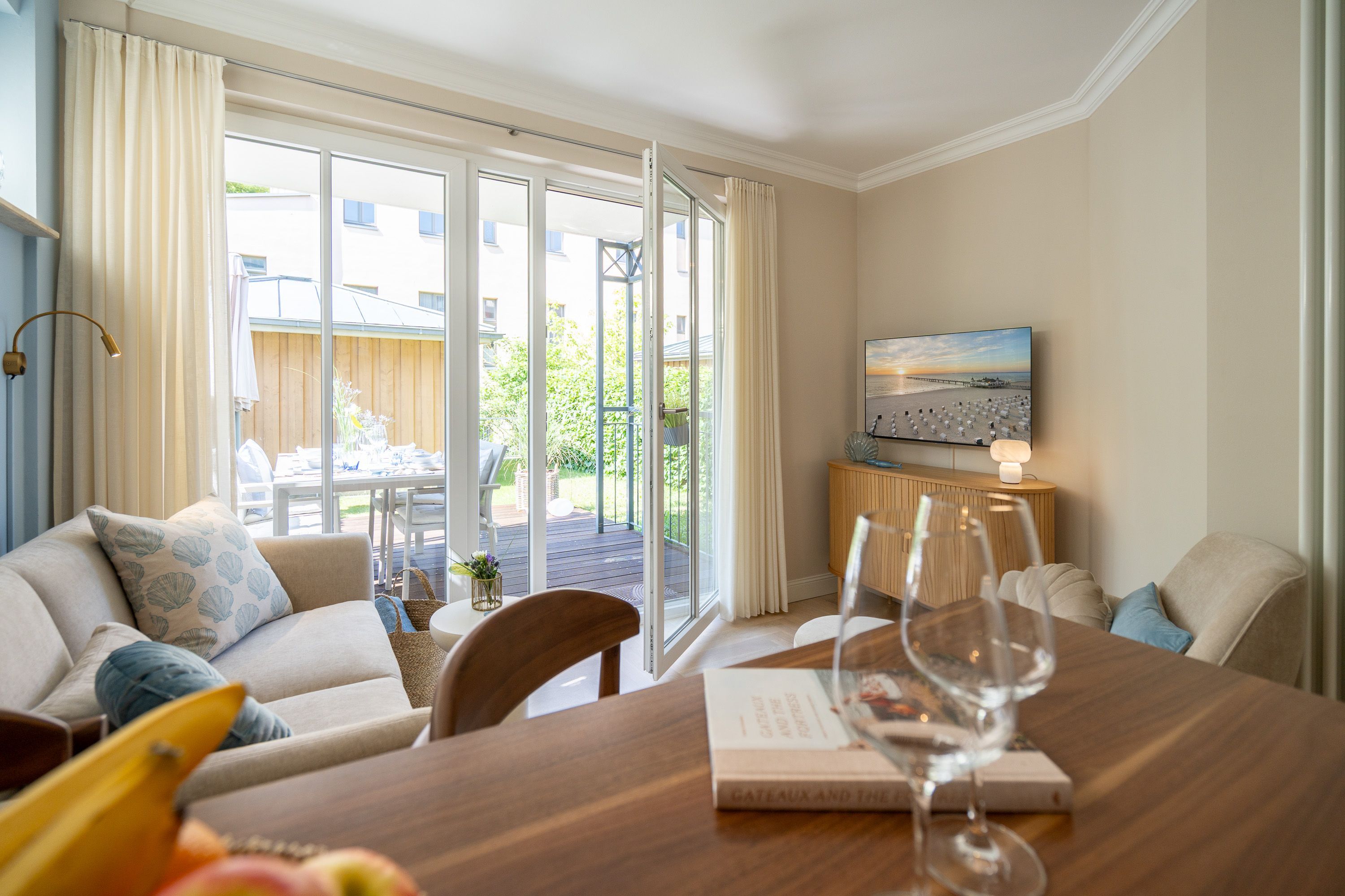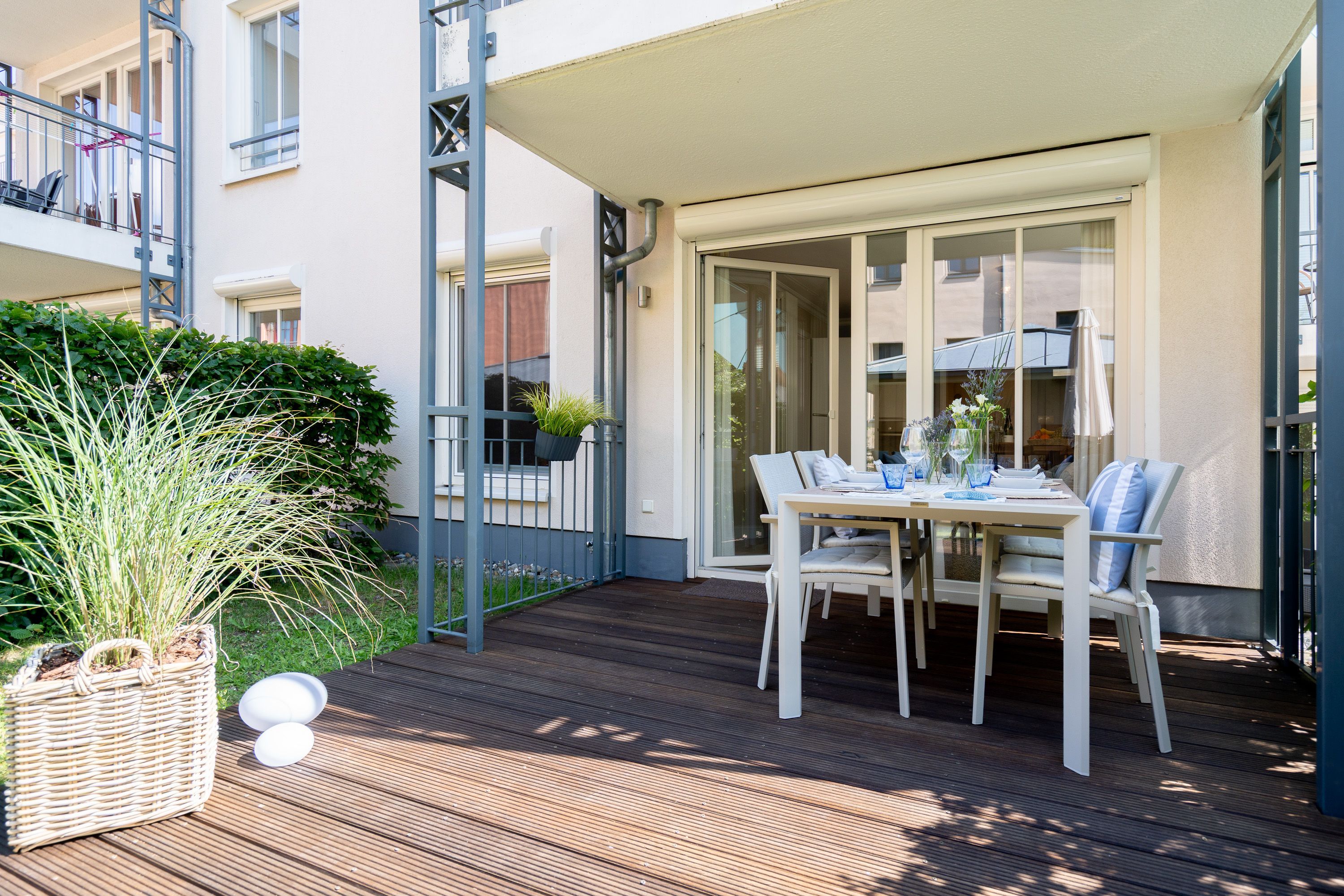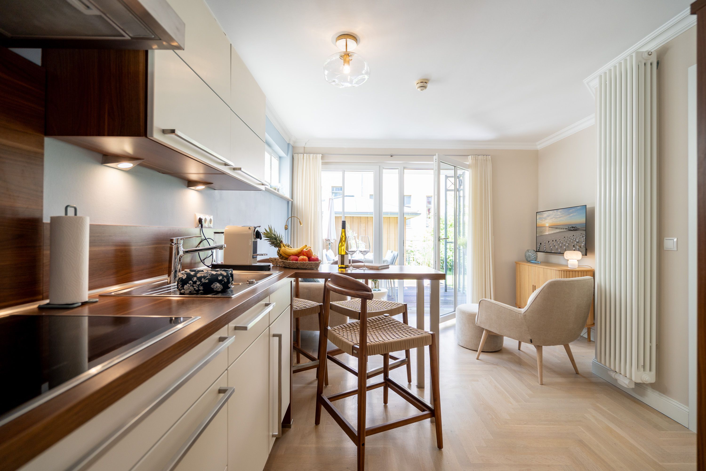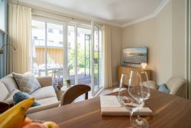 Klein aber fein! Die liebevoll eingerichtete 2-Raum-Ferienwohnung befindet sich im Erdgeschoss und ist 40 qm groß. Detailversessen wurde an alles gedacht, ein Wohnbereich mit Sitzgruppe und Flat-TV lädt zum Verweilen ein. Ergänzt wird es durch eine komplett ausgestattete Küchenzeile mit angrenzendem Essplatz. Ein Schlafzimmer mit Doppelbett (1,80m x 2m) und TV und elektrischen Jalousien sorgt für eine angenehme Nachtruhe. Für Ihren Komfort sind die Betten bei der Anreise bezogen und Handtücher liegen bereit (Erstausstattung). Sonnige Stunden verspricht die nach Süden ausgerichtete Terrasse mit Möblierung. Ein weiteres Highlight ist das exklusive Badezimmer mit integrierter Fußbodenheizung und Echtglas-Dusche. Perfekt für einen Urlaub zu zweit. Für Ihren PKW ist der Stellplatz Nr. 4 in der Tiefgarage reserviert.