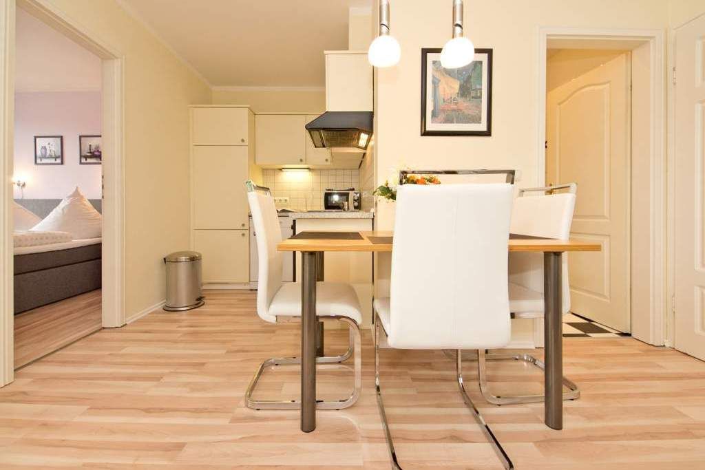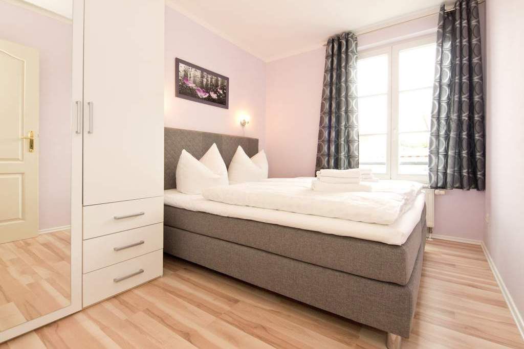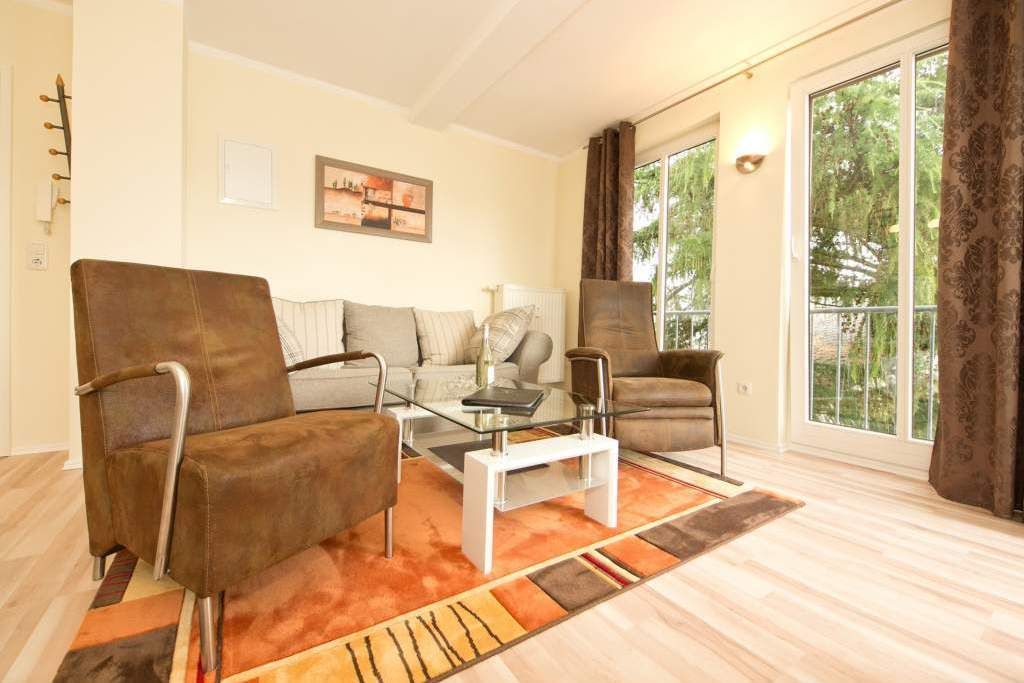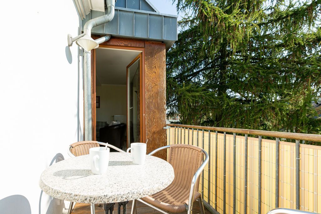 Die helle, freundliche Ferienwohnung befindet sich in der zweiten Etage des Hauses. Die vollständige Einrichtung mit geschmackvoller Möblierung und die liebevollen Dekorationen lassen keine Wünsche übrig. Der Wohnbereich mit bequemer Sitzgruppe & Flat-TV, die Küchenzeile mit angrenzendem Essplatz, zwei Schlafzimmer mit Boxspringbetten (1,60m x 2,00 m ), das Bad mit Dusche und der Balkon bieten bis für zu 4 Personen Platz zum Wohlfühlen. Auf dem Hof steht ein PKW-Stellplatz zur Verfügung. Das W-LAN im Haus kann kostenfrei genutzt werden.