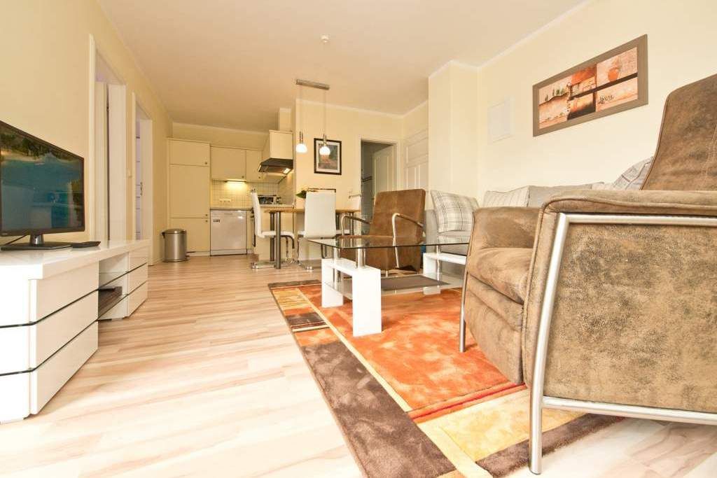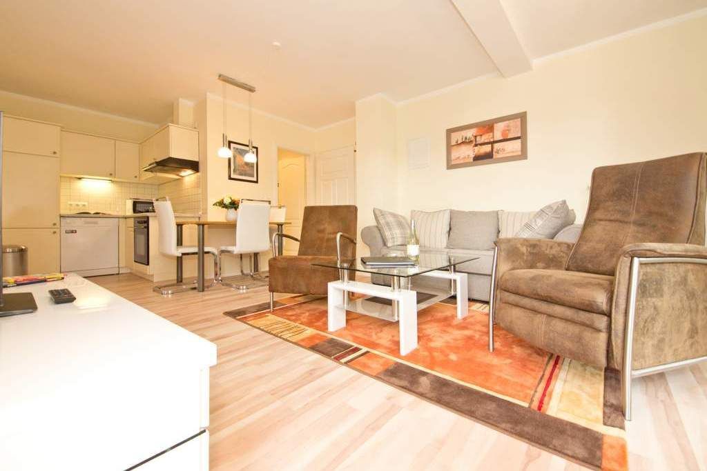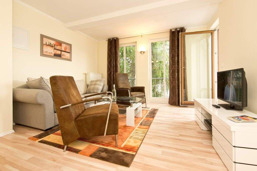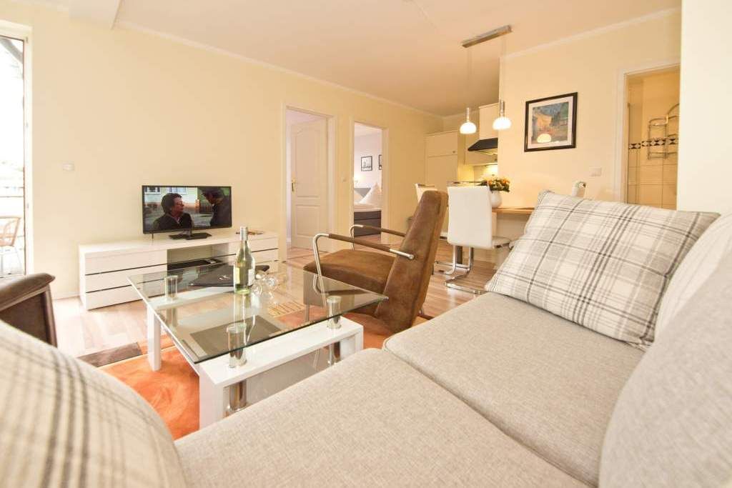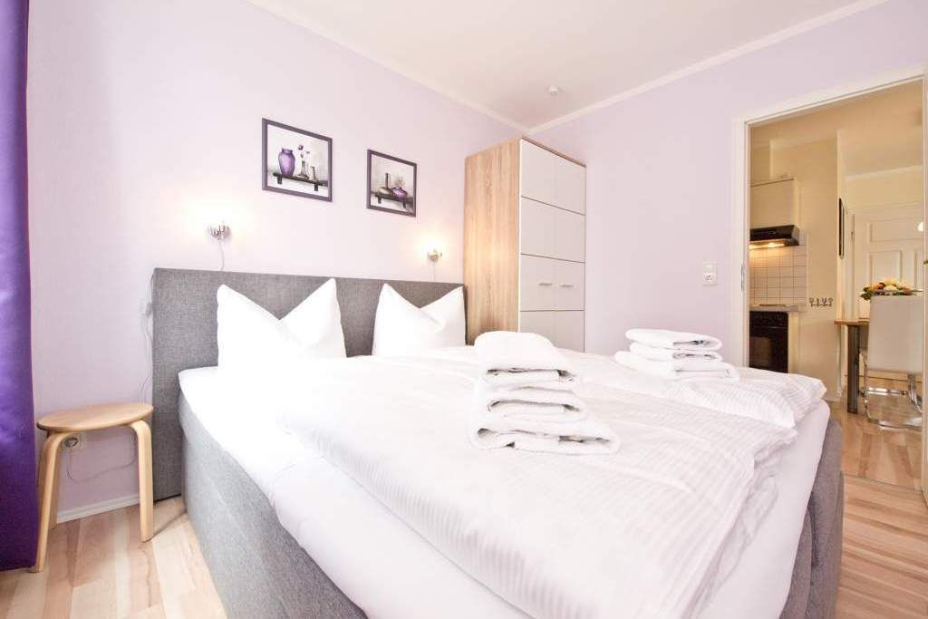 Die helle, freundliche Ferienwohnung befindet sich in der zweiten Etage des Hauses. Die vollständige Einrichtung mit geschmackvoller Möblierung und die liebevollen Dekorationen lassen keine Wünsche übrig. Der Wohnbereich mit bequemer Sitzgruppe & Flat-TV, die Küchenzeile mit angrenzendem Essplatz, zwei Schlafzimmer mit Boxspringbetten (1,60m x 2,00 m ), das Bad mit Dusche und der Balkon bieten bis für zu 4 Personen Platz zum Wohlfühlen. Auf dem Hof steht ein PKW-Stellplatz zur Verfügung. Das W-LAN im Haus kann kostenfrei genutzt werden.