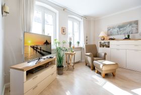 Die Ferienwohnung Medici 3 besticht durch ihre Großzügigkeit und ihre perfekte Abstimmung, was Farben und Möblierung betrifft. Aufwendig verlegte Parkettböden sind hier genauso selbstverständlich wie ein komplettes Inventar vom Haarfön bis zum Bügeleisen. Ein Wohlfühlappartement mit allen Annehmlichkeiten. Ein großer Wohnbereich mit gemütlicher Sitzecke, ein separater Essplatz und eine windgeschützte Terrasse direkt hinter der Düne. Für eine erholsame Nacht finden 2 Personen Platz im separaten Schlafzimmer mit Doppelbett (1,60m x 2,00m) und für die 3. und 4. Person besteht die Möglichkeit der Aufbettung auf der Schlafcouch im Wohnzimmer. Auf Wunsch stellen wir für unsere kleinen Gäste ein Kinderreisebett (ohne zusätzliche Matratze & Bettzeug) und einen Kinderhochstuhl ( gegen einen Aufpreis) zur Verfügung. Für Ihren Komfort sind die Betten bei der Anreise bezogen und Handtücher liegen bereit (Erstausstattung).