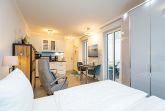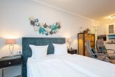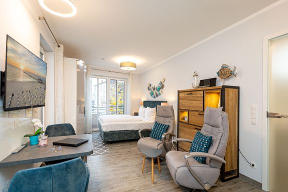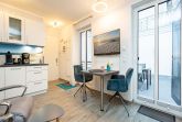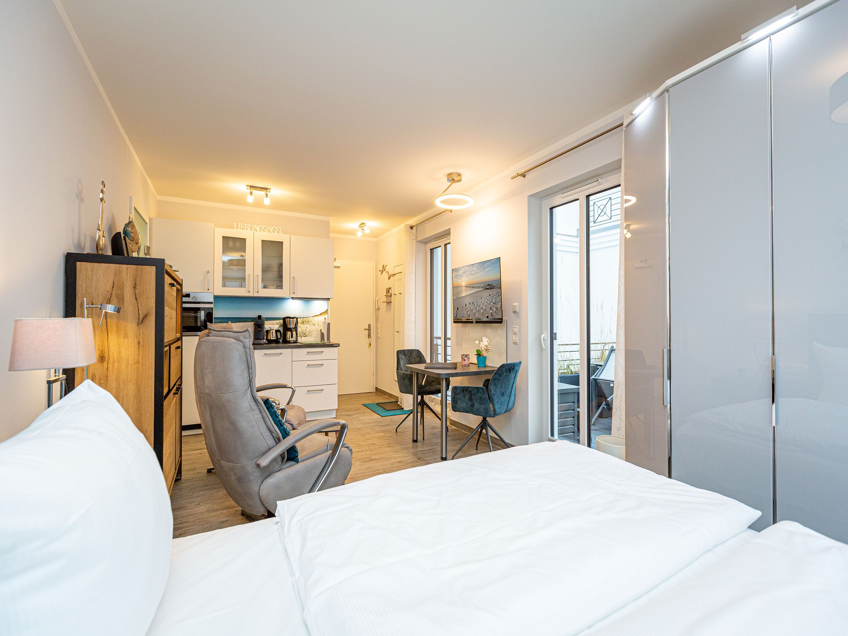 Genießen Sie die Nähe zum Ostseestrand und die zentrale Lage dieses gemütlichen Ein-Raum-Appartements Strandnest im 1. Obergeschoss. Die 27qm sind ideal für zwei Personen und bieten neben einem Schlafbereich mit Boxspringbett (1,60m x 2,00m), eine Küchenzeile (2-Platten-Induktionskochfeld, Backofen, Spülmaschine) und einen Wohn-Essbereich mit Lounge Sesseln und Essplatz für Sie und Ihre Begleitung. Ein 40 Zoll Flat-TV sowie ein Radio mit CD-Player gehören ebenso zur Ausstattung wie eine Senseo-Kaffeemaschine. Die bequemen Sonnenliegen und der Esstisch für bis zu drei Personen auf dem 15qm großen Ost-Balkon laden zum entspannten Verweilen an der frischen Luft ein. Das Badezimmer verfügt über eine Dusche und ein WC. Ein Stellplatz in der hauseigenen Tiefgarage und kostenfreies W-Lan runden Ihren Aufenthalt in diesem Appartement ab. Ein separater Abstellraum für Ihre Fahrräder steht Ihnen außerdem zur Verfügung.