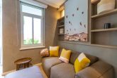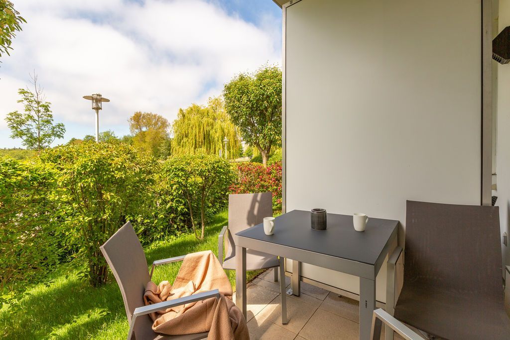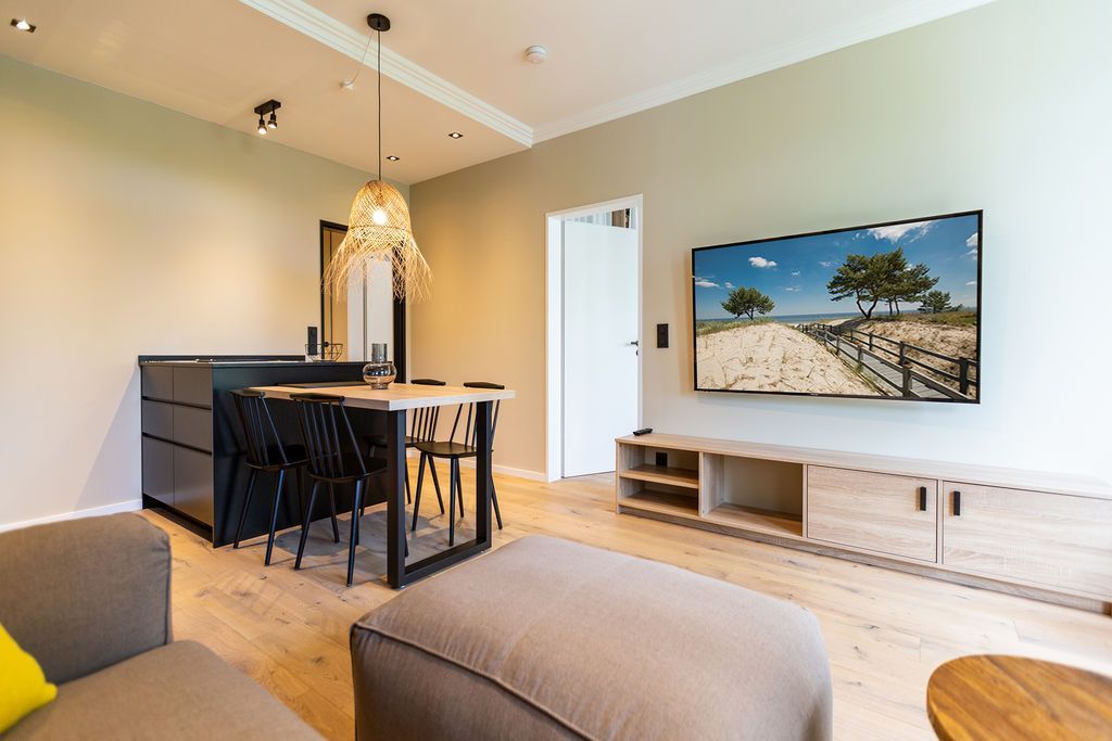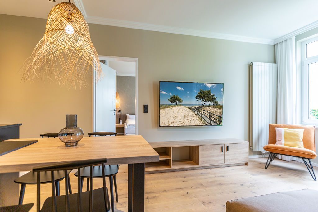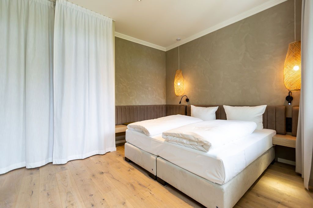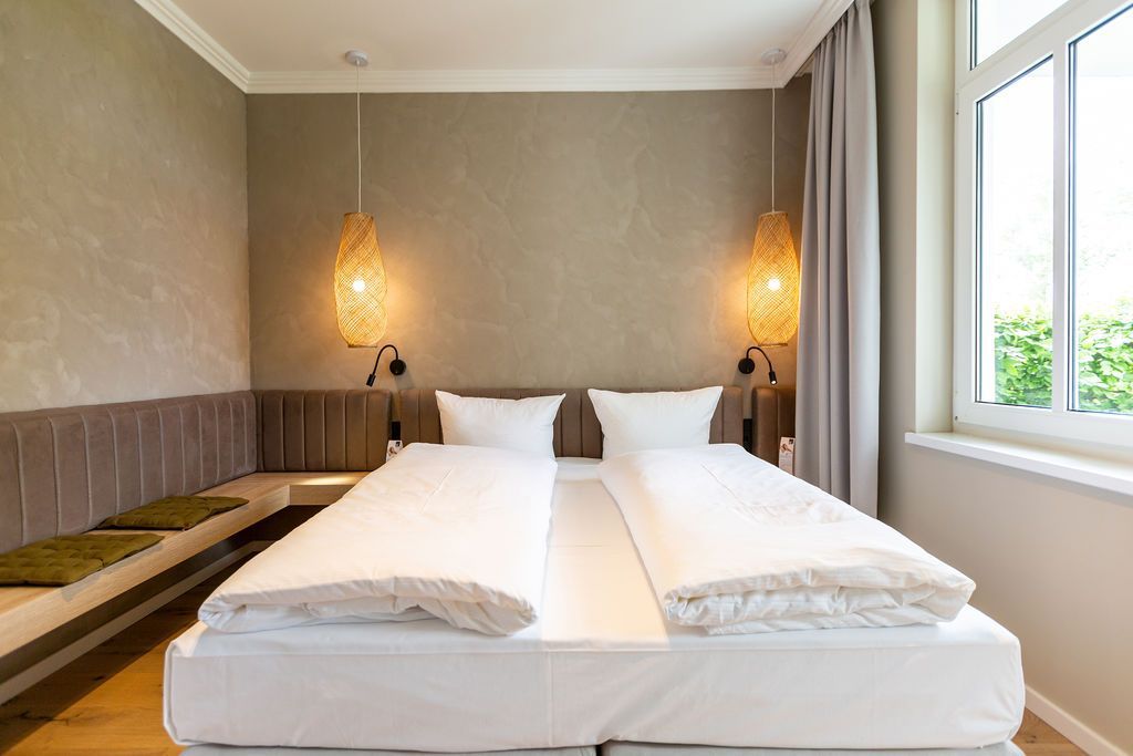 Modernes Design durchzieht das 65 Quadratmeter große Appartement im Erdgeschoss des Seehofes von der Eingangstür bis in die beiden Schlafzimmer. Hier ist alles aus einem Guss. Vom Inneneinrichter konzipiert, können es sich in den drei Räumen bis zu vier Erwachsene und ein Kleinkind (im Kinderreisebett) gut gehen lassen. Auch ihren geliebten Vierbeiner dürfen Sie hier mitbringen. Mit einer kleinen West-Terrasse zum idyllischen Schloonsee hin haben Sie hier ein außergewöhnliches Urlaubsparadies gefunden. Entspannen Sie beim Farbspektakel des Sonnenuntergangs direkt über dem See. Wunderbare Ruhe legt sich hier in den Abend. Der großzügige Wohnbereich ist hell und offen, mit einer gemütlichen Sitzgruppe, Flat-TV und einem schönen Essplatz ausgestattet. Die Möbel sind exklusiv für dieses Appartement ausgewählt. Stylisch, aber kuschelig ist die Atmosphäre der Ferienwohnung. In das Wohnzimmer integriert, ist die offene Küche. Sie ist mit hochwertigen Küchengeräten und erlesenem Geschirr voll ausgestattet. Der Backofen ist auf Augenhöhe und der Herd mit integriertem Dunstabzug ist eine eigene kleine Kochinsel. Kaffeemaschine, Wasserkocher, Toaster, Spülmaschine: Es ist alles da. Ihr Domizil verfügt über zwei sehr individuell und extravagant eingerichtete Schlafzimmer mit jeweils einem Doppelboxspringbett (2,00 m x 1,80 m). Eines der Schlafzimmer besitzt einen Flat-TV und einen Zugang zur Terrasse. Ebenso wie der Rest der Wohnung ist auch das Badezimmer dem Design angepasst. Es ist mit einer ebenerdigen Dusche, Waschtisch und WC ausgestattet. Handtücher liegen bei Anreise bereit. Und auch die Betten sind bezogen. Der Pkw-Stellplatz 101 unten (max. PKW-Höhe 1,50 m, PKW Länge max. 5,00m/ Gewicht max. 2t) ist in der Doppelparkergarage für Sie reserviert. Das WLAN ist kostenfrei nutzbar. Auch eine Sauna gibt es in der Anlage.