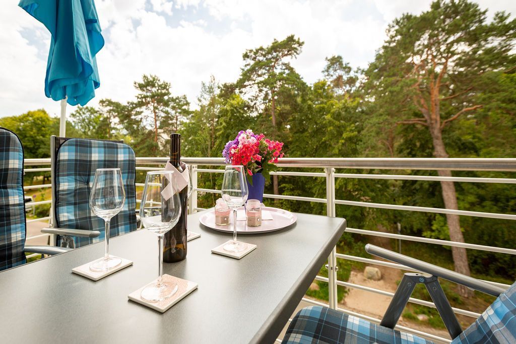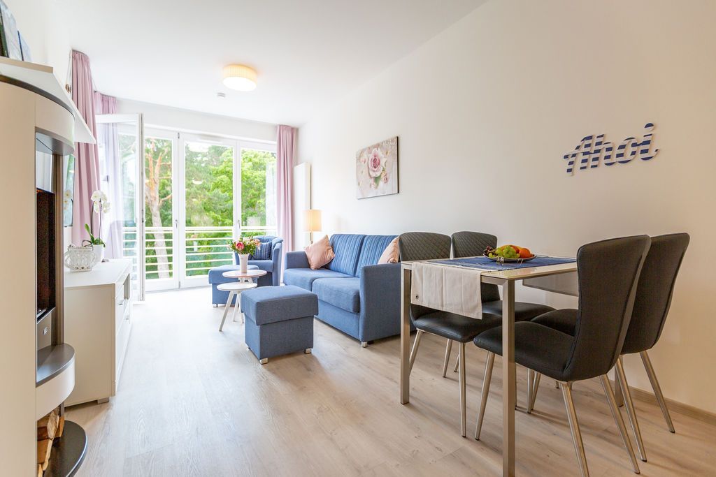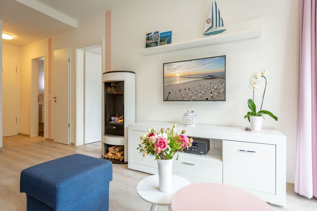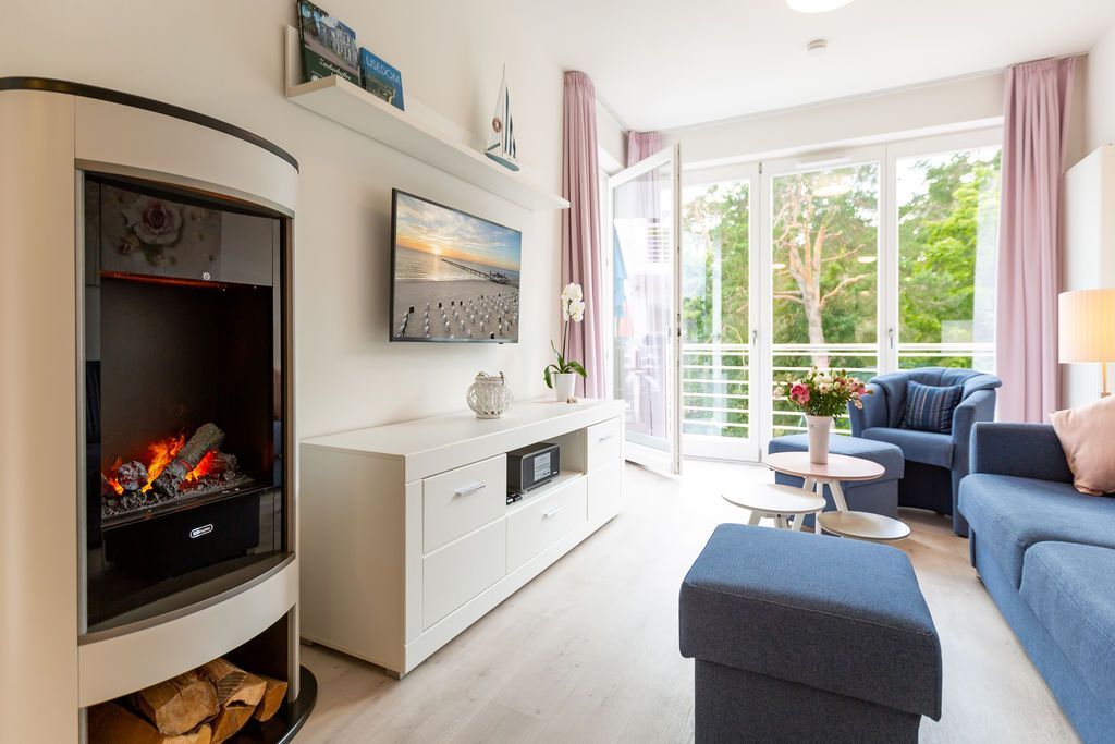 Der Ostsee ganz nah: In diesem schönen Zwei-Zimmer-Appartement in der 2. Etage können zwei Personen eine wunderbar entspannte Auszeit in absoluter Strandnähe genießen. 52 Quadratmeter ist das kleine und kuschlig maritim eingerichtete Urlaubsdomizil groß. Maritim ist auch die Farbgestaltung aus Meerblau und viel Weiß. Hell und geräumig ist das Wohn-Ess-Zimmer mit Zugang zum sonnenüberfluteten Süd-Balkon (6 Quadratmeter). Hier zu frühstücken oder abends ein kühles Getränk in der Hand, in die Weite schauen, lässt die Seele auftanken. Es sich gut gehen lassen, dafür ist das Appartement ideal. Ein Elektro-Kamin im Wohnzimmer zaubert mit Licht und Wasserdampf ein authentisches, dreidimensionales Flammenspiel - Romantik pur - und der große Flat-TV so manch spannenden Film. Wenn der Hunger kommt, bietet die offene Wohnküche alles, was Sie für die Zubereitung einer anständigen Mahlzeit benötigen. Hochwertige Markengeräte wie Herd, Spülmaschine, Kaffeemaschine oder Backofen erleichtern das Kochen und Saubermachen. Im Schlafzimmer, das ebenfalls einen Zugang zum Balkon hat, wartet ein bequemes Doppelbett (1,80 m x 2,00 m) auf die Zeit des Zubettgehens. Denn in ihm schläft es sich herrlich. Auch hier gibt es einen Flat-TV. Ein großer Schrank offeriert viele Ablageflächen für Ihre Kleidung. Auf Wunsch stellen wir für unsere kleinen Gäste ein Kinderreisebett (ohne zusätzliche Matratze & Bettzeug) und einen Kinderhochstuhl (gegen einen Aufpreis) zur Verfügung. Das innenliegende Bad verfügt über eine geräumige Dusche, Waschtisch und WC. Im Doppelparker (Fahrzeughöhe max. 1,90 m) in der Tiefgarage ist der Stellplatz 2.8 für Sie reserviert. Die Nutzung des WLAN-Netzes ist kostenfrei. Handtücher liegen für Sie bei Anreise bereit und auch das Bett ist bezogen.