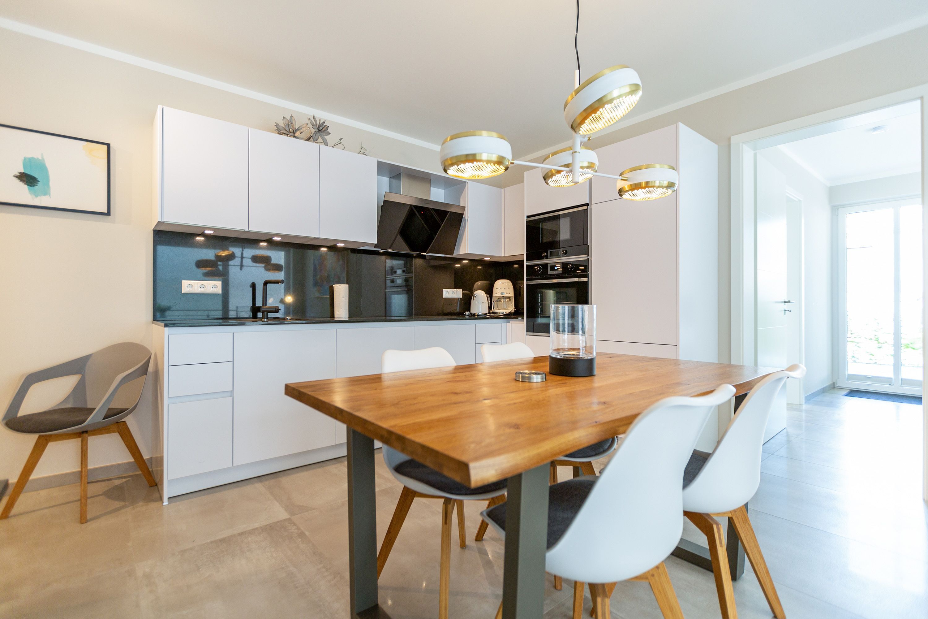 Balkon oder doch lieber Terrasse? Dieses wunderschöne, moderne und helle 3-Zimmer-Appartement im Erdgeschoss vom Quartier Sieben bietet bis zu vier Personen die Qual der Wahl. Denn idyllisch und sonnenüberflutet sind sowohl der Süd-Ost-Balkon (5 Quadratmeter) als auch die großzügige Süd-West-Terrasse mit Gartenmöbeln (22 Quadratmeter). Auch sonst finden Sie in den 69 Quadratmetern Wohnfläche alles vor, was Sie sich für eine entspannte Auszeit an der Ostsee nur vorstellen können. Ein großes, offenes Wohn-Esszimmer ist der Treffpunkt zum Entspannen und Genießen. Ein stylisches, aber überaus gemütliches Sofa wird zusammen mit dem großen Flat-TV zum Home-Kino. Das WLAN-Netz ist kostenfrei nutzbar. An kühlen Abenden schenkt der Kamin eine kuschelige Atmosphäre. Ausgefallen und ein echter Hingucker ist das Design-Lampenkonzept. Die ins Wohnzimmer integrierte Küche ist Highend vom Feinsten. Hochwertige Markengeräte machen das Kochen und Zubereiten der Mahlzeiten zu einem Kinderspiel. Es ist alles vorhanden: Ein Induktionsherd, eine Spülmaschine, eine Mikrowelle und vieles mehr. Edles Geschirr finden Sie in den Schränken. Zum Essen und für gemeinsame Stunden ist der hölzerne Esstisch ideal. Zwei Schlafzimmer mit je einem großen und bequemen Boxspringdoppelbett (1,80 m x 2,00 m), Flat-TV und Kleiderschrank dienen als lauschige Rückzugsorte. Das Appartement verfügt über zwei Bäder. Beide sind mit einer Dusche und einem WC ausgestattet. Darüber hinaus besitzt eines der Bäder sogar eine finnische Sauna und einen Waschtrockner. Bei Anreise sind die Betten bezogen und Handtücher liegen bereit. Die Wohnung hat Fußbodenheizung. In der Tiefgarage ist für Ihren Pkw der Stellplatz Nr. 3 reserviert.