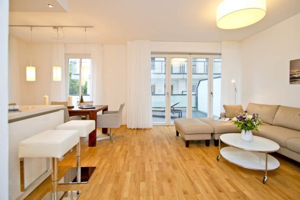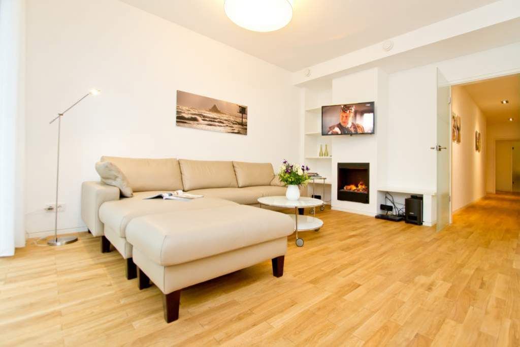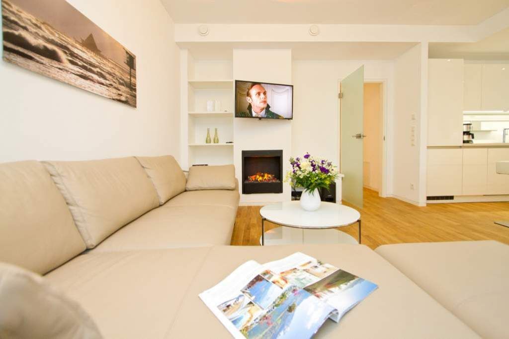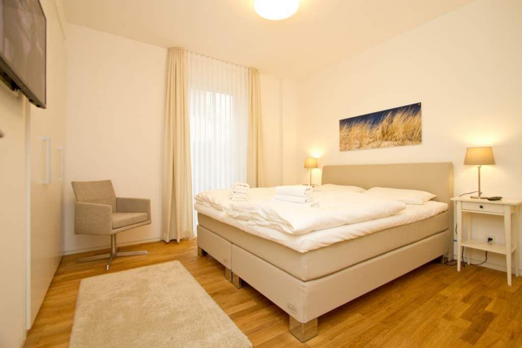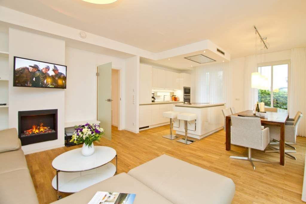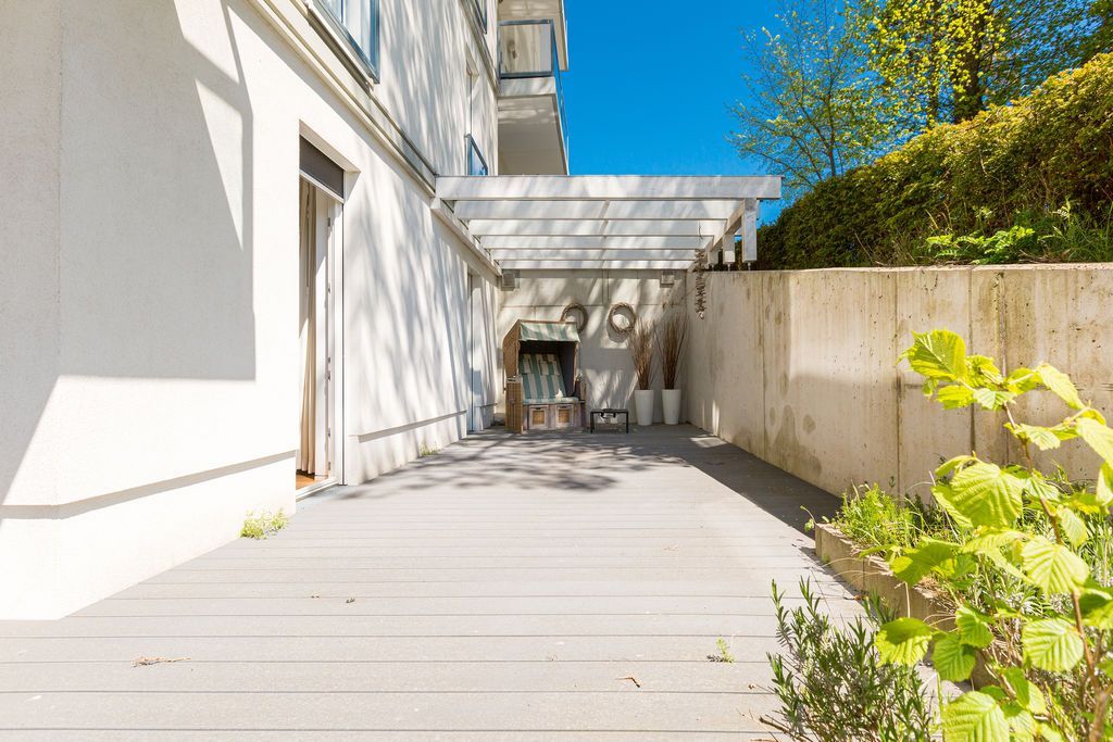 Sonnige Aussichten verspricht die Ferienwohnung 1 im Erdgeschoss des Ostseepalais. Geschützt hinter dem Dünenbereich erwartet Sie hier eine riesige Sonnenterrasse mit Strandkorb und ein großzügiges 4-Raum-Appartement (120qm) mit toller, moderner Einrichtung! Ausgestattet für 6 Erwachsene und 2 Kleinkinder (bis 3 Jahre im Kinderreisebett) finden Sie einen hellen Wohnbereich ausgestattet mit bequemer Ledercouch, Flat-TV und Elektrokamin. Die angrenzende, offene Küche ist mit allem Komfort ausgestattet und der große Esstisch lädt nicht nur zum ausgiebigen Frühstücken ein. Die 3 Schlafzimmer sind mit Doppelbetten und Einbauschränken mit viel Platz ausgestattet. Zwei Schlafzimmer führen auf die umlaufende Terrasse, ein Schlafzimmer ist innenliegend (wie auch die Bäder). Ein besonderes Highlight ist die wohnungseigene Sauna im großen Bad. Hier gibt es eine Badewanne und eine große Dusche. Ein zusätzliches Bad verfügt über eine Dusche. Für Ihren Komfort ist die Erstausstattung Wäsche inklusive. Auf Wunsch stellen wir ein Kinderreisebett und einen Kinderhochstuhl gegen einen Aufpreis zur Verfügung. Zwei Stellplätze befinden sich in der Tiefgarage. Das Wlan-Netz in der Wohnung ist kostenlos nutzbar-bitte fragen Sie an unserer Rezeption.