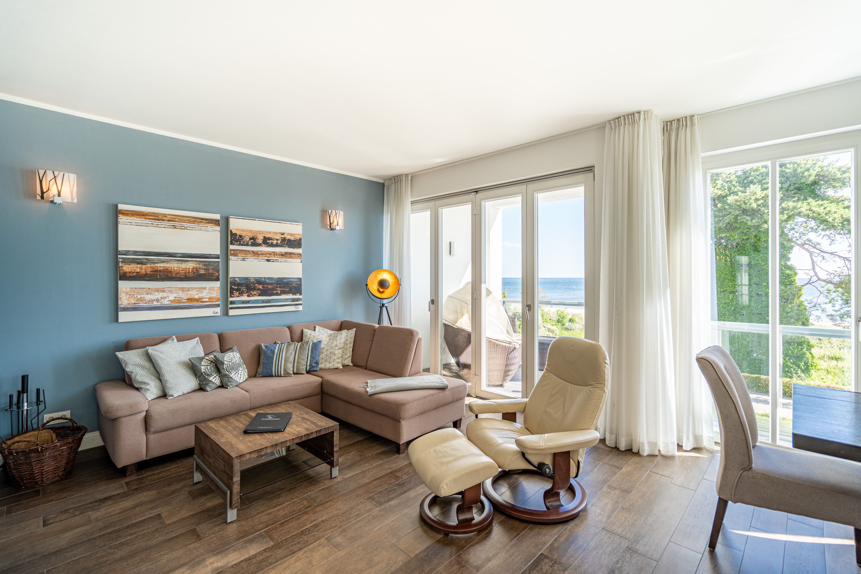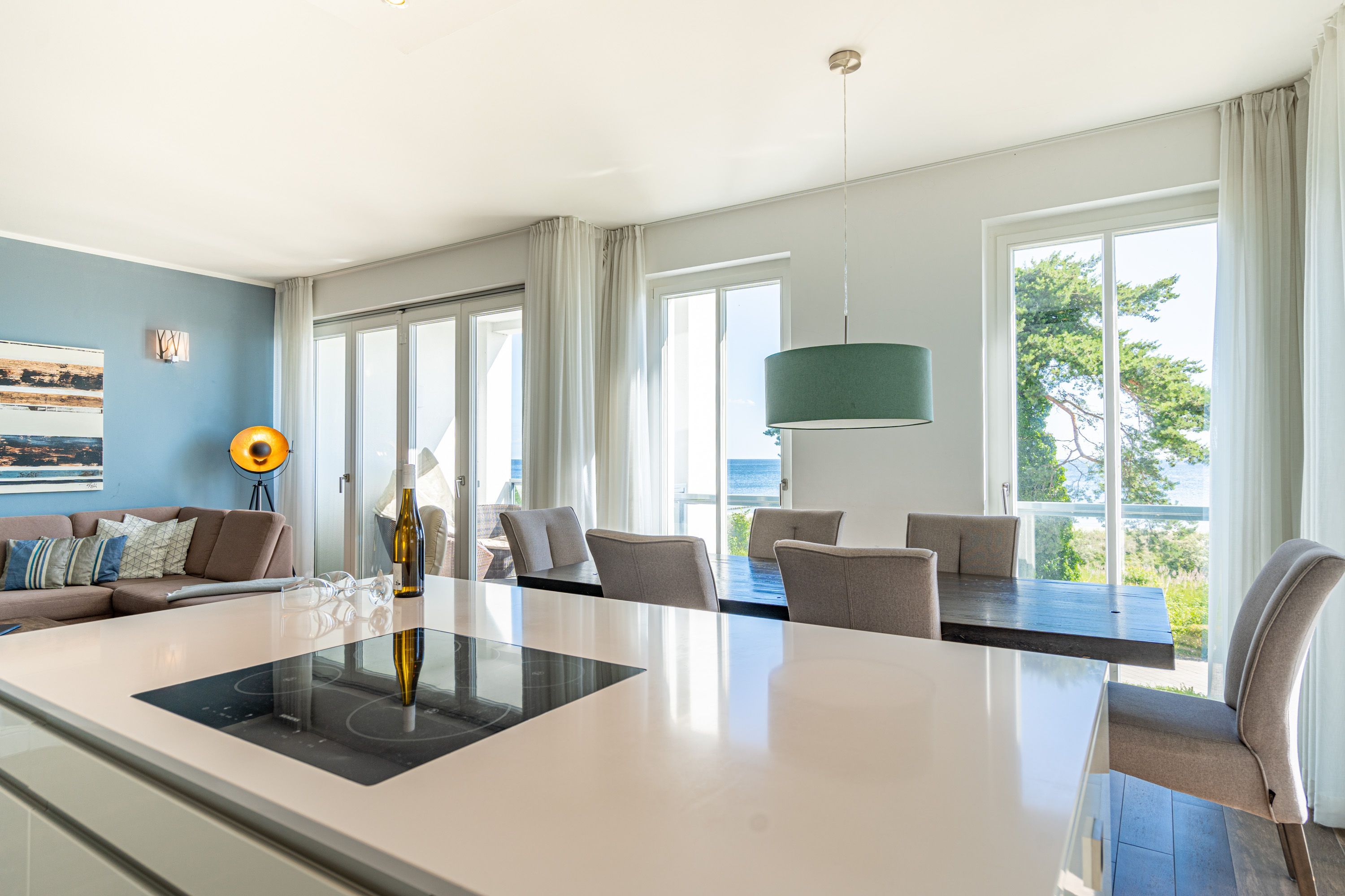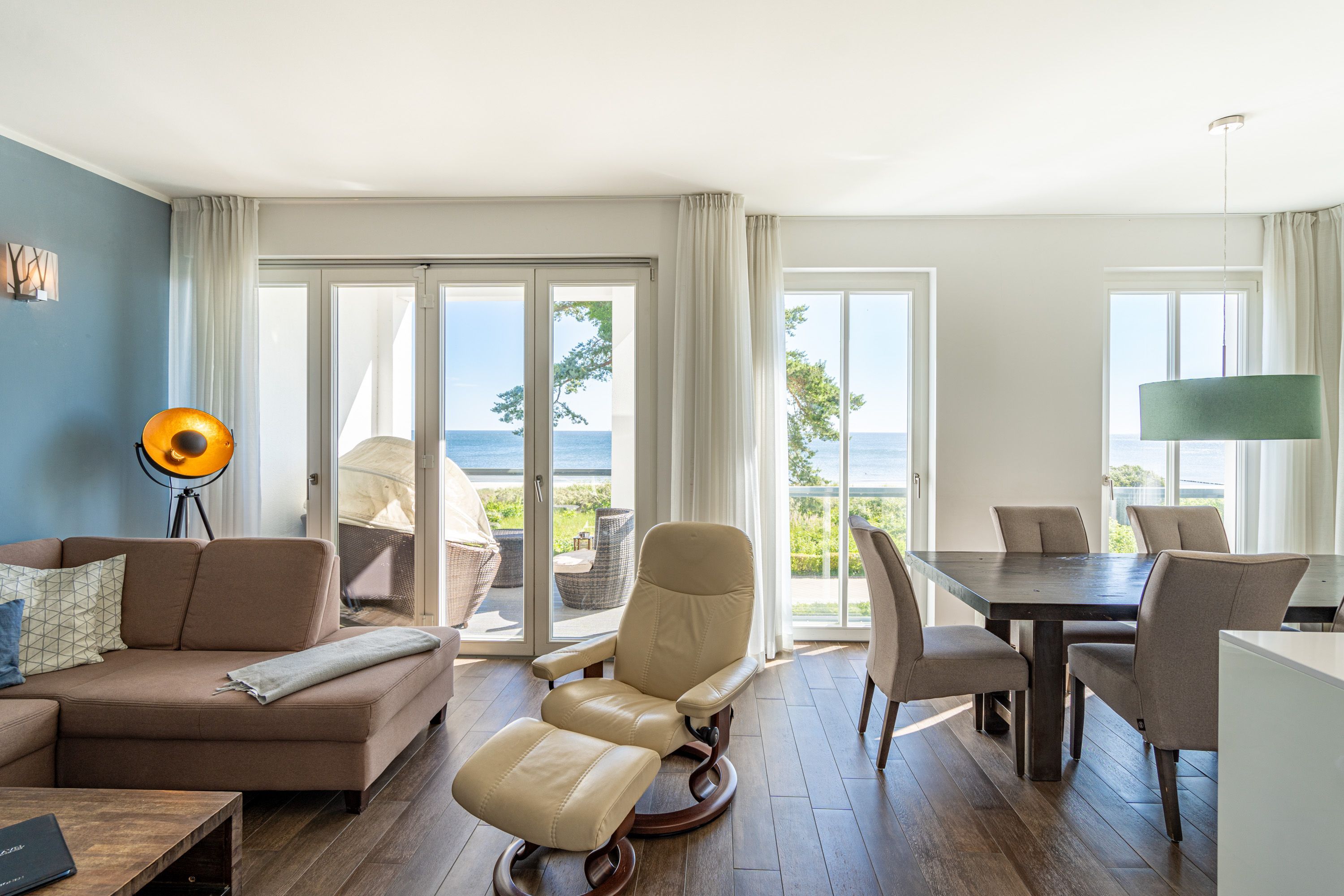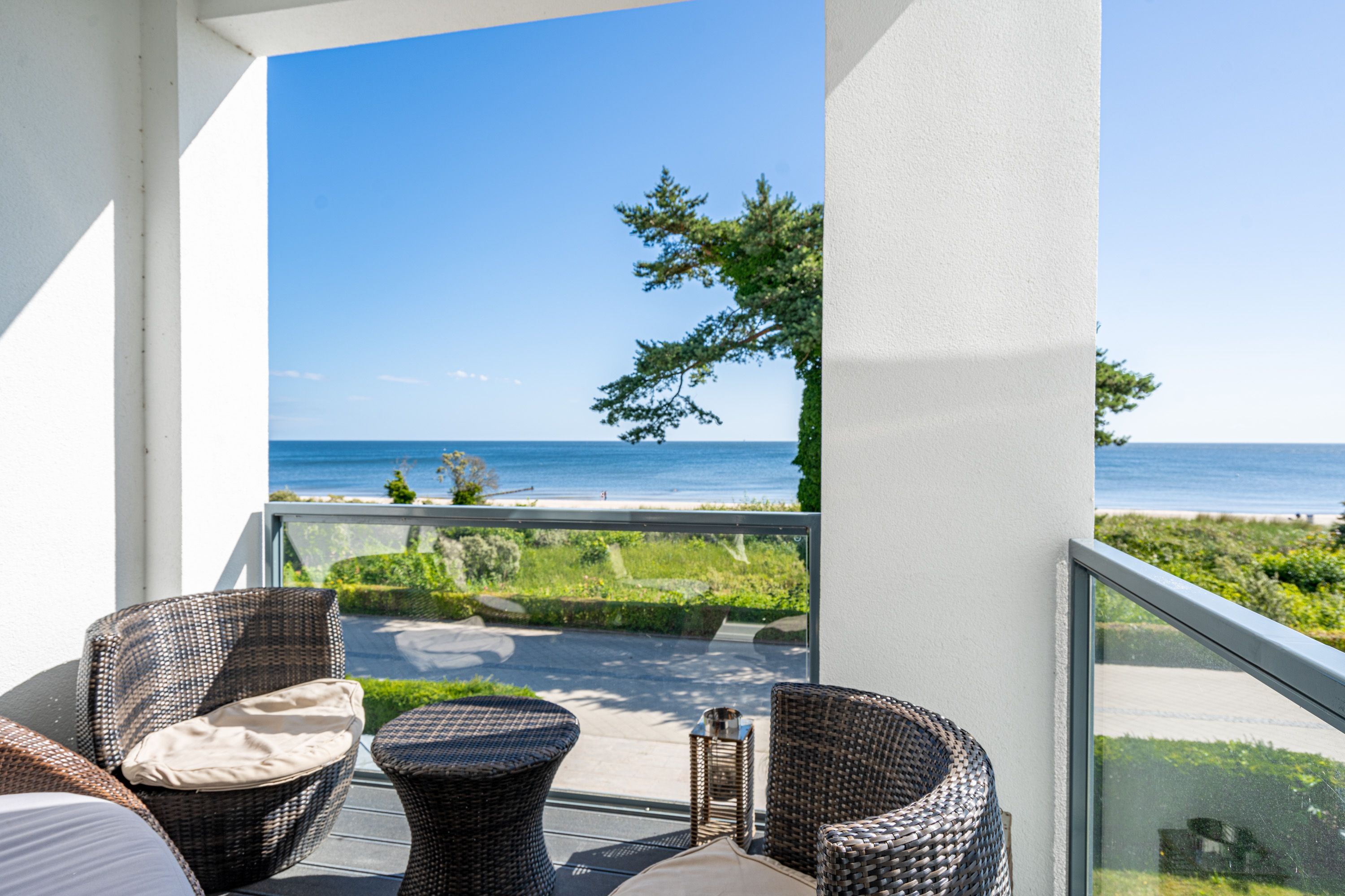 Modernes Design trifft fantastischen Meerblick! In dieser exklusiven 4-Raum-Ferienwohnung direkt an der Ostsee erwarten Sie 120 qm stilvoll gestaltete Wohnfläche entworfen von einer renommierten Innenarchitektin. Die Wohnung bietet Platz für bis zu 6 Personen sowie ein Kleinkind (bis 3 Jahre im Kinderreisebett). Hochwertige Möbel, stilvolle Farbkonzepte und edle Materialien schaffen eine luxuriöse Wohlfühlatmosphäre. Das Herzstück der Wohnung ist der lichtdurchflutete Wohnbereich mit einer großzügigen Fensterfront zum Meer. Eine gemütliche Sitzgruppe, ein Kaminofen und ein Flat-TV sorgen für entspannte Stunden. Die offene, hochwertig ausgestattete Küche mit großem Essbereich lädt zu geselligen Abenden ein. Drei Schlafzimmer mit bequemen Boxspring-Doppelbetten zwei davon mit eigenem TV garantieren erholsamen Schlaf. Die zwei eleganten Bäder wurden mit der exklusiven Badkollektion von Philippe Starck ausgestattet. Während das erste Bad mit einer freistehenden Badewanne und zwei Waschtischen beeindruckt, begeistert das zweite Bad mit einer großen Glasdusche und einer wohnungseigenen Sauna ein echtes Highlight, besonders in der kühleren Jahreszeit. Ein absoluter Lieblingsplatz: die Balkone mit spektakulärem Meerblick, perfekt zum Entspannen und Genießen. Zusätzlicher Komfort: kostenfreies WLAN, ein Kinderreisebett und ein Hochstuhl können gegen Gebühr hinzugebucht werden.