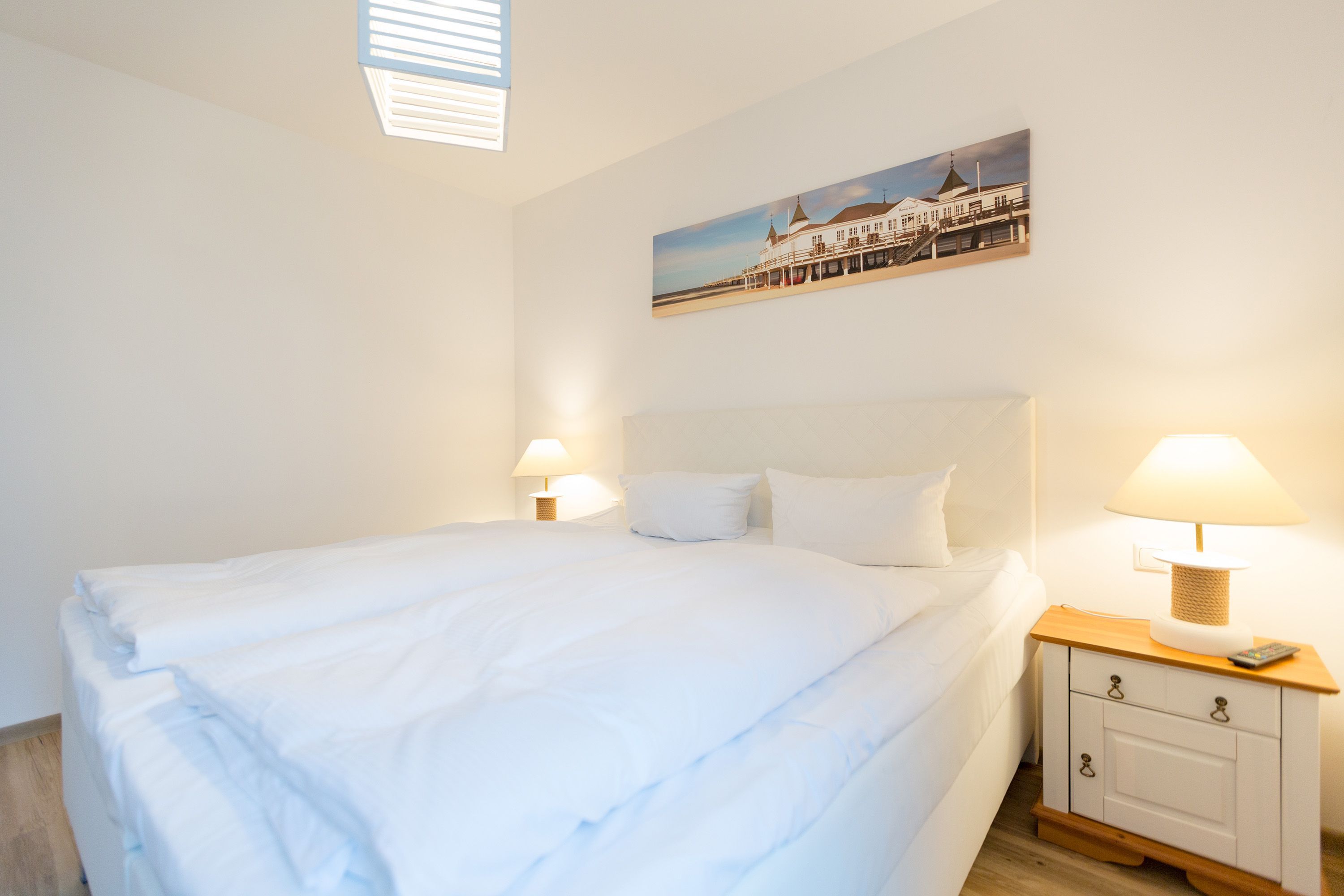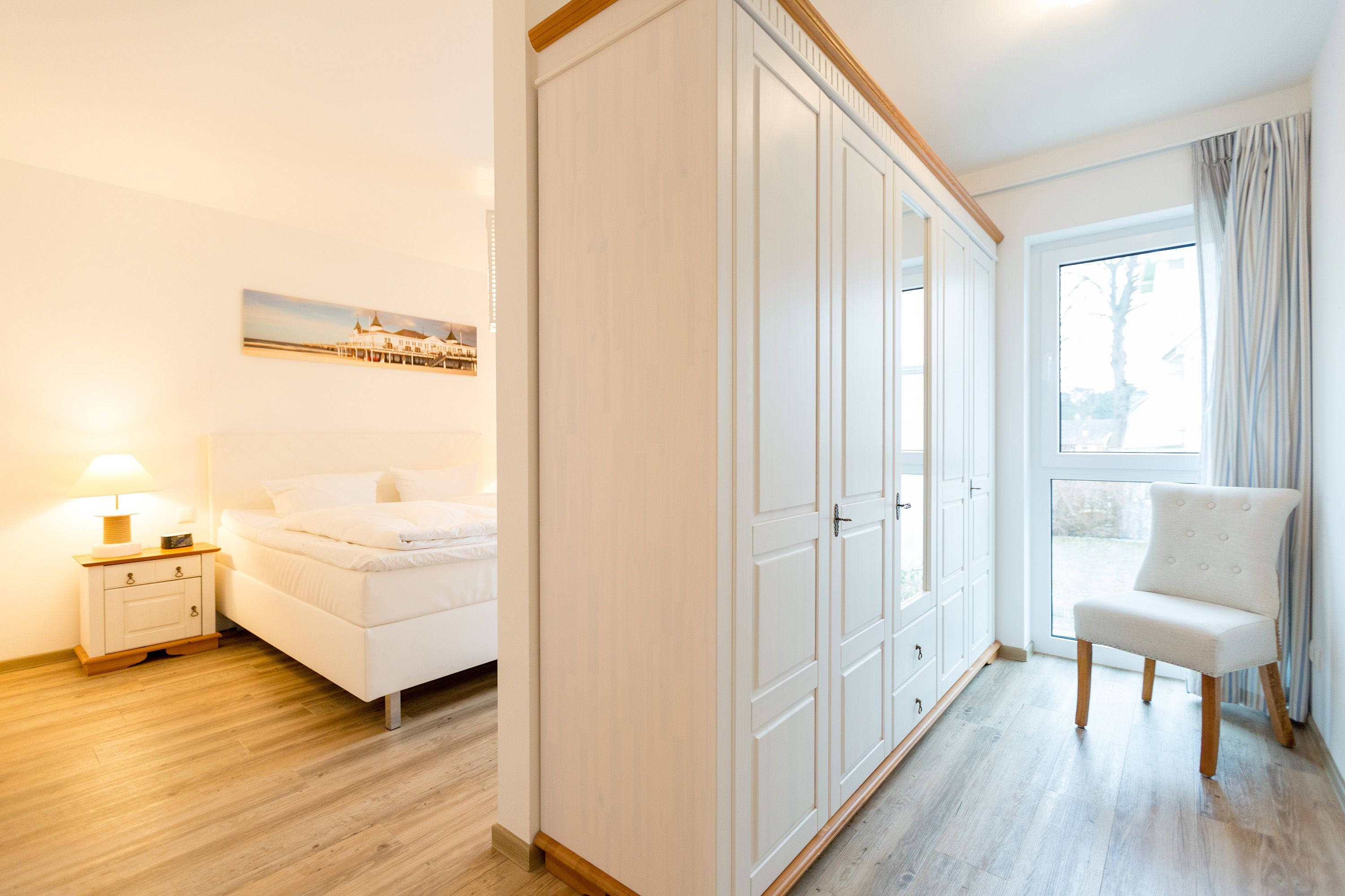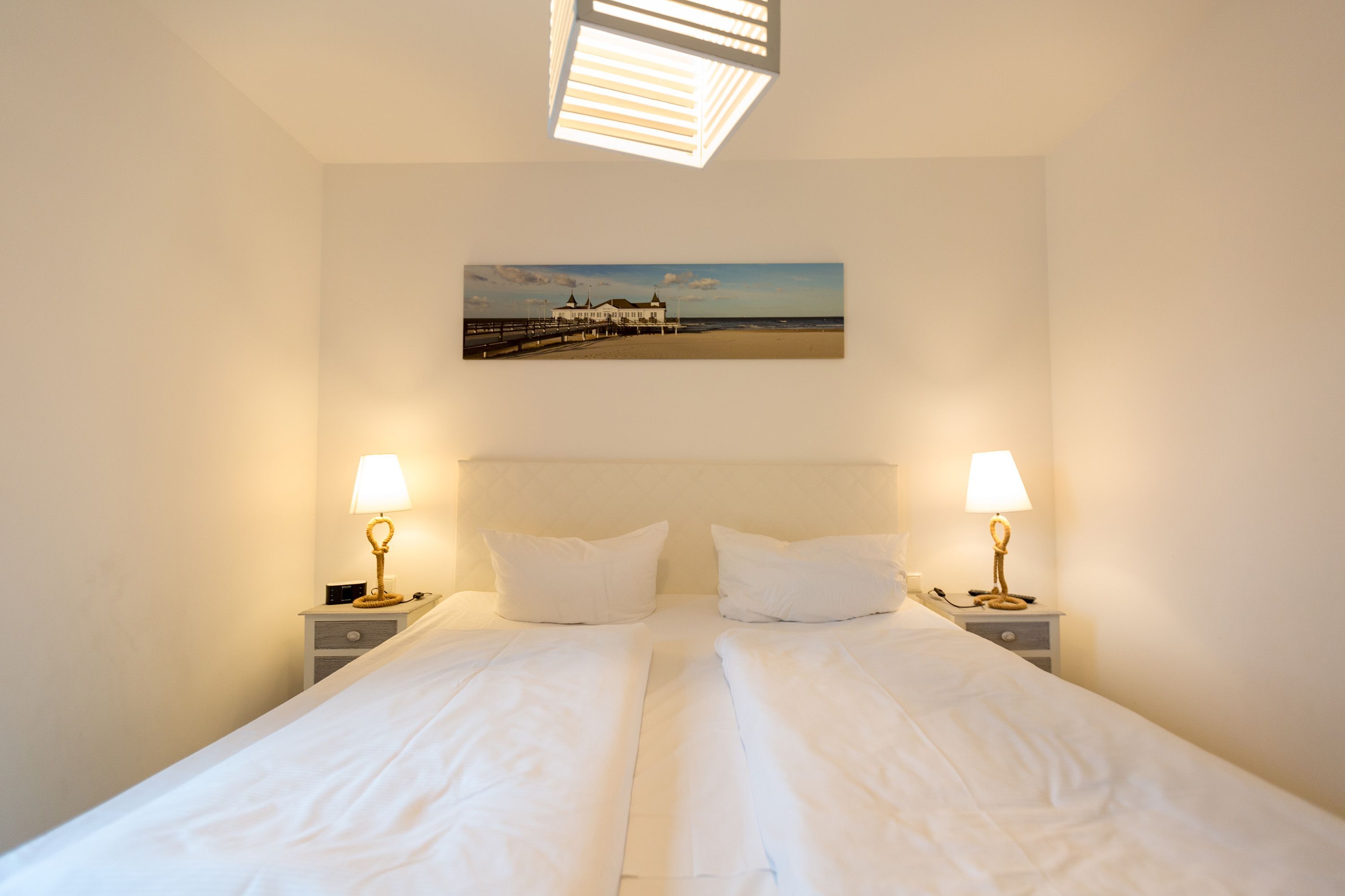 Träumen Sie nicht auch ab und an von einen kleinen Auszeit in ungewöhnlicher und ungewöhnlich schöner Umgebung? Dieses Appartement für bis zu 4 Personen & 1 Kleinkind ( bis 2 Jahre im Kinderreisebett) in der ersten Etage des Quartier Ahlbeck ist genau das Richtige für Liebhaber exquisiter Stilmöbel. Denn in diesem 80 Quadratmeter großen Ferienappartement erwartet Sie Landhausstil vom Feinsten. Der helle Wohnbereich mit der offenen Küche ist der ideale Rückzugsort, um neue Energie zu tanken. Ein bequemes Sofa aus Korb und die beiden großen Ohrensessel laden geradezu ein, sich in ihnen zu entspannen. Ein Kaminofen sorgt zusätzlich für Gemütlichkeit. Der Flat-TV besitzt einen Blue-Ray-Player. So wird das Urlaubsdomizil zum echten Heimkino. Durch die bodentiefen Fenster gelangen Sie auf einen lichtüberfluteten Süd-West-Balkon. Genießen Sie die Sonne und vergessen dabei einfach mal den Alltag. Lockt der Appetit, bietet die offene Wohnküche mit wunderschönem Essplatz alles, was das Herz des Hobbykochs höher schlagen lässt. Hochwertige Geräte vom Herd, über die Kaffeemaschine bis zur Mikrowelle und erlesenes Geschirr machen das Zubereiten und Genießen der Speisen zum Vergnügen. Die zwei Bäder sind geräumig und mit Dusche, Waschtisch und WC ausgestattet. Schalten Sie ab und kommen Sie zur Ruhe in der eigenen Finnischen Sauna. Danach bleischwer und völlig entspannt ins Bett fallen? Kein Problem. In den beiden Schlafzimmern warten bequeme Boxspringdoppelbetten (1,80 m x 2,00 m) nur darauf, Ihnen himmlische Träume zu bescheren. Auch hier sind Möbel und Wände wunderbar hell gehalten und geben den Zimmern ein luftig leichtes Ambiente. Große Schränke bieten viel Platz für Ihre Sachen. Damit Ihre Urlaubsauszeit so entspannend wie möglich ist, sind die Betten bei Ihrer Anreise bezogen und Handtücher liegen bereit.