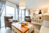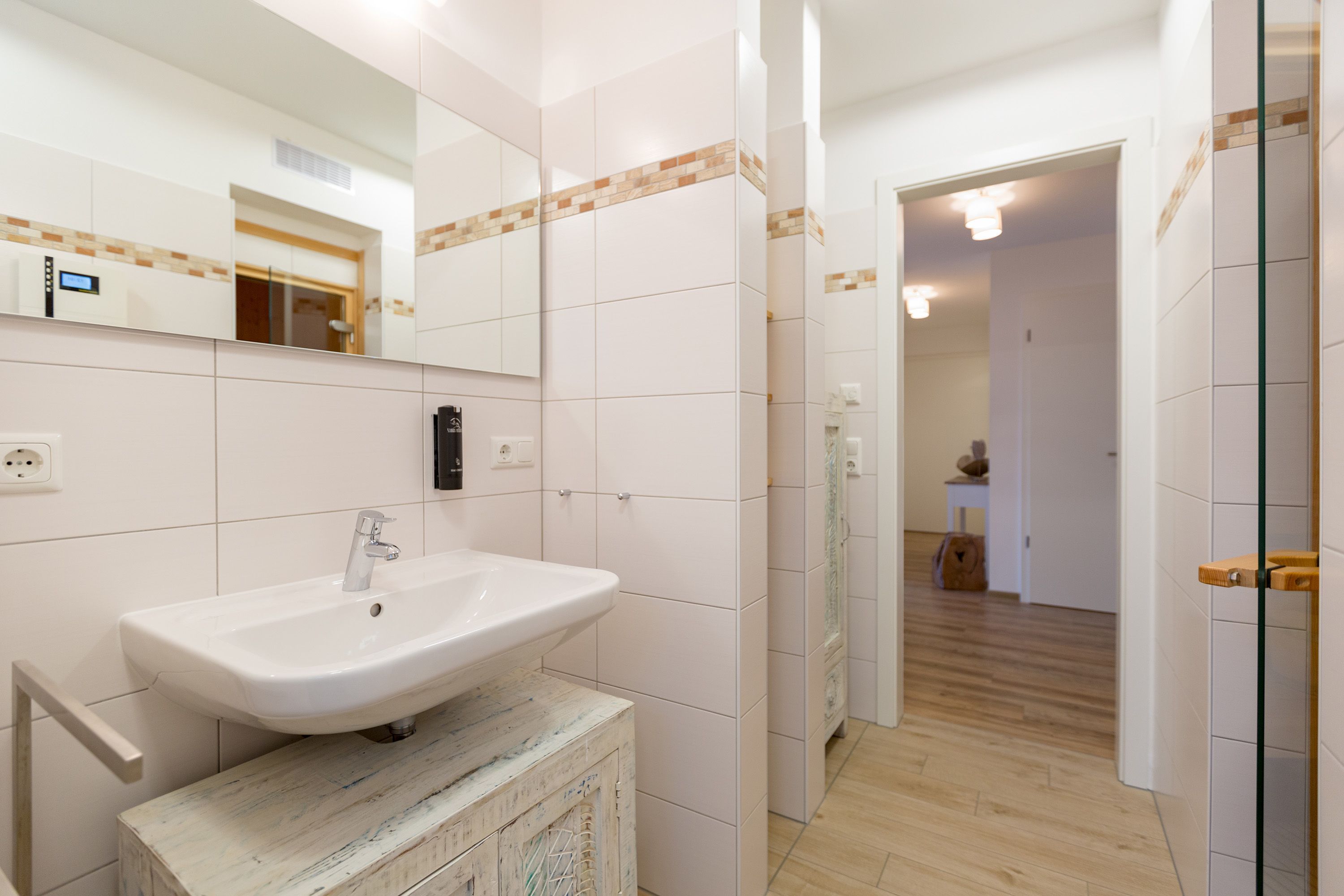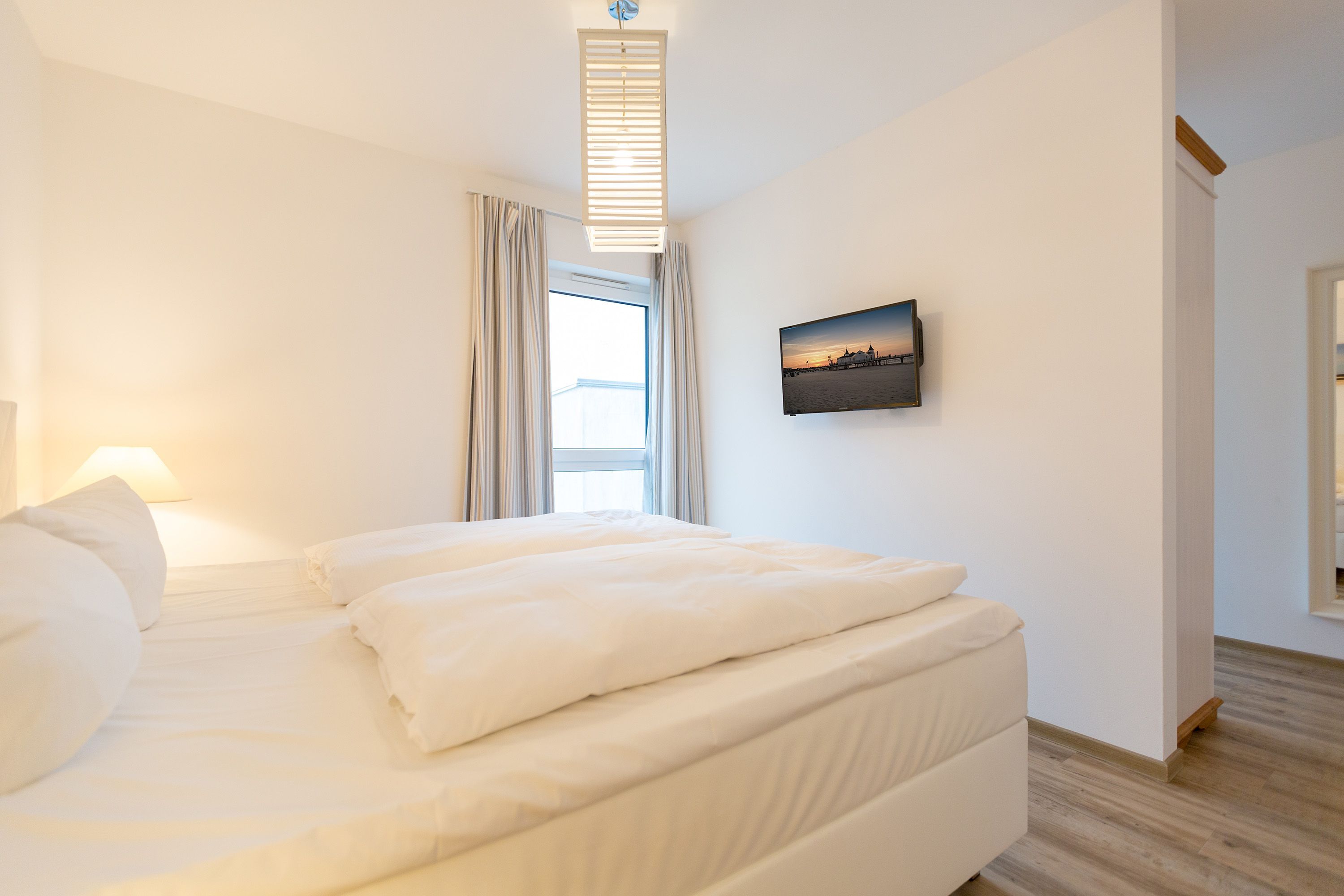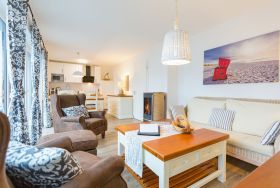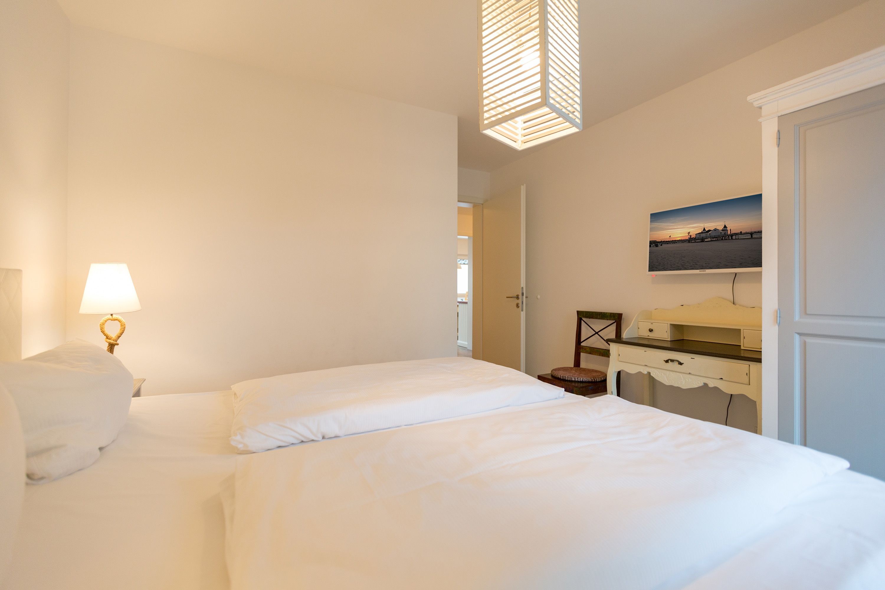 Träumen Sie nicht auch ab und an von einen kleinen Auszeit in ungewöhnlicher und ungewöhnlich schöner Umgebung? Dieses Appartement für bis zu 4 Personen & 1 Kleinkind ( bis 2 Jahre im Kinderreisebett) in der ersten Etage des Quartier Ahlbeck ist genau das Richtige für Liebhaber exquisiter Stilmöbel. Denn in diesem 80 Quadratmeter großen Ferienappartement erwartet Sie Landhausstil vom Feinsten. Der helle Wohnbereich mit der offenen Küche ist der ideale Rückzugsort, um neue Energie zu tanken. Ein bequemes Sofa aus Korb und die beiden großen Ohrensessel laden geradezu ein, sich in ihnen zu entspannen. Ein Kaminofen sorgt zusätzlich für Gemütlichkeit. Der Flat-TV besitzt einen Blue-Ray-Player. So wird das Urlaubsdomizil zum echten Heimkino. Durch die bodentiefen Fenster gelangen Sie auf einen lichtüberfluteten Süd-West-Balkon. Genießen Sie die Sonne und vergessen dabei einfach mal den Alltag. Lockt der Appetit, bietet die offene Wohnküche mit wunderschönem Essplatz alles, was das Herz des Hobbykochs höher schlagen lässt. Hochwertige Geräte vom Herd, über die Kaffeemaschine bis zur Mikrowelle und erlesenes Geschirr machen das Zubereiten und Genießen der Speisen zum Vergnügen. Die zwei Bäder sind geräumig und mit Dusche, Waschtisch und WC ausgestattet. Schalten Sie ab und kommen Sie zur Ruhe in der eigenen Finnischen Sauna. Danach bleischwer und völlig entspannt ins Bett fallen? Kein Problem. In den beiden Schlafzimmern warten bequeme Boxspringdoppelbetten (1,80 m x 2,00 m) nur darauf, Ihnen himmlische Träume zu bescheren. Auch hier sind Möbel und Wände wunderbar hell gehalten und geben den Zimmern ein luftig leichtes Ambiente. Große Schränke bieten viel Platz für Ihre Sachen. Damit Ihre Urlaubsauszeit so entspannend wie möglich ist, sind die Betten bei Ihrer Anreise bezogen und Handtücher liegen bereit.
