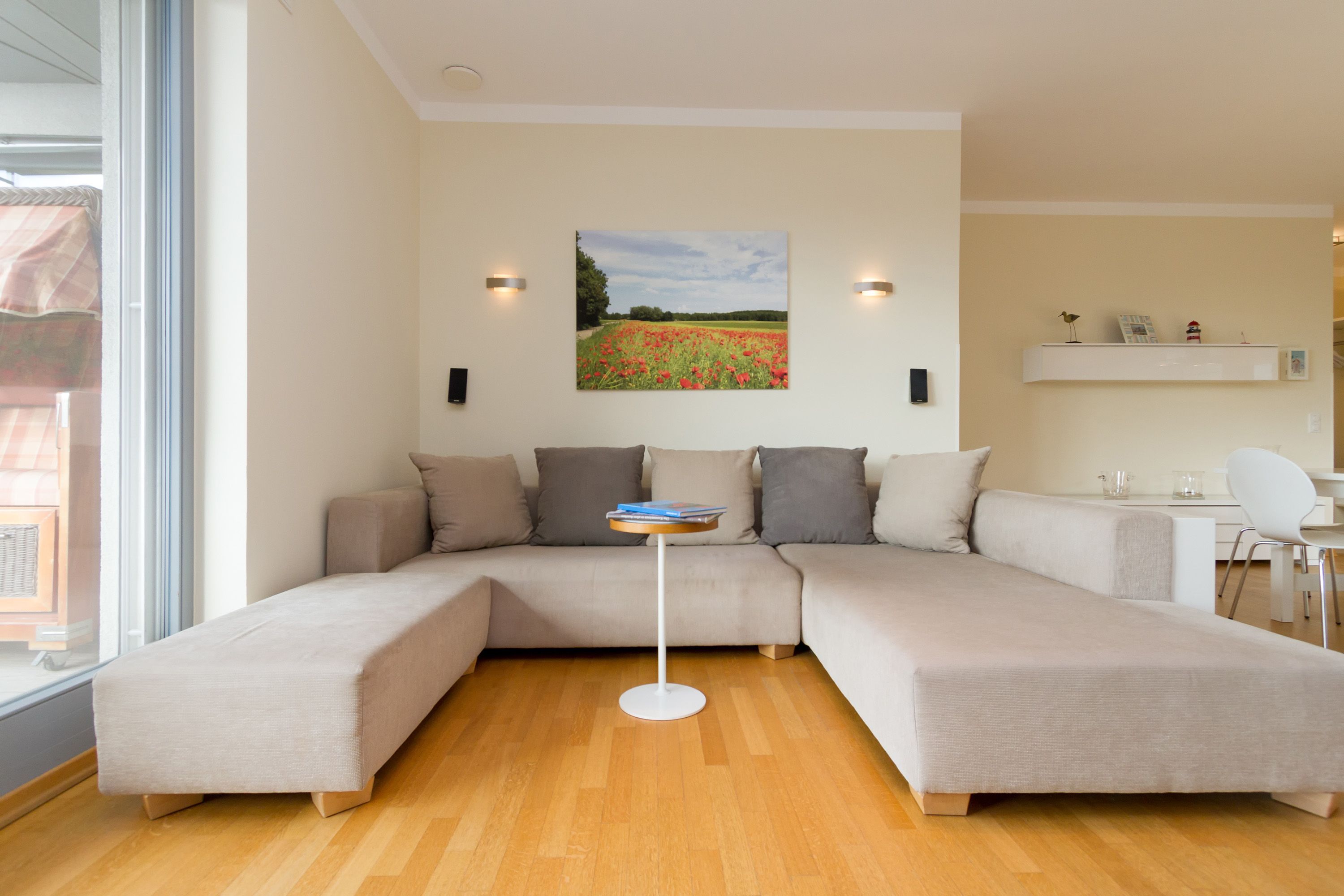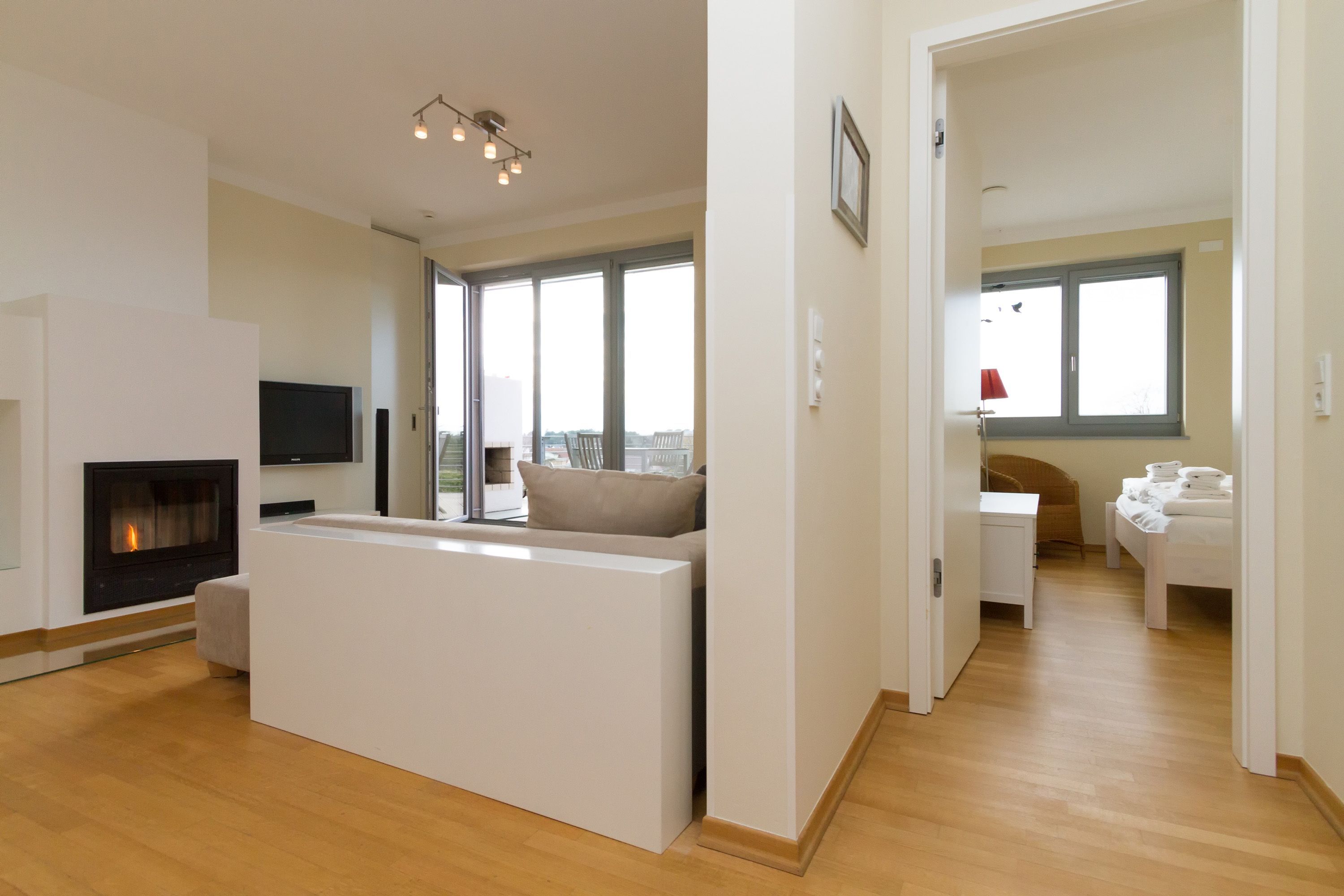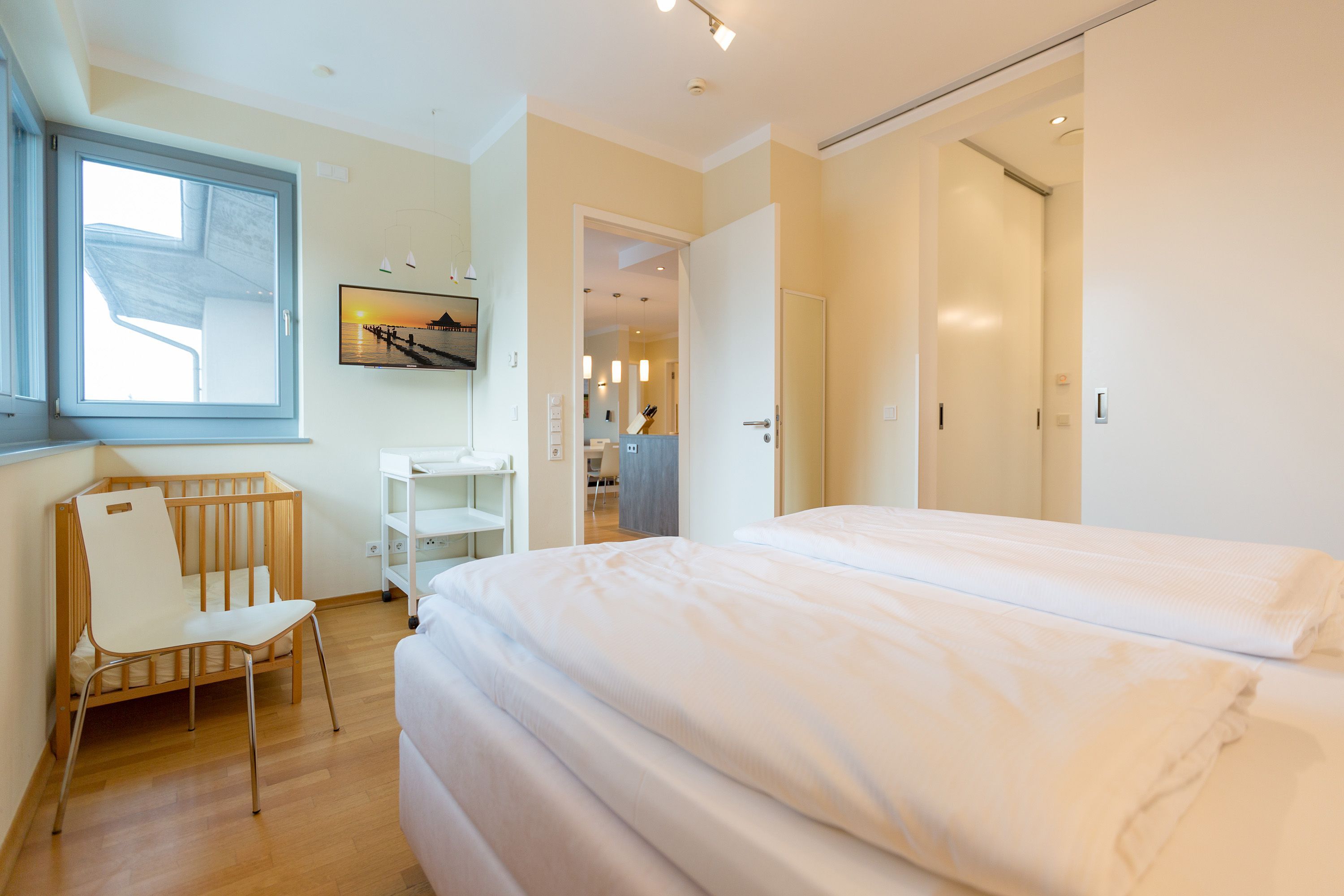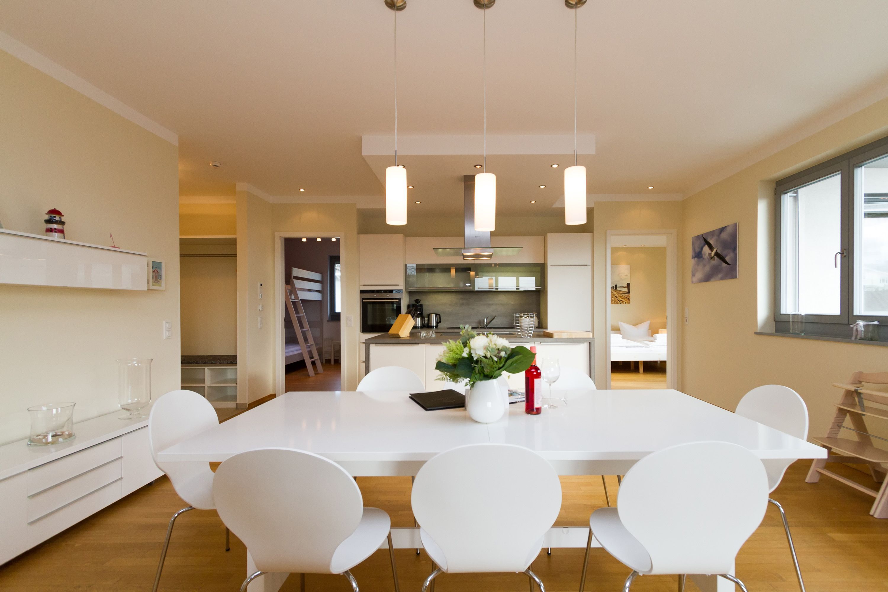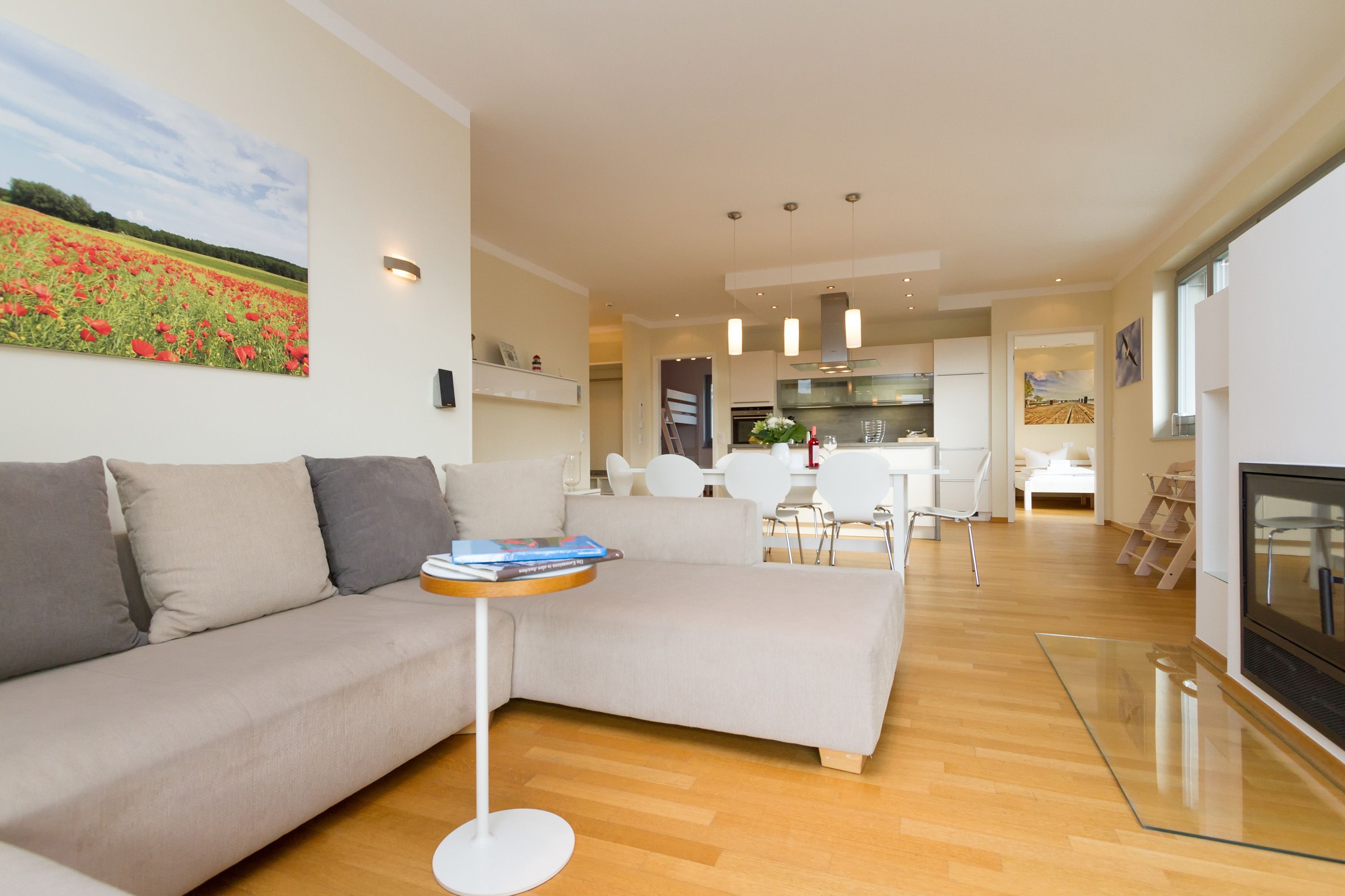 Sie wünschen sich viel Platz, zwei Wohlfühlbäder, eine perfekt ausgestattete Küche und ein geschmackvolles, wertiges Wohnambiente? Dann Sind Sie hier genau richtig. Mit viel Liebe zum Detail eingerichtet, erwartet Sie im 2. Obergeschoss ein außergewöhnlich großzügiges Urlaubsdomizil. 115 qm Wohnfläche aufgeteilt in Wohnbereich, offene, komplett ausgestattete Küche und 3 Schlafzimmer (1x 1,80m + Kinderbett/ 1x 1,60m / 1x Etagenbett) und 2 Bäder. Für Ihren Komfort steht die Erstausstattung Wäsche (Bettwäsche & Handtücher) für Sie bereit. Eine große sonnige Dachterrasse mit Strandkorb lädt zum Erholen ein. Die Infrarot-Kabine unterstreicht die Exklusivität dieser Ferienwohnung und ist ein Garant für lauschige Abende in der kalten Jahreszeit. Ein ideales Urlaubsdomizil für 4 Erwachsene und 2 Kinder bis 16 Jahren und ein Kleinkind. Das WLAN-Netz im Haus kann kostenfrei genutzt werden.