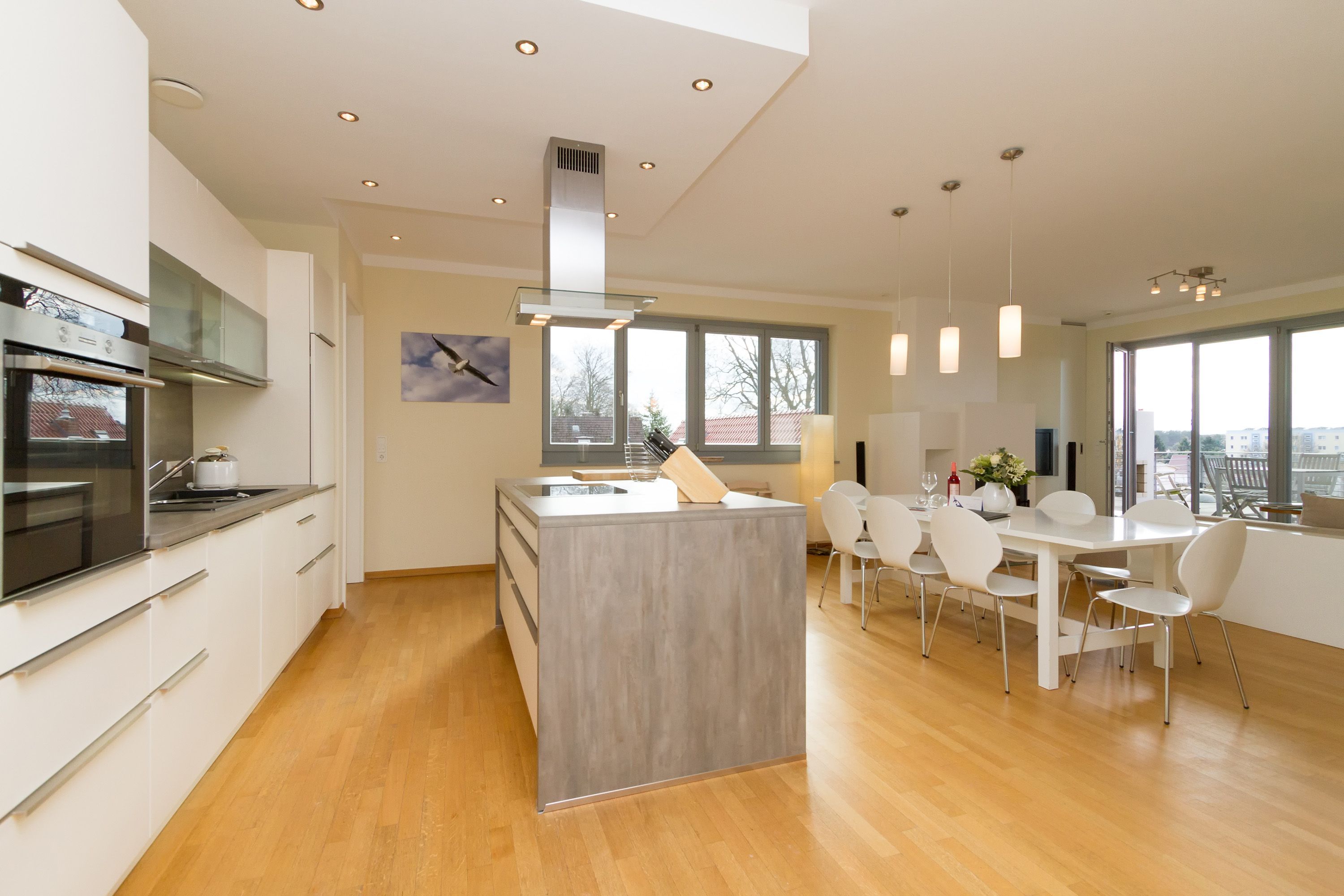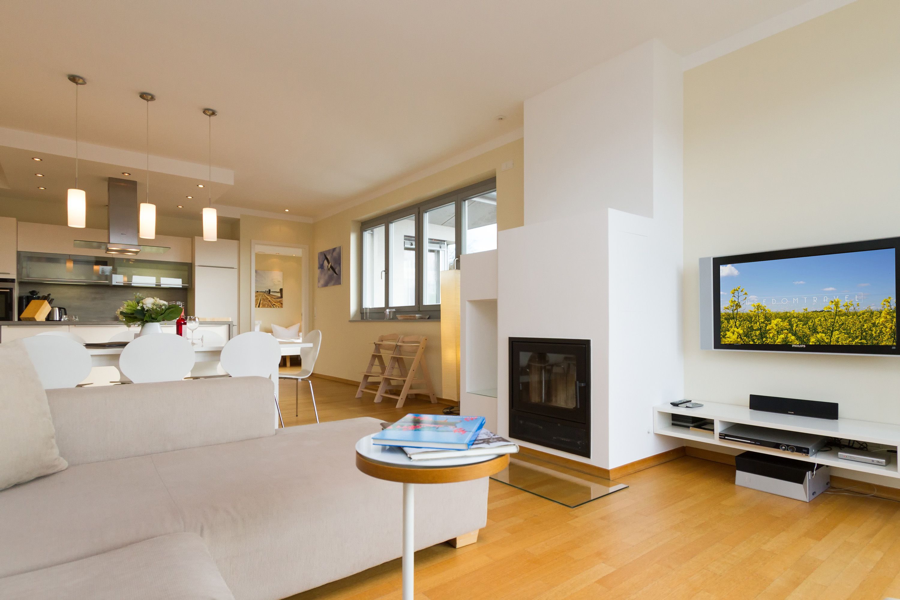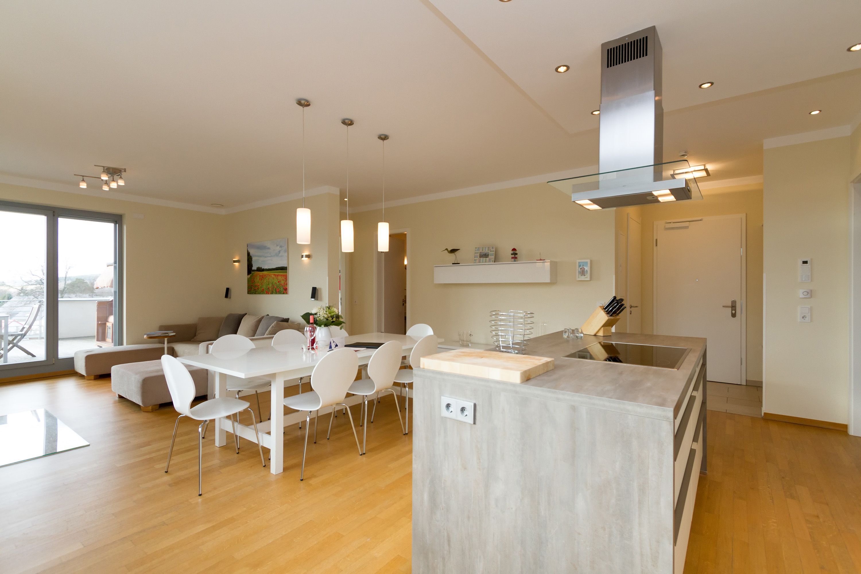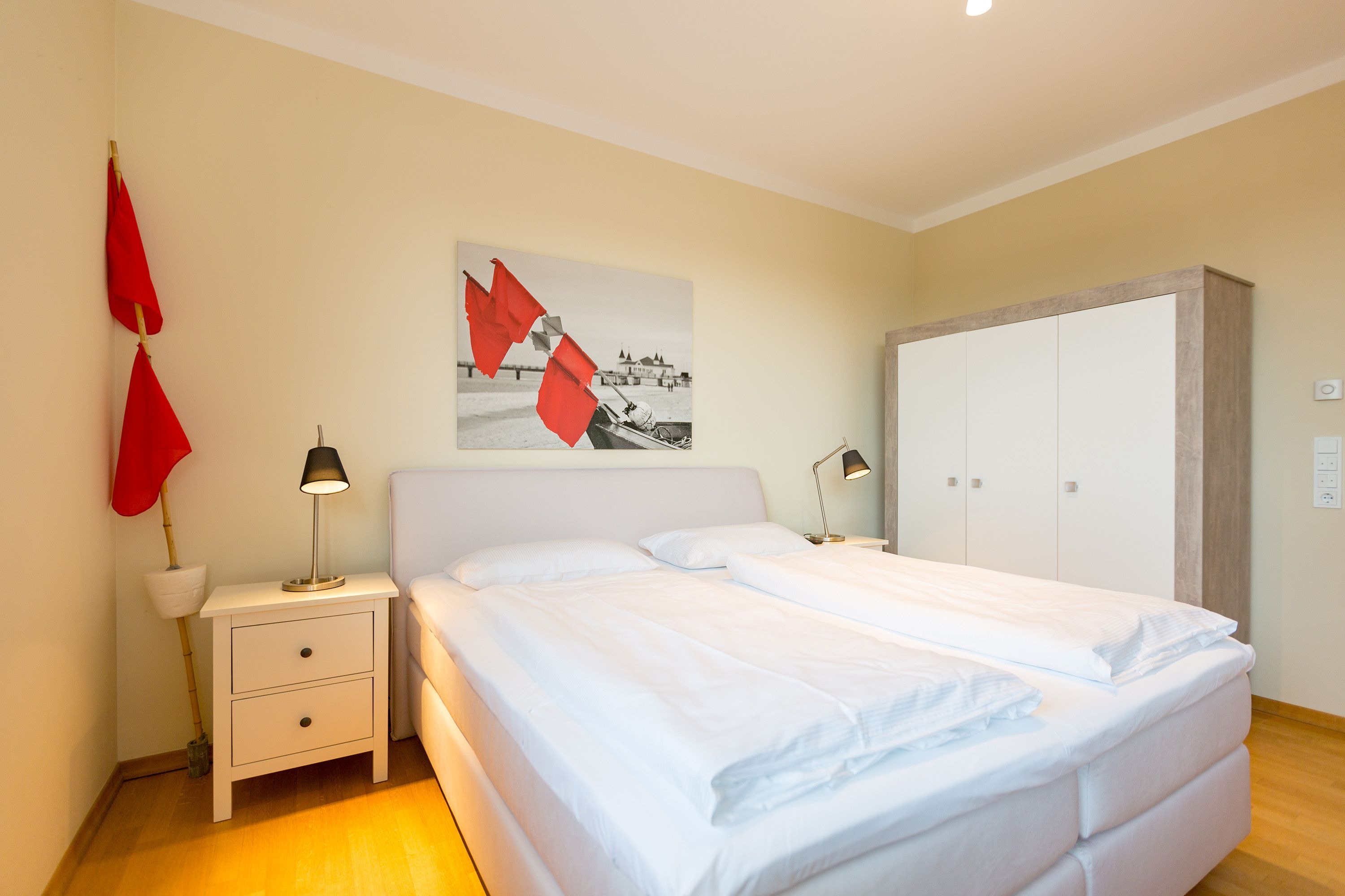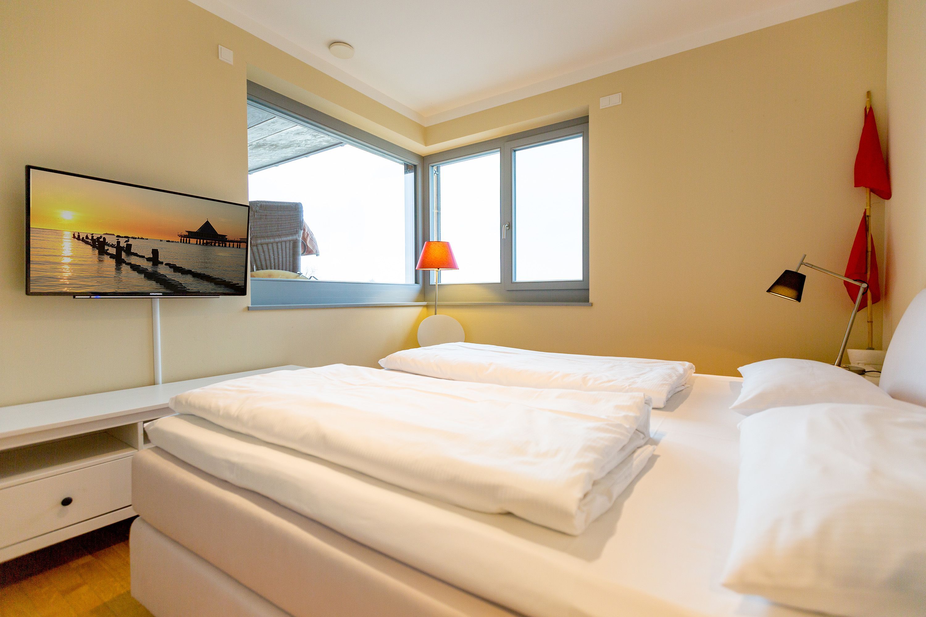 Sie wünschen sich viel Platz, zwei Wohlfühlbäder, eine perfekt ausgestattete Küche und ein geschmackvolles, wertiges Wohnambiente? Dann Sind Sie hier genau richtig. Mit viel Liebe zum Detail eingerichtet, erwartet Sie im 2. Obergeschoss ein außergewöhnlich großzügiges Urlaubsdomizil. 115 qm Wohnfläche aufgeteilt in Wohnbereich, offene, komplett ausgestattete Küche und 3 Schlafzimmer (1x 1,80m + Kinderbett/ 1x 1,60m / 1x Etagenbett) und 2 Bäder. Für Ihren Komfort steht die Erstausstattung Wäsche (Bettwäsche & Handtücher) für Sie bereit. Eine große sonnige Dachterrasse mit Strandkorb lädt zum Erholen ein. Die Infrarot-Kabine unterstreicht die Exklusivität dieser Ferienwohnung und ist ein Garant für lauschige Abende in der kalten Jahreszeit. Ein ideales Urlaubsdomizil für 4 Erwachsene und 2 Kinder bis 16 Jahren und ein Kleinkind. Das WLAN-Netz im Haus kann kostenfrei genutzt werden.