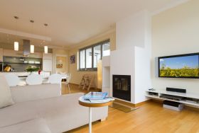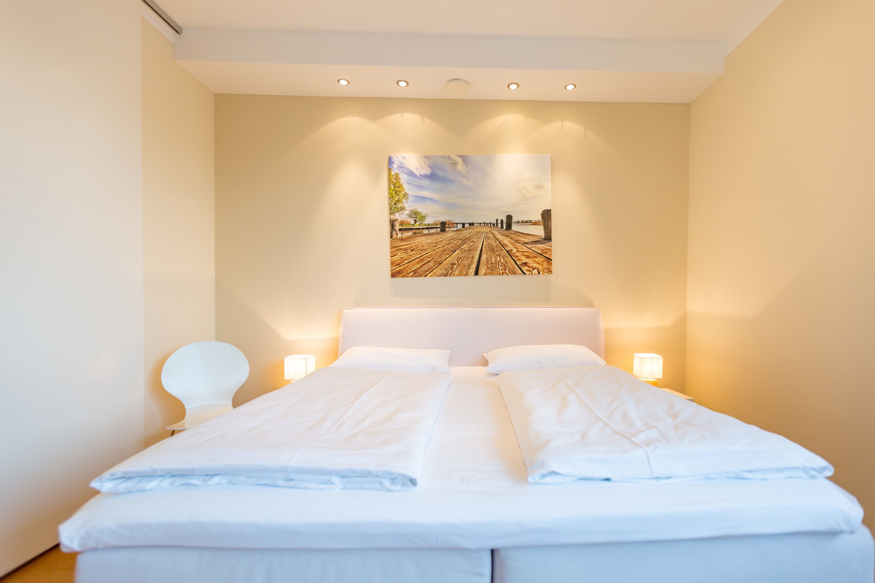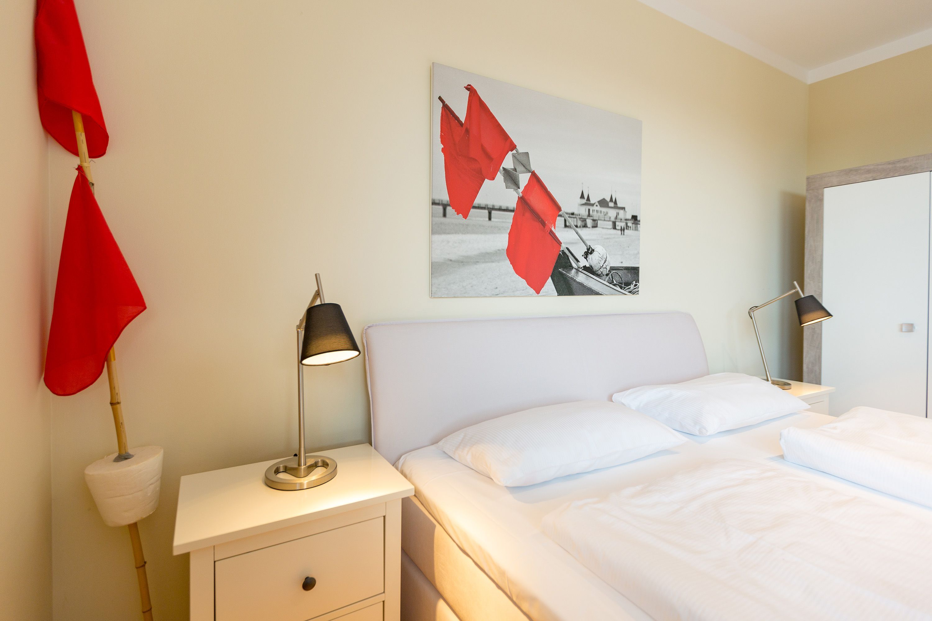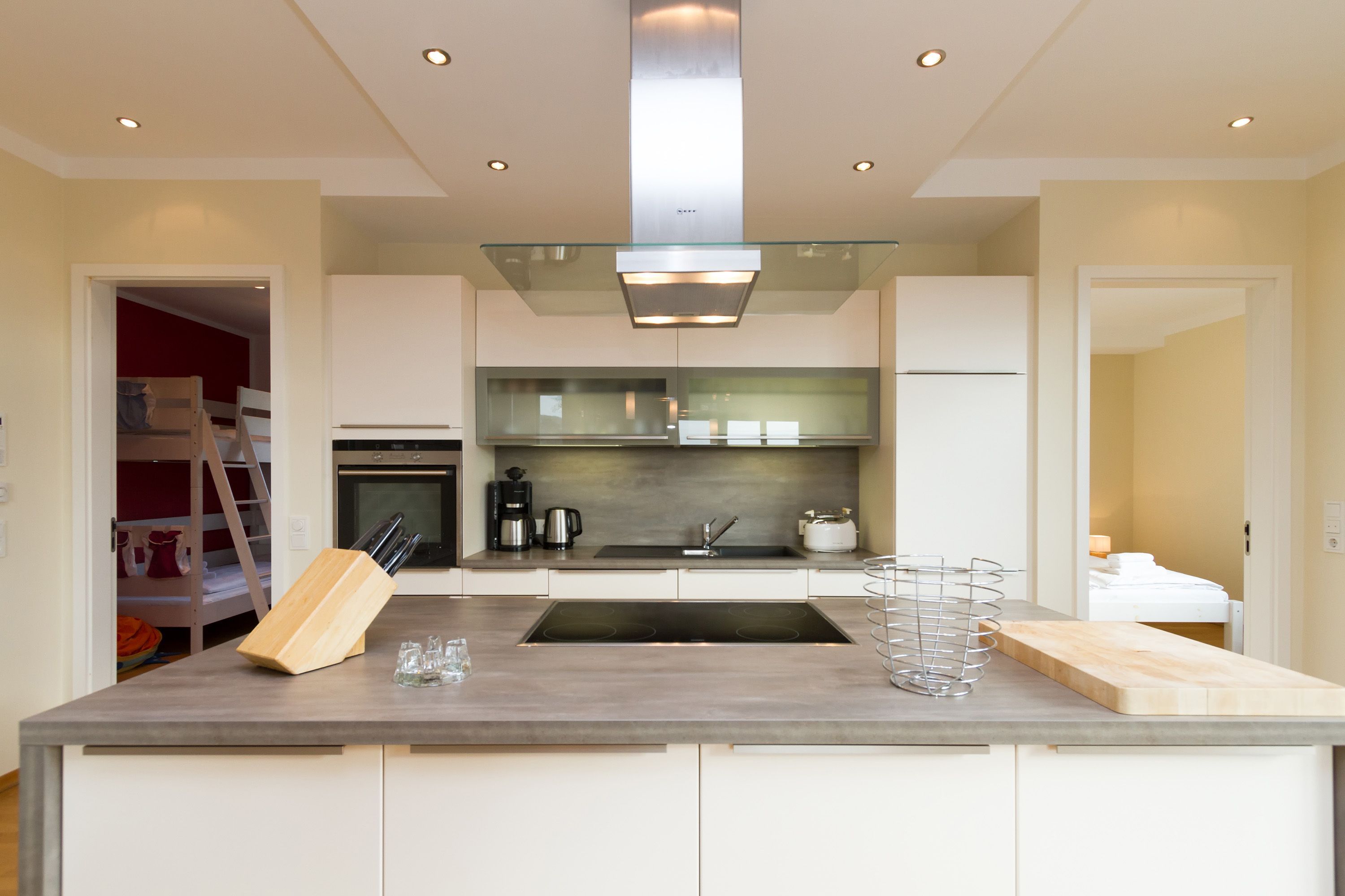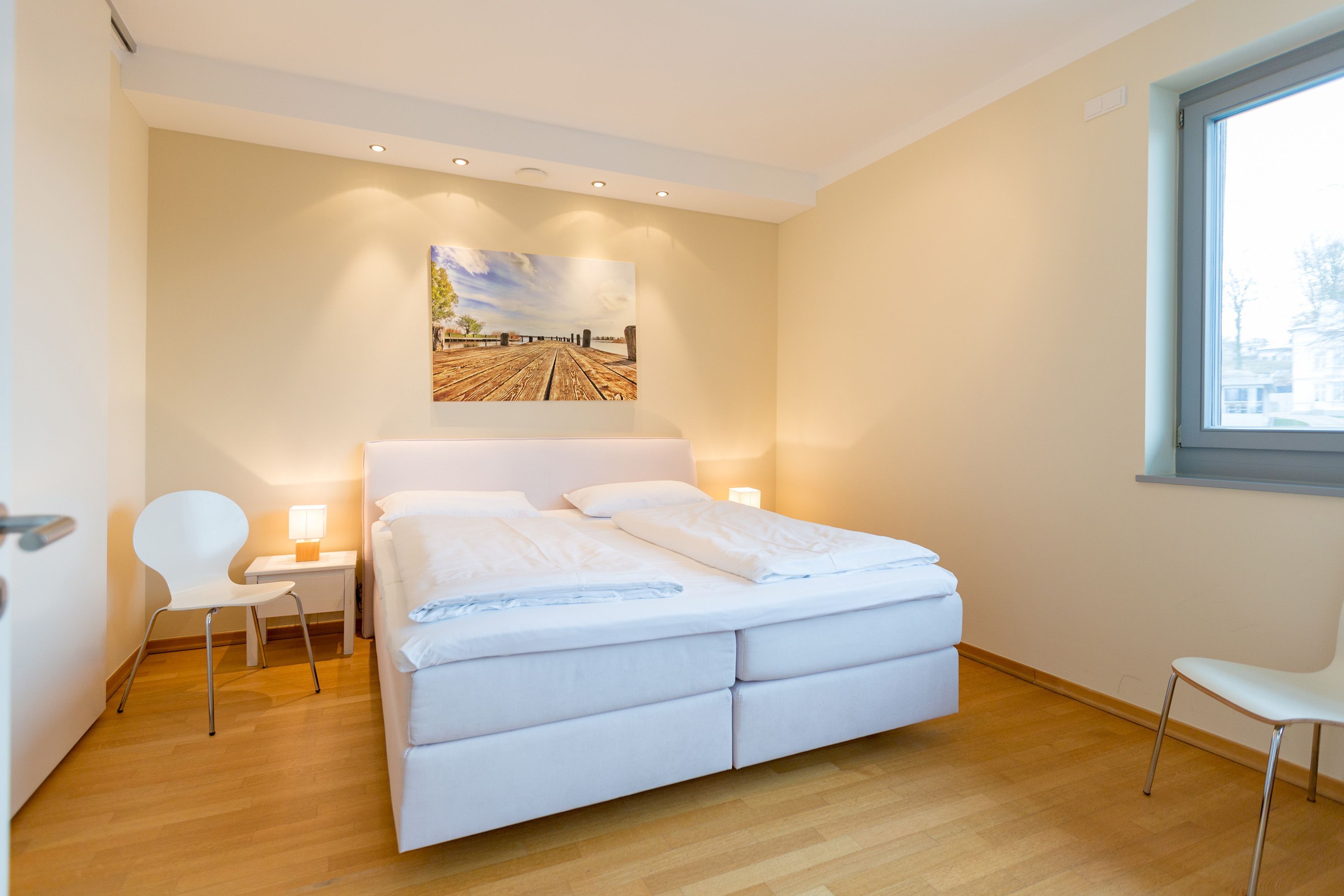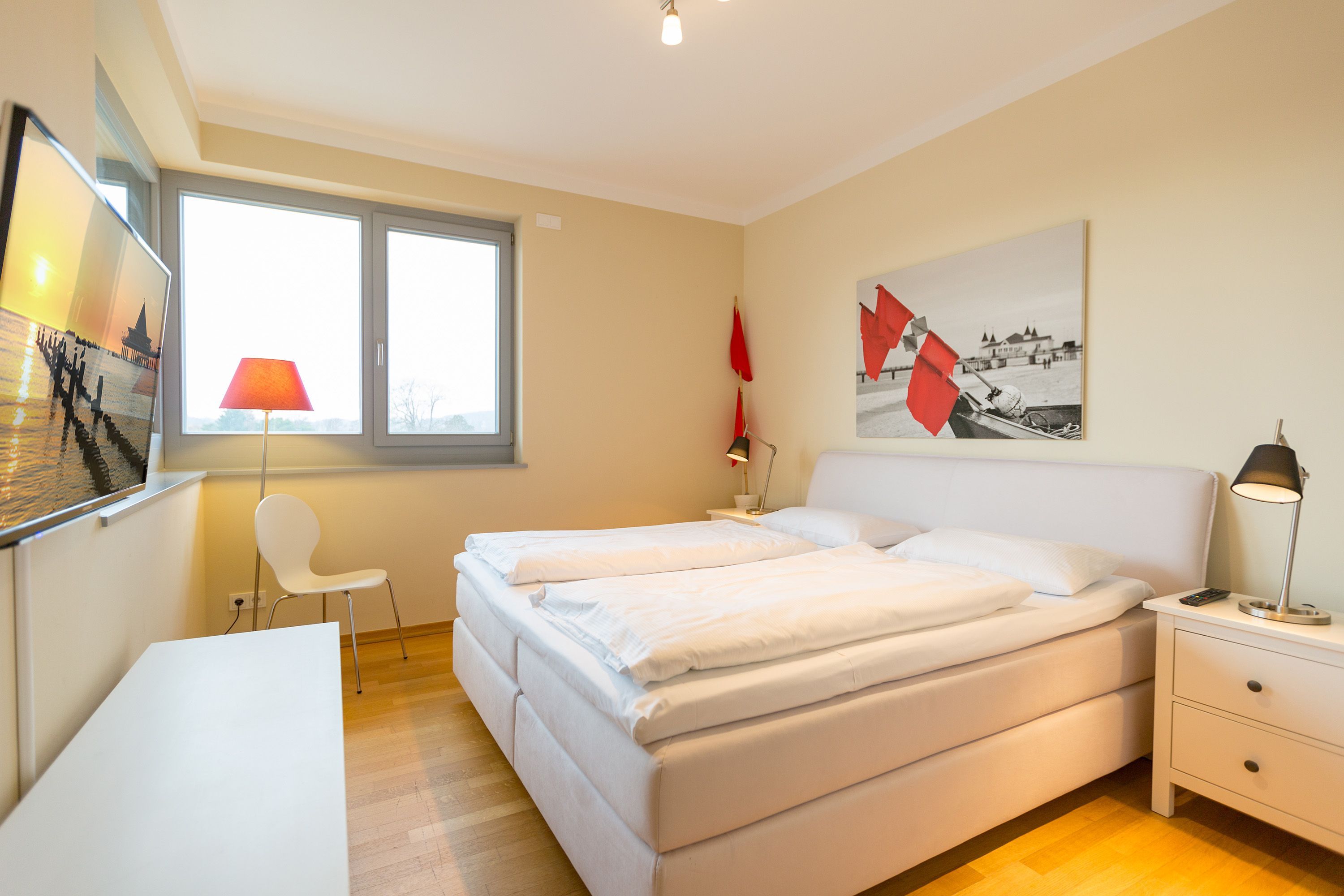 Sie wünschen sich viel Platz, zwei Wohlfühlbäder, eine perfekt ausgestattete Küche und ein geschmackvolles, wertiges Wohnambiente? Dann Sind Sie hier genau richtig. Mit viel Liebe zum Detail eingerichtet, erwartet Sie im 2. Obergeschoss ein außergewöhnlich großzügiges Urlaubsdomizil. 115 qm Wohnfläche aufgeteilt in Wohnbereich, offene, komplett ausgestattete Küche und 3 Schlafzimmer (1x 1,80m + Kinderbett/ 1x 1,60m / 1x Etagenbett) und 2 Bäder. Für Ihren Komfort steht die Erstausstattung Wäsche (Bettwäsche & Handtücher) für Sie bereit. Eine große sonnige Dachterrasse mit Strandkorb lädt zum Erholen ein. Die Infrarot-Kabine unterstreicht die Exklusivität dieser Ferienwohnung und ist ein Garant für lauschige Abende in der kalten Jahreszeit. Ein ideales Urlaubsdomizil für 4 Erwachsene und 2 Kinder bis 16 Jahren und ein Kleinkind. Das WLAN-Netz im Haus kann kostenfrei genutzt werden.