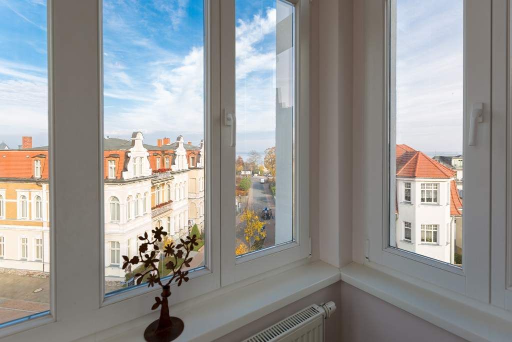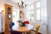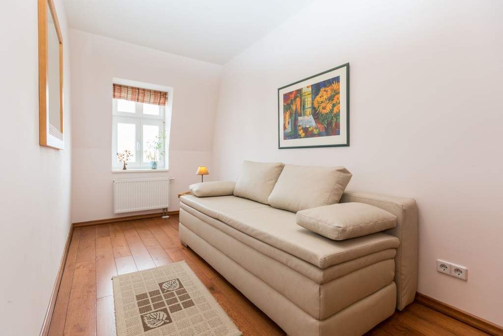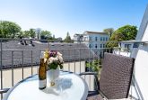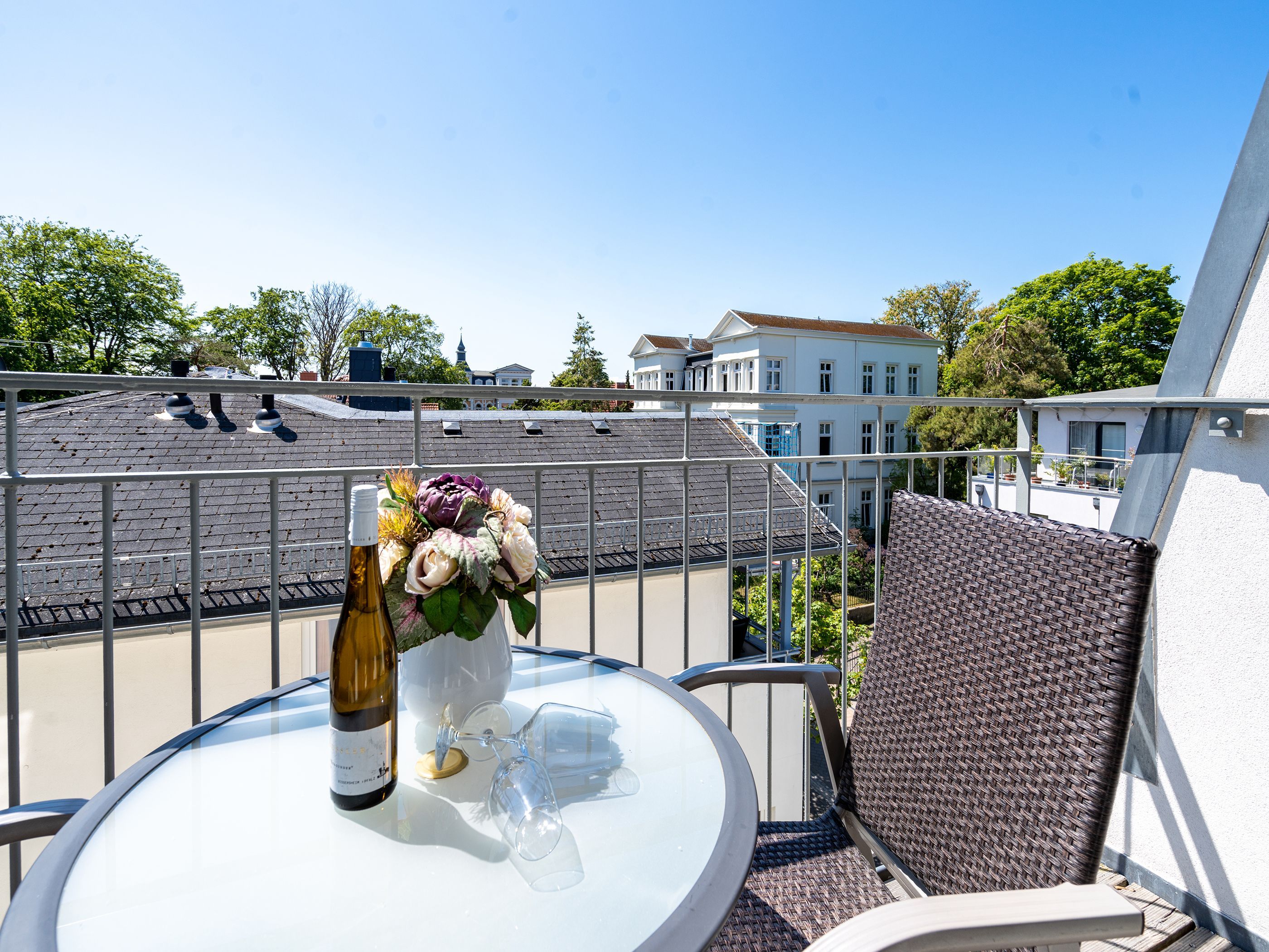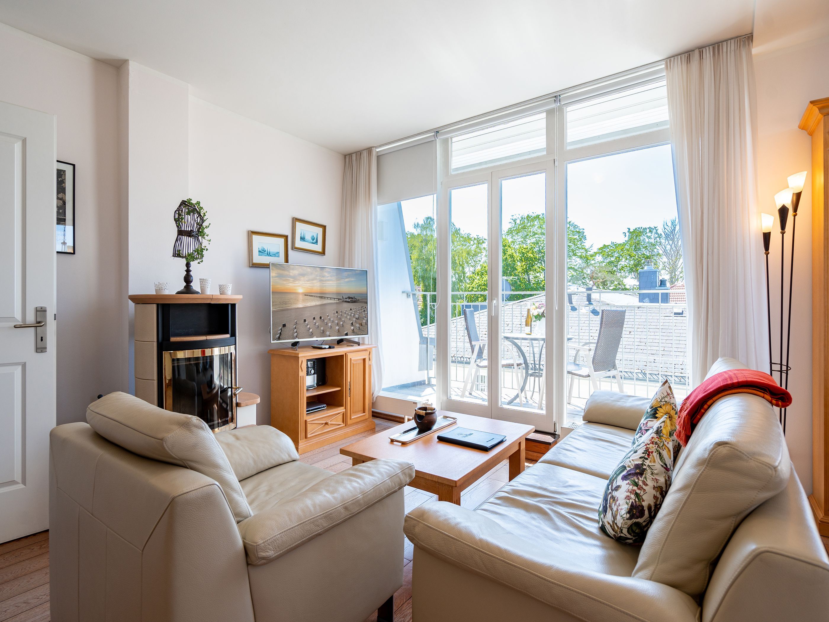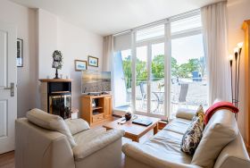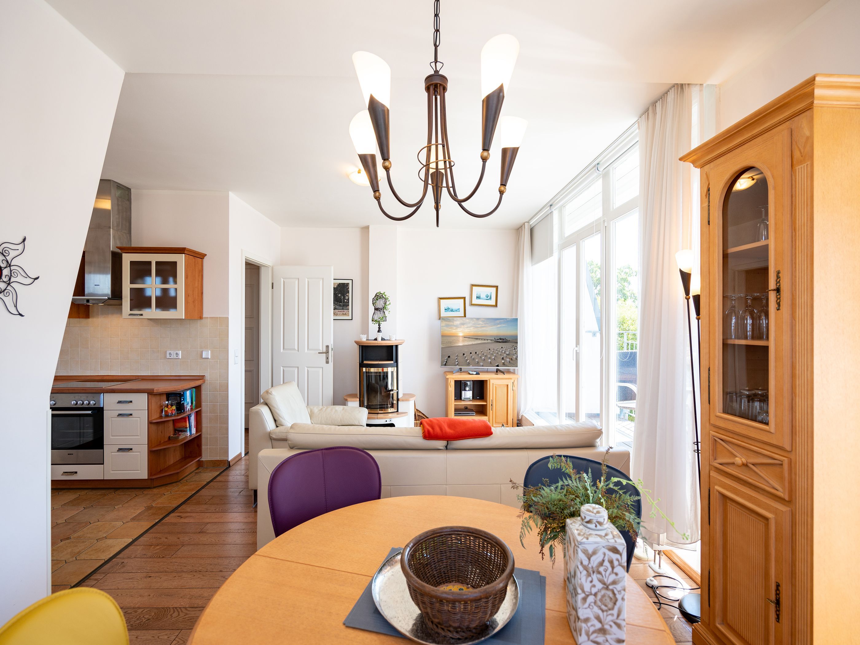 Stilvoll, Exklusiv, Extraklasse! Die Ferienwohnung 6 im Obergeschoß der Villa fasziniert durch warme, harmonierende Farben und Stoffe. Hier überzeugen edle Materialien – mediterrane Möblierung von Chalet, Echtholzböden und ein Kaminofen im Wohnbereich. Ein Schlafzimmer mit Doppelbett ( Breite 1,80m) und ein weiterer Schlafbereich mit komfortabler Schlafcouch, die man zu einer Doppelliege umfunktionieren kann, bieten 4 Personen Platz für erholsame Nächte. Für Ihren Komfort steht die Erstausstattung Wäsche (Bettwäsche & Handtücher) für Sie bereit. Im Erker mit großem Lesesessel entspannt man beim Blick auf die Ostsee oder Sie genießen die Abendsonne auf Ihrem Südbalkon. Schöner wohnen im Urlaub!