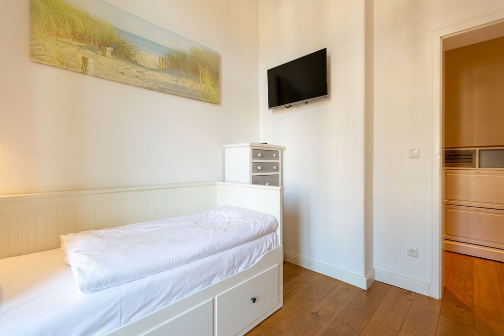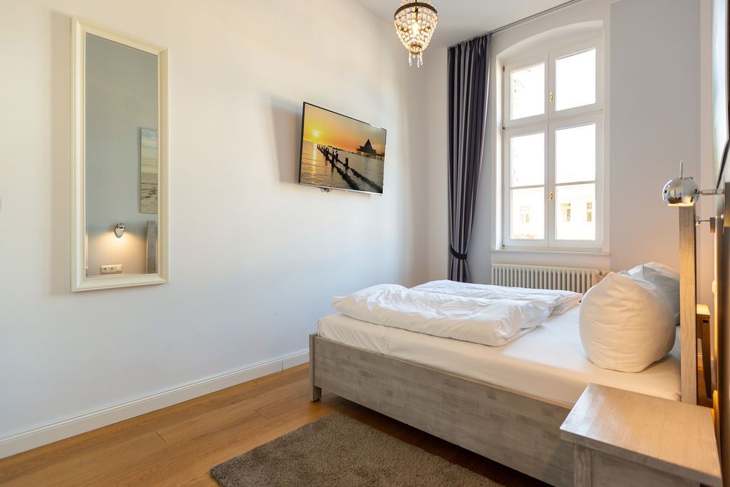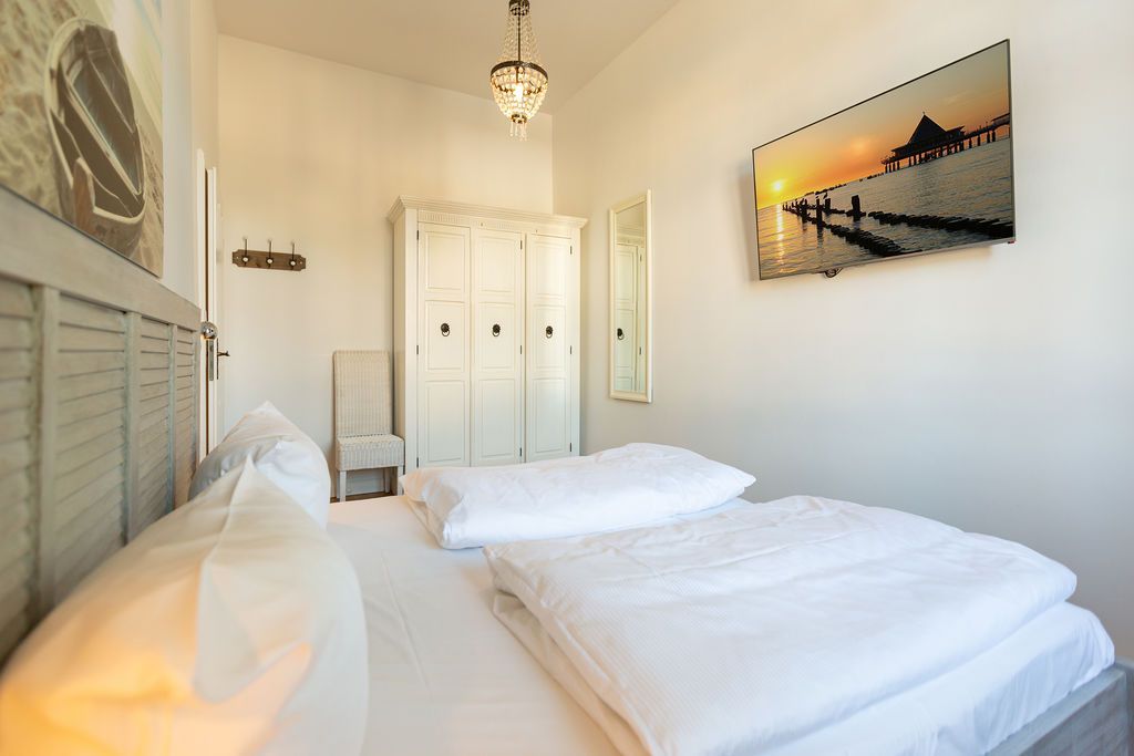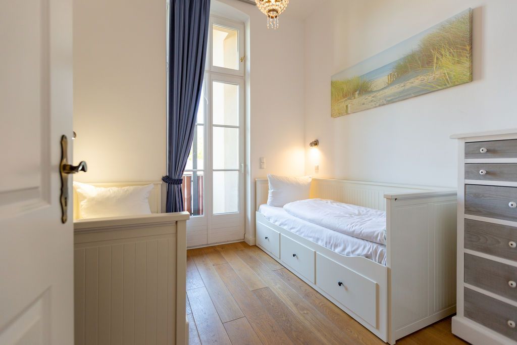Freuen Sie sich auf eine erholsame Auszeit in der 3-Raum-Ferienwohnung Nr. 09 (79 qm) in der 1. Etage der charmanten Villa Saphira. Die Wohnung bietet Platz für bis zu 4 Personen und 1 Kleinkind (bis 3 Jahre) und überzeugt durch ihre stilvolle Einrichtung, eine Loggia mit Promenadenblick und einen eingeschränkten Meerblick durch die Begrünung. Der helle Wohnbereich ist mit einer gemütlichen Sitzgruppe, einem Kaminofen und einem Flat-TV ausgestattet und lädt zu entspannten Stunden ein. Direkt angrenzend finden Sie die charmante Loggia mit Küchenzeile, Essplatz und einem wunderschönen Blick zur Promenade. Die beiden Schlafzimmer bieten höchsten Schlafkomfort: Ein Schlafzimmer verfügt über zwei Einzelbetten (0,80 m x 2,00 m), Flat-TV und Zugang zum sonnigen Südbalkon (ca. 7 qm). Das zweite Schlafzimmer ist mit einem großzügigen Doppelbett (1,80 m x 2,00 m) und ebenfalls einem Flat-TV ausgestattet. Das moderne Badezimmer mit Dusche und WC rundet das Komfortangebot ab. Kostenloses WLAN und ein eigener PKW-Stellplatz am Haus stehen Ihnen ebenfalls zur Verfügung. Für Familien stellen wir auf Wunsch ein Kinderreisebett (ohne zusätzliche Matratze und Bettzeug) und einen Hochstuhl gegen einen kleinen Aufpreis bereit. Damit Sie sich von Anfang an wohlfühlen, sind die Betten bei Ihrer Ankunft bereits bezogen, und eine Erstausstattung mit Handtüchern liegt für Sie bereit. Genießen Sie die perfekte Kombination aus Komfort, Eleganz und einer hervorragenden Lage in der Villa Saphira. Wir freuen uns darauf, Sie willkommen zu heißen!