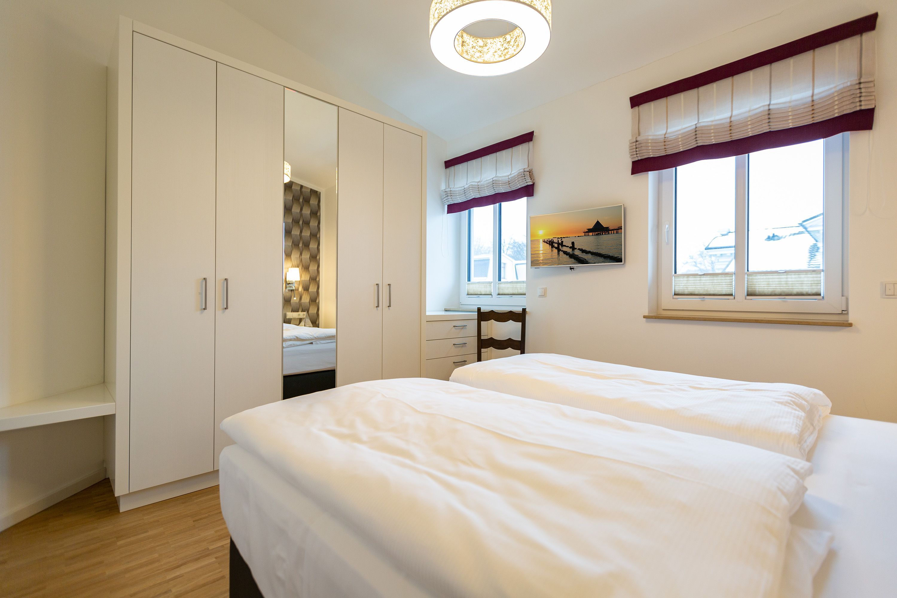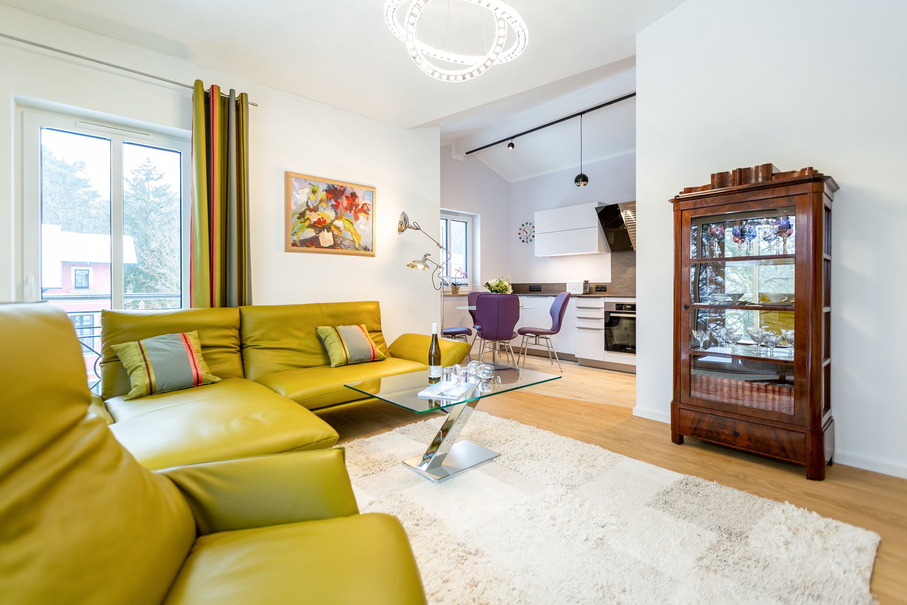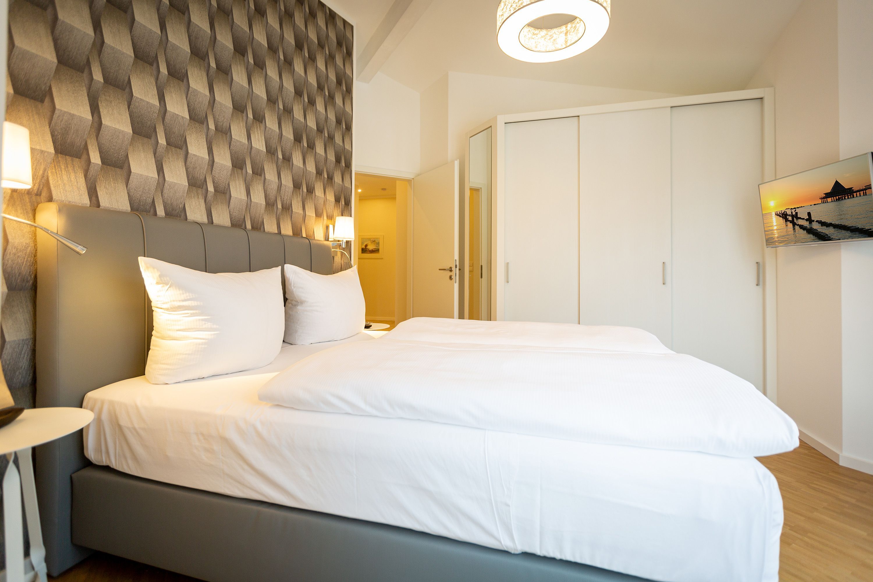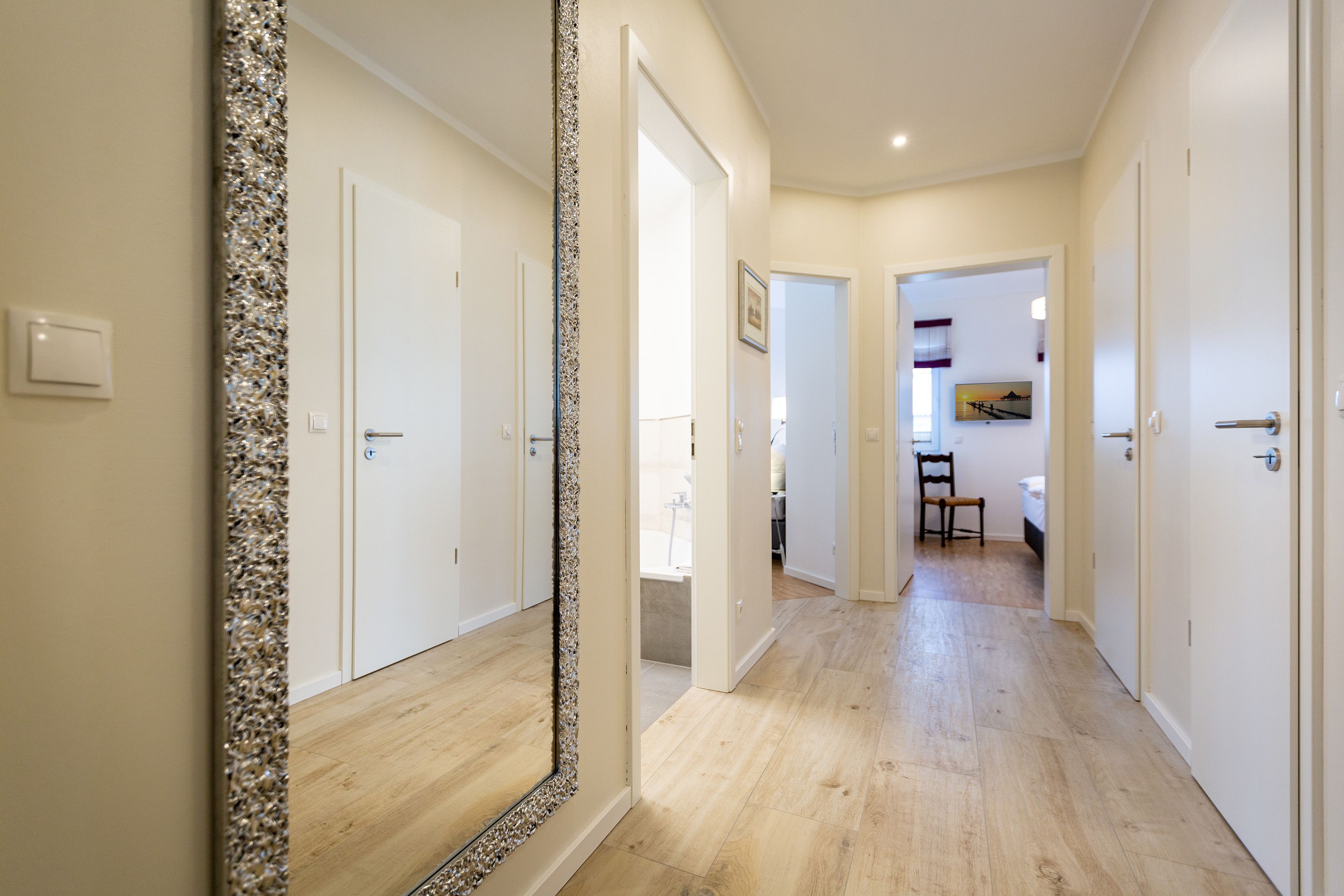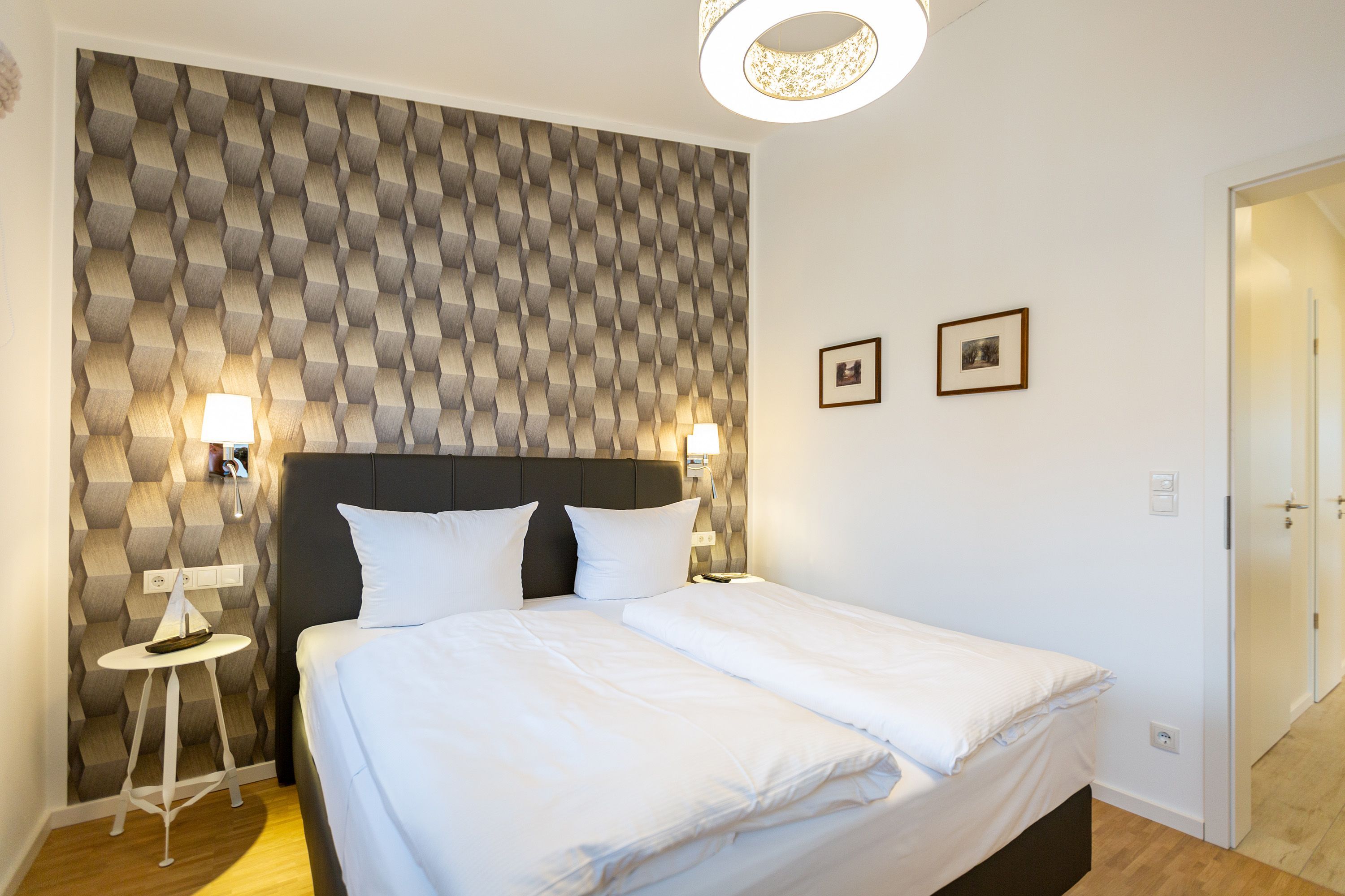 Das Appartement Nummer 8 in der 3. Etage setzt auf seinen 79 Quadratmetern gleich mehrere Akzente: Farbakzente, Lichtakzente und Designakzente. Alles zusammen sorgt dafür, dass sich die bis zu vier Personen in dem Drei-Zimmer-Urlaubsdomizil rundum wohlfühlen. Hier ist nichts 0815. Schon gar nicht die Farben. Dezent, aber dennoch präsent verleihen sie der Wohnung eine behagliche Atmosphäre: Von der lindgrünen Leder-Landschaft zum Faulenzen und Entspannen bis zum Indigo der Stühle rund um den Esstisch. Große, helle Räume sorgen für Leichtigkeit und Komfort. Treten Sie vom Wohnzimmer aus auf den sonnigen Süd-Ost-Balkon (6 Quadratmeter) und atmen Sie die gesunde Ostseeluft tief in sich ein. Ebenfalls an das geräumige Wohnzimmer angeschlossen, ist die offene Küche mit einer voll ausgestattete Küchenzeile und einem schönen Essplatz. Alle Geräte sind Markengeräte. Ein komplettes Geschirr-Service finden Sie in den Schränken. Auch die beiden Schlafzimmer empfangen den Gast mit modernem Design. Jedes verfügt über ein Boxspringdoppelbett (eines 1,80 m x 2,00 m, das zweite 1,60 m x 2,00 m) sowie einen extra angefertigten Kleiderschrank. Alle drei Zimmer des Appartements sind mit einem Flat-TV ausgestattet. In den beiden Badezimmern sind je eine Dusche und eine Toilette vorhanden. Darüber hinaus besitzt das Masterbad eine Badewanne und ein Bidet. Handtücher liegen selbstverständlich bereit und auch die Betten sind bereits bezogen. Zu dem Appartement gehört der Außenstellplatz Nummer 8 im Hof. In einem separaten und abschließbaren Kellerraum befindet sich eine Ladestation für E-Bikes. Der WLAN-Zugang ist kostenfrei. Sie brauchen also nur ankommen, mit dem Fahrstuhl in die 3. Etage fahren und schon sind Sie mitten im Urlaub.