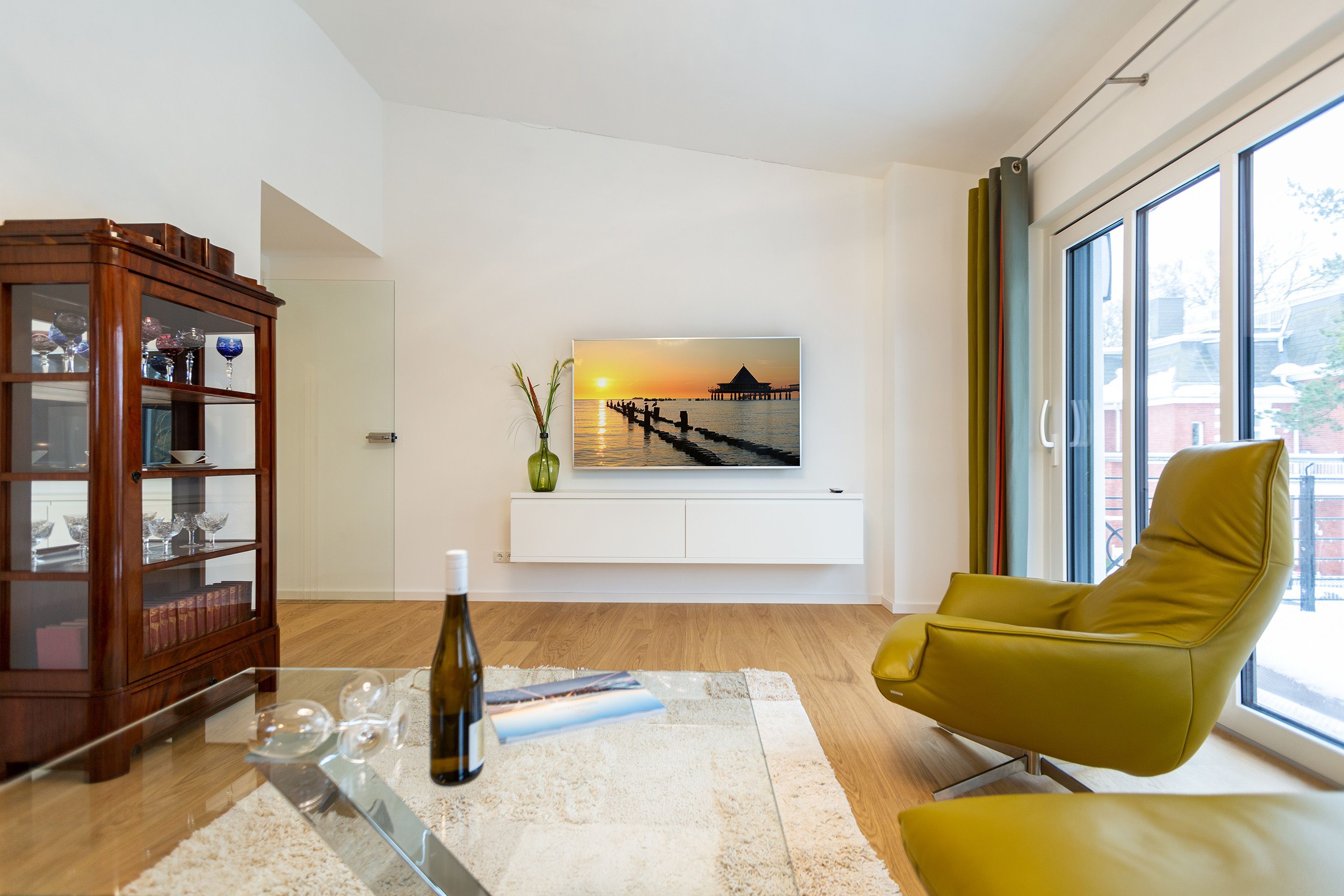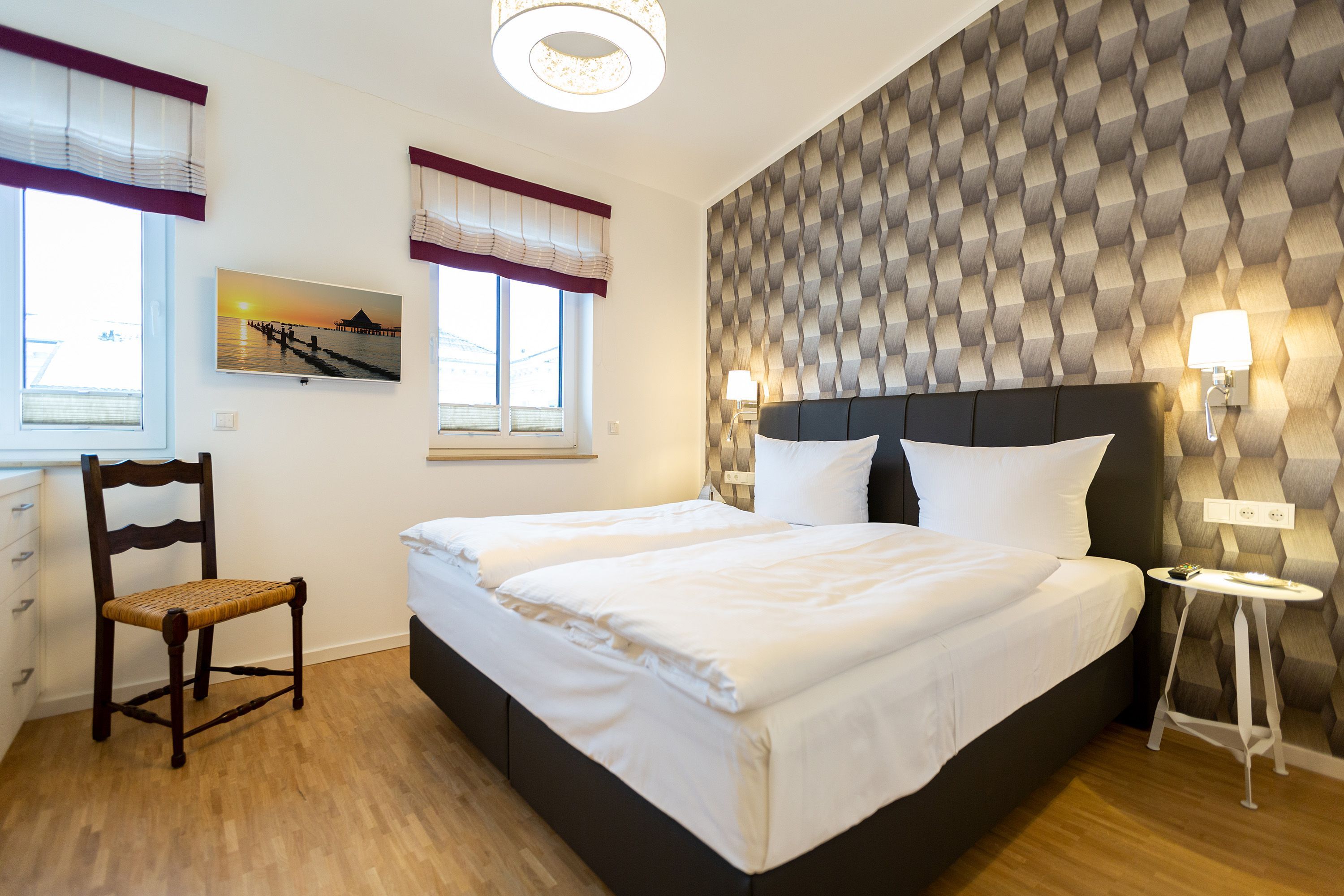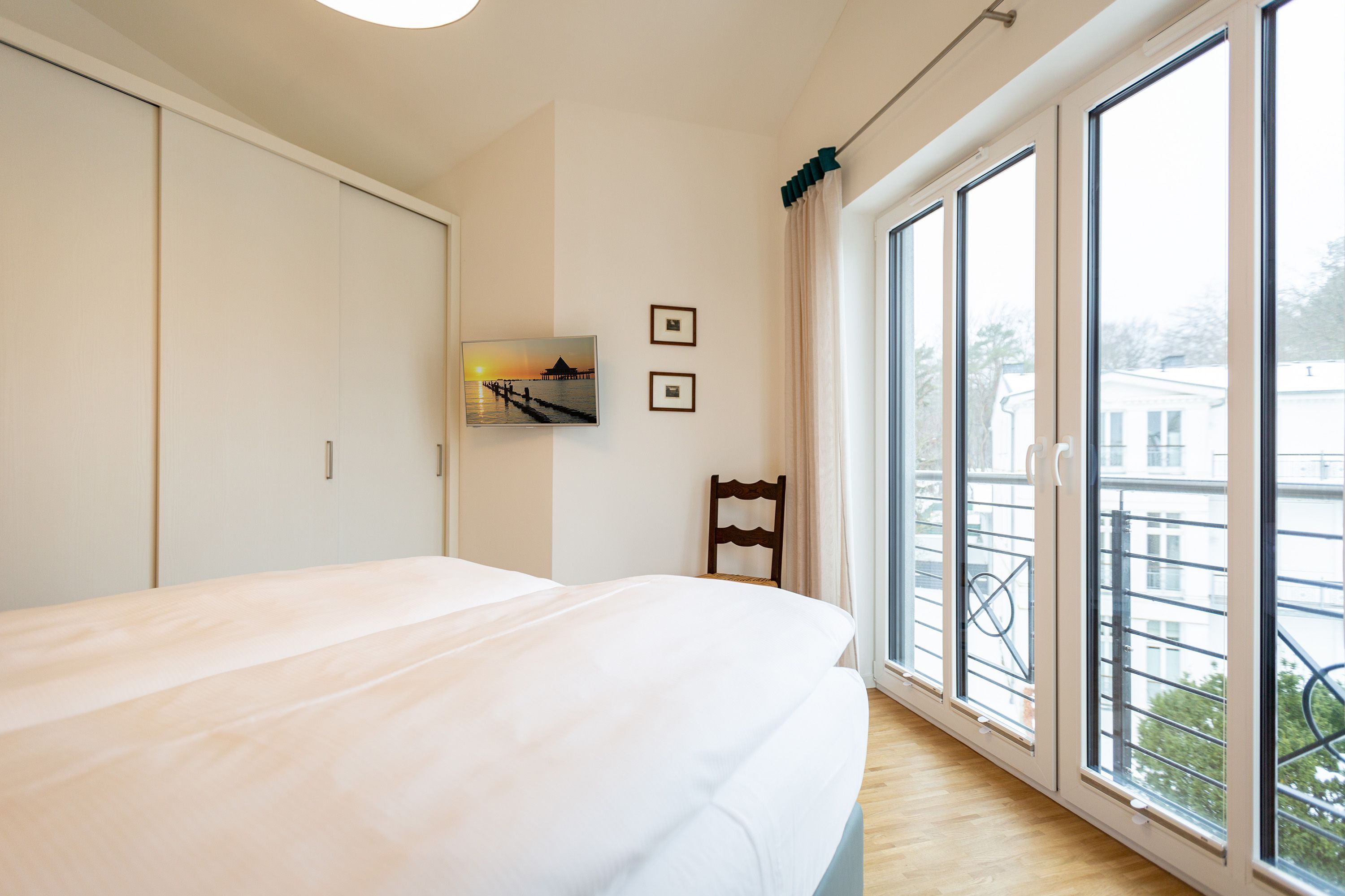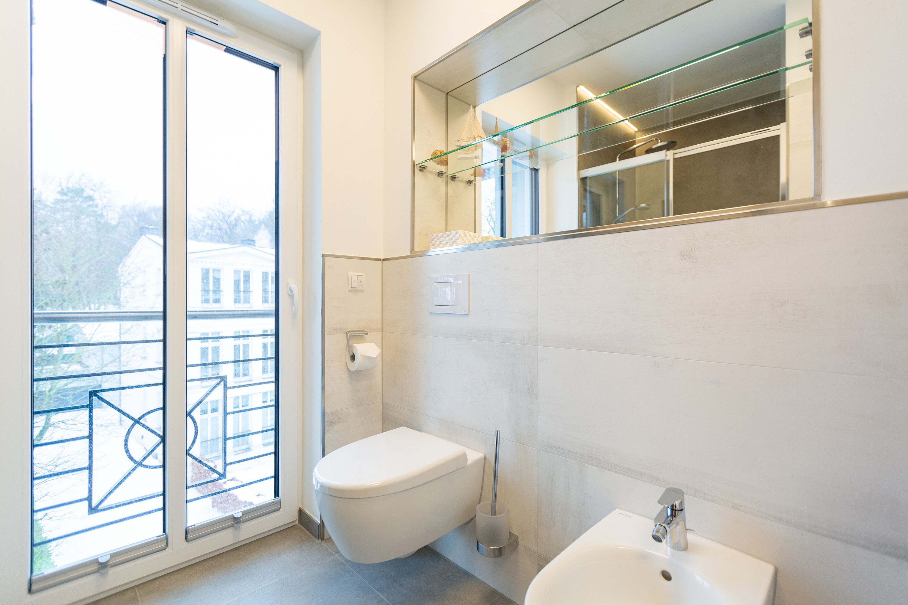 Das Appartement Nummer 8 in der 3. Etage setzt auf seinen 79 Quadratmetern gleich mehrere Akzente: Farbakzente, Lichtakzente und Designakzente. Alles zusammen sorgt dafür, dass sich die bis zu vier Personen in dem Drei-Zimmer-Urlaubsdomizil rundum wohlfühlen. Hier ist nichts 0815. Schon gar nicht die Farben. Dezent, aber dennoch präsent verleihen sie der Wohnung eine behagliche Atmosphäre: Von der lindgrünen Leder-Landschaft zum Faulenzen und Entspannen bis zum Indigo der Stühle rund um den Esstisch. Große, helle Räume sorgen für Leichtigkeit und Komfort. Treten Sie vom Wohnzimmer aus auf den sonnigen Süd-Ost-Balkon (6 Quadratmeter) und atmen Sie die gesunde Ostseeluft tief in sich ein. Ebenfalls an das geräumige Wohnzimmer angeschlossen, ist die offene Küche mit einer voll ausgestattete Küchenzeile und einem schönen Essplatz. Alle Geräte sind Markengeräte. Ein komplettes Geschirr-Service finden Sie in den Schränken. Auch die beiden Schlafzimmer empfangen den Gast mit modernem Design. Jedes verfügt über ein Boxspringdoppelbett (eines 1,80 m x 2,00 m, das zweite 1,60 m x 2,00 m) sowie einen extra angefertigten Kleiderschrank. Alle drei Zimmer des Appartements sind mit einem Flat-TV ausgestattet. In den beiden Badezimmern sind je eine Dusche und eine Toilette vorhanden. Darüber hinaus besitzt das Masterbad eine Badewanne und ein Bidet. Handtücher liegen selbstverständlich bereit und auch die Betten sind bereits bezogen. Zu dem Appartement gehört der Außenstellplatz Nummer 8 im Hof. In einem separaten und abschließbaren Kellerraum befindet sich eine Ladestation für E-Bikes. Der WLAN-Zugang ist kostenfrei. Sie brauchen also nur ankommen, mit dem Fahrstuhl in die 3. Etage fahren und schon sind Sie mitten im Urlaub.