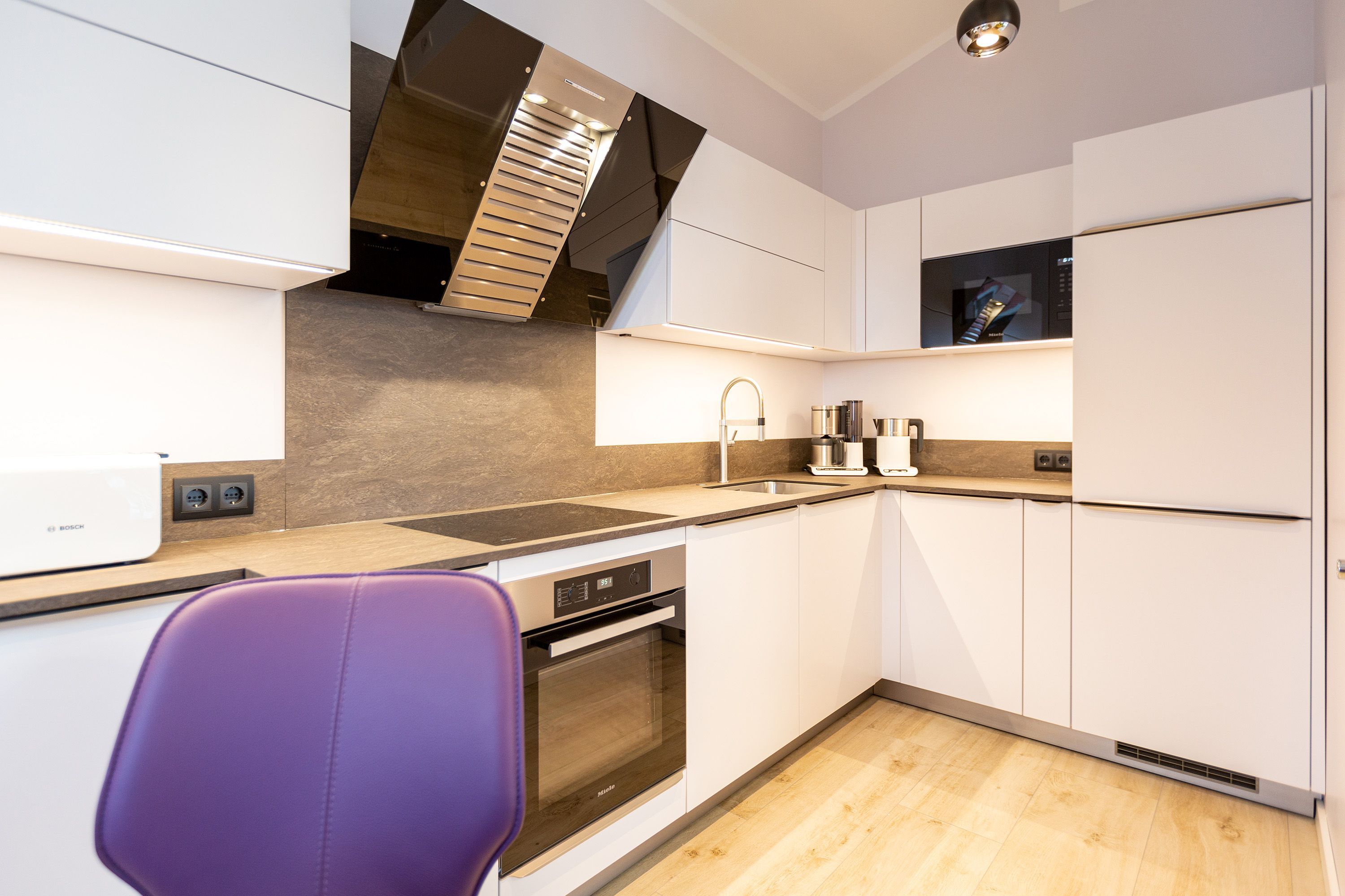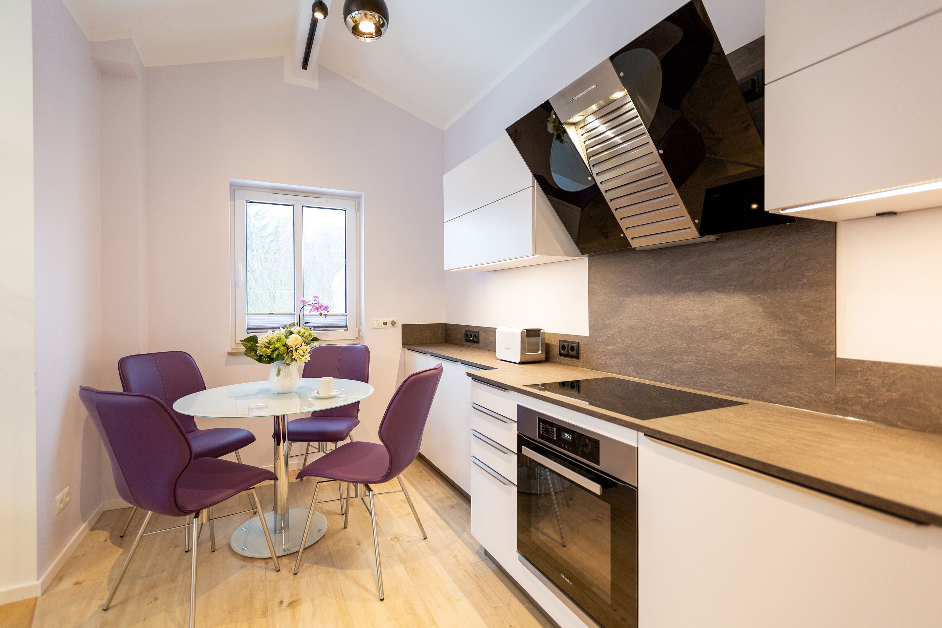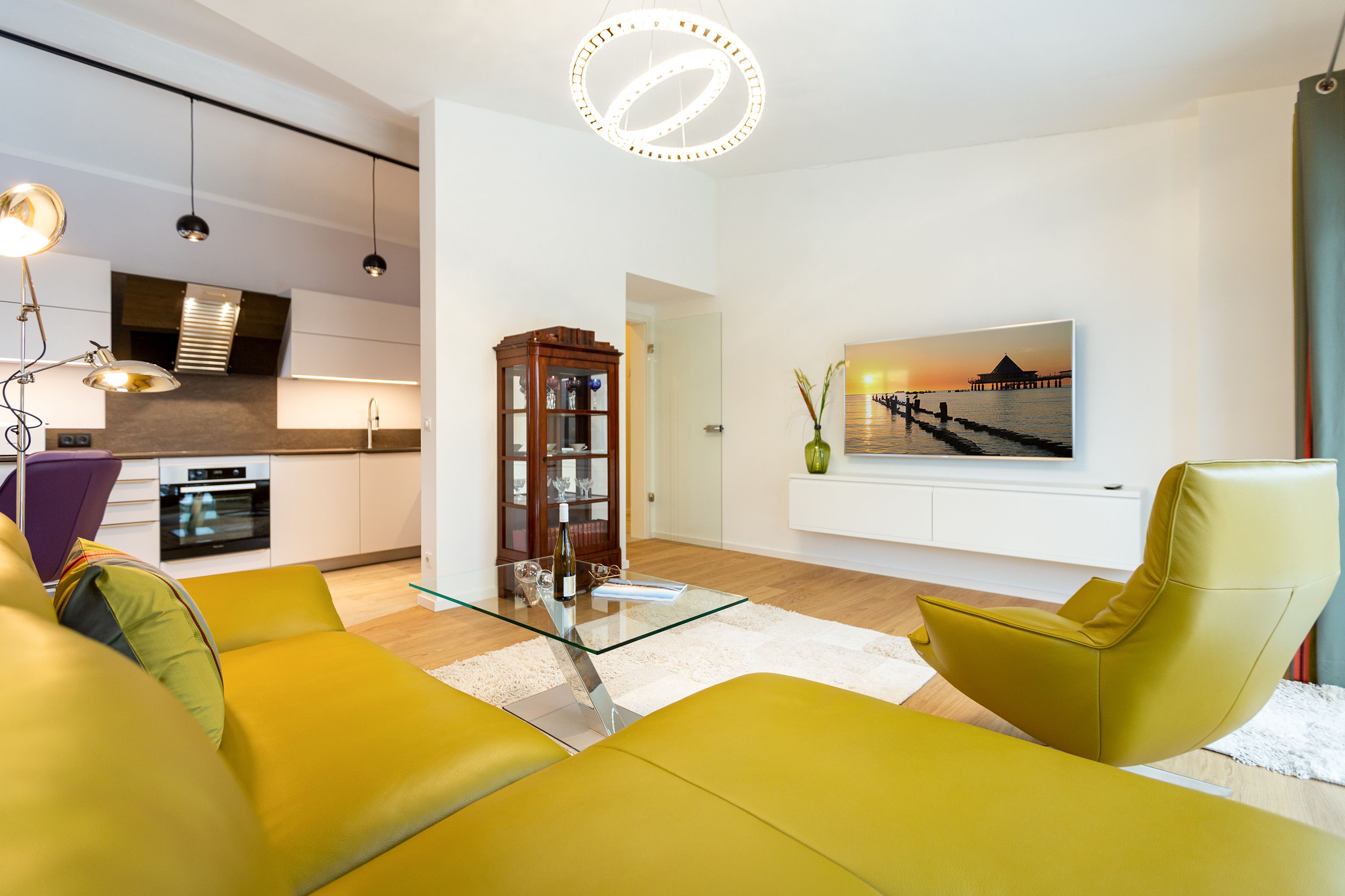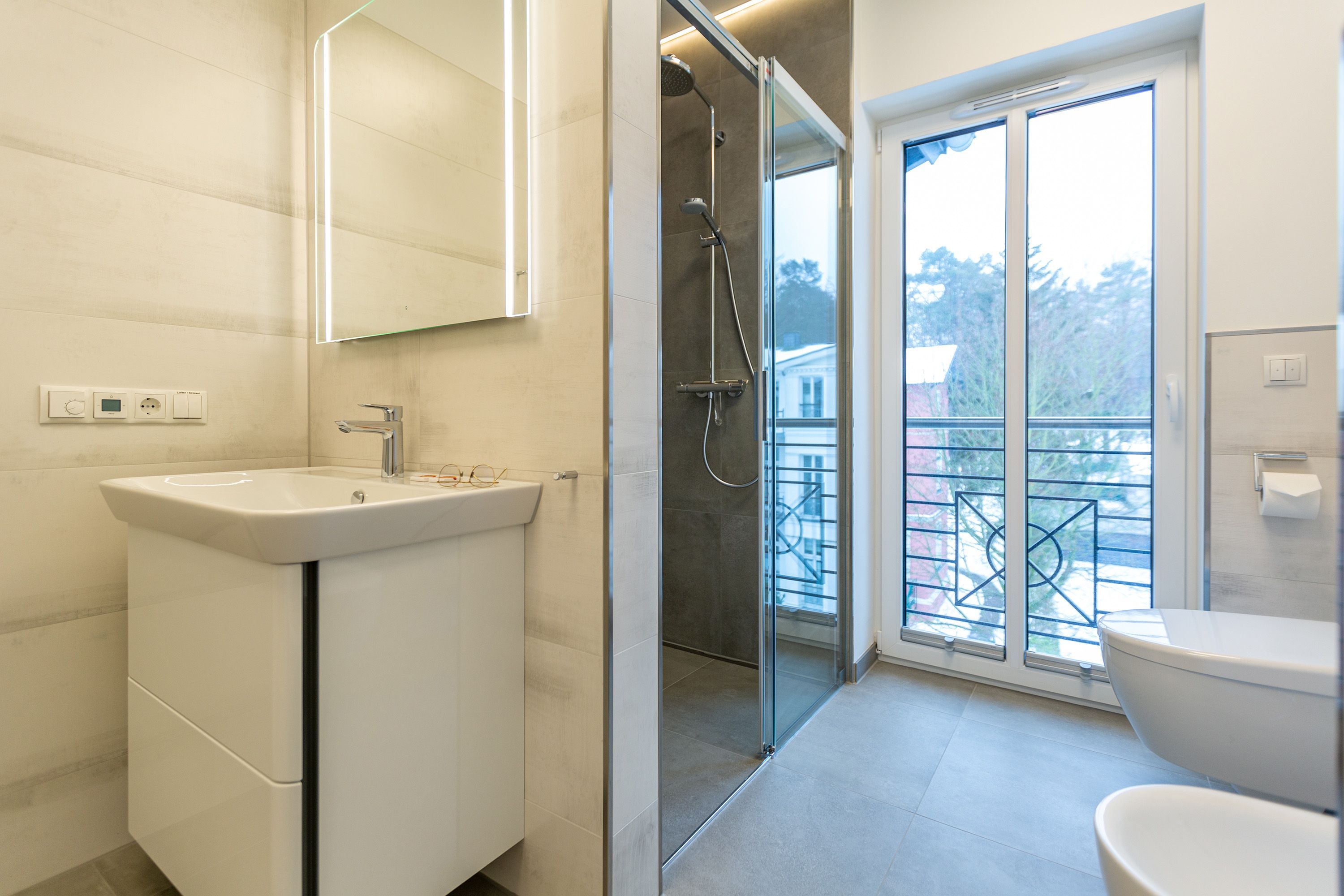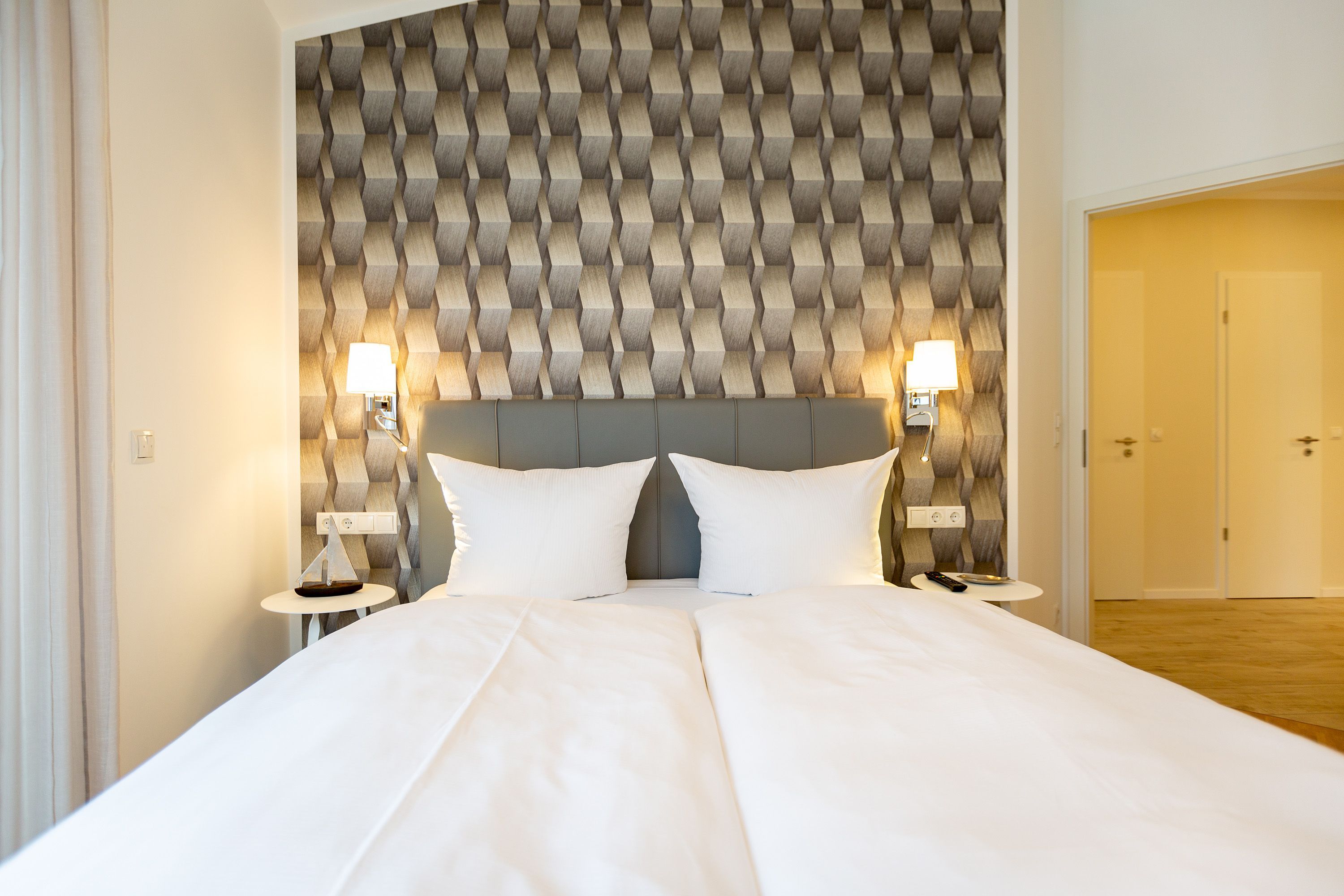Das Appartement Nummer 8 in der 3. Etage setzt auf seinen 79 Quadratmetern gleich mehrere Akzente: Farbakzente, Lichtakzente und Designakzente. Alles zusammen sorgt dafür, dass sich die bis zu vier Personen in dem Drei-Zimmer-Urlaubsdomizil rundum wohlfühlen. Hier ist nichts 0815. Schon gar nicht die Farben. Dezent, aber dennoch präsent verleihen sie der Wohnung eine behagliche Atmosphäre: Von der lindgrünen Leder-Landschaft zum Faulenzen und Entspannen bis zum Indigo der Stühle rund um den Esstisch. Große, helle Räume sorgen für Leichtigkeit und Komfort. Treten Sie vom Wohnzimmer aus auf den sonnigen Süd-Ost-Balkon (6 Quadratmeter) und atmen Sie die gesunde Ostseeluft tief in sich ein. Ebenfalls an das geräumige Wohnzimmer angeschlossen, ist die offene Küche mit einer voll ausgestattete Küchenzeile und einem schönen Essplatz. Alle Geräte sind Markengeräte. Ein komplettes Geschirr-Service finden Sie in den Schränken. Auch die beiden Schlafzimmer empfangen den Gast mit modernem Design. Jedes verfügt über ein Boxspringdoppelbett (eines 1,80 m x 2,00 m, das zweite 1,60 m x 2,00 m) sowie einen extra angefertigten Kleiderschrank. Alle drei Zimmer des Appartements sind mit einem Flat-TV ausgestattet. In den beiden Badezimmern sind je eine Dusche und eine Toilette vorhanden. Darüber hinaus besitzt das Masterbad eine Badewanne und ein Bidet. Handtücher liegen selbstverständlich bereit und auch die Betten sind bereits bezogen. Zu dem Appartement gehört der Außenstellplatz Nummer 8 im Hof. In einem separaten und abschließbaren Kellerraum befindet sich eine Ladestation für E-Bikes. Der WLAN-Zugang ist kostenfrei. Sie brauchen also nur ankommen, mit dem Fahrstuhl in die 3. Etage fahren und schon sind Sie mitten im Urlaub.
