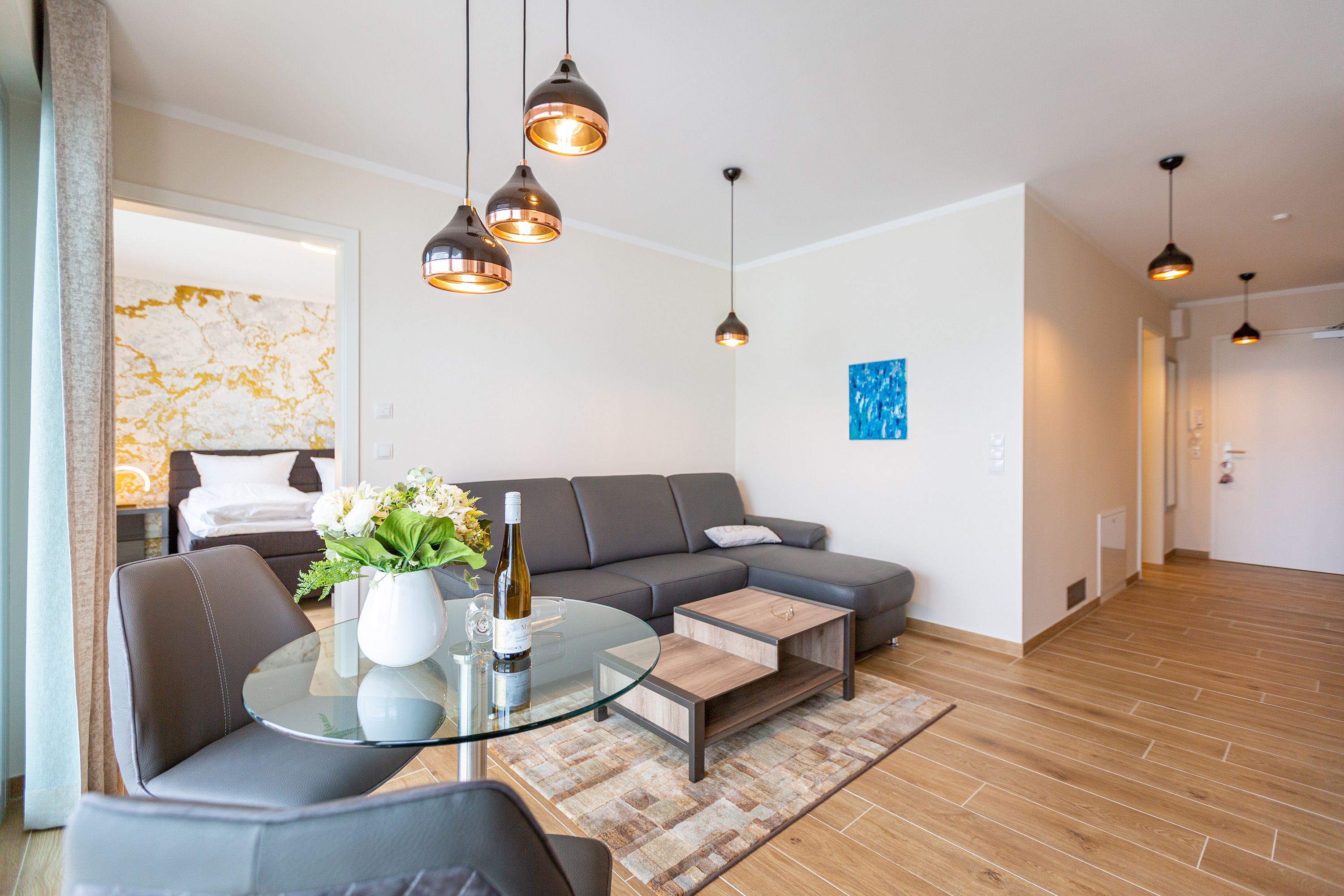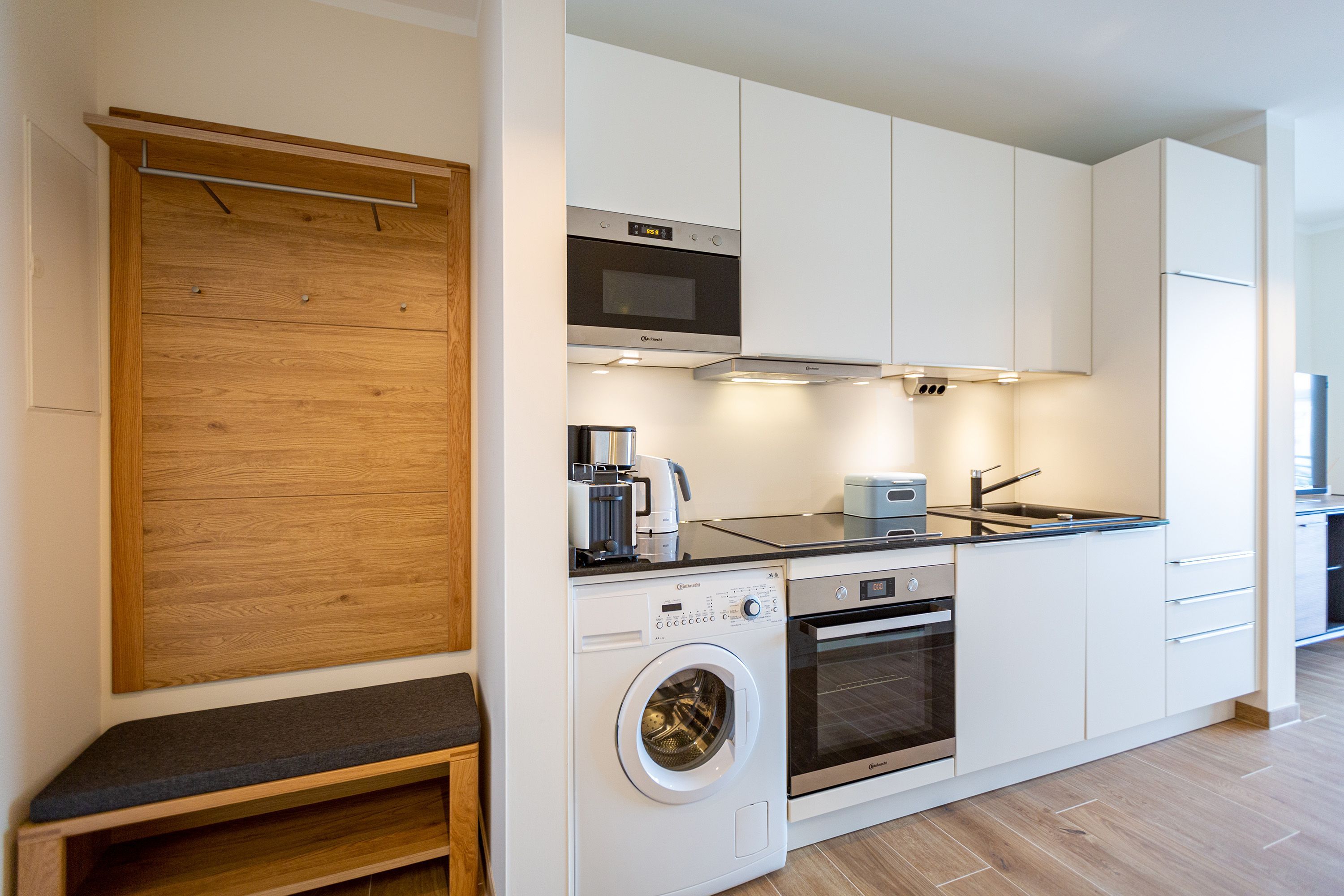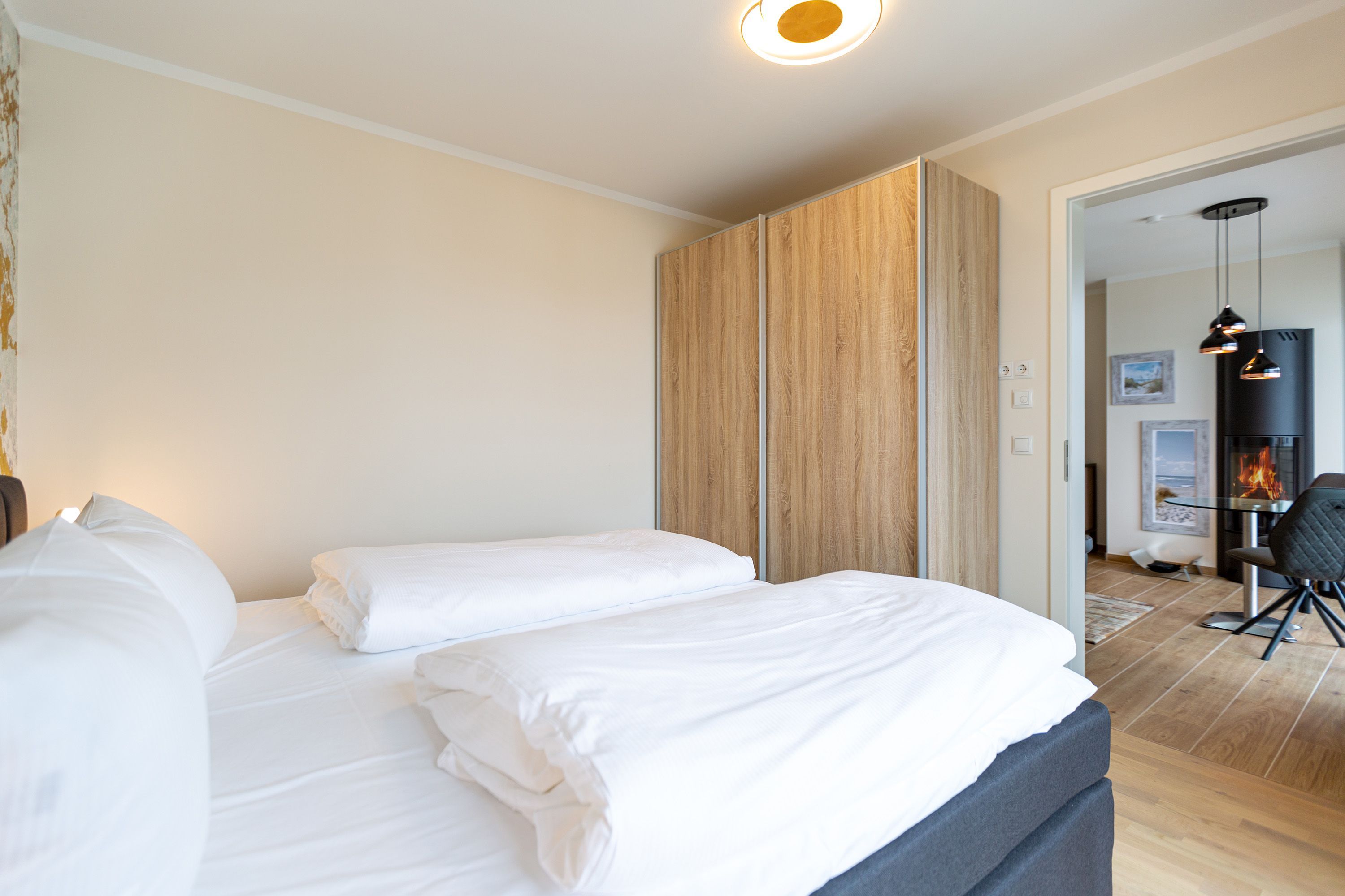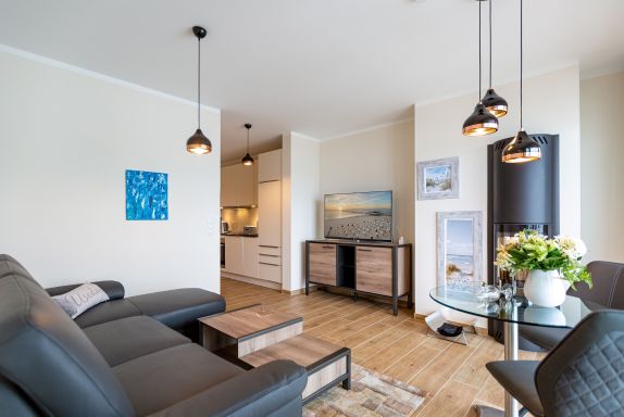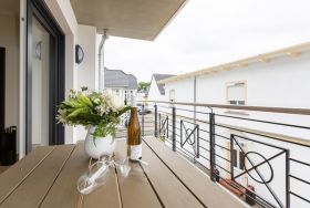 Auf den 45 Quadratmetern dieses eleganten und gemütlichen Feriendomizils im 1. Obergeschoss können Sie es sich zu zweit super kuschelig machen. Ob in der Finnischen Sauna, im komfortablen Boxspringbett (1,80 m x 2,00 m) im Schlafzimmer oder auf dem Sofa vor dem Kaminofen – dieses Appartement lädt einfach dazu ein, sich pudelwohl zu fühlen. Die beiden Zimmer sind mit viel Gespür fürs Wohlige und viel Geschmack eingerichtet. Vom Wohnzimmer aus haben Sie Zugang auf einen kleinen Nord-Ost-Balkon (8 Quadratmeter) mit Gartenmöbeln. Er ist ideal, um hier in der Sonne zu frühstücken. Das Wohnzimmer selbst ist mit hochwertigen Möbeln, einem Flat-TV und besagtem Kaminofen eine kleine Wohlfühlzone. Am schönen Glastisch direkt vor den bodentiefen Fenstern lässt es sich wunderbar essen. Zubereiten können Sie Ihre Mahlzeiten in der ans Wohnzimmer angrenzenden, offenen Küche. Ob Induktionsherd, Spülmaschine, Toaster, Kaffeemaschine, Wasserkocher oder Geschirr – alles ist vorhanden. Sogar eine Waschmaschine ist vorhanden und kann genutzt werden. Ein wunderschönes, kleines Paradies ist das Schlafzimmer. Das Bett sorgt für entspannte Träume. Im Badezimmer mit Dusche, WC und Föhn erwartet Sie mit der Finnsichen Sauna ein eigenes SPA. Handtücher liegen schon bereit. Sie können also jederzeit loslegen mit der Schwitzkur. Auch die Betten sind bei Anreise schon bezogen. Das WLAN ist kostenfrei und in der Tiefgarage ist für Sie ein Stellplatz reserviert. Zudem gibt es im Keller einen separaten Fahrradabstellraum.