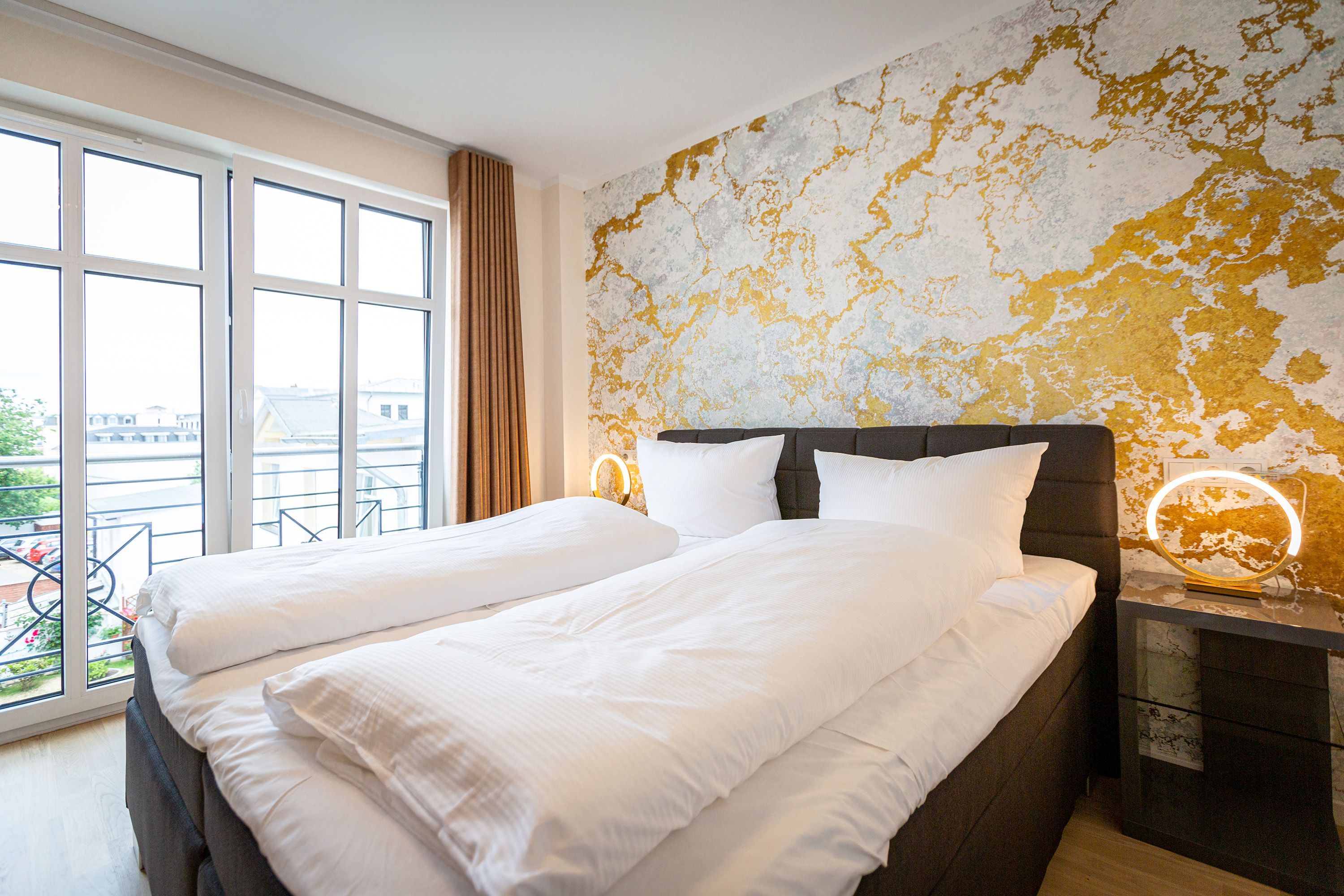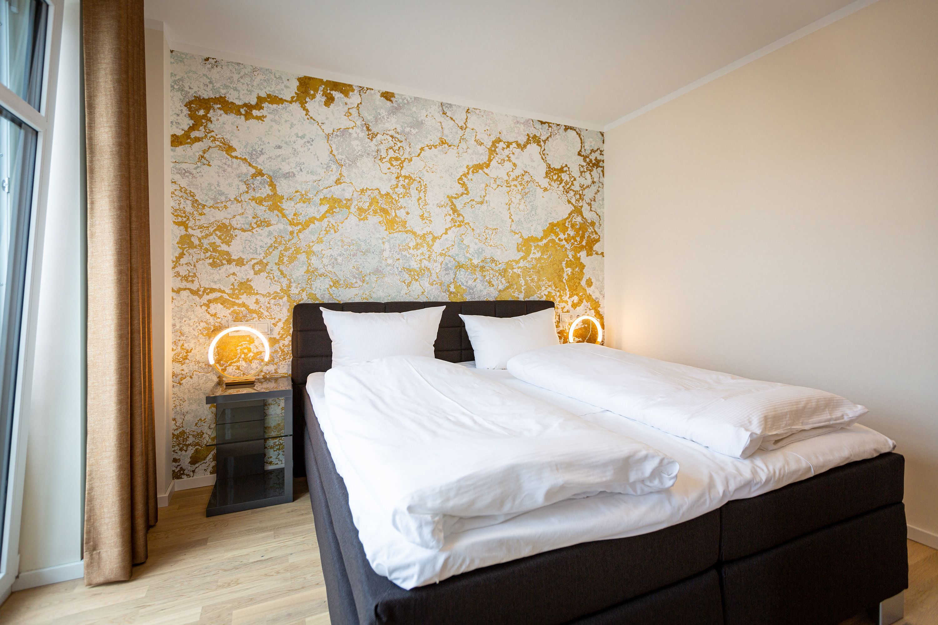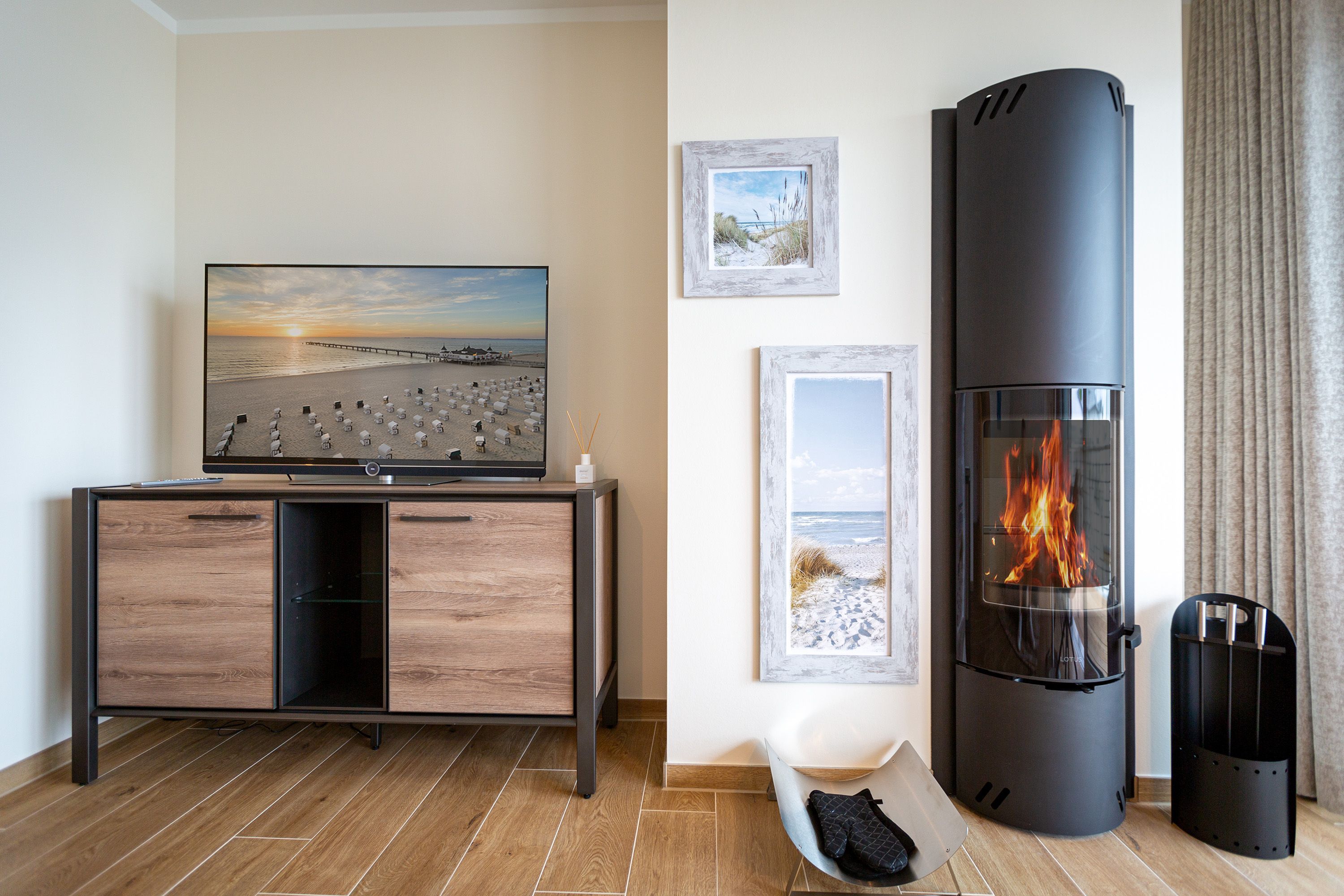 Auf den 45 Quadratmetern dieses eleganten und gemütlichen Feriendomizils im 1. Obergeschoss können Sie es sich zu zweit super kuschelig machen. Ob in der Finnischen Sauna, im komfortablen Boxspringbett (1,80 m x 2,00 m) im Schlafzimmer oder auf dem Sofa vor dem Kaminofen – dieses Appartement lädt einfach dazu ein, sich pudelwohl zu fühlen. Die beiden Zimmer sind mit viel Gespür fürs Wohlige und viel Geschmack eingerichtet. Vom Wohnzimmer aus haben Sie Zugang auf einen kleinen Nord-Ost-Balkon (8 Quadratmeter) mit Gartenmöbeln. Er ist ideal, um hier in der Sonne zu frühstücken. Das Wohnzimmer selbst ist mit hochwertigen Möbeln, einem Flat-TV und besagtem Kaminofen eine kleine Wohlfühlzone. Am schönen Glastisch direkt vor den bodentiefen Fenstern lässt es sich wunderbar essen. Zubereiten können Sie Ihre Mahlzeiten in der ans Wohnzimmer angrenzenden, offenen Küche. Ob Induktionsherd, Spülmaschine, Toaster, Kaffeemaschine, Wasserkocher oder Geschirr – alles ist vorhanden. Sogar eine Waschmaschine ist vorhanden und kann genutzt werden. Ein wunderschönes, kleines Paradies ist das Schlafzimmer. Das Bett sorgt für entspannte Träume. Im Badezimmer mit Dusche, WC und Föhn erwartet Sie mit der Finnsichen Sauna ein eigenes SPA. Handtücher liegen schon bereit. Sie können also jederzeit loslegen mit der Schwitzkur. Auch die Betten sind bei Anreise schon bezogen. Das WLAN ist kostenfrei und in der Tiefgarage ist für Sie ein Stellplatz reserviert. Zudem gibt es im Keller einen separaten Fahrradabstellraum.