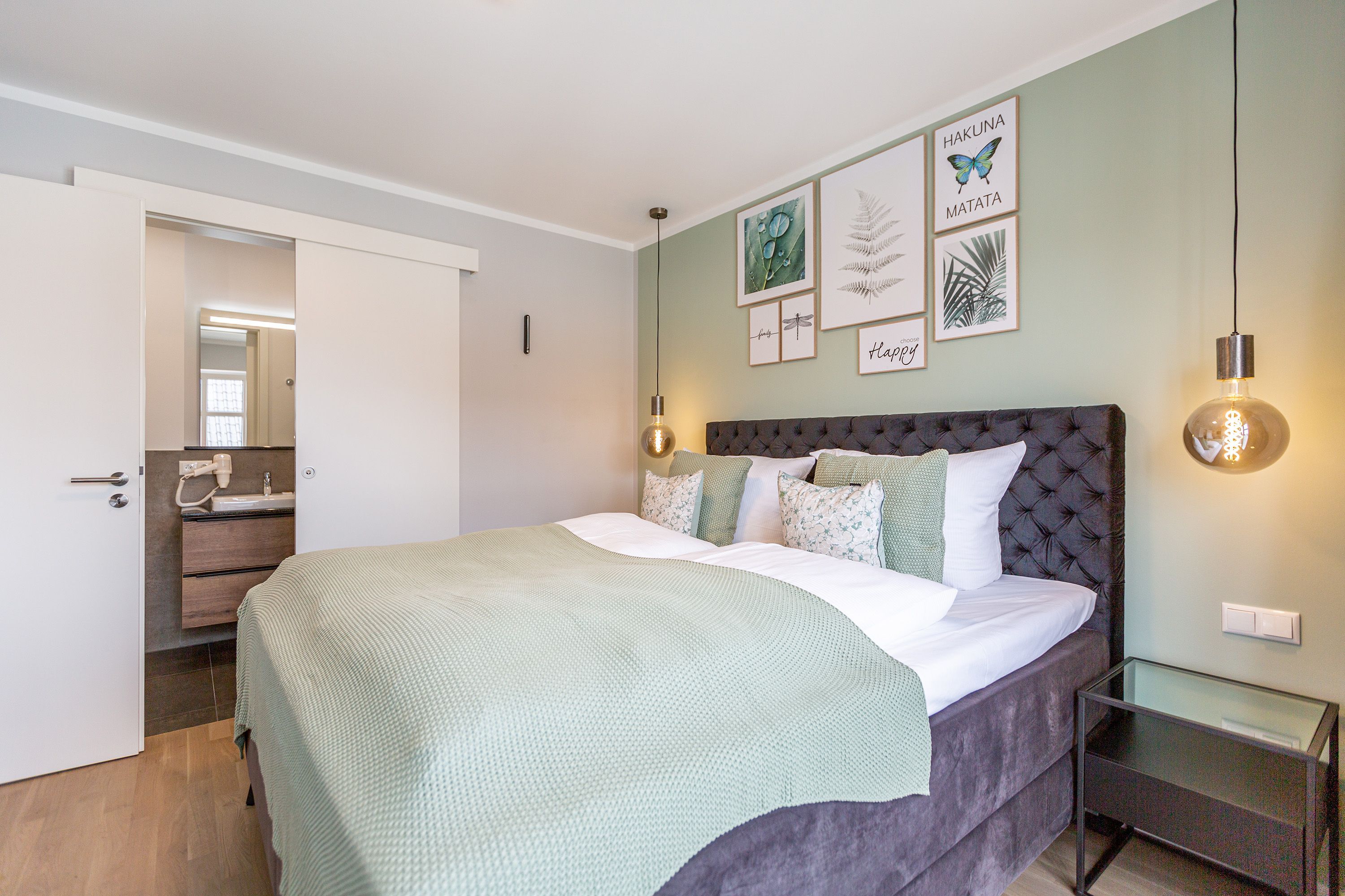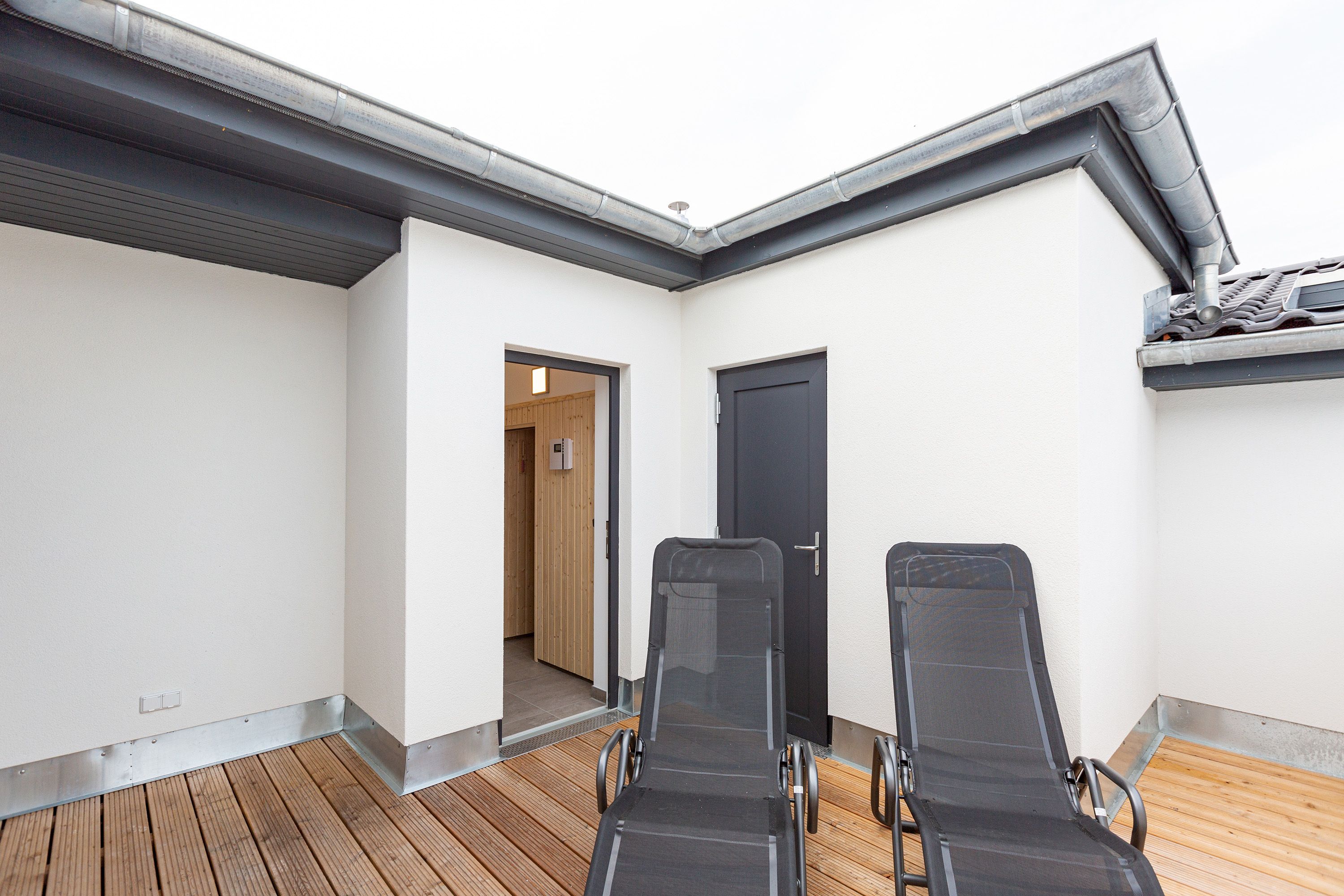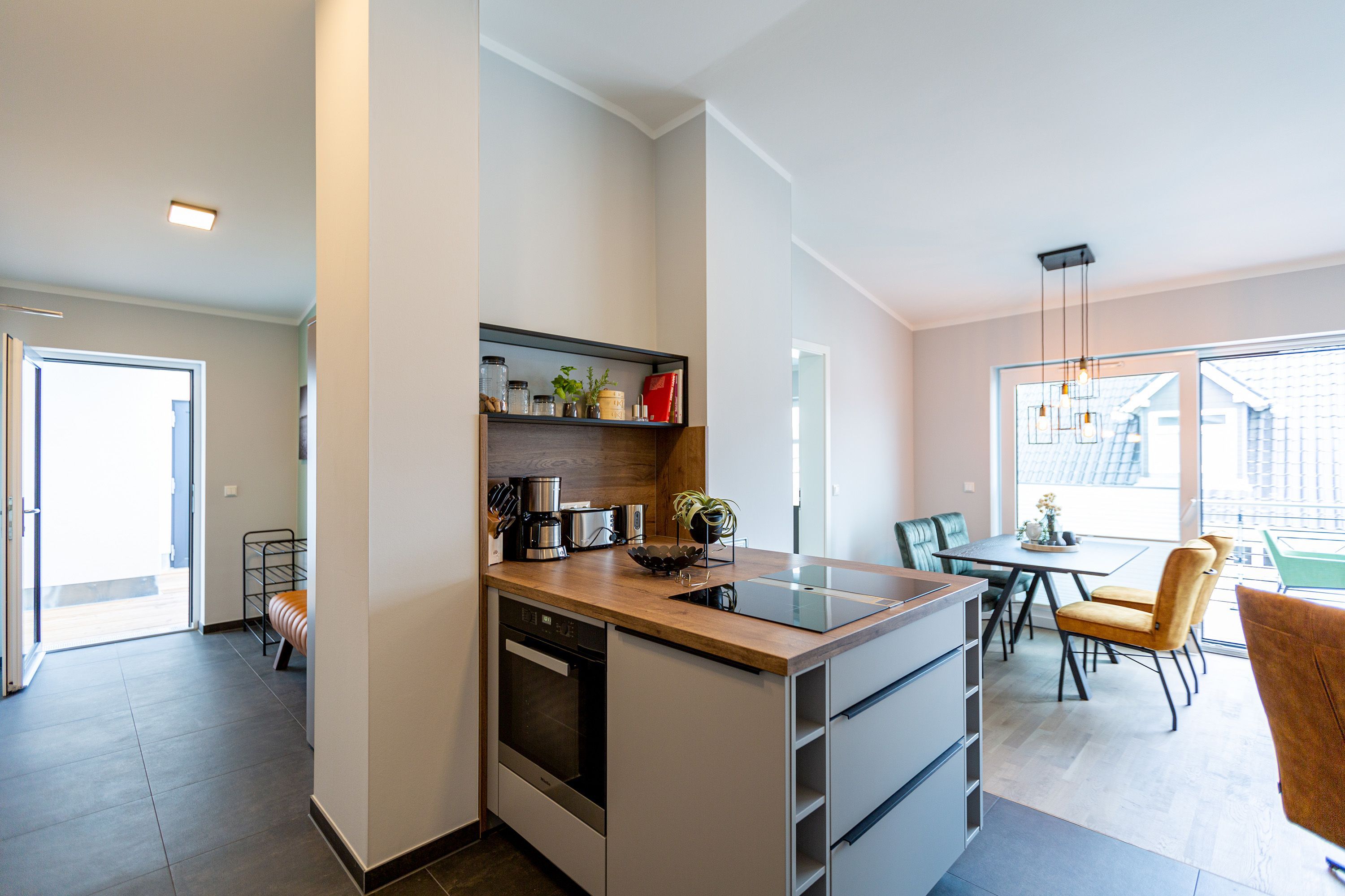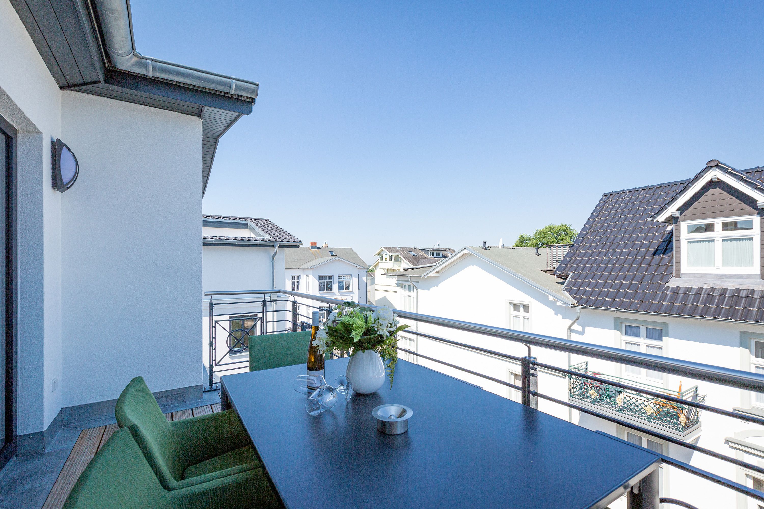 Das Appartement 11 unter dem Dach des Quartiers ist mit seinen 83 luftig hellen Quadratmetern etwas ganz Besonderes. Drei Zimmer für bis zu vier Personen und ein Kleinkind (im Kinderreisebett) finden hier Platz und Ruhe für eine entspannte Ostseezeit. Viel Gemütlichkeit und wohliger Komfort erwartet die Bewohner auf Zeit. Pastelltöne, modernes Design und Wohnkomfort gehen in dieser Wohnung Hand in Hand. Ein geräumiges Wohn-Esszimmer weiß, mit bequemen Möbeln in den richtigen Urlaubsmodus zu versetzen. Eine Sofa-Sessellandschaft, ein Flat-TV, ein schöner, großer Esstisch – alles ist erlesen und ausgewählt. Ein Balkon lädt bei schönem Wetter dazu ein, viel Zeit an der frischen Seeluft zu verbringen - von hier aus hat man einen seitlichen Blick auf die Ostsee und auf die Ahlbecker Seebrücke. Die offene Küche ist voll ausgestattet, verfügt über einen Induktionsherd mit den passenden Töpfen, eine Spülmaschine, einen Toaster, eine Kaffeemaschine und Geschirr. Auch eine Waschmaschine ist vorhanden. Zwei Schlafzimmer laden mit ihren großen Boxspringdoppelbetten (1,80 m x 2,00 m) zum Kuscheln und Träumen ein. Jedes Schlafzimmer hat einen Schrank, eine Kommode und einen Flat-TV. Zwei Bäder mit Dusche und WC sorgen für entspannte Badzeiten. Handtücher liegen bereit und die Betten sind bei Anreise bereits bezogen. Freuen Sie sich dann noch auf einen Extra-Clou. Denn die Wohnung verfügt über eine wunderschöne Dachterrasse mit Sonnenliegen. Hier lässt sich ein Sommertag relaxed angehen. Zudem befindet sich auf der Terrasse der Zugang zu einer Sauna. Ihr kleiner Private SPA verfügt über eine Außendusche. So können Sie direkt aus der Wärme unter das kühle Nass springen. In der Tiefgarage gibt es für Ihr Auto 2 Stellplätze hintereinander und einen separaten Fahrradraum. Das WLAN ist kostenfrei nutzbar.