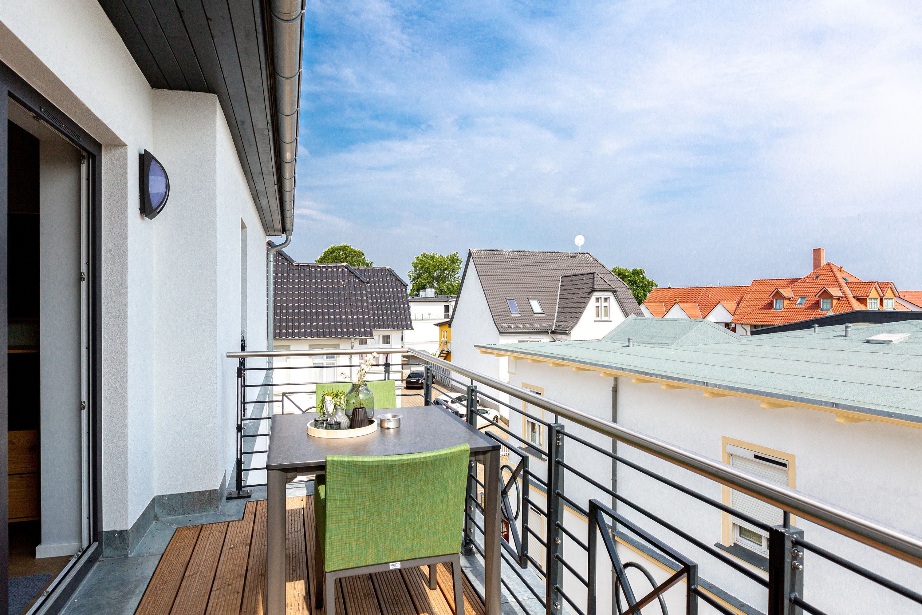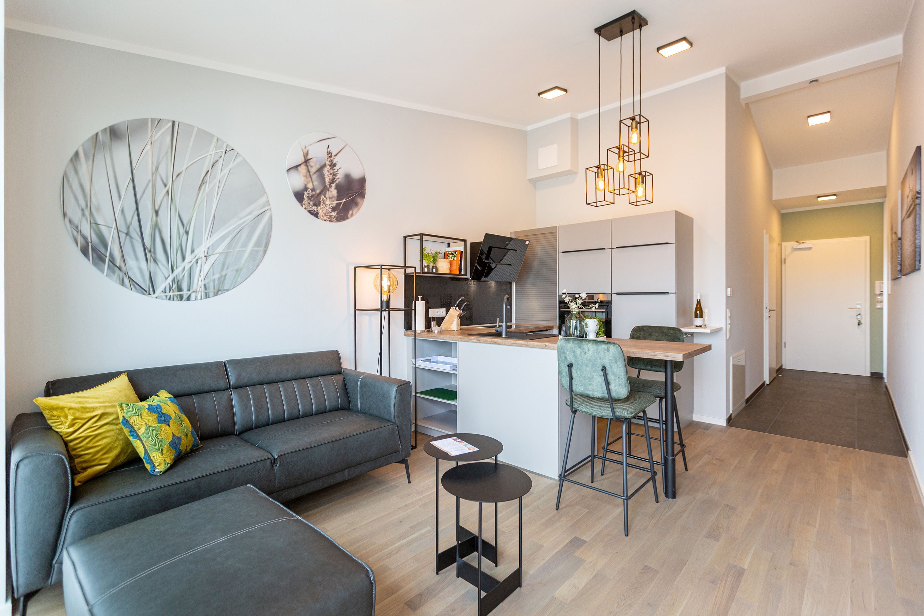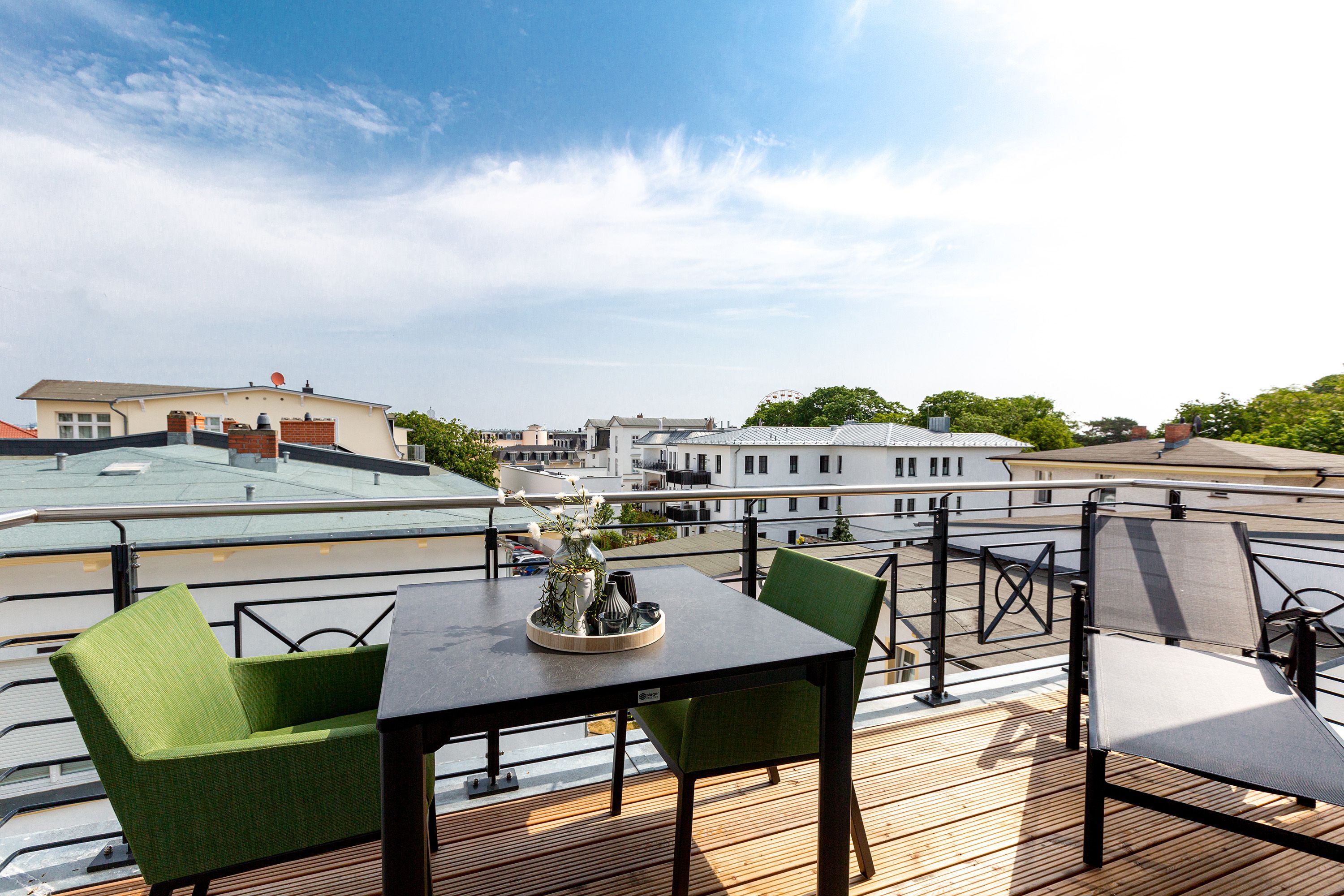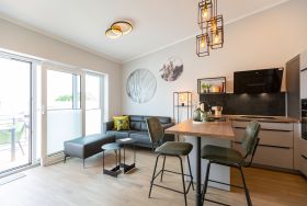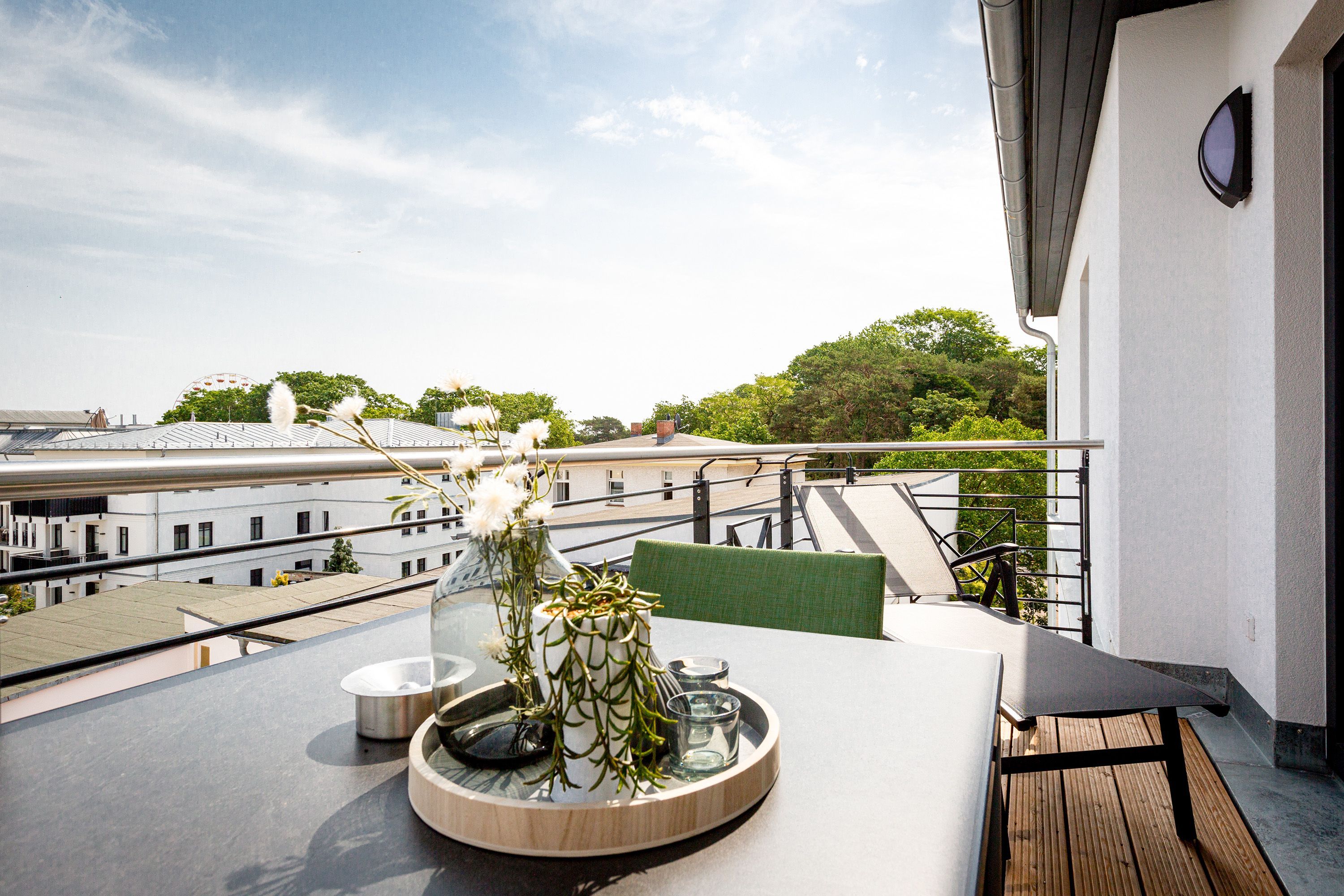 Klein, aber fein und absolut kuschelig ist dieses 46 Quadratmeter große Zwei-Raum-Appartement für zwei Personen direkt unter dem Dach im 3. Obergeschoss des Quartiers Frohsinn. Wer sich zu zweit oder auch allein mal in aller Ruhe für eine Auszeit an der Ostsee in ein wunderschönes Ambiente zurückziehen möchte, findet hier ein kleines Wohlfühlparadies vor. Der Blick vom sonnigen Balkon (8 Quadratmeter groß) mit Gartenmöbeln und Liegestuhl offeriert einen traumhaften Blick über die Dächer des altehrwürdigen Seebades. Das Wohnzimmer ist dank der großen Fenster hell und freundlich. Kuscheln Sie bei einem spannenden Film auf dem Flat-TV auf der Ledercouch oder lassen Sie es sich am gemütlichen Essplatz gut gehen. Eine offene Küchenzeile bietet alles Nötige zum Kochen, Backen und Zubereiten. Ihnen stehen hochwertige Markengeräte wie ein Induktionsherd, eine Spülmaschine, ein Kühlschrank mit Gefrierfach, edles Geschirr und vieles mehr zur Verfügung. Modernes Design durchzieht jeden Winkel dieser schönen Wohnung. Auch das Schlafzimmer ist modern mit einem bequemen Boxspringdoppelbett (1,60 m x 2,00 m), einem Schrank, einer Kommode und ebenfalls mit einem Flat-TV eingerichtet. Das Bett ist bei Ihrer Anreise schon bezogen und das WLAN können Sie kostenfrei nutzen. Das Bad mit Dusche, Waschtisch und WC ist geräumig und hält eine kleine Überraschung bereit. Hier können Sie in der Finnischen Sauna so richtig aus- und entspannen. Handtücher liegen natürlich für das Wellness-Vergnügen sowie für Ihren Aufenthalt bereit. In der Tiefgarage gibt es einen Stellplatz für Ihr Auto und einen separaten Raum für Fahrräder.
