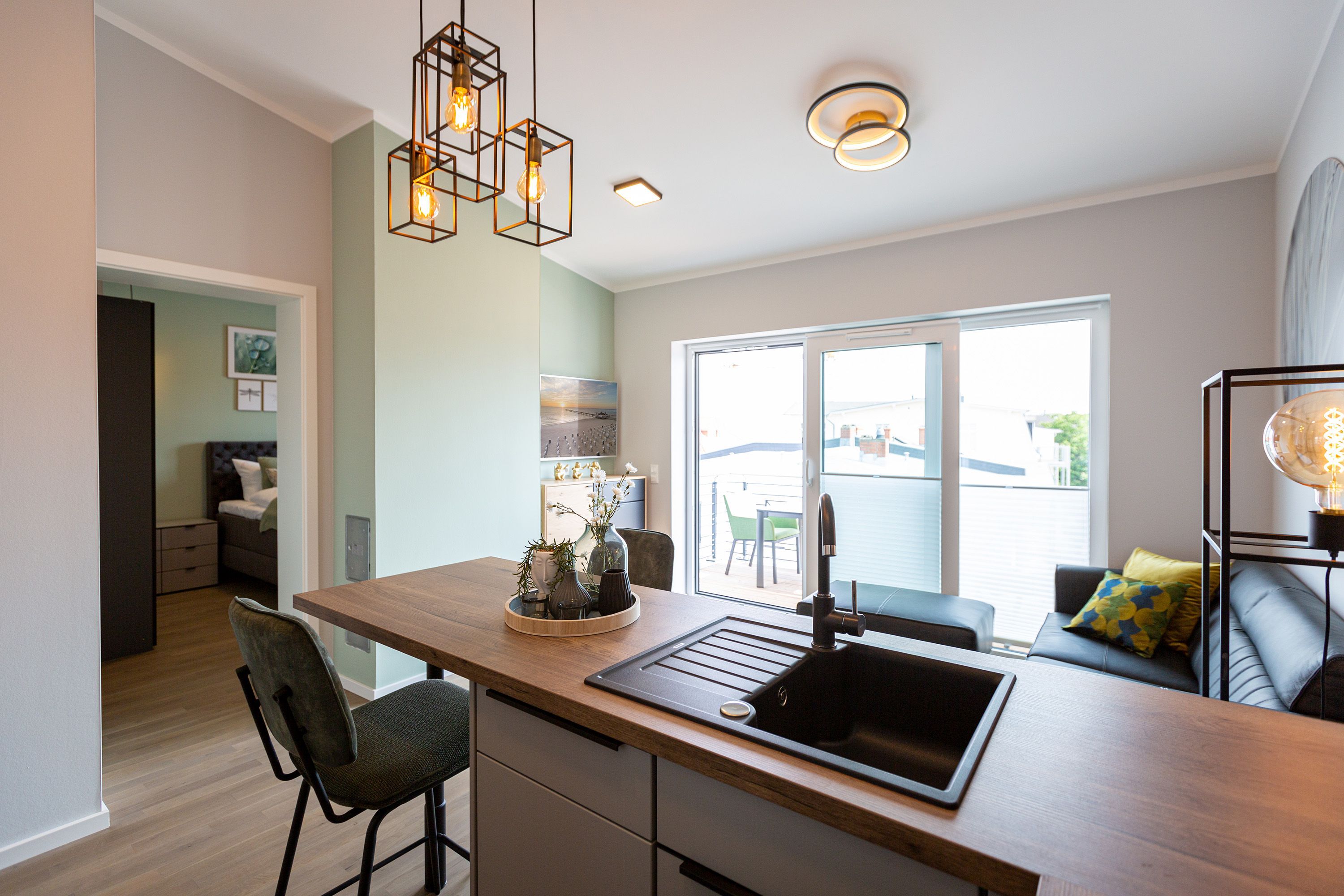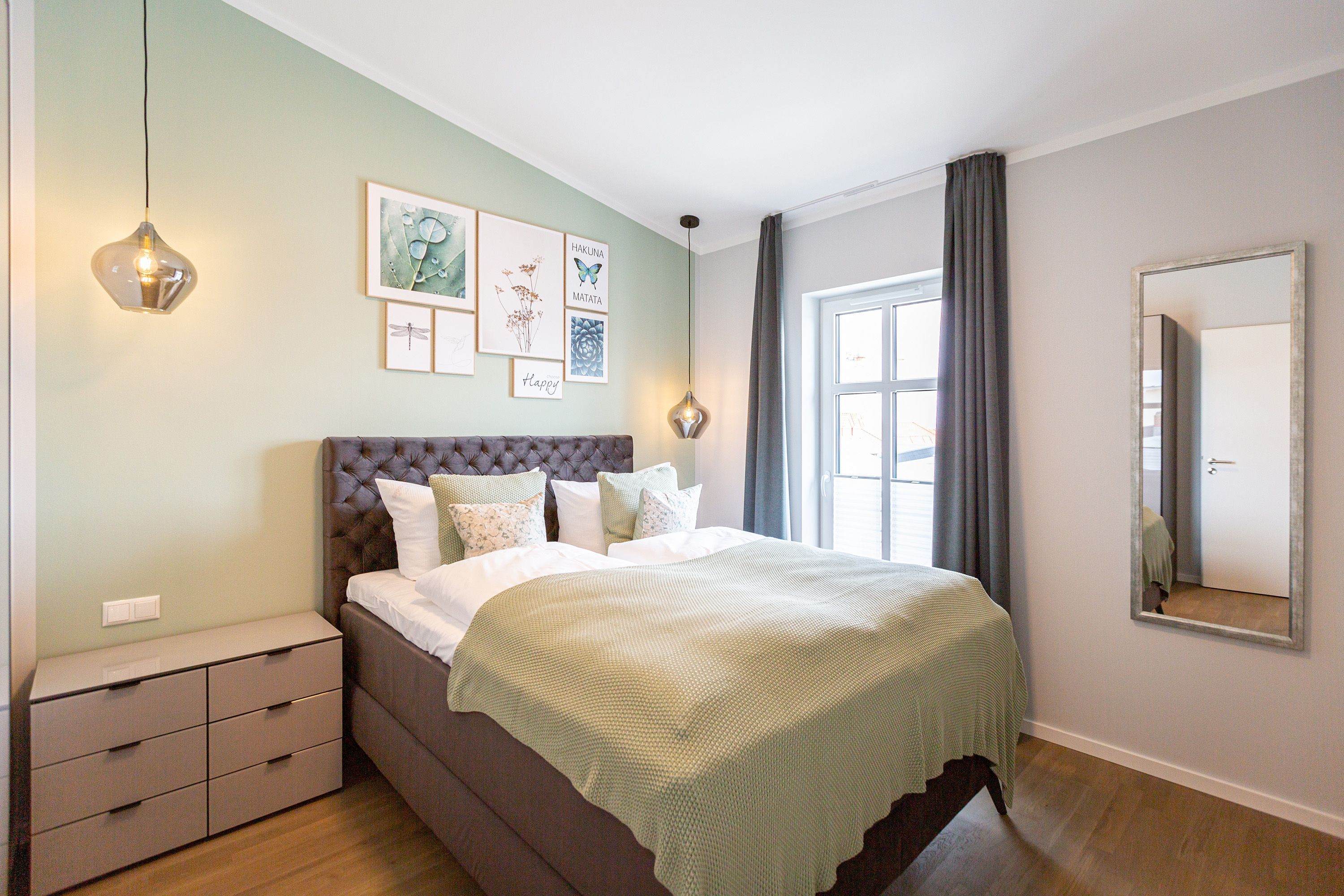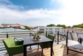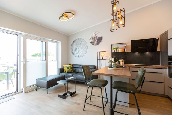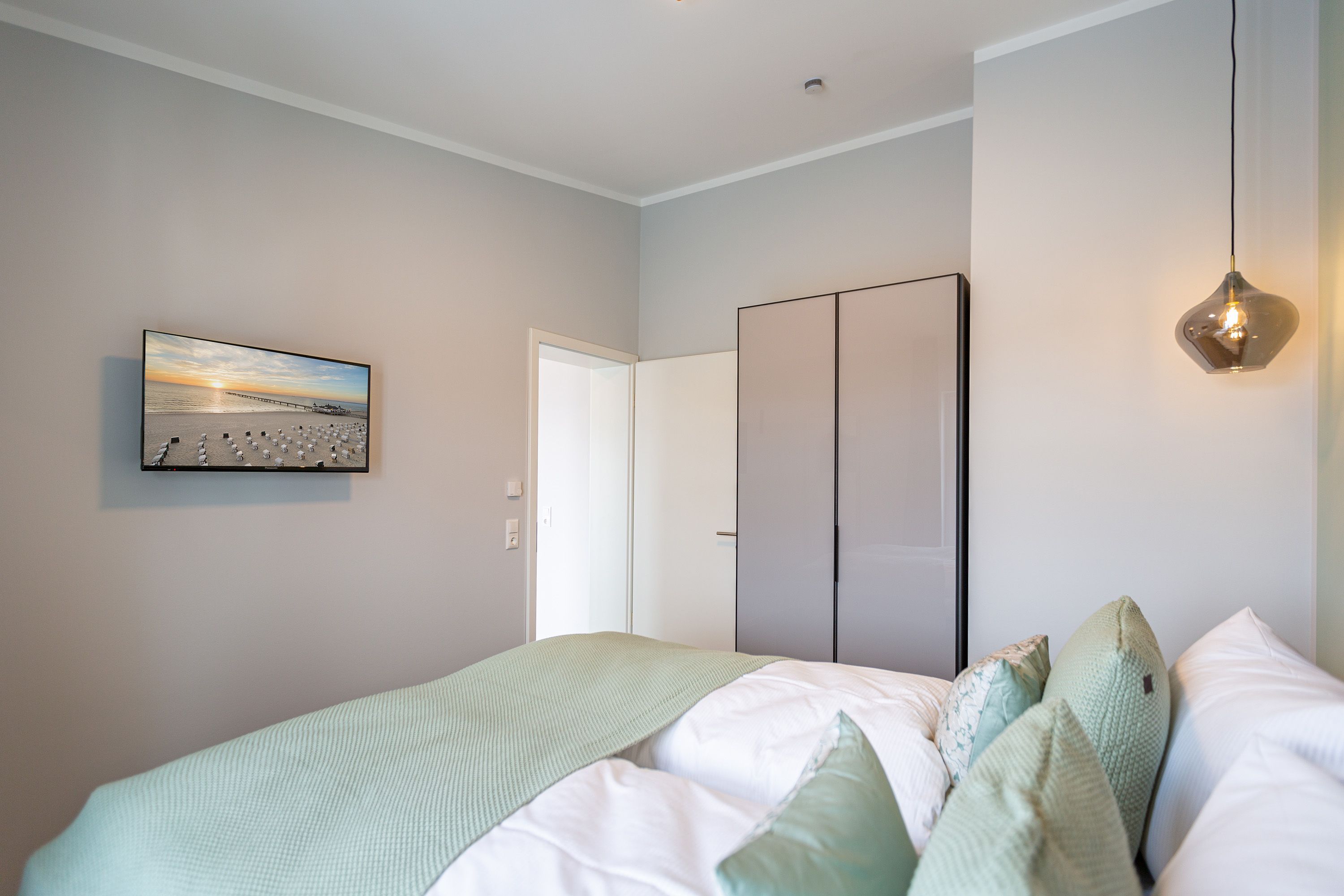 Klein, aber fein und absolut kuschelig ist dieses 46 Quadratmeter große Zwei-Raum-Appartement für zwei Personen direkt unter dem Dach im 3. Obergeschoss des Quartiers Frohsinn. Wer sich zu zweit oder auch allein mal in aller Ruhe für eine Auszeit an der Ostsee in ein wunderschönes Ambiente zurückziehen möchte, findet hier ein kleines Wohlfühlparadies vor. Der Blick vom sonnigen Balkon (8 Quadratmeter groß) mit Gartenmöbeln und Liegestuhl offeriert einen traumhaften Blick über die Dächer des altehrwürdigen Seebades. Das Wohnzimmer ist dank der großen Fenster hell und freundlich. Kuscheln Sie bei einem spannenden Film auf dem Flat-TV auf der Ledercouch oder lassen Sie es sich am gemütlichen Essplatz gut gehen. Eine offene Küchenzeile bietet alles Nötige zum Kochen, Backen und Zubereiten. Ihnen stehen hochwertige Markengeräte wie ein Induktionsherd, eine Spülmaschine, ein Kühlschrank mit Gefrierfach, edles Geschirr und vieles mehr zur Verfügung. Modernes Design durchzieht jeden Winkel dieser schönen Wohnung. Auch das Schlafzimmer ist modern mit einem bequemen Boxspringdoppelbett (1,60 m x 2,00 m), einem Schrank, einer Kommode und ebenfalls mit einem Flat-TV eingerichtet. Das Bett ist bei Ihrer Anreise schon bezogen und das WLAN können Sie kostenfrei nutzen. Das Bad mit Dusche, Waschtisch und WC ist geräumig und hält eine kleine Überraschung bereit. Hier können Sie in der Finnischen Sauna so richtig aus- und entspannen. Handtücher liegen natürlich für das Wellness-Vergnügen sowie für Ihren Aufenthalt bereit. In der Tiefgarage gibt es einen Stellplatz für Ihr Auto und einen separaten Raum für Fahrräder.