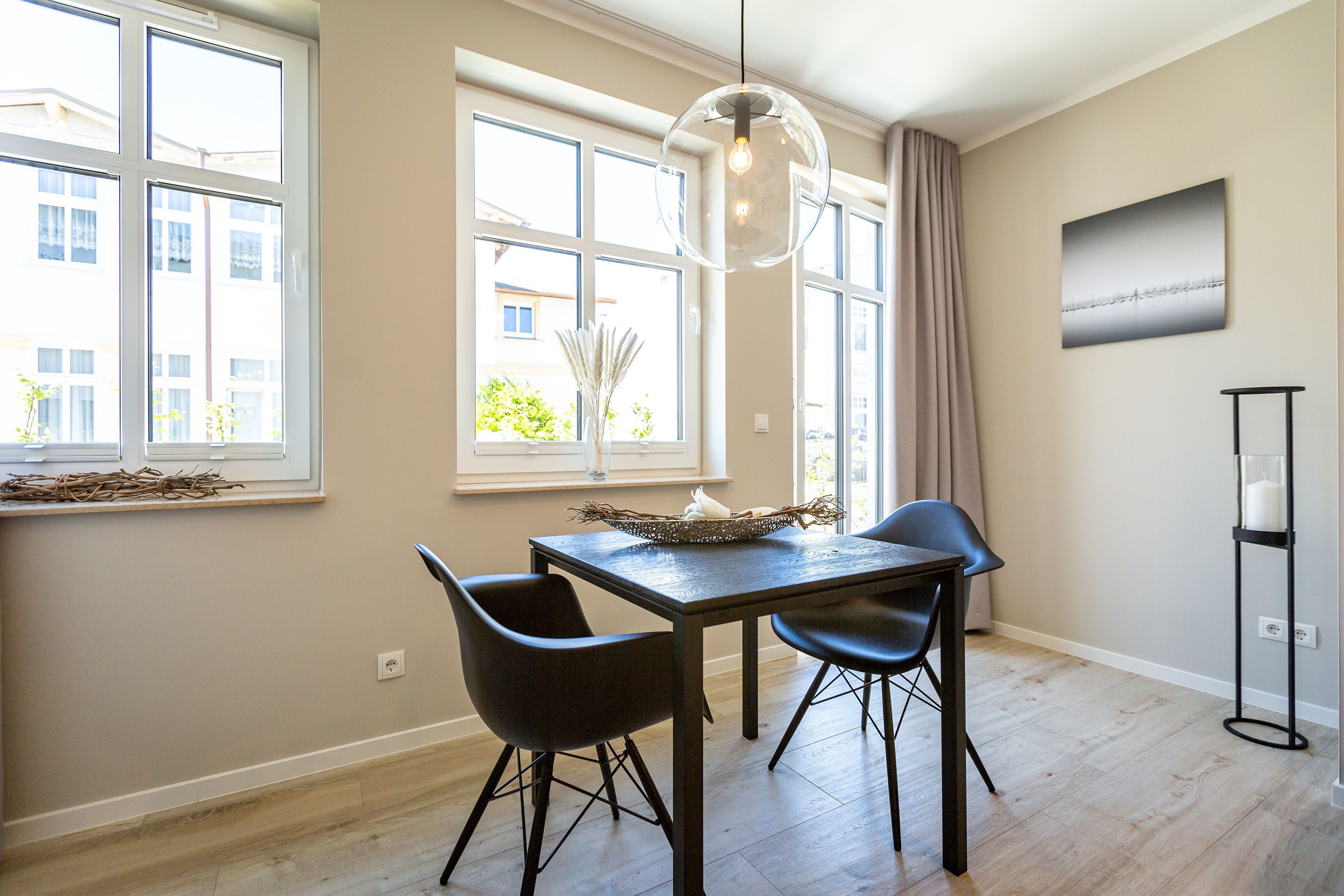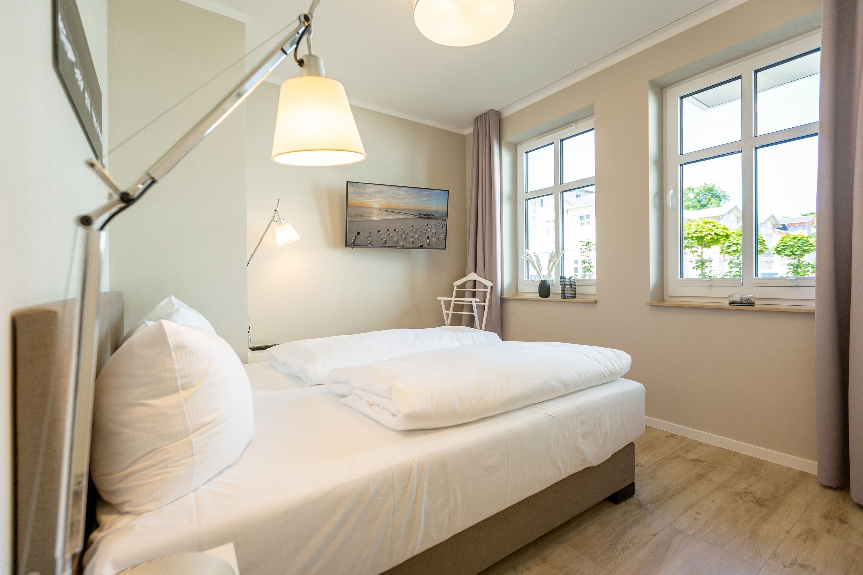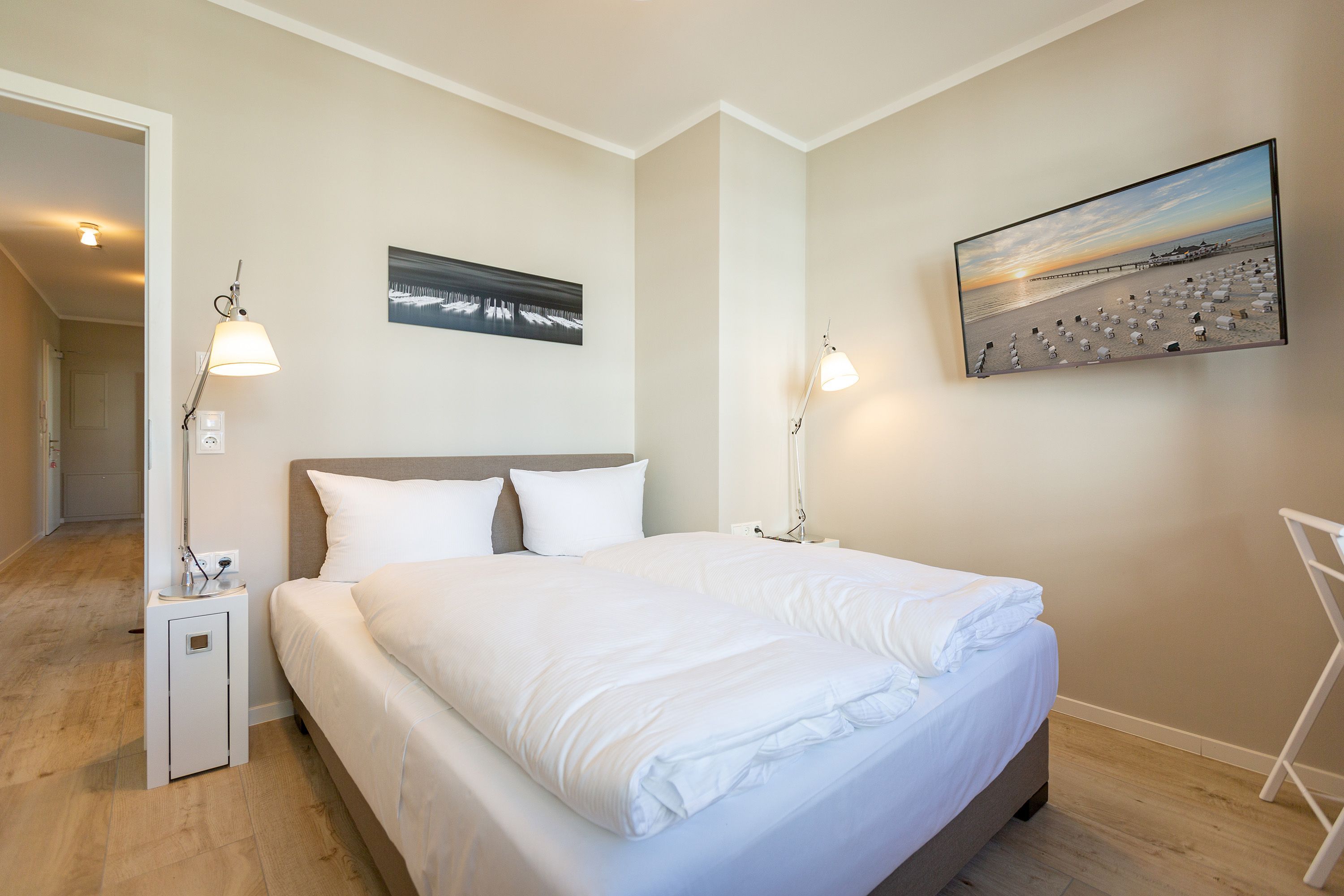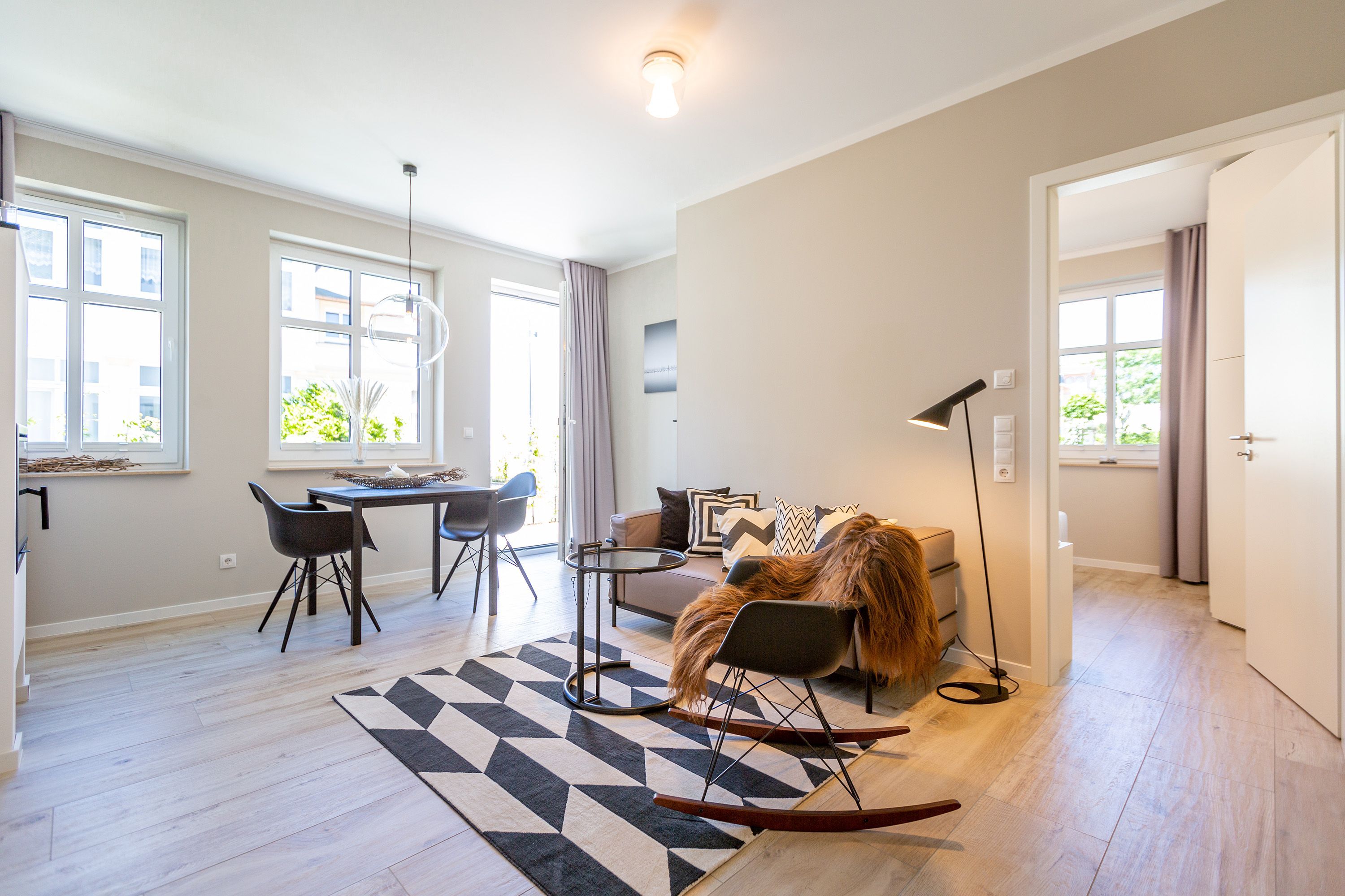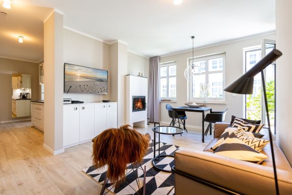 Dieses kleine, aber feine Design-Appartement für zwei Personen mit Kleinkind (im Kinderreisebett) ist das perfekte Erholungsrefugium für alle, die es gern schick, modern und stylisch mögen. Auch Ihren geliebten Vierbeiner dürfen Sie hier mitbringen. Wohlfühlen auf 50 Quadratmetern ist hier garantiert. Da sich das Appartement im Erdgeschoss befindet, hat es Zugang zu einer natürlich nur für Sie reservierten und zur Wohnung gehörenden Sonnenterasse mit Strandkorb und Gartenmöbeln. Mitten im Grün und umgeben von wunderschönen Bädervillen können Sie hier eine entspannte Zeit beim Essen oder Sonnenbaden genießen. Das Wohnzimmer dieses Zwei-Raum-Appartements ist modern und elegant mit ausgesuchten Design-Möbeln eingerichtet. Die Cassina Couch nach dem berühmten Design von Le Corbusier, aber auch der Schalen-Schaukelstuhl eignen sich perfekt zum Runterkommen und Faulenzen. Ein großer Flat TV (50 Zoll) sorgt für Unterhaltung. An kühlen Inseltagen wärmt der Kaminofen und sorgt für eine gemütliche und romantische Atmosphäre. Die an das Wohnzimmer angrenzende Küche ist mit hochwertigen Markengeräten voll ausgestattet. Ob Qualitätsmesser-Set, Induktionsherd, Senseo Padmaschine, Geschirrspüler oder das Geschirr selbst hier werden Sie alles zu Ihrer Zufriedenheit vorfinden. Kochen macht mit diesem Equipment sogar im Urlaub Spaß. Im Wohnzimmer befindet sich zudem ein schöner Essplatz. Im Schlafzimmer wartet viel Gemütlichkeit mit einem bequemen Boxspringdoppelbett (1,60 m x 2,00 m) auf Sie. Viel Platz für die Urlaubsgarderobe bietet der eigens angefertigte Einbauschrank. Das Bad hat Tageslicht und verfügt über eine Regendusche und ein WC. Bei Anreise sind die Betten bezogen und Handtücher liegen für Sie bereit. In der Tiefgarage gehört zu der Wohnung 4a ein Stellplatz. Ein separater Fahrradraum ist im Keller ebenfalls vorhanden.