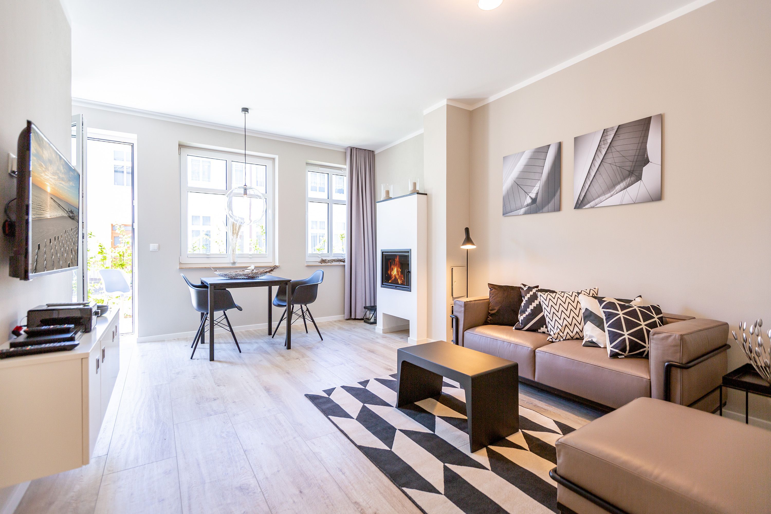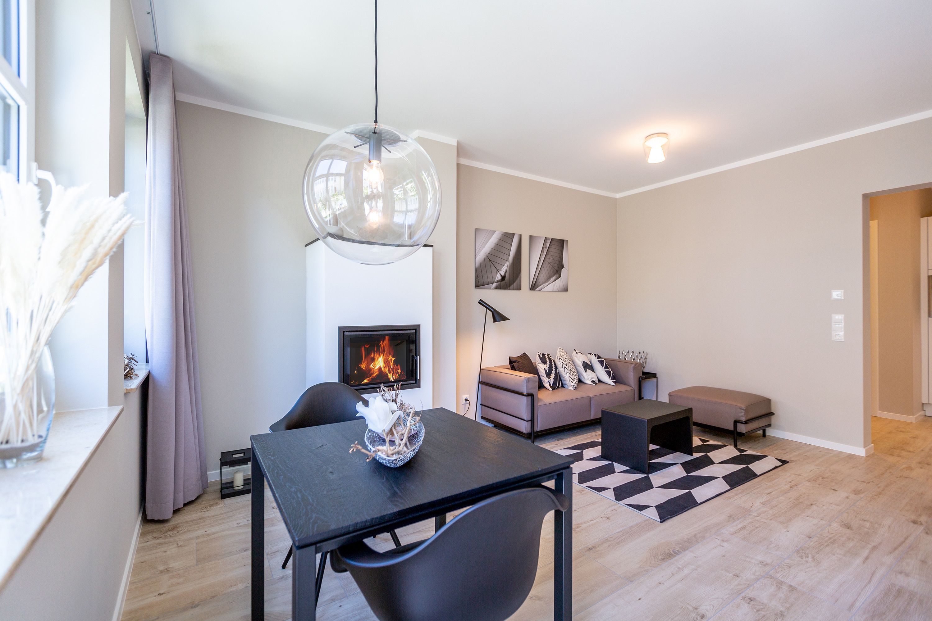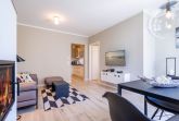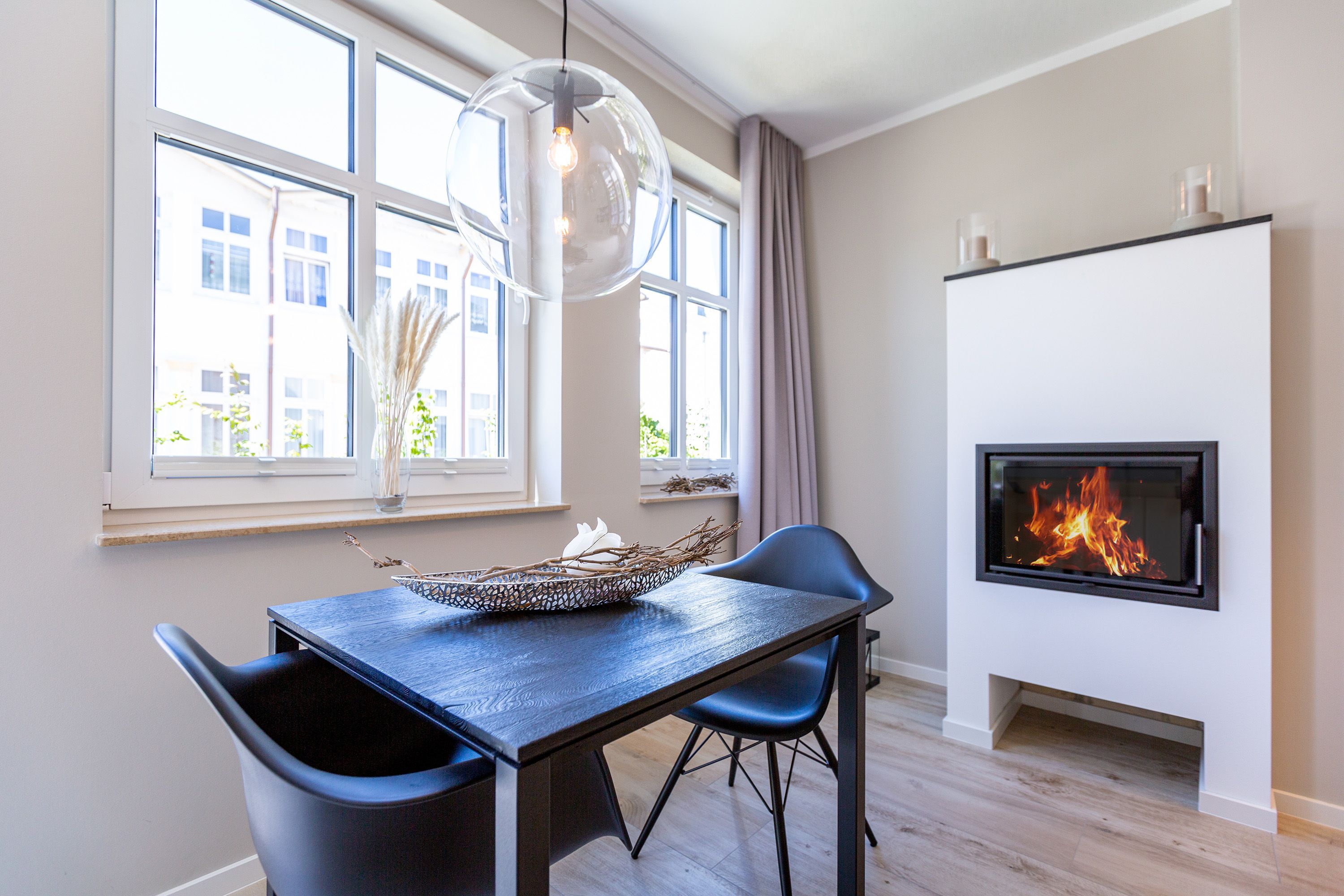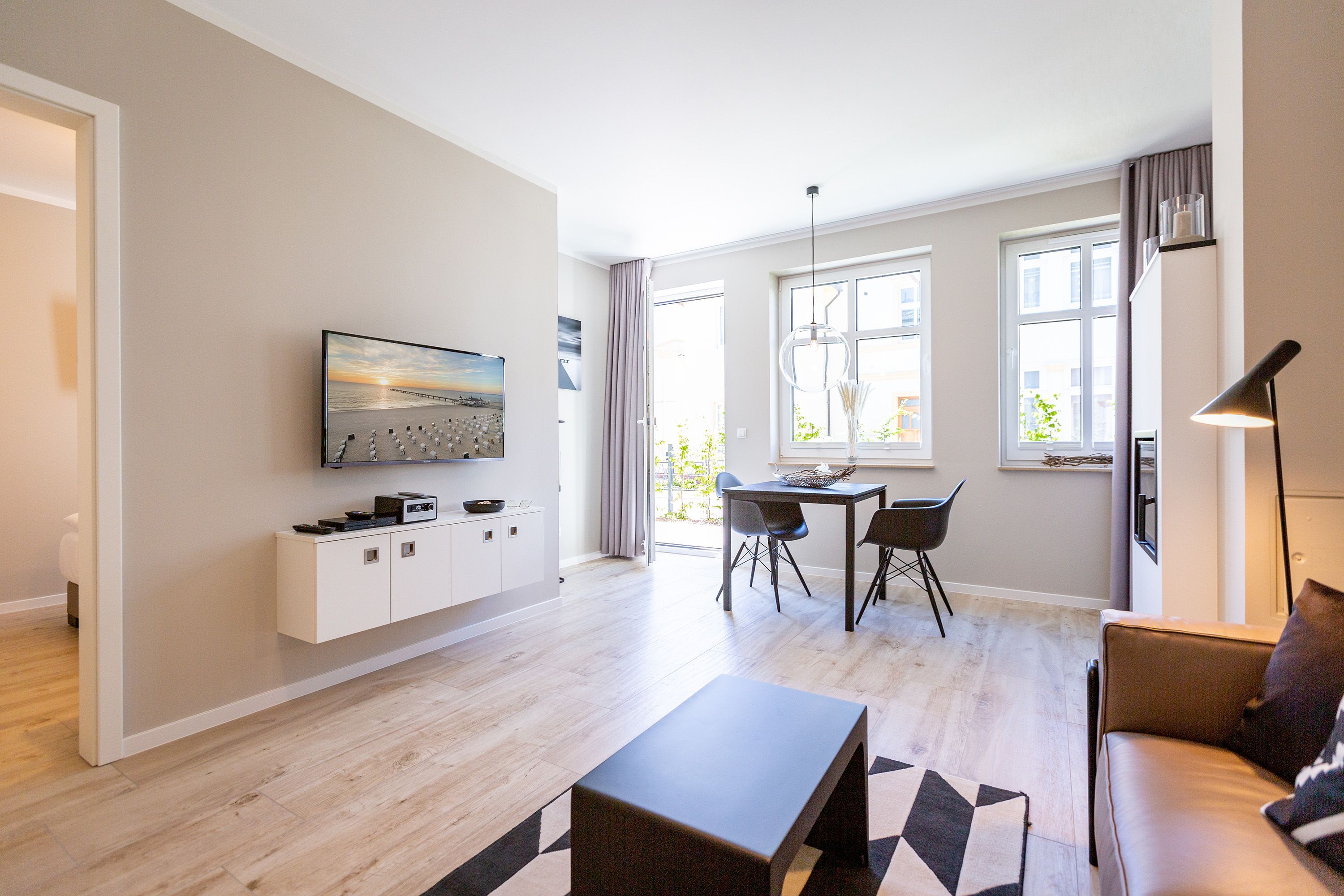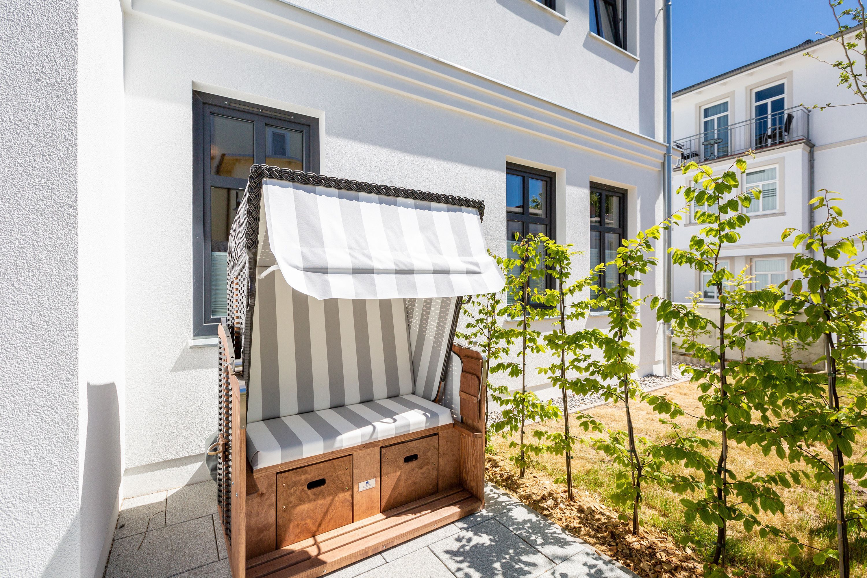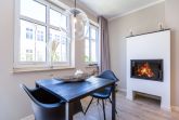 Mit Blick auf die Ahlbecker Kirche können Sie auf der Terrasse dieser wunderschönen Zwei-Zimmer-Wohnung herrlich in der Sonne entspannen. Zu den 9 Quadratmetern mit Strandkorb und Gartenmöbeln kommen in Ihrem kuscheligen Urlaubsdomizil im Inneren noch einmal 45 luftig helle Quadratmeter Wohnraum hinzu. Für bis zu zwei Personen und ein Kleinkind (im Kinderreisebett) ist hier, im Erdgeschoss des Quartiers Frohsinn, Platz. Ihren geliebten Vierbeiner dürfen Sie gerne mitbringen. Das Wohnzimmer besticht durch stylische Eleganz kombiniert mit viel Liebe zum Detail. Ausgesuchte Designmöbel wie die Cassina-Couch oder die Vitra-Stühle am Esstisch verleihen dem Appartement ein gehobenes und edles Flair. Hier heißt es: Ankommen und wohlfühlen. Ein Kamin sorgt für viel Gemütlichkeit. Jedes Zimmer ist mit einem Flat-TV ausgestattet. Der Fernseher im Wohnzimmer besitzt zudem einen Blue-Ray-Player. Das WLAN für das Entertainment ist kostenfrei nutzbar. Die ans Wohnzimmer angrenzende Küche ist mit allem Nötigen ausgestattet. Sie hat einen Induktionsherd, einen Geschirrspüler, eine Mikrowelle, einen Wasserkocher, Toaster und eine Senseo Kaffeemaschine. Töpfe, Pfannen und Geschirr befinden sich in den Schränken. Das gemütliche Schlafzimmer lädt zum Kuscheln im komfortablen Boxspringdoppelbett ein. Ein großer Einbaukleiderschrank bietet viel Stauraum. Das Bad mit Dusche und WC ist innenliegend. Bei Anreise liegen Handtücher bereit und auch das Bett ist bezogen. Es gibt einen Stellplatz in der Tiefgarage für das Appartement und im Keller befindet sich ein separater Fahrradraum.