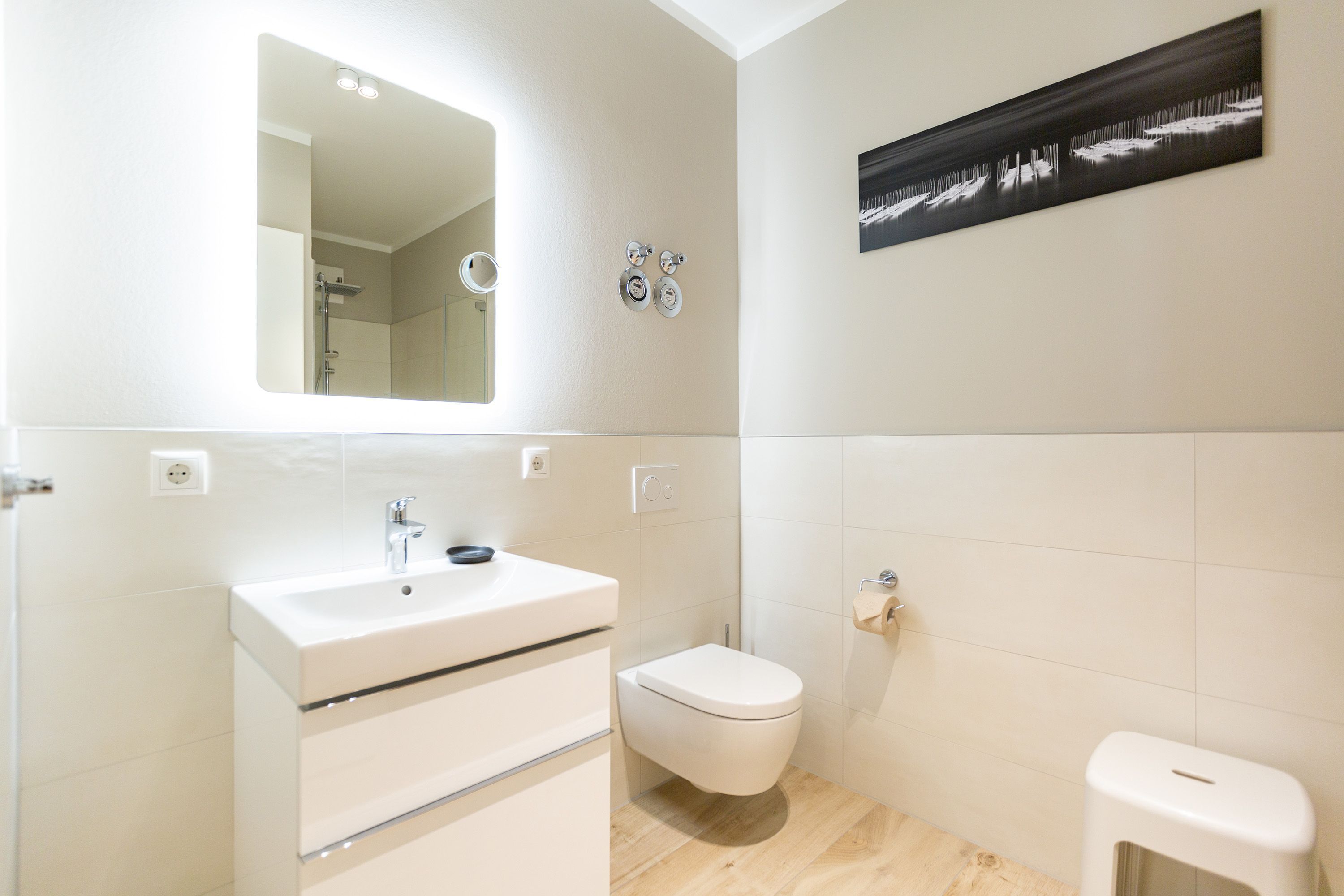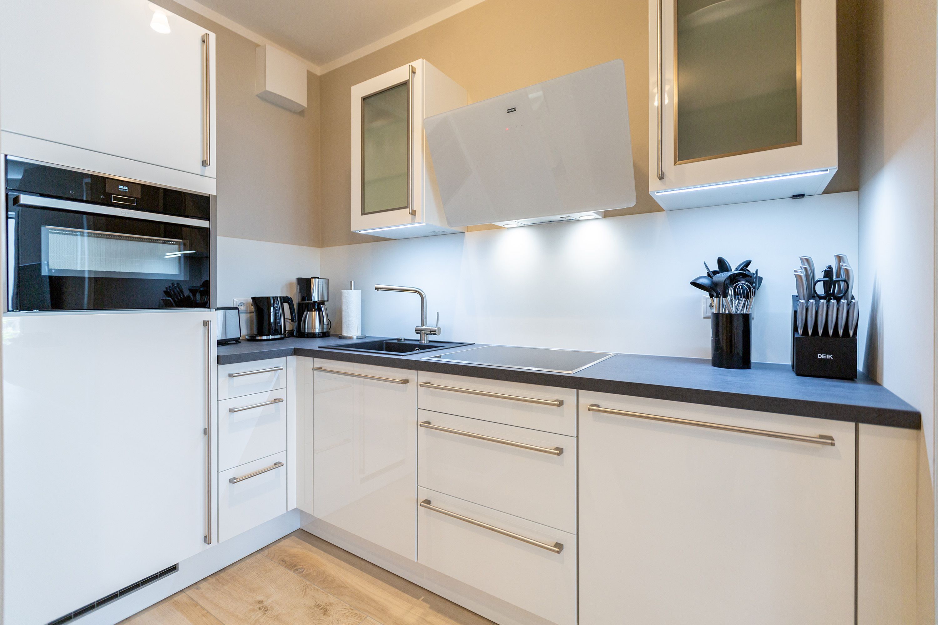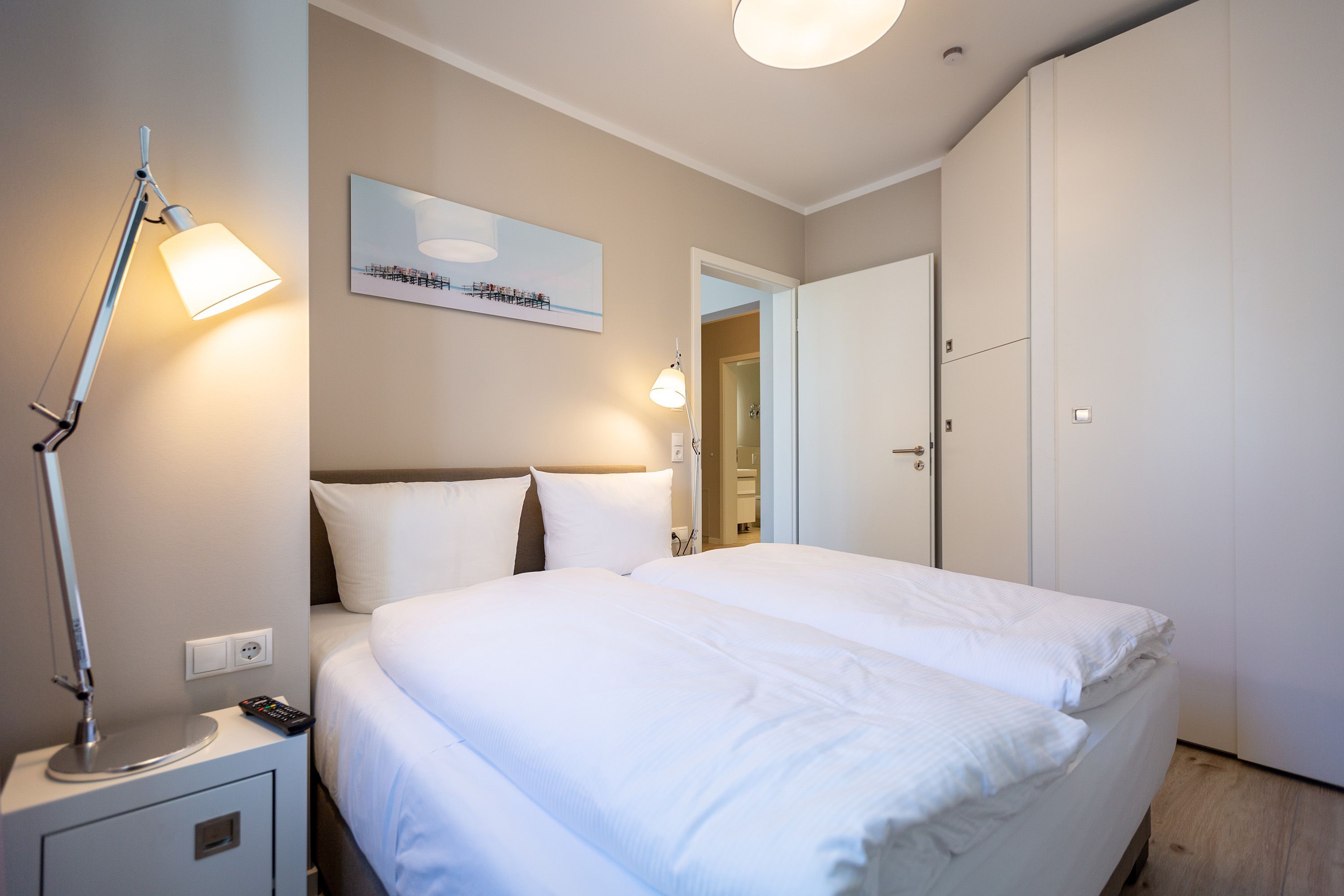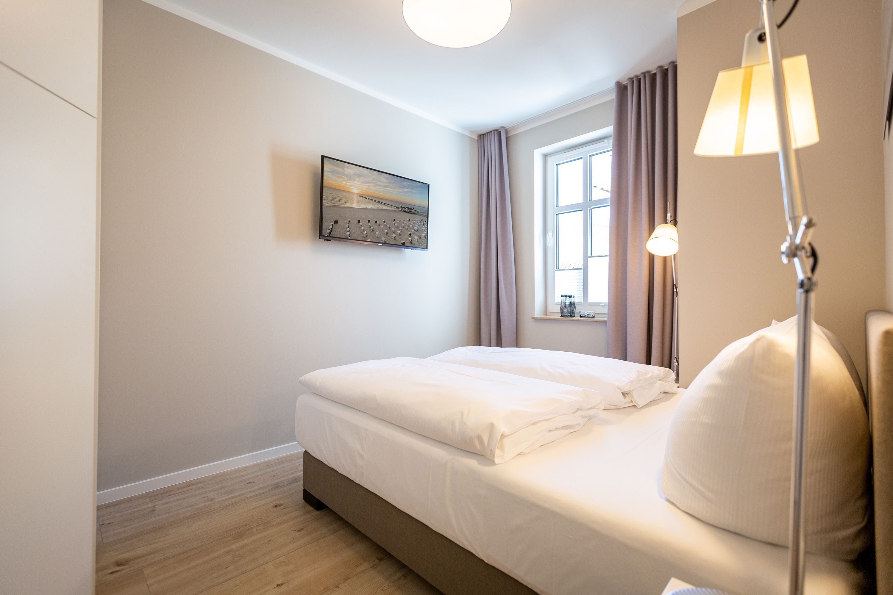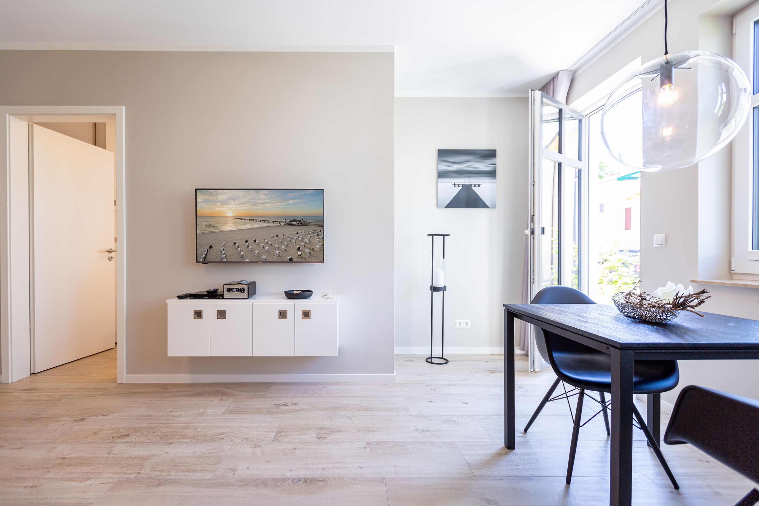 Mit Blick auf die Ahlbecker Kirche können Sie auf der Terrasse dieser wunderschönen Zwei-Zimmer-Wohnung herrlich in der Sonne entspannen. Zu den 9 Quadratmetern mit Strandkorb und Gartenmöbeln kommen in Ihrem kuscheligen Urlaubsdomizil im Inneren noch einmal 45 luftig helle Quadratmeter Wohnraum hinzu. Für bis zu zwei Personen und ein Kleinkind (im Kinderreisebett) ist hier, im Erdgeschoss des Quartiers Frohsinn, Platz. Ihren geliebten Vierbeiner dürfen Sie gerne mitbringen. Das Wohnzimmer besticht durch stylische Eleganz kombiniert mit viel Liebe zum Detail. Ausgesuchte Designmöbel wie die Cassina-Couch oder die Vitra-Stühle am Esstisch verleihen dem Appartement ein gehobenes und edles Flair. Hier heißt es: Ankommen und wohlfühlen. Ein Kamin sorgt für viel Gemütlichkeit. Jedes Zimmer ist mit einem Flat-TV ausgestattet. Der Fernseher im Wohnzimmer besitzt zudem einen Blue-Ray-Player. Das WLAN für das Entertainment ist kostenfrei nutzbar. Die ans Wohnzimmer angrenzende Küche ist mit allem Nötigen ausgestattet. Sie hat einen Induktionsherd, einen Geschirrspüler, eine Mikrowelle, einen Wasserkocher, Toaster und eine Senseo Kaffeemaschine. Töpfe, Pfannen und Geschirr befinden sich in den Schränken. Das gemütliche Schlafzimmer lädt zum Kuscheln im komfortablen Boxspringdoppelbett ein. Ein großer Einbaukleiderschrank bietet viel Stauraum. Das Bad mit Dusche und WC ist innenliegend. Bei Anreise liegen Handtücher bereit und auch das Bett ist bezogen. Es gibt einen Stellplatz in der Tiefgarage für das Appartement und im Keller befindet sich ein separater Fahrradraum.
