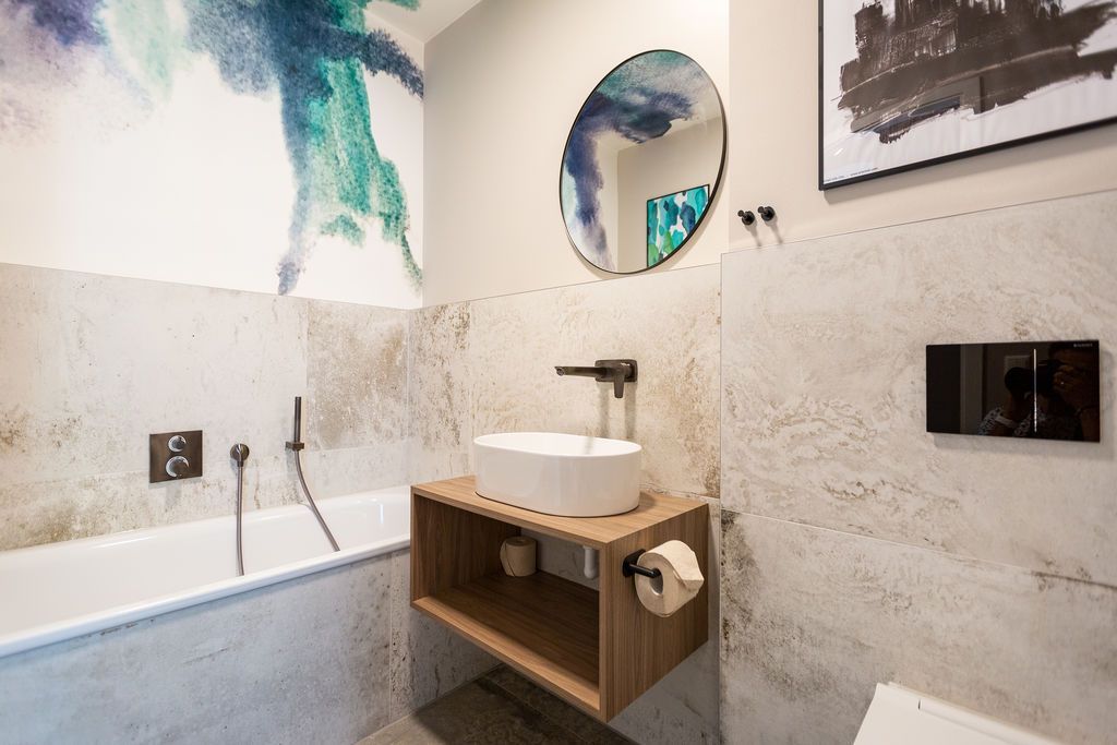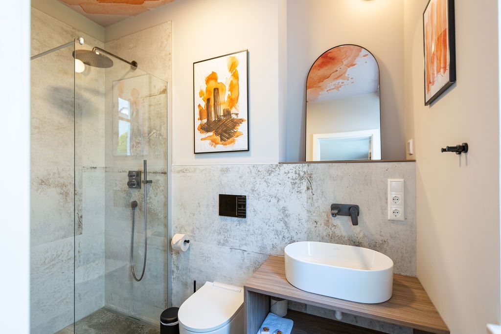 Ein Appartement, das mit seinen 75 Quadratmetern bis zu vier Personen viel Platz und das gewisse Etwas bietet. Tie Dye - Dank Designern wie Stella McCartney oder Cristiano Burani ist die alt-indonesische Färbemethode heute so angesagt wie nie. In diesem wunderschönen Urlaubsdomizil finden Sie genau das: Freiheit, Lebensgefühl und Maritime Farben. Wer es bunt in seinem Leben mag, der wird sich in dem Drei-Zimmer-Appartement im Erdgeschoss des neu gebauten Strandhauses wohl fühlen. Denn Batik-Elemente ziehen sich wie ein Rankengewächs durch jeden Raum. Es ist ein Gefühl, als schwebe man schon in den vier Wänden auf Zeit im Wasser der Ostsee. Draußen auf der Terrasse (5 Quadratmeter) können Sie das Meeresrauschen sicher schon vernehmen. Das große und helle Wohn-Ess-Zimmer ist mit viel Liebe eingerichtet. Zwei Sofas laden zum Relaxen ein. Ein Flat-TV sorgt auf Wunsch für Unterhaltung. Wollen Sie nicht auf der Terrasse essen, können Sie dies auf den gemütlichen Stühlen am Esstisch im Wohnzimmer tun. Alles, was Sie für die Zubereitung benötigen, finden Sie in der zum Wohnzimmer hin offenen Küche. Mikrowelle, Toaster, Herd, Spülmaschine und sogar eine Waschmaschine befinden sich dort. In den Schränken ist ein komplettes Geschirr-Set vorhanden. Das Appartement verfügt über zwei Schlafzimmer. Beide sind mit je einem Boxspringdoppelbett (1,60 m x 2,00 m), eigens angefertigten Schränken mit geräumigem Innenleben und einem Flat-TV ausgestattet. Die beiden Bäder haben modernsten Komfort. Eines der Bäder verfügt über eine Dusche, das andere hat eine Badewanne. Das WLAN im Haus ist kostenfrei nutzbar. In der Tiefgarage ist der Stellplatz Nummer 1 (relativ eng) für Sie reserviert. Bei Anreise sind die Betten bezogen und Handtücher liegen bereit..