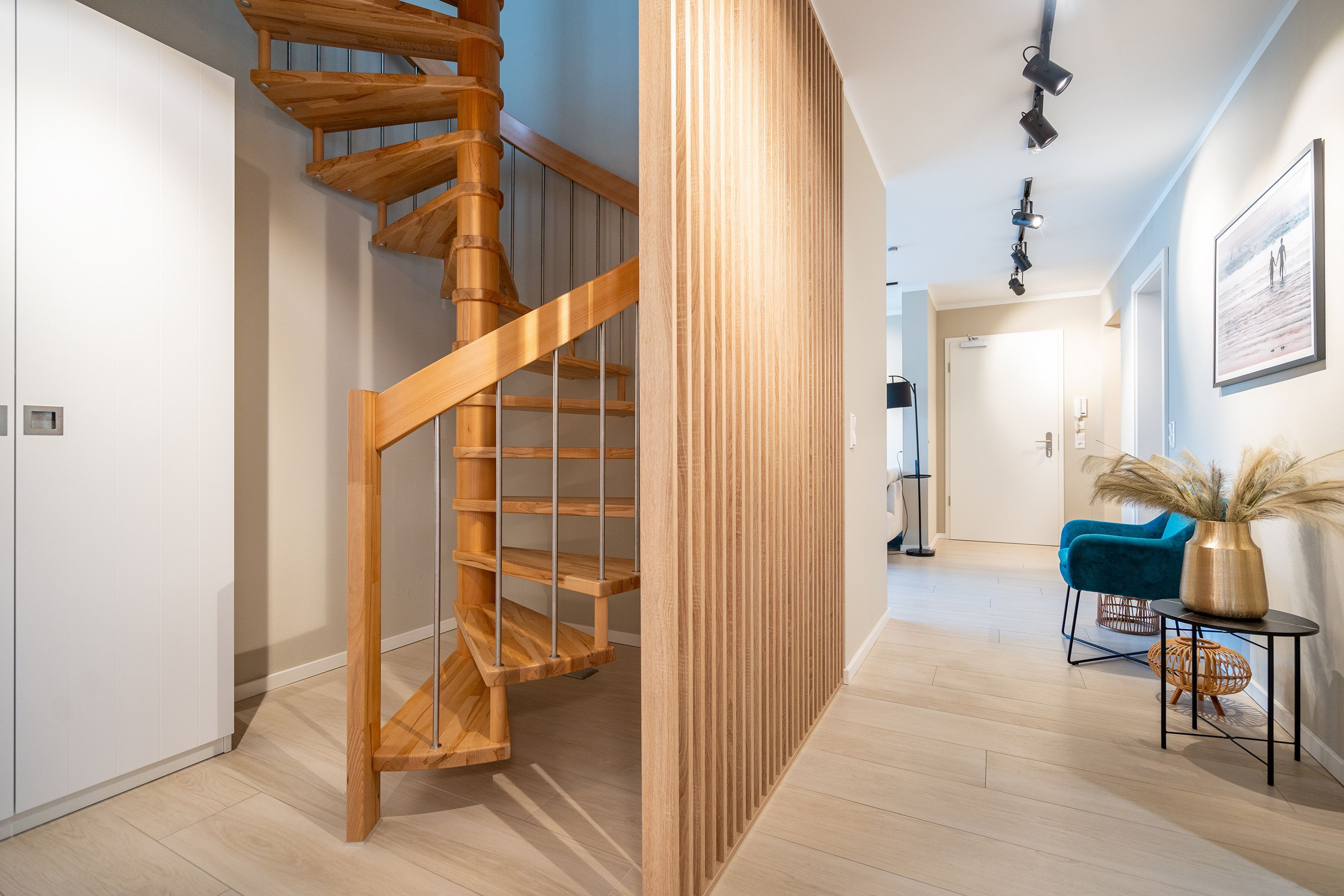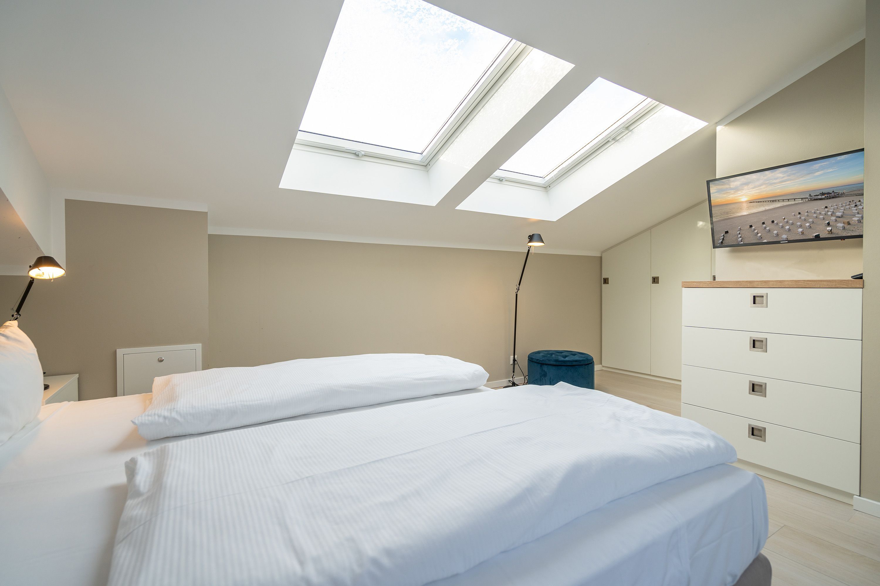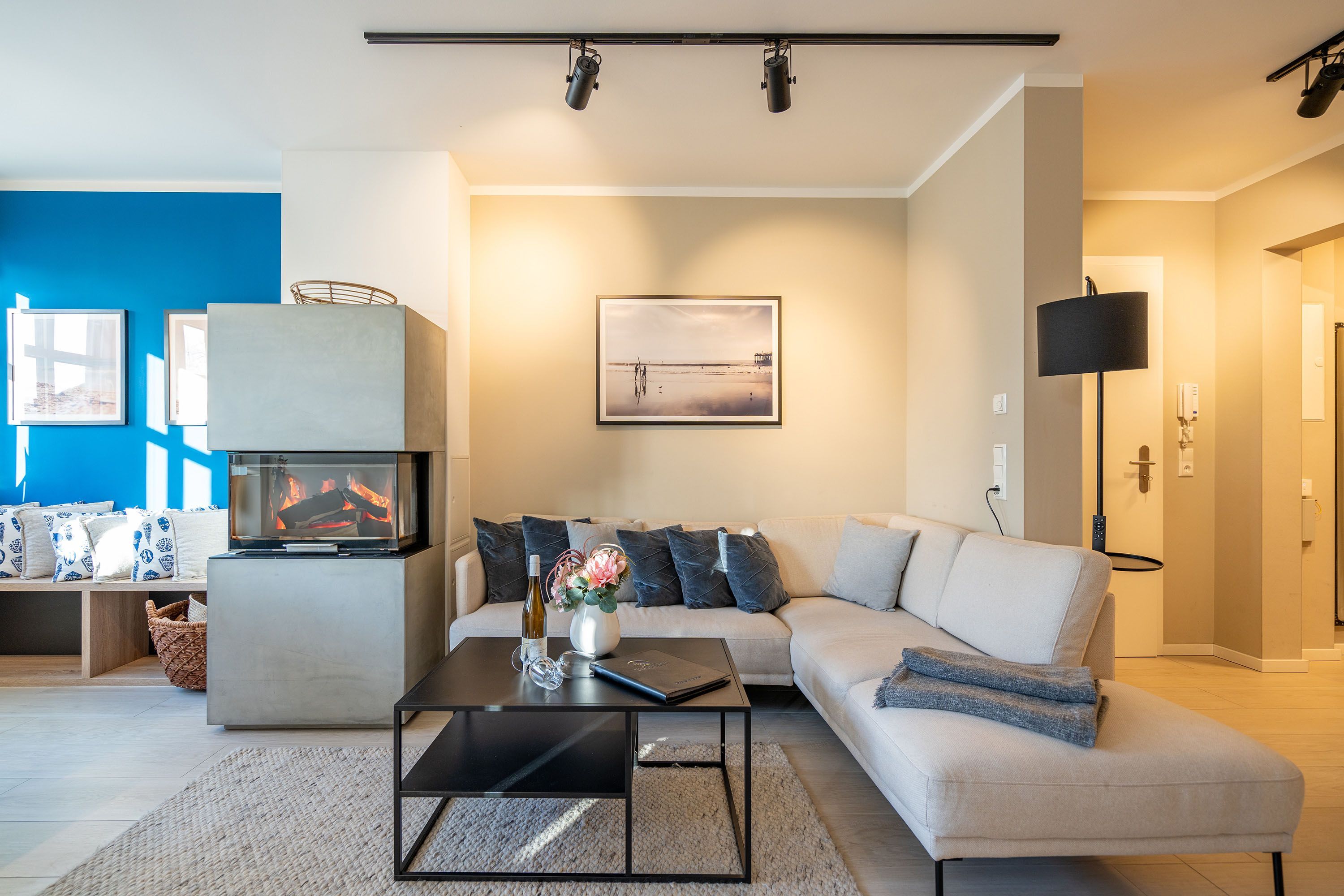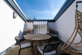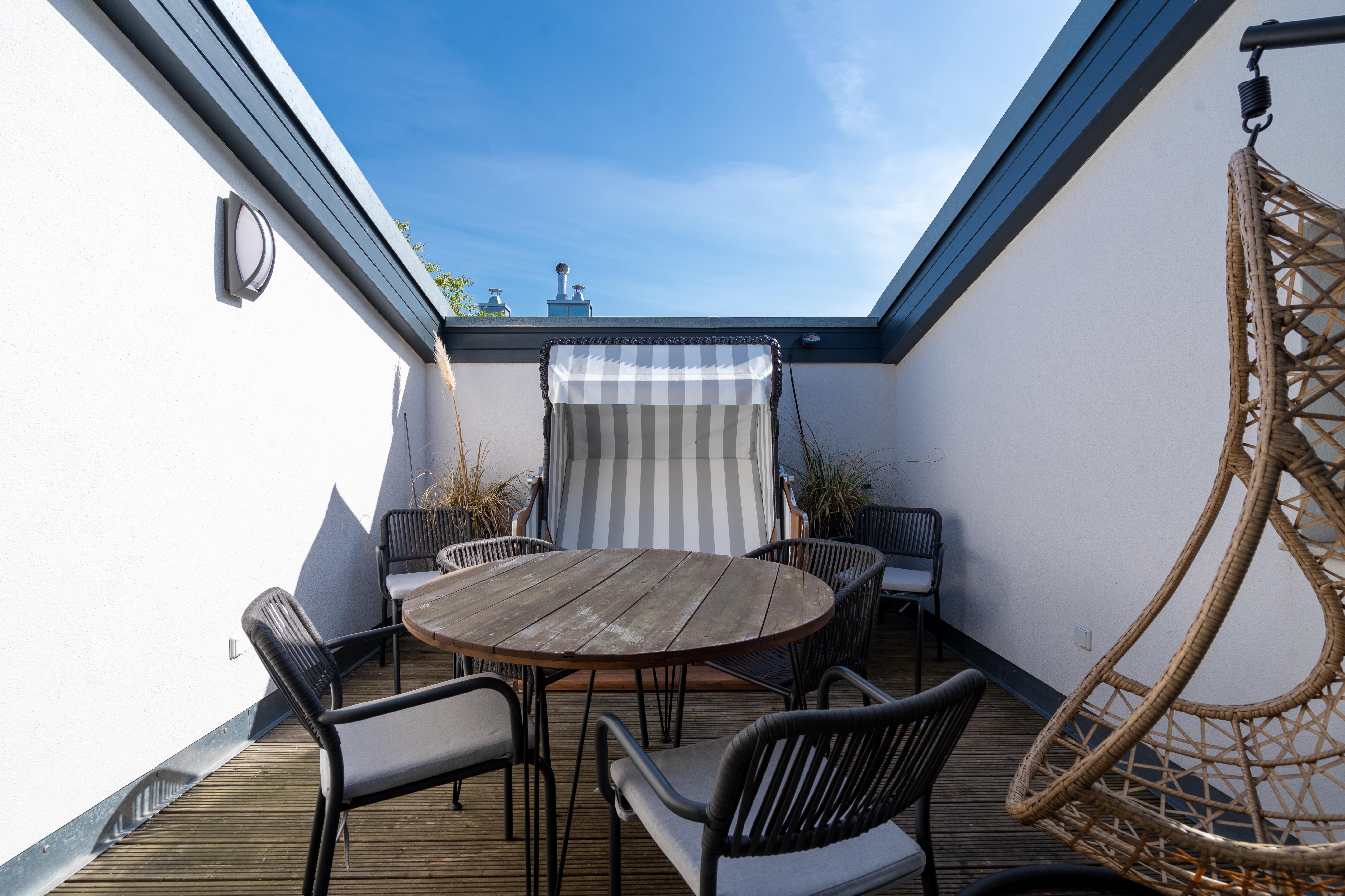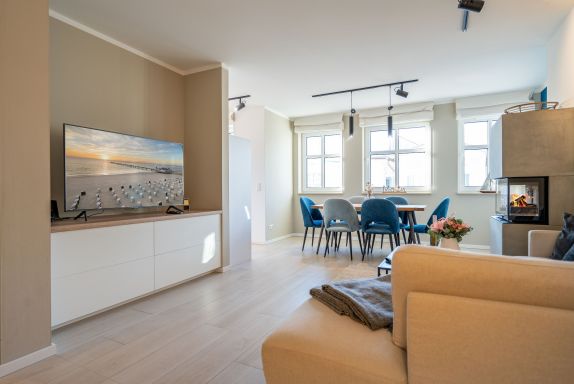 Maritimes Flair und eleganter Wohnkomfort – das Appartement Nummer 10 im ersten Obergeschoss ist ein echter Urlaubstraum. 100 Quadratmeter verteilt auf zwei Etagen sorgen für viel Platz. Ein Urlaubsparadies, aus dem man am liebsten nicht wieder ausziehen möchte. Bis zu sechs Personen können hier unterkommen. Die drei Schlafzimmer und das schöne, geräumige Wohn-Esszimmer sind ideal für einen Urlaub mit der ganzen Familie oder den Freunden. Das Wohnzimmer verfügt über eine gemütliche Sofalandschaft, einen Kamin und einen großen Flat-TV. Ein schöner Esstisch aus Holz und samtig bequeme Stühle laden zum Genießen und Verweilen ein. Jedes Accessoires, jedes Foto an der Wand versetzt hier in Ostseeauszeitstimmung. Lassen Sie sich fallen und fühlen Sie sich einfach nur wohl. Die zum Wohnzimmer hin offene Küche ist mit hochwertigen Markengeräten voll ausgestattet. Ob Induktionsherd, Spülmaschine, Mikrowelle, Kaffeemaschine, Toaster oder edles Geschirr – es ist alles vorhanden. Auf der unteren Ebene befinden sich zudem zwei der drei Schlafzimmer. Das dritte ist eine Etage höher. Alle drei jedoch sind gleich eingerichtet, verfügen über ein komfortables Boxspringdoppelbett (1,80 m x 2,00 m), einen Einbauschrank und einen Flat-TV. Zwei Bäder mit Dusche und WC hat das Appartement. Im Masterbad mit Tageslicht wartet außerdem neben einem Doppelwaschtisch auch noch eine Finnische Sauna darauf, Ihnen nach einem frostigen Sturmspaziergang ordentlich einzuheizen. In der Garderobe befindet sich eine Waschmaschine und ein Trockner. Über eine Wendeltreppe gelangt man in die obere Etage. Hier ist das dritte Schlafzimmer untergebracht, aber auch das absolute Highlight der Wohnung: eine sonnige und abgeschirmte Dachterrasse (12 Quadratmeter groß). Ob Frühstück oder erfrischender Abendcocktail – hier lässt sich der Sommerurlaub wunderbar entspannt angehen. Das WLAN ist kostenfrei nutzbar. Bei Anreise sind die Betten bezogen und Handtücher liegen bereit. In der Tiefgarage sind für das Appartement zwei hintereinander liegende Stellplätze reserviert. Hier gibt es auch die Möglichkeit, ein E-Auto an der Ladestation kostenpflichtig aufzuladen.