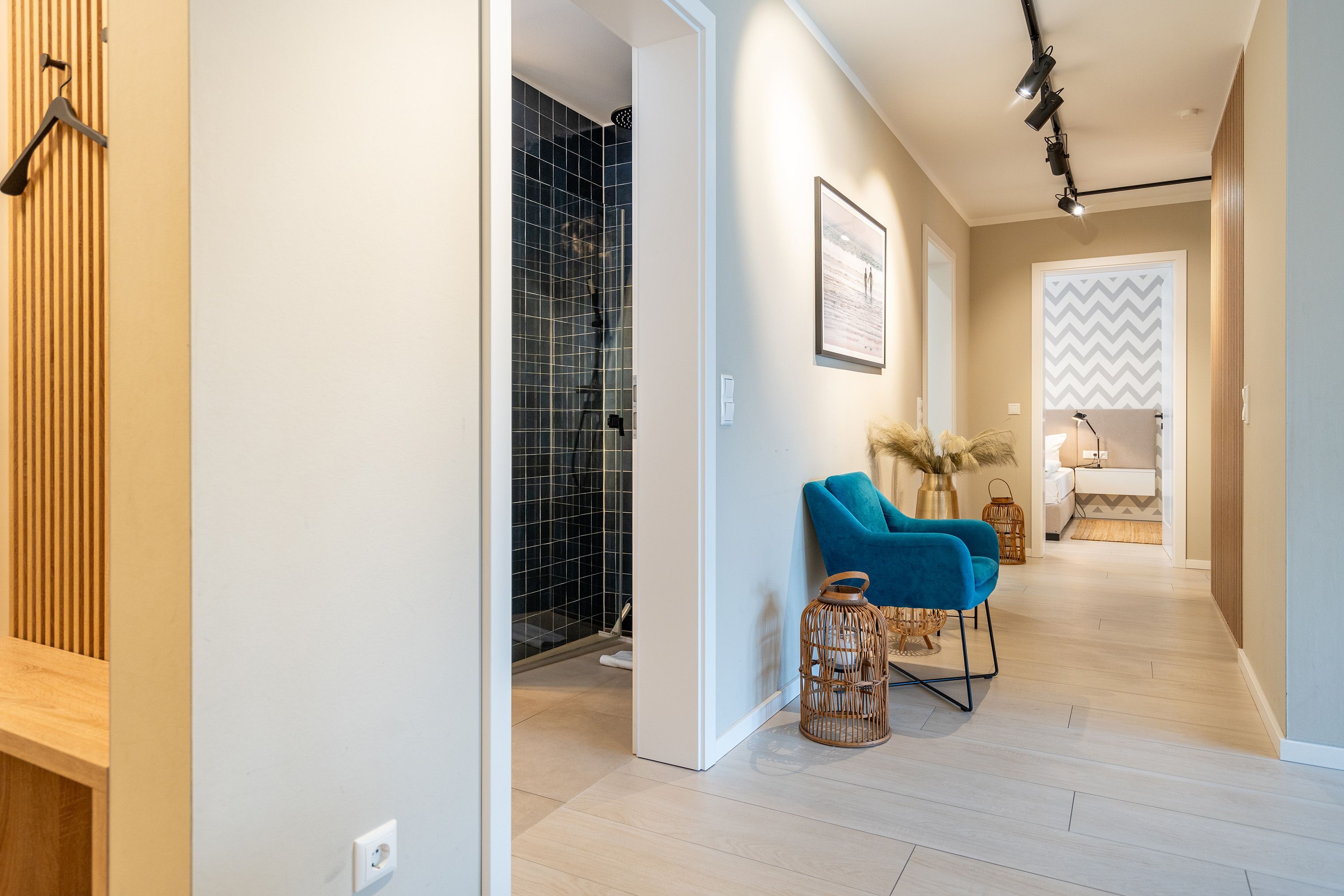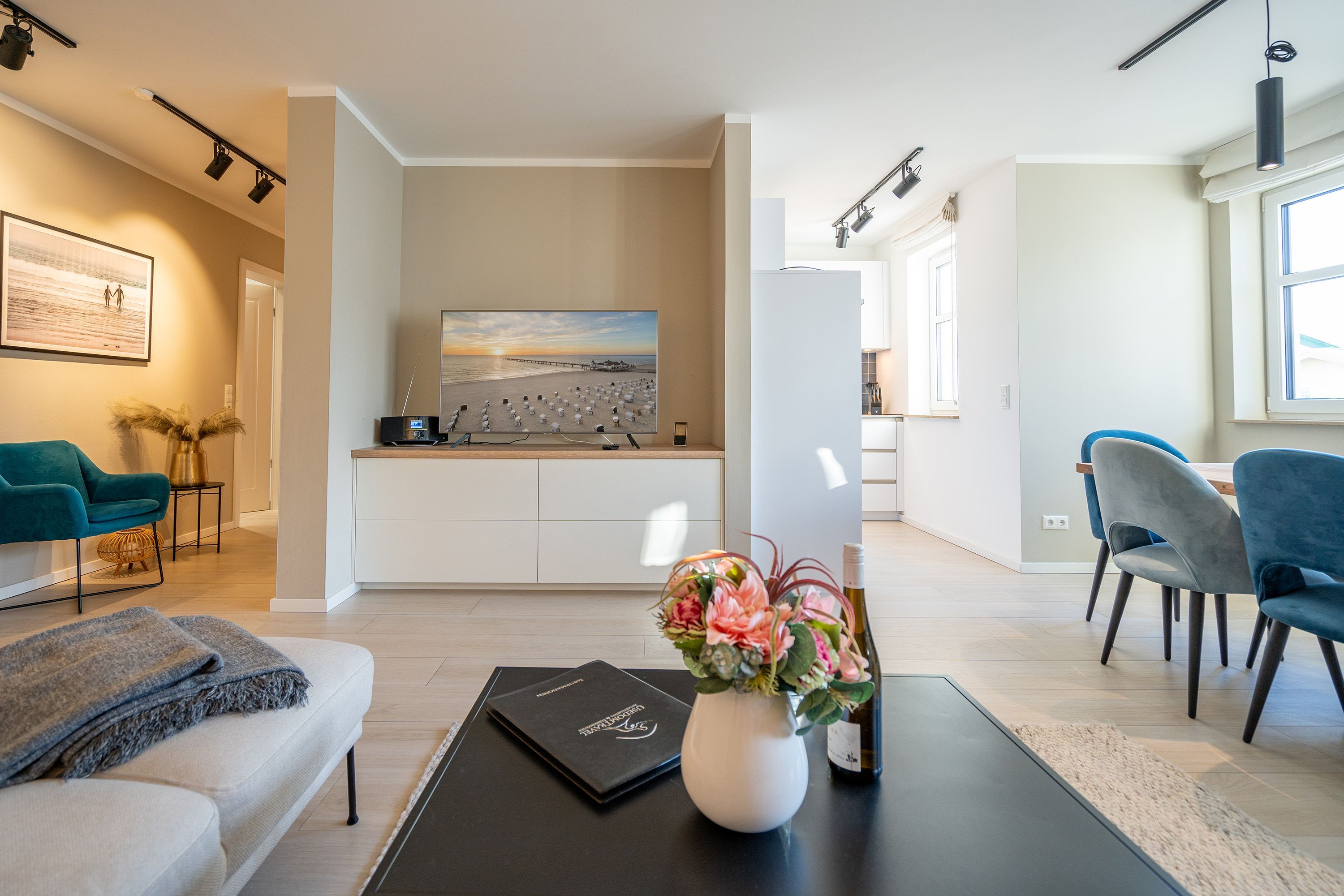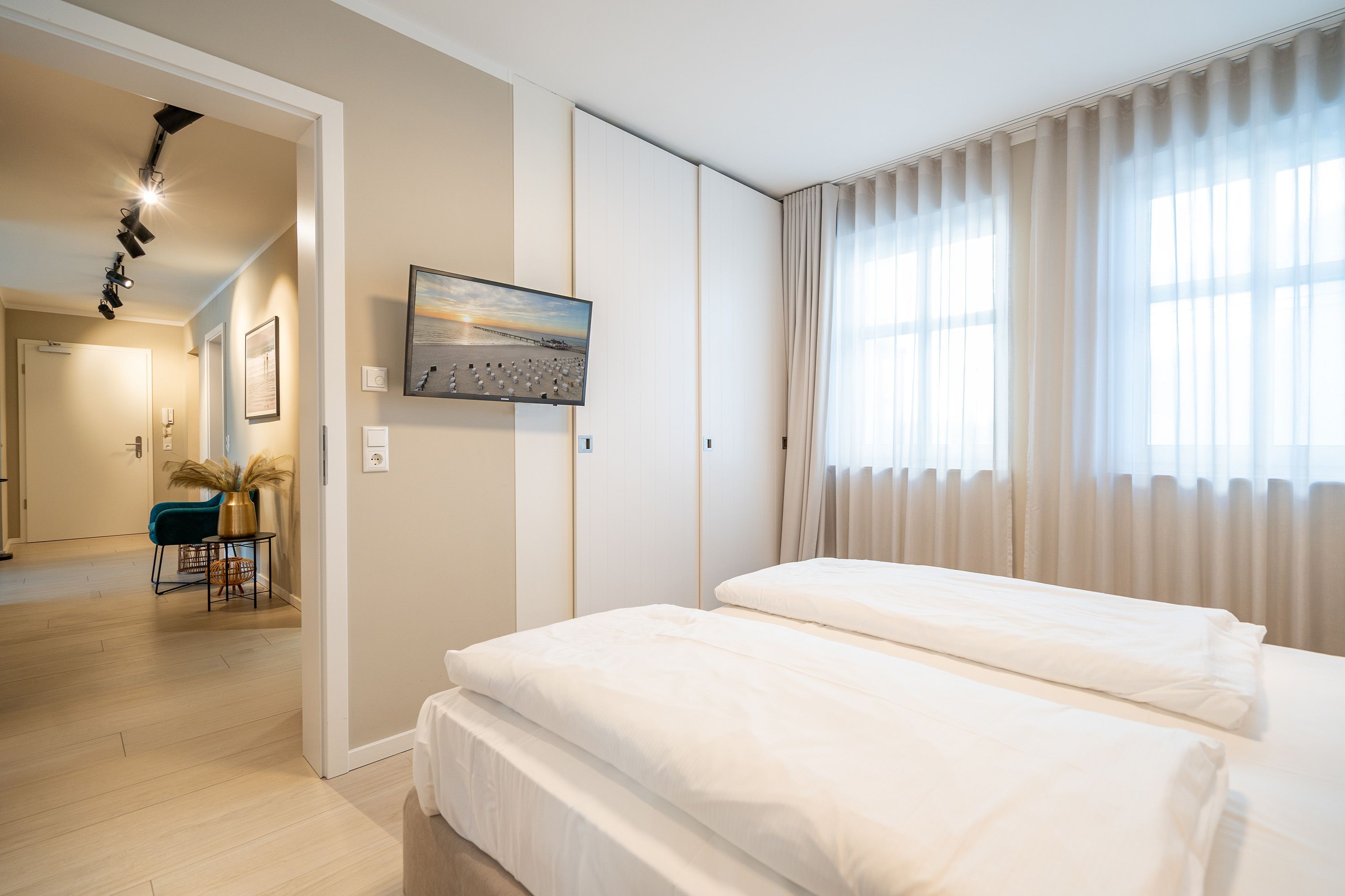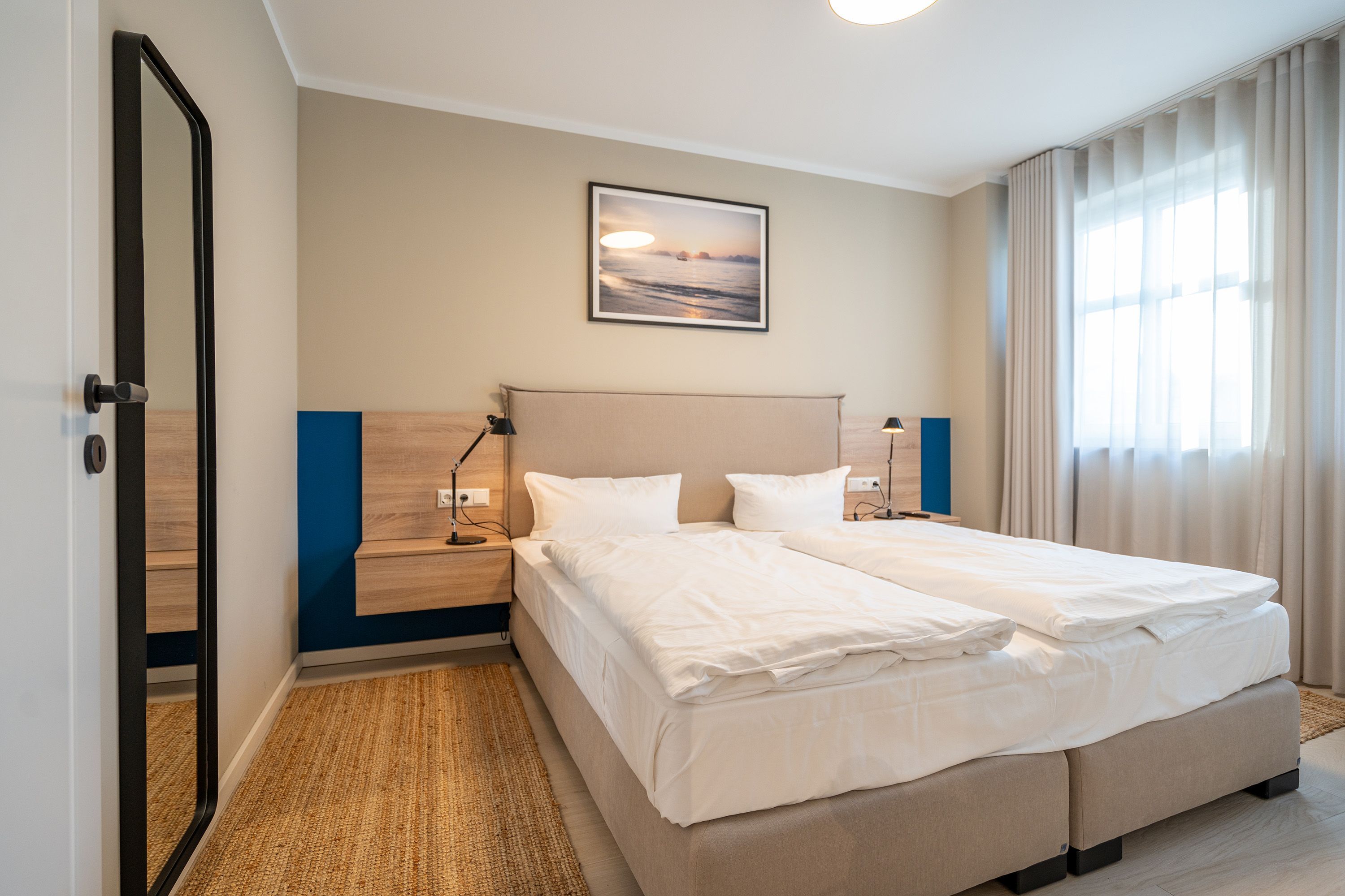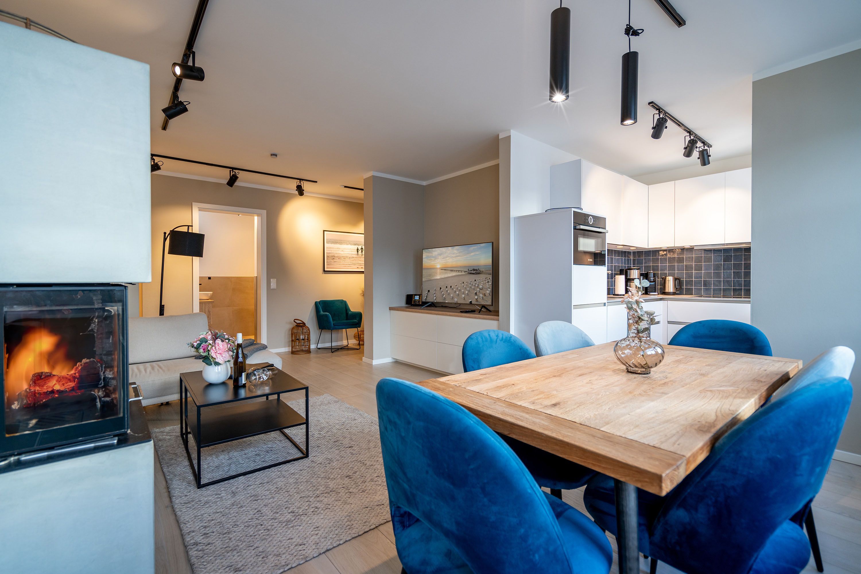 Maritimes Flair und eleganter Wohnkomfort – das Appartement Nummer 10 im ersten Obergeschoss ist ein echter Urlaubstraum. 100 Quadratmeter verteilt auf zwei Etagen sorgen für viel Platz. Ein Urlaubsparadies, aus dem man am liebsten nicht wieder ausziehen möchte. Bis zu sechs Personen können hier unterkommen. Die drei Schlafzimmer und das schöne, geräumige Wohn-Esszimmer sind ideal für einen Urlaub mit der ganzen Familie oder den Freunden. Das Wohnzimmer verfügt über eine gemütliche Sofalandschaft, einen Kamin und einen großen Flat-TV. Ein schöner Esstisch aus Holz und samtig bequeme Stühle laden zum Genießen und Verweilen ein. Jedes Accessoires, jedes Foto an der Wand versetzt hier in Ostseeauszeitstimmung. Lassen Sie sich fallen und fühlen Sie sich einfach nur wohl. Die zum Wohnzimmer hin offene Küche ist mit hochwertigen Markengeräten voll ausgestattet. Ob Induktionsherd, Spülmaschine, Mikrowelle, Kaffeemaschine, Toaster oder edles Geschirr – es ist alles vorhanden. Auf der unteren Ebene befinden sich zudem zwei der drei Schlafzimmer. Das dritte ist eine Etage höher. Alle drei jedoch sind gleich eingerichtet, verfügen über ein komfortables Boxspringdoppelbett (1,80 m x 2,00 m), einen Einbauschrank und einen Flat-TV. Zwei Bäder mit Dusche und WC hat das Appartement. Im Masterbad mit Tageslicht wartet außerdem neben einem Doppelwaschtisch auch noch eine Finnische Sauna darauf, Ihnen nach einem frostigen Sturmspaziergang ordentlich einzuheizen. In der Garderobe befindet sich eine Waschmaschine und ein Trockner. Über eine Wendeltreppe gelangt man in die obere Etage. Hier ist das dritte Schlafzimmer untergebracht, aber auch das absolute Highlight der Wohnung: eine sonnige und abgeschirmte Dachterrasse (12 Quadratmeter groß). Ob Frühstück oder erfrischender Abendcocktail – hier lässt sich der Sommerurlaub wunderbar entspannt angehen. Das WLAN ist kostenfrei nutzbar. Bei Anreise sind die Betten bezogen und Handtücher liegen bereit. In der Tiefgarage sind für das Appartement zwei hintereinander liegende Stellplätze reserviert. Hier gibt es auch die Möglichkeit, ein E-Auto an der Ladestation kostenpflichtig aufzuladen.