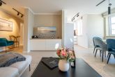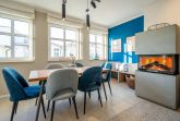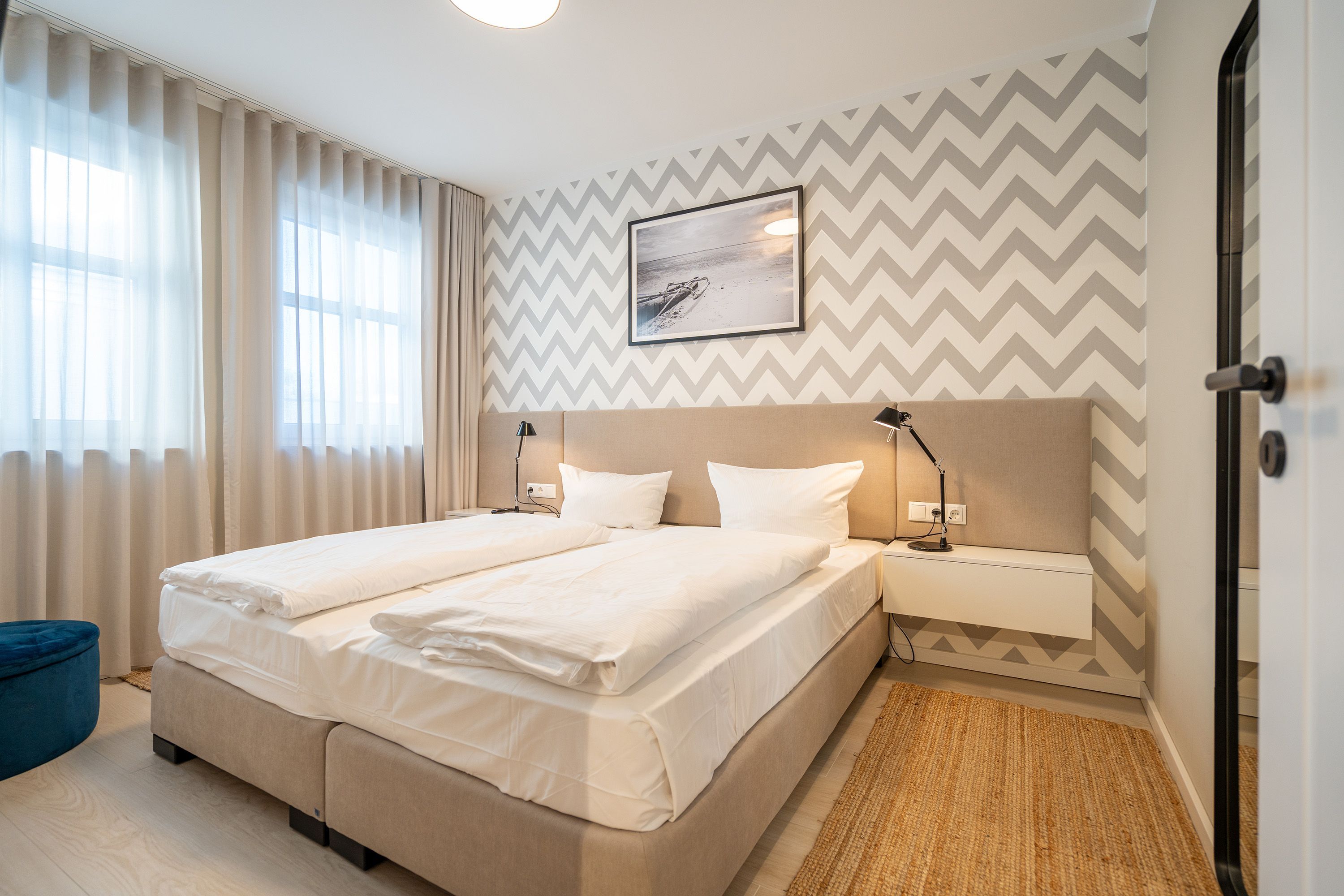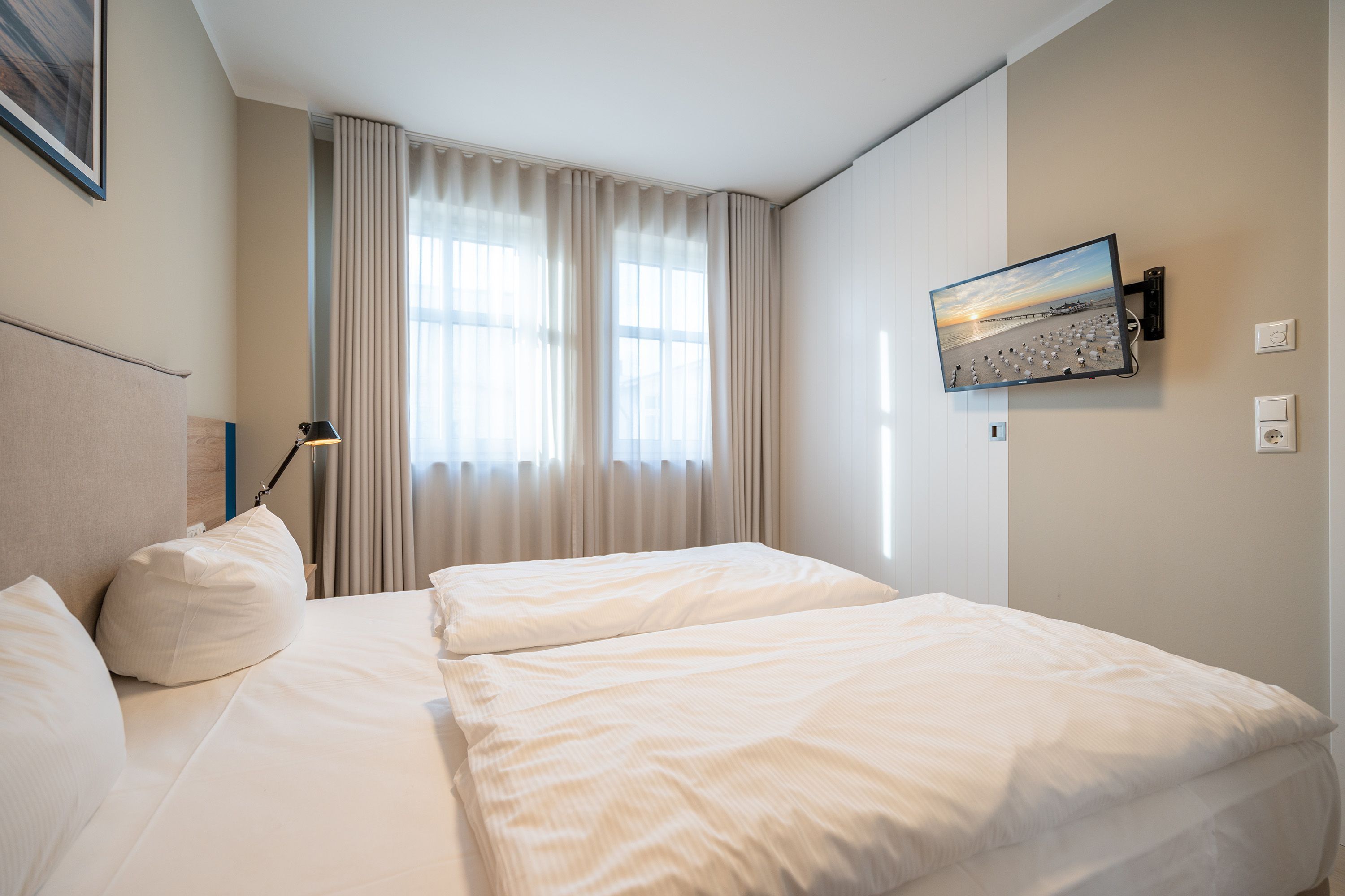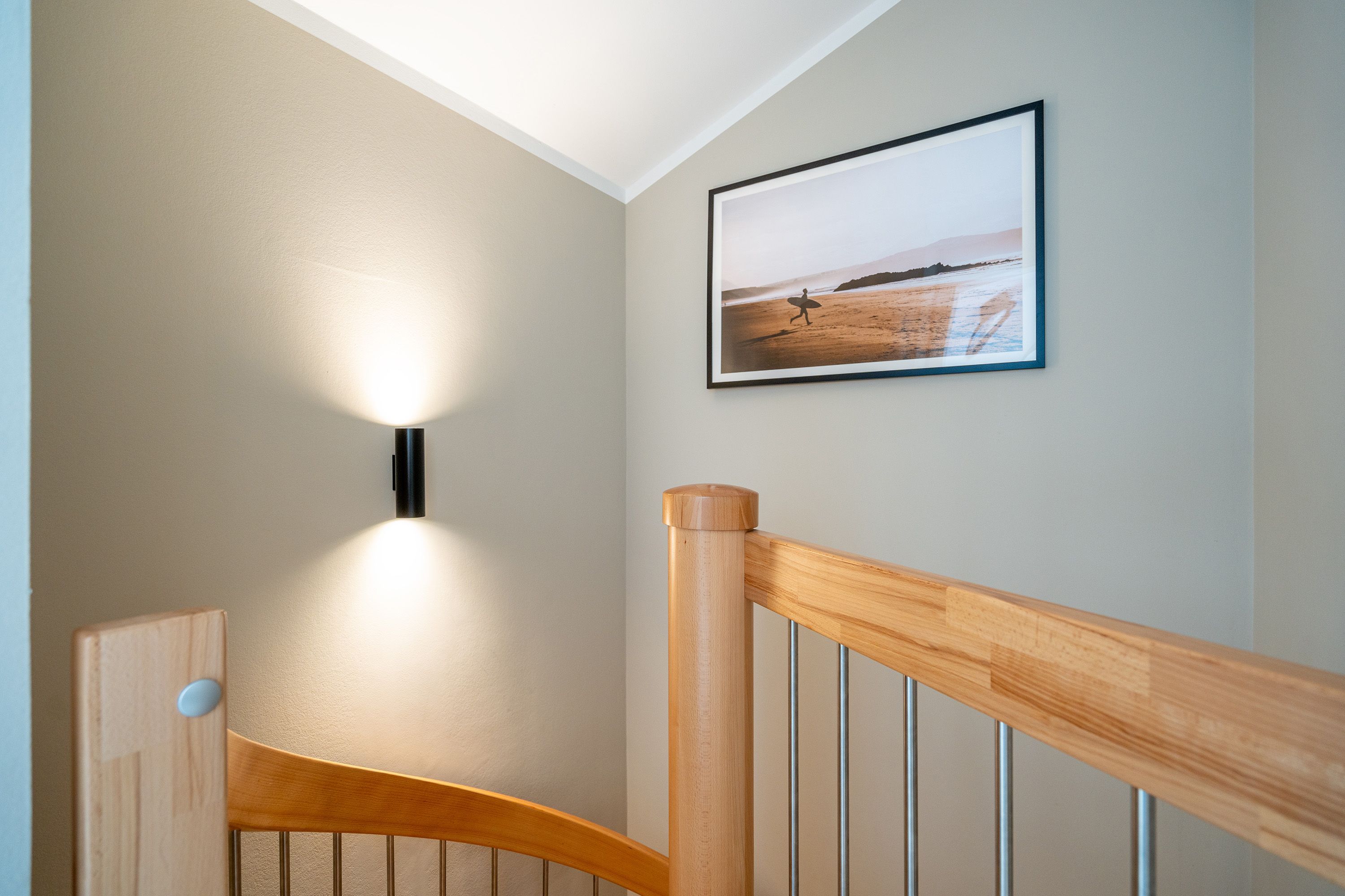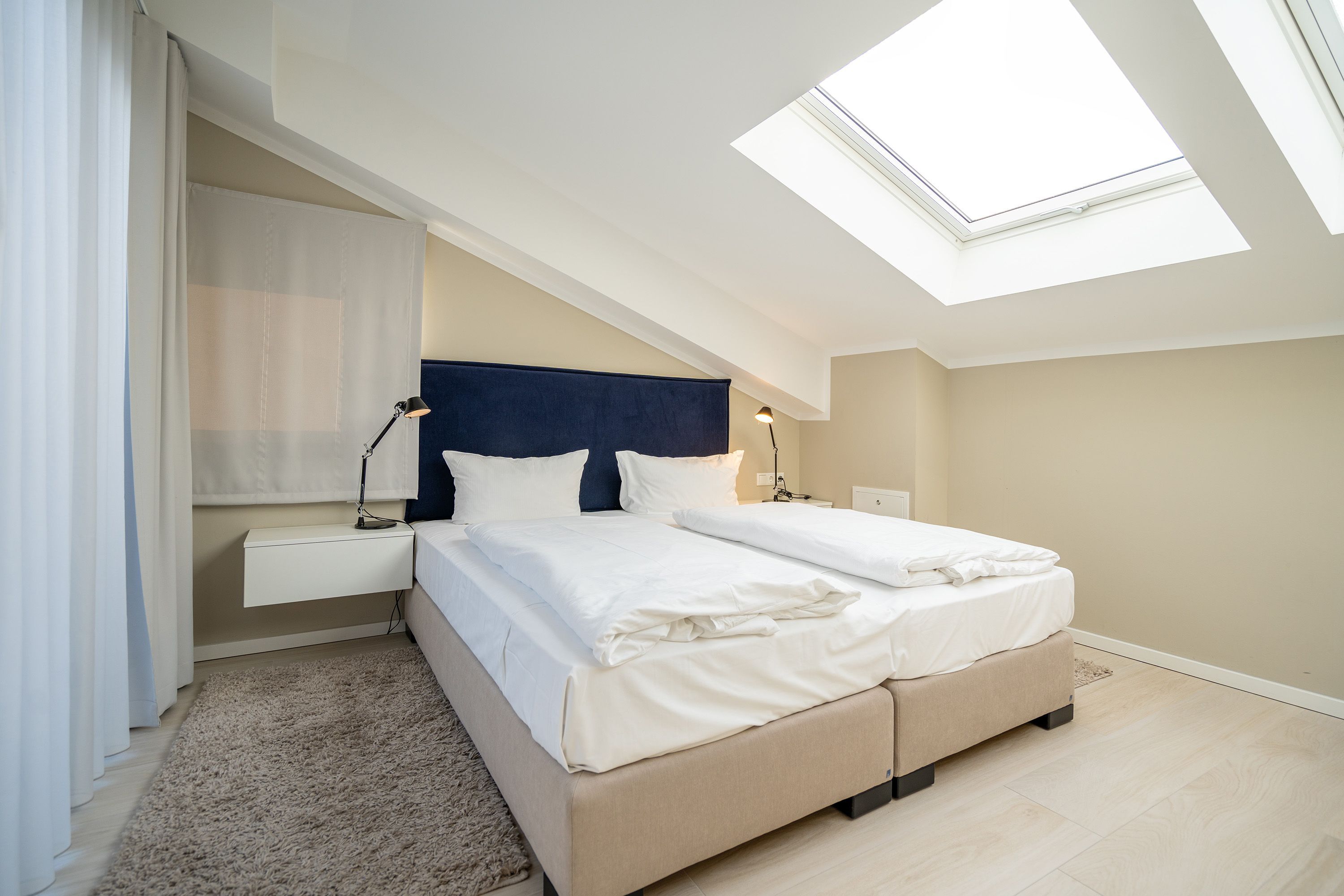 Maritimes Flair und eleganter Wohnkomfort – das Appartement Nummer 10 im ersten Obergeschoss ist ein echter Urlaubstraum. 100 Quadratmeter verteilt auf zwei Etagen sorgen für viel Platz. Ein Urlaubsparadies, aus dem man am liebsten nicht wieder ausziehen möchte. Bis zu sechs Personen können hier unterkommen. Die drei Schlafzimmer und das schöne, geräumige Wohn-Esszimmer sind ideal für einen Urlaub mit der ganzen Familie oder den Freunden. Das Wohnzimmer verfügt über eine gemütliche Sofalandschaft, einen Kamin und einen großen Flat-TV. Ein schöner Esstisch aus Holz und samtig bequeme Stühle laden zum Genießen und Verweilen ein. Jedes Accessoires, jedes Foto an der Wand versetzt hier in Ostseeauszeitstimmung. Lassen Sie sich fallen und fühlen Sie sich einfach nur wohl. Die zum Wohnzimmer hin offene Küche ist mit hochwertigen Markengeräten voll ausgestattet. Ob Induktionsherd, Spülmaschine, Mikrowelle, Kaffeemaschine, Toaster oder edles Geschirr – es ist alles vorhanden. Auf der unteren Ebene befinden sich zudem zwei der drei Schlafzimmer. Das dritte ist eine Etage höher. Alle drei jedoch sind gleich eingerichtet, verfügen über ein komfortables Boxspringdoppelbett (1,80 m x 2,00 m), einen Einbauschrank und einen Flat-TV. Zwei Bäder mit Dusche und WC hat das Appartement. Im Masterbad mit Tageslicht wartet außerdem neben einem Doppelwaschtisch auch noch eine Finnische Sauna darauf, Ihnen nach einem frostigen Sturmspaziergang ordentlich einzuheizen. In der Garderobe befindet sich eine Waschmaschine und ein Trockner. Über eine Wendeltreppe gelangt man in die obere Etage. Hier ist das dritte Schlafzimmer untergebracht, aber auch das absolute Highlight der Wohnung: eine sonnige und abgeschirmte Dachterrasse (12 Quadratmeter groß). Ob Frühstück oder erfrischender Abendcocktail – hier lässt sich der Sommerurlaub wunderbar entspannt angehen. Das WLAN ist kostenfrei nutzbar. Bei Anreise sind die Betten bezogen und Handtücher liegen bereit. In der Tiefgarage sind für das Appartement zwei hintereinander liegende Stellplätze reserviert. Hier gibt es auch die Möglichkeit, ein E-Auto an der Ladestation kostenpflichtig aufzuladen.