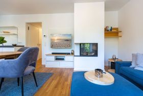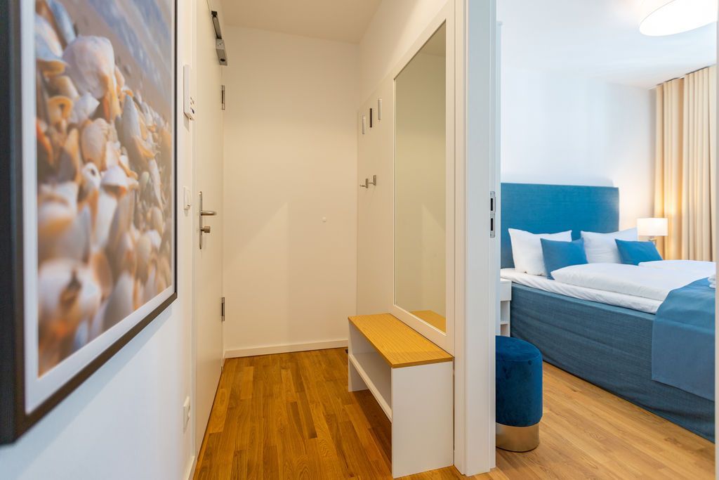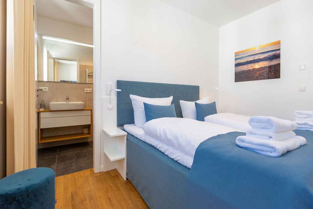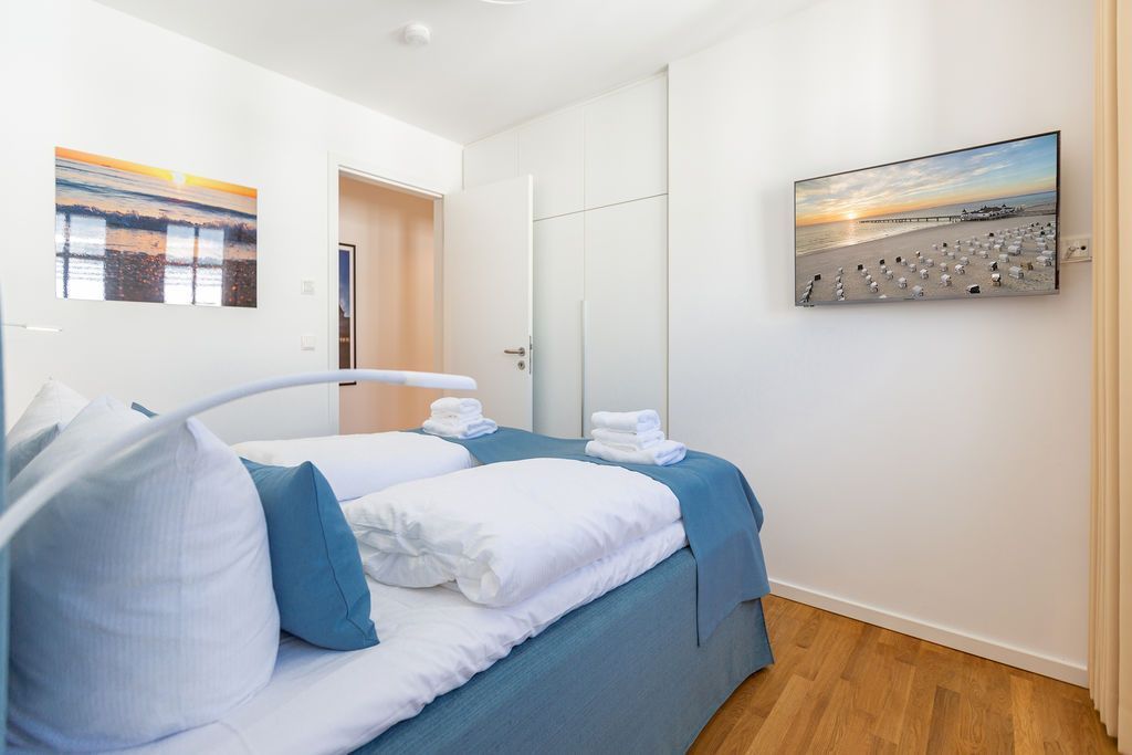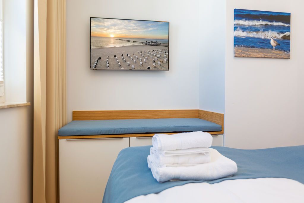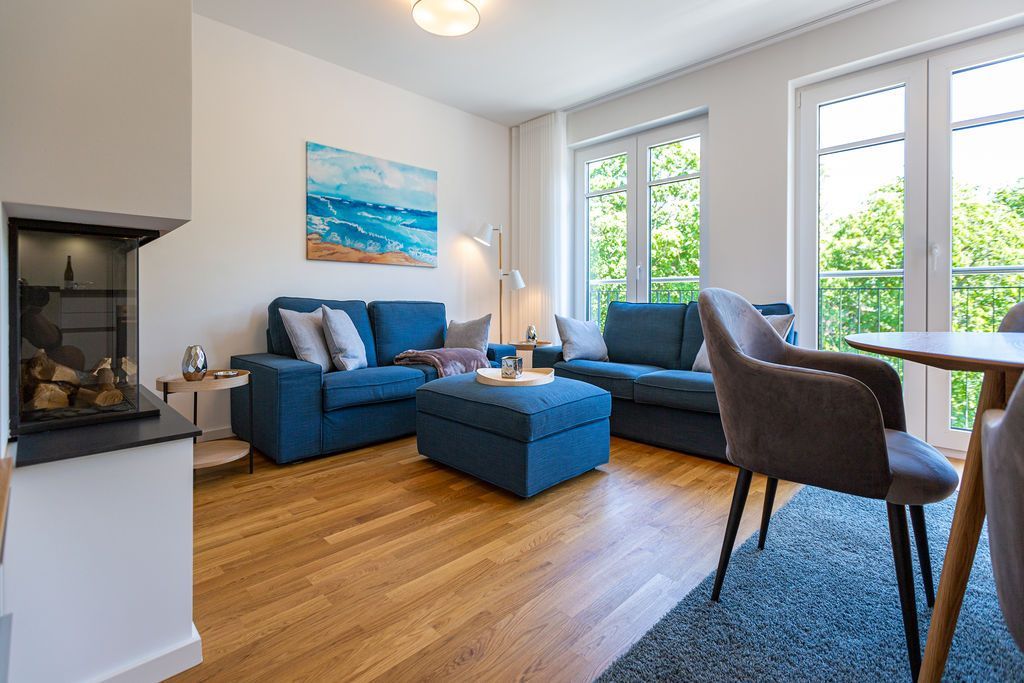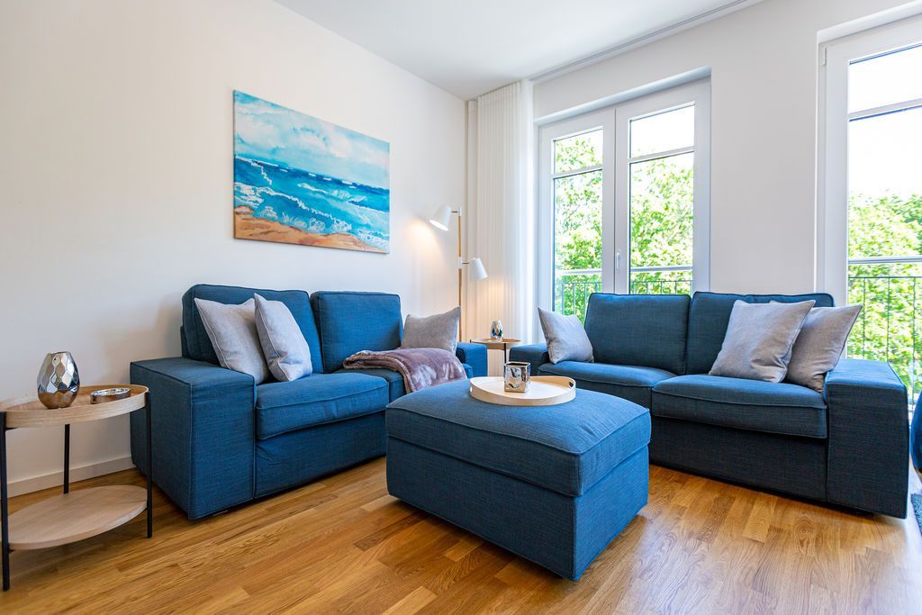 Blau macht glücklich. Denn Blau ist die Farbe der Ostsee, die Sie vom Balkon dieses wunderschönen Drei-Zimmer-Appartements aus im 2. Obergeschoss des Strandhauses sehen können. Einmal tief einatmen und die Sorgen von der lauen Ostseebrise mit hinaus aufs Meer mitnehmen lassen. Denn Ihr Urlaubsdomizil schenkt Ihnen auf 74 geräumigen Quadratmetern viel Erholung und Behaglichkeit für bis zu vier Personen. Blau ist hier nicht nur die Farbe, die bis an den Horizont reicht. Das maritime Flair durchzieht auch den großen und offenen Wohn-Essbereich und die beiden Schlafzimmer. Und die Sonne Usedoms überflutet dank der großen Fenster die gesamte Wohnung. Eine gemütliche Sitzlandschaft sorgt im Wohnzimmer für viel Fläche zum Relaxen. Es ist zudem mit einem Gaskamin und einem Flat-TV ausgestattet. Genießen und zusammensitzen können Sie auch am schönen Esstisch mit bequemen Polsterstühlen. Ein kleiner Balkon (10 Quadratmeter) offeriert einen Blick ins Grüne, auf die Ahlbecker Kirche und wie erwähnt auf die nahe Ostsee. Eine komplett ausgestattete Küche ist in den Wohnbereich integriert. Die Geräte sind allesamt hochwertige Markengeräte. Es gibt einen Induktionsherd, eine Mikrowelle, einen Geschirrspüler, einen Kühlschrank mit Gefrierfach, eine Kaffeemaschine, einen Toaster und einen Wasserkocher. In den Schränken finden Sie Töpfe und ein Geschirr-Set. Die beiden Schlafzimmer sind mit je einem komfortablen Boxspringdoppelbett (1,80 m x 2,00 m), einem Schrank und einem Flat-TV ausgestattet. Die beiden Bäder der Wohnung sind wunderbar modern. Beide haben einen Waschtisch und ein WC. Beide Bäder besitzen eine Dusche bei einem der Bäder ist die Dusche in der Badewanne. Das Masterbad beherbergt sogar eine kleine Wellness-Oase. Freuen Sie sich an kühlen Tagen oder Abenden auf die wohlige Wärme der Finnischen Sauna. Handtücher liegen bereit und auch die Betten sind bei Ihrer Anreise bezogen. Eine Waschmaschine ist ebenfalls vorhanden. Das WLAN können Sie kostenfrei nutzen. In der Tiefgarage ist der Stellplatz 08 für Sie reserviert. Gegen eine Gebühr besteht die Möglichkeit, an einer Wallbox ein Elektroauto zu laden.