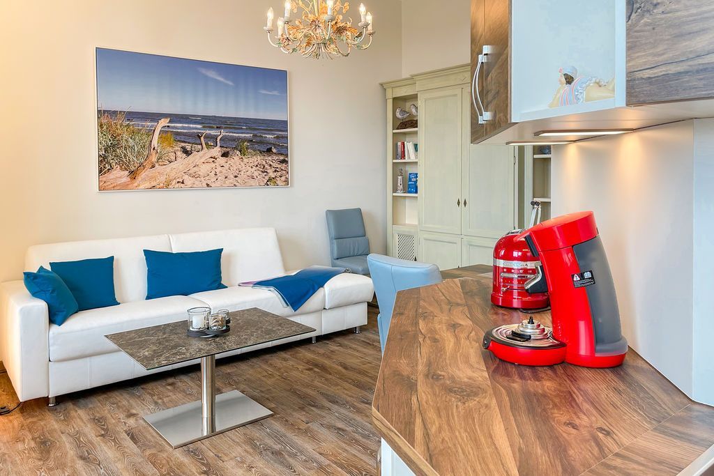 Wenn es am schönsten ist, sollte man bleiben! Und das wollen Sie garantiert in diesem hell und modern gestalteten 2-Raum-Appartement im 1. Obergeschoss. Durch die direkte Lage an der Strandpromenade haben Sie einen unverbauten und freien Blick auf das Blau der Ostsee. Bis zu 2 Personen finden hier Platz zum Entspannen beim Ostseekino. Vom offenen Wohn-Essbereich mit Schlafcouch (nur als Ausweichmöglichkeit) und Flat-TV haben Sie Zugang zum 13qm großen Nord-Ostbalkon. Einem promenadenseitigen Sonnenbad steht Dank Sonnenliegen nichts im Weg. Auch ein Frühstück für Zwei ist hier möglich. Die hochwertige Küche mit angrenzendem Essplatz für bis zu 2 Personen ist optisch perfekt in den Wohnraum integriert und bietet alles, was Sie zum Zubereiten Ihrer Speisen benötigen. Eine Senseo-Kapselmaschine sowie eine Mikrowelle komplettieren die Küchenausstattung. Verzichten Sie auch in Ihrem Urlaub nicht auf erholsamen Schlaf. Ein bequemes Boxspringbett (1,80m x 2,00m) sowie ein Flat-TV laden am Abend zum Träumen ein. In dem innenliegenden Badezimmer mit Dusche, Waschtisch und WC liegen bereits die Handtücher bei Ihrer Anreise für Sie bereit. Dem Appartement ist ein PKW-Stellplatz mit der Nr. 36 zugeordnet. Selbstverständlich verfügt das Appartement auch über kostenfreies W-Lan.