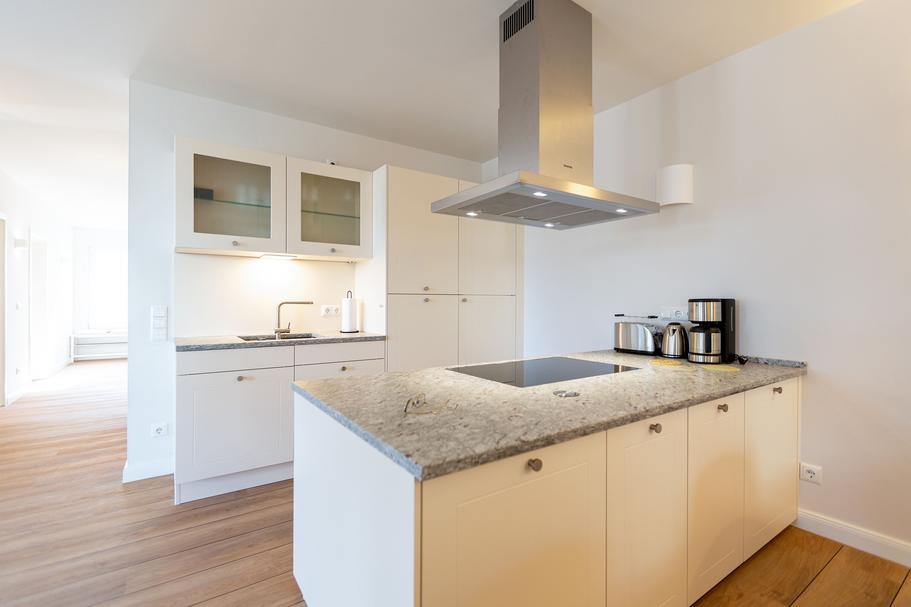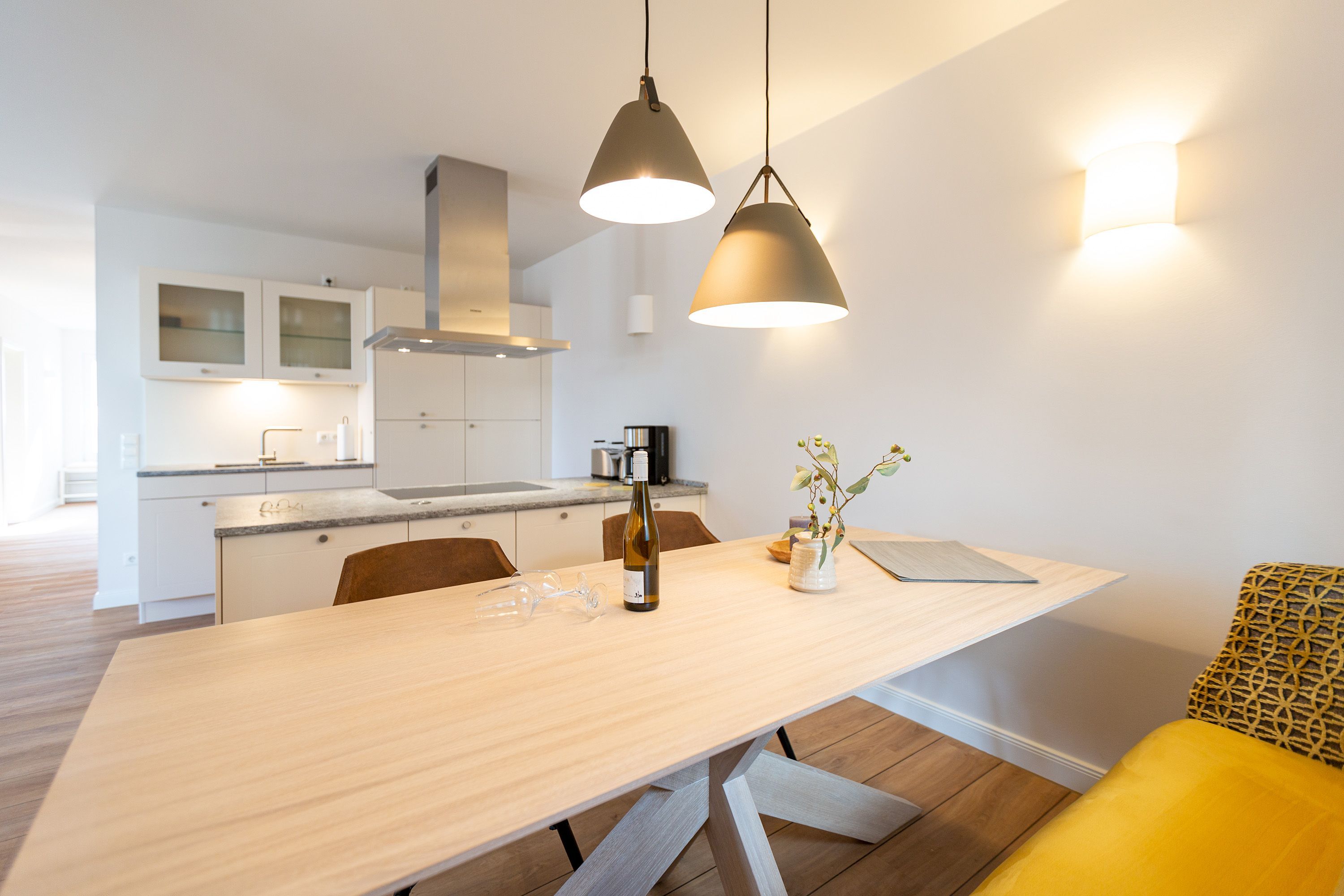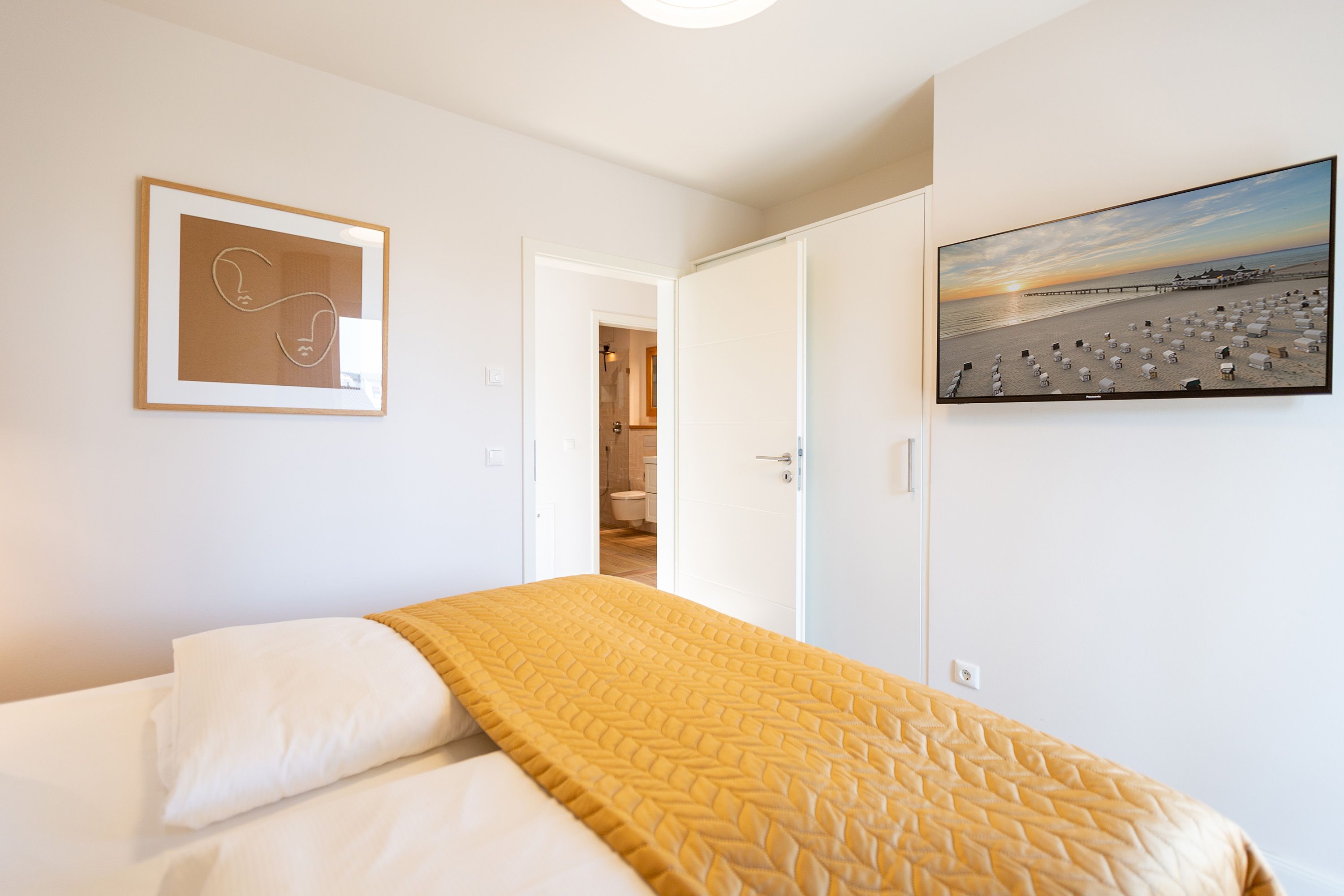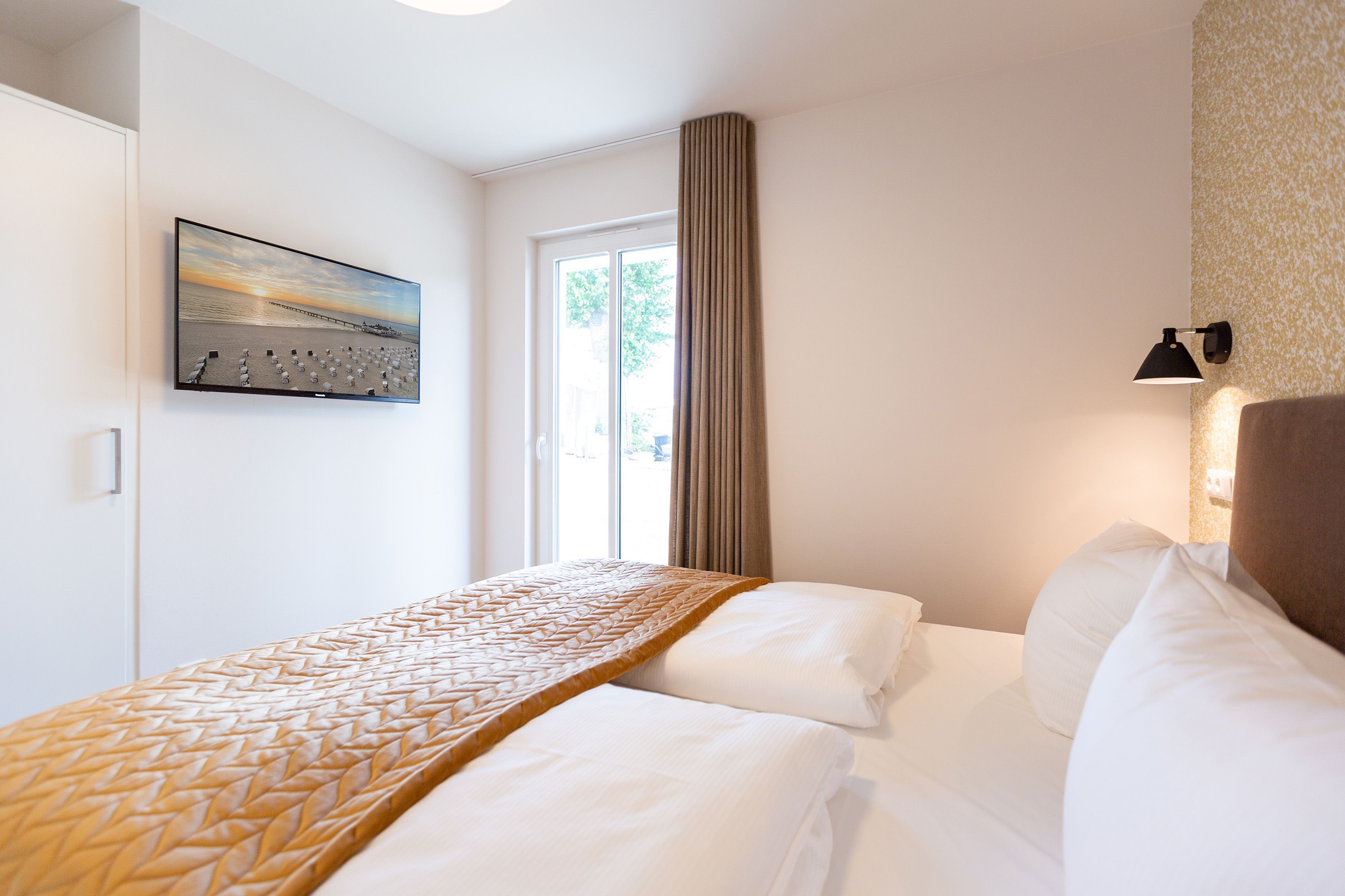 Modernes Design und ein perfekt abgestimmtes Farbkonzept erwarten Sie in diesem Drei-Zimmer-Feriendomizil für bis zu vier Personen im Gartengeschoss. Auf den 84qm begrüßen Sie helle Farbtöne in Kombination mit einem dezenten maritimen Look. Der offen gestaltete Wohn-Ess-Bereich besticht durch seine gemütliche Atmosphäre und seine Großzügigkeit. In der voll ausgestatteten Küche mit hochwertigen Siemens-Geräten ist für jeden Komfort beim Zubereiten Ihrer Speisen gesorgt. Eine Granit-Arbeitsplatte sorgt zudem für einfaches Sauberhalten und einen edlen Look. Genießen Sie gemeinsame Fernsehabende vor dem Flat-TV mit Soundsystem und hören Sie dem Knistern des dreiseitigen Gaskamins zu, der vom Wohn- und Essbereich aus für eine wohlige Stimmung sorgt. Den perfekten Start in den Tag können Sie sich auf der 25qm großen Nord-Terrasse gönnen, während Sie den ersten Morgenkaffee genießen. In komfortablen Boxspringbetten (1,80m x 2,00m) lässt es sich am besten von Ihren Urlaubserlebnissen träumen. Und bei richtiger Windrichtung und Wellengang können Sie sich sogar das Meeresrauschen über die Terrassentüren in Ihr Appartement holen. Zwei barrierefreie Regenduschen, beheizte Spiegel und eine Saunalandschaft im Masterbad sorgen für ein erholsames Spa-Erlebnis. Kostenfreies W-Lan und ein Stellplatz in der hauseigenen Tiefgarage runden Ihren perfekten Urlaub auf der Insel Usedom ab.