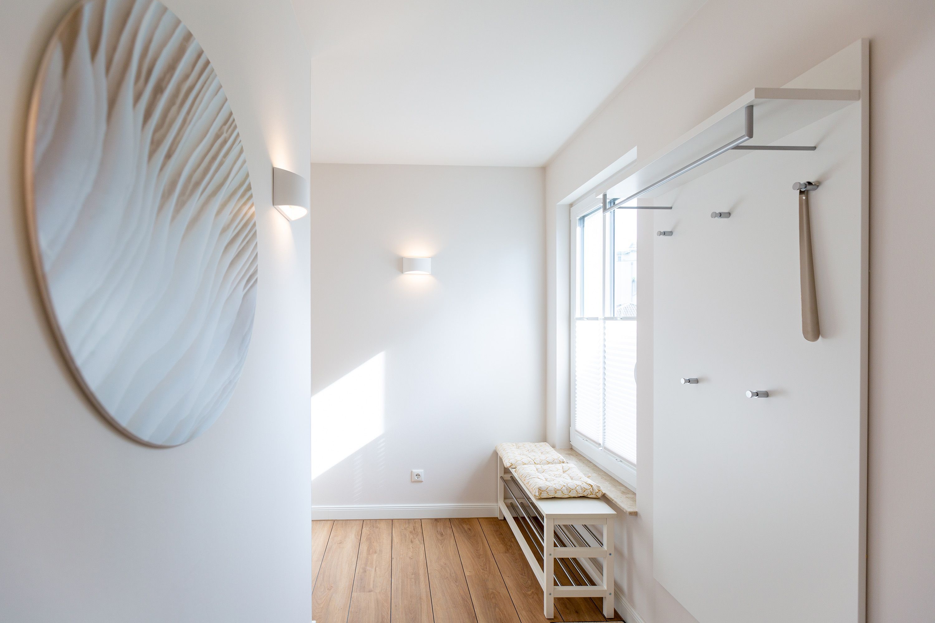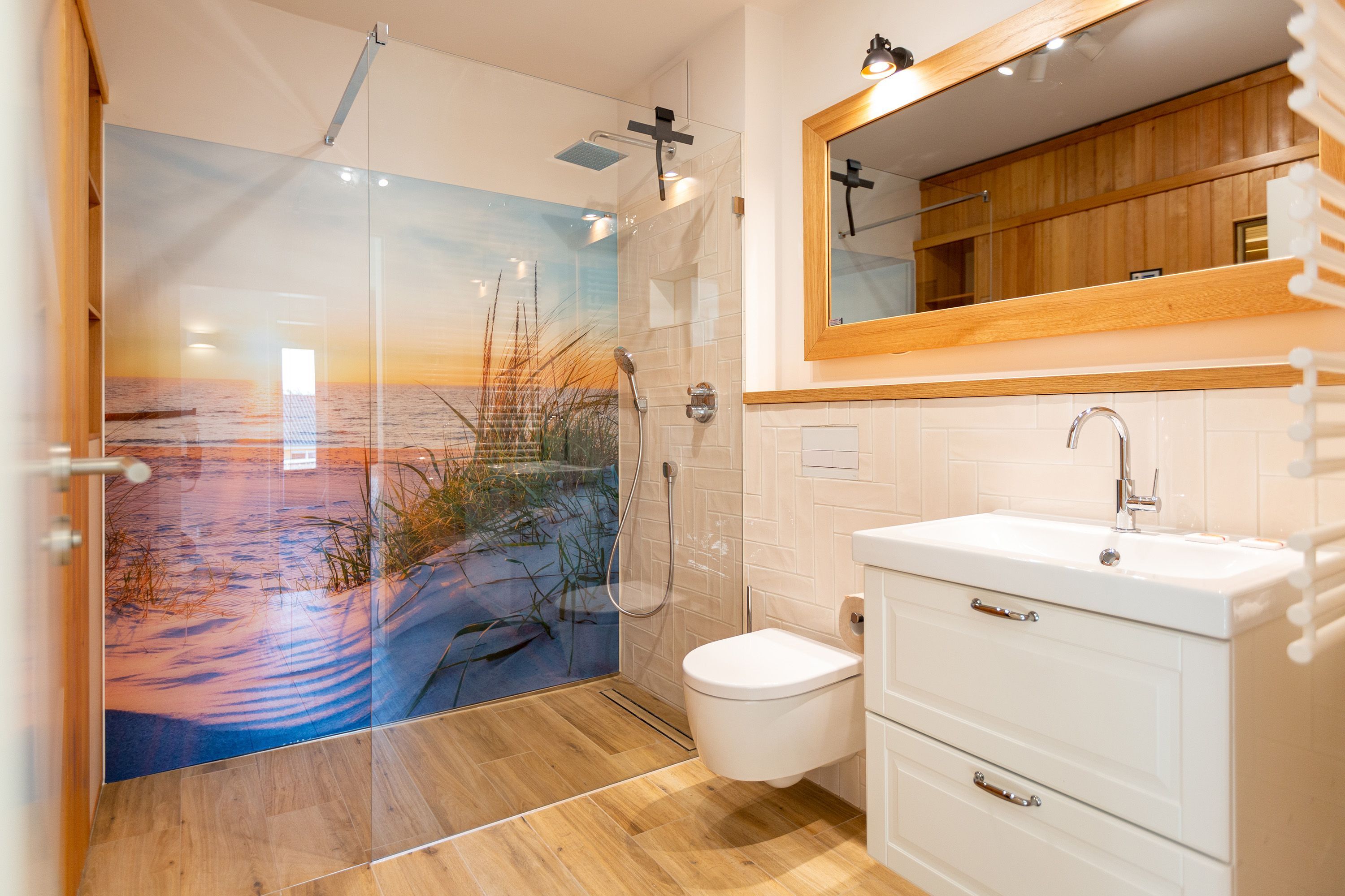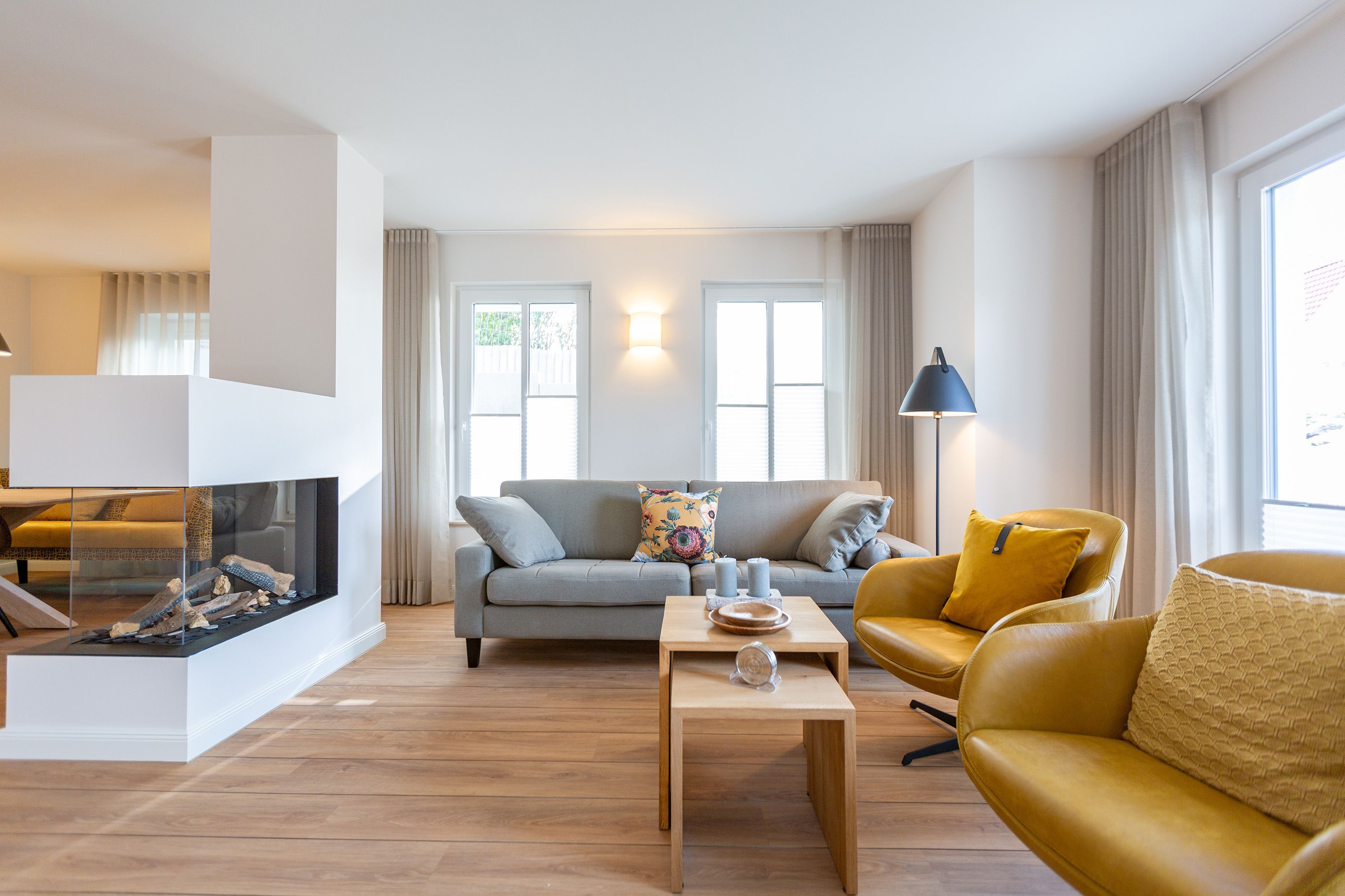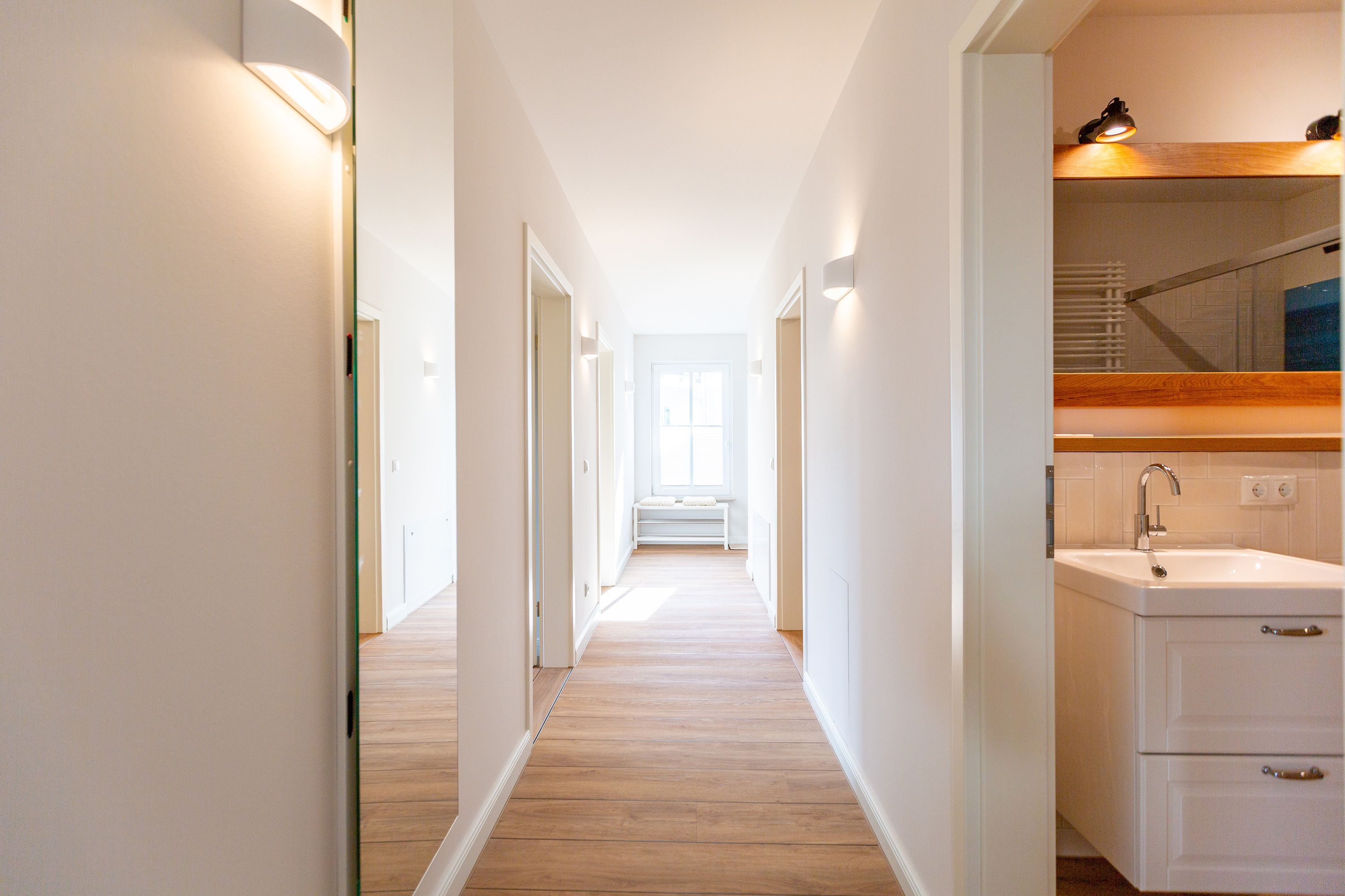 Modernes Design und ein perfekt abgestimmtes Farbkonzept erwarten Sie in diesem Drei-Zimmer-Feriendomizil für bis zu vier Personen im Gartengeschoss. Auf den 84qm begrüßen Sie helle Farbtöne in Kombination mit einem dezenten maritimen Look. Der offen gestaltete Wohn-Ess-Bereich besticht durch seine gemütliche Atmosphäre und seine Großzügigkeit. In der voll ausgestatteten Küche mit hochwertigen Siemens-Geräten ist für jeden Komfort beim Zubereiten Ihrer Speisen gesorgt. Eine Granit-Arbeitsplatte sorgt zudem für einfaches Sauberhalten und einen edlen Look. Genießen Sie gemeinsame Fernsehabende vor dem Flat-TV mit Soundsystem und hören Sie dem Knistern des dreiseitigen Gaskamins zu, der vom Wohn- und Essbereich aus für eine wohlige Stimmung sorgt. Den perfekten Start in den Tag können Sie sich auf der 25qm großen Nord-Terrasse gönnen, während Sie den ersten Morgenkaffee genießen. In komfortablen Boxspringbetten (1,80m x 2,00m) lässt es sich am besten von Ihren Urlaubserlebnissen träumen. Und bei richtiger Windrichtung und Wellengang können Sie sich sogar das Meeresrauschen über die Terrassentüren in Ihr Appartement holen. Zwei barrierefreie Regenduschen, beheizte Spiegel und eine Saunalandschaft im Masterbad sorgen für ein erholsames Spa-Erlebnis. Kostenfreies W-Lan und ein Stellplatz in der hauseigenen Tiefgarage runden Ihren perfekten Urlaub auf der Insel Usedom ab.