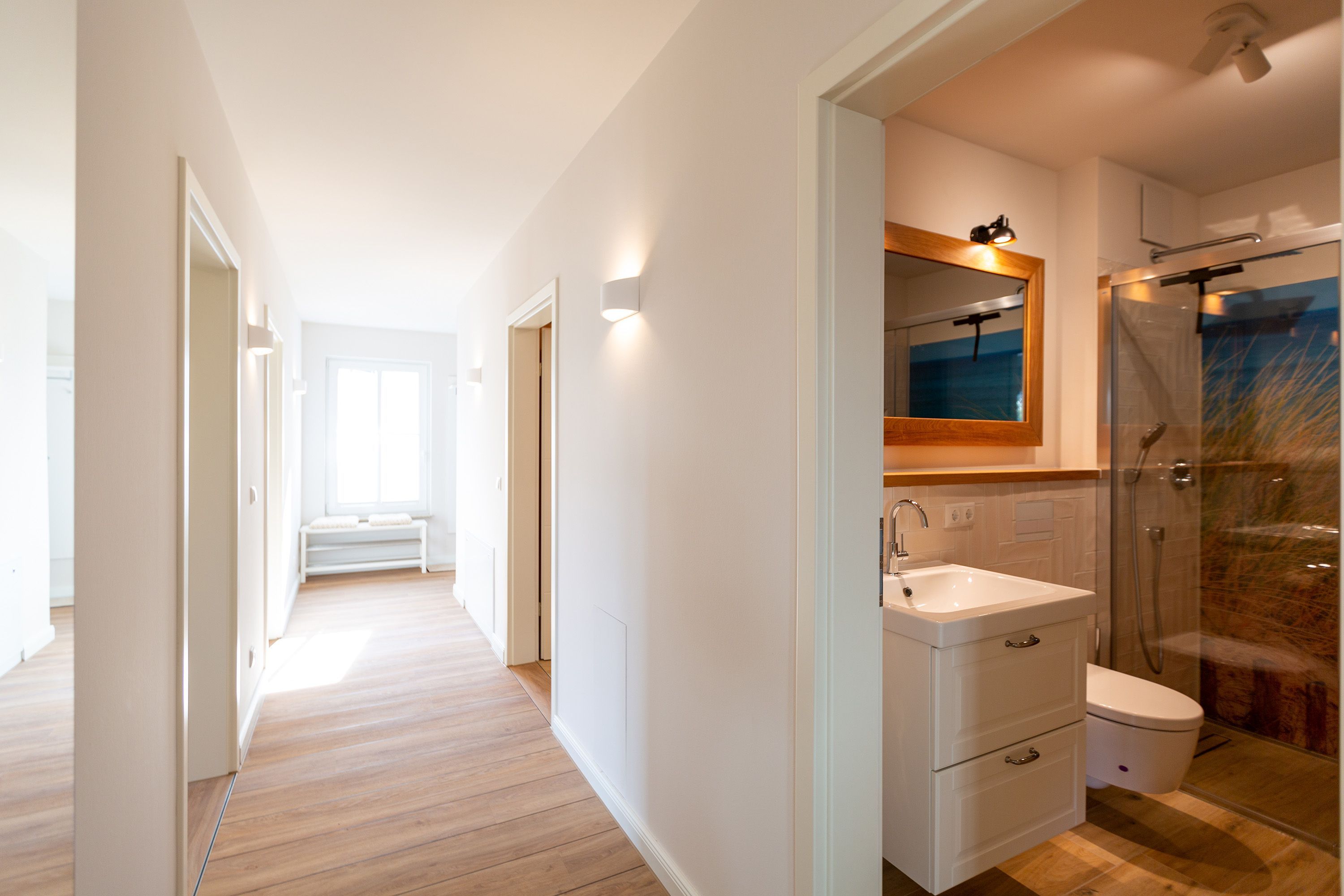 In diesen 2021 errichteten Häusern trifft Helligkeit auf Moderne und bietet Ihnen in seinen stilvoll eingerichteten Zwei- bis Drei-Zimmer Appartements Komfort auf höchster Ebene. Die offen gestalteten Wohn-Ess-Bereiche überzeugen durch ein stylisches Ambiente und ihr großzügiges Raumkonzept. Die teilweise mit Kochinseln ausgestatteten Küchen integrieren sich perfekt in den ebenso schlichten wie modernen Wohnraum. Alle Appartements verfügen über zwei Bäder oder ein Bad und ein zusätzliches Gäste-WC. Um Ihre Auszeit am Meer zusätzlich zu verschönern, wurden alle Appartements mit Gaskamin und Finnischer Sauna ausgestattet. Genießen Sie von den großzügigen Balkonen und Terrassen den Ausblick auf die parkähnliche Grünanlage oder verbringen Sie Ihren Abend auf dem frei zur Verfügung stehenden Grillplatz mit Sitzecke und Grill. Ein kostenloser PKW-Stellplatz in der Tiefgarage (Einfahrtshöhe 1,95m, Anfahrt über die Straße ‚Kieferngrund‘ Höhe Hausnummer 17) gehört ebenso zum Komfort dieser Appartement-Häuser wie kostenfreies W-Lan. Für E-Autos steht am Objekt eine E-Ladesäule mit 2 Ladeplätzen (gesamt 22 kW) auf dem Grundstück kostenpflichtig zur Verfügung. Eine Waschmaschine und ein Trockner können Sie gegen Gebühr über die kostenlose App WeWash nutzen.