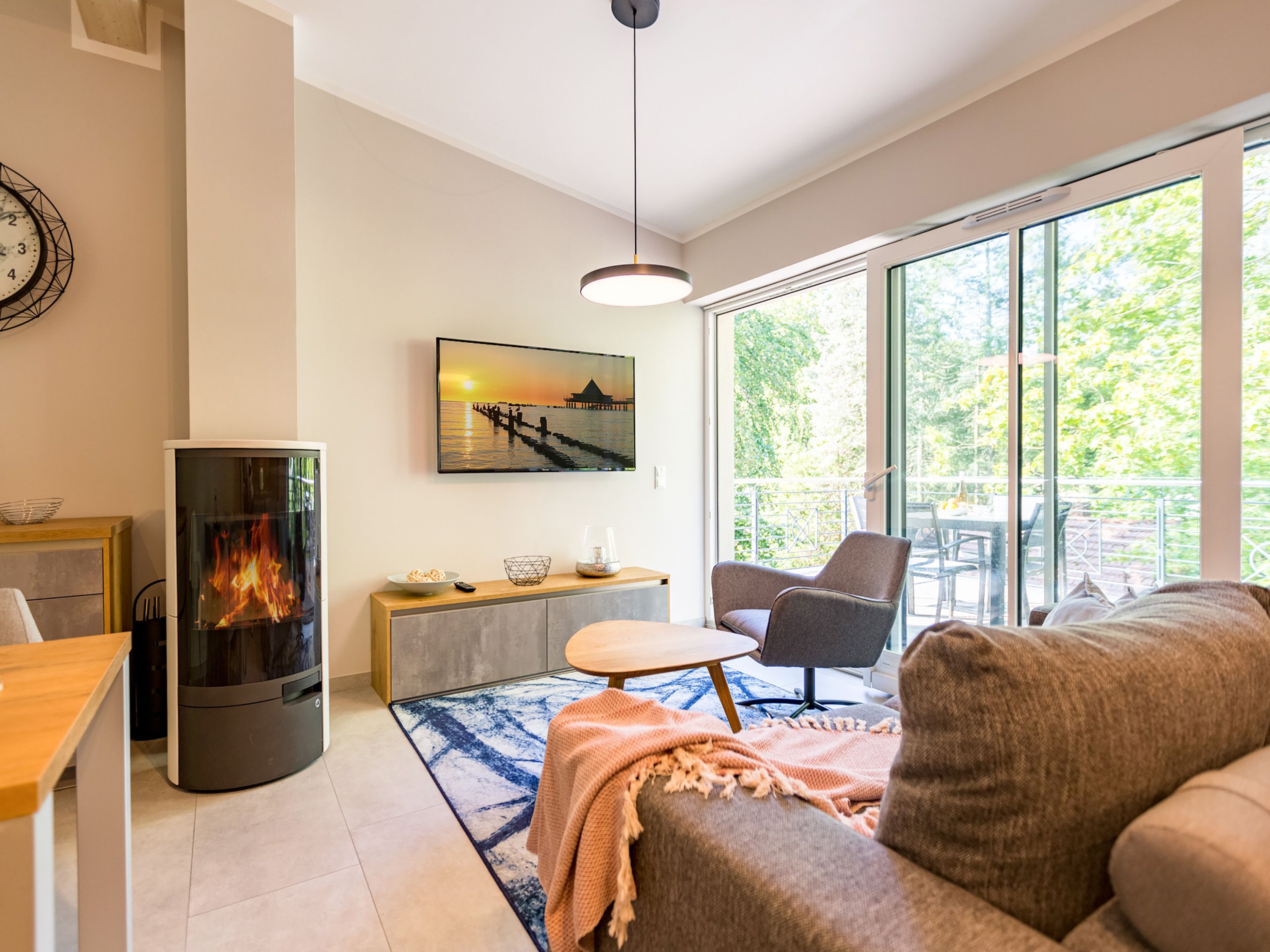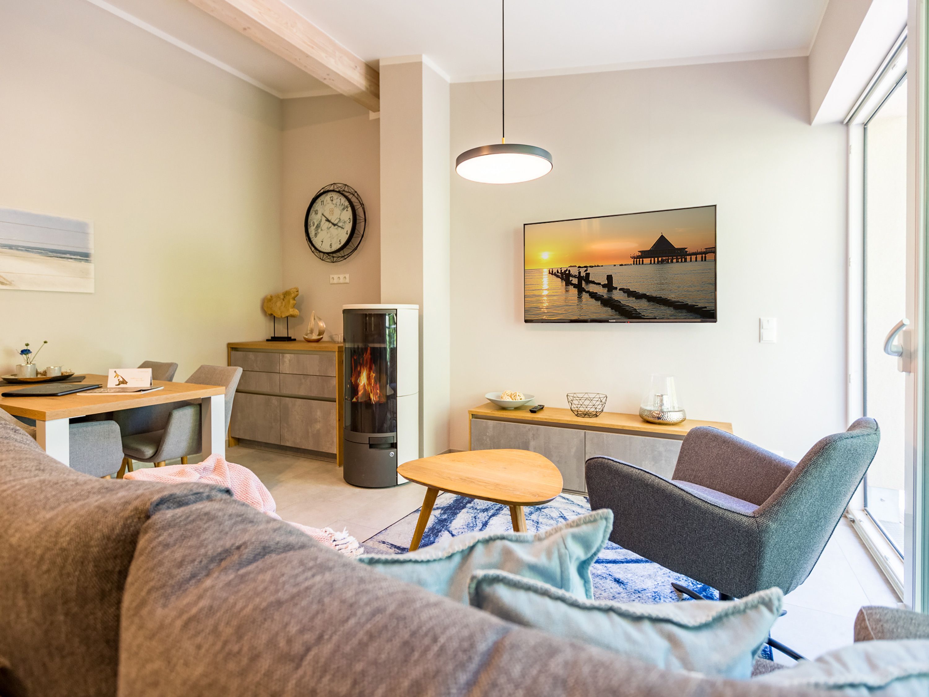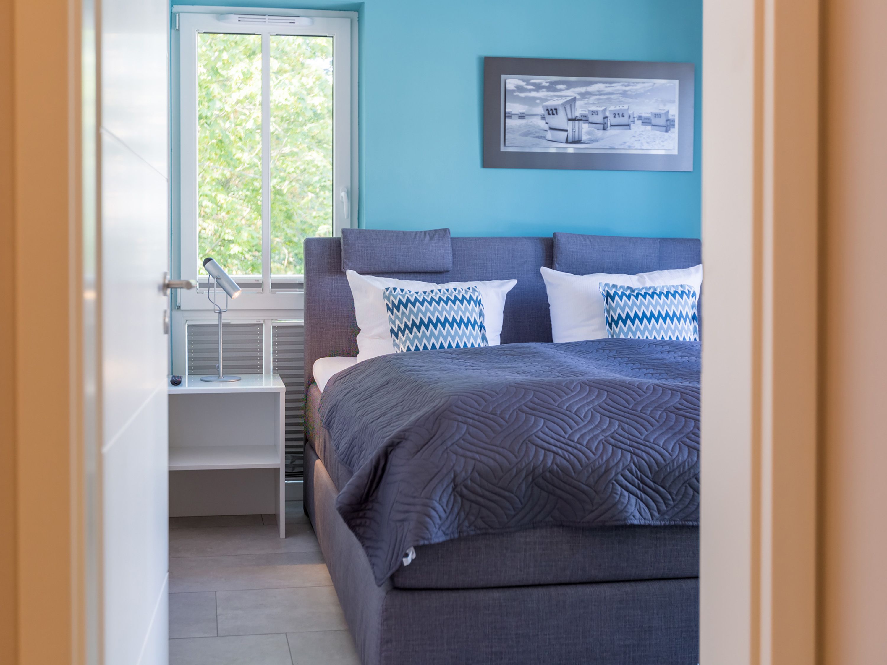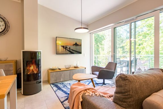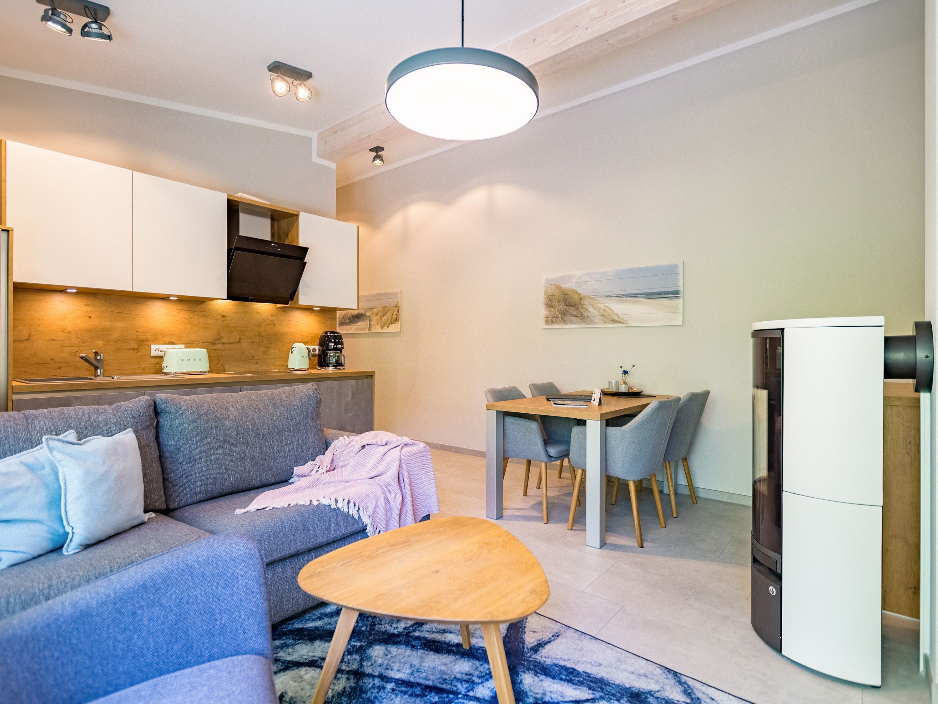Ideal für Familien macht das 74 Quadratmeter große Appartement direkt unter dem Dach die gemeinsame Auszeit an der Ostsee zu einem unvergesslichen Urlaubserlebnis. Bis zu drei Erwachsenen und einem Kind bis 15 Jahre bietet es ausreichend Platz, den Stress und die Hektik des Alltags einfach mal loszulassen und sich fallenzulassen ins süße Nichtstun in einer angenehmen und entspannenden Atmosphäre. Die drei Räume sind stilvoll und stylisch modern eingerichtet. Es ist alles zu finden, was man sich für einen Urlaub nur wünscht. Inklusive großer Sonnenterrasse. Die ist mit ihren 58 Quadratmetern und der Ausrichtung nach Süd-Ost und Süd-West ein absoluter Traum für Sonnenanbeter. Das Wohn-Esszimmer ist geräumig und strahlt durch den hohen offenen Dachstuhl eine luftig leichte Atmosphäre aus. Ob Kaminofen, Flat-TV, gemütliches Schlafsofa oder bequemer Sessel Wohnkomfort der Extra-Klasse erwartet Sie. Zum Wohnzimmer gehören eine offene Küche und ein schöner Essplatz, an dem die ganze Familie Platz findet. Die Küche ist zudem mit hochwertigen Geräten wie einem Induktionsherd oder einer Geschirrspülmaschine und edlem Geschirr voll ausgestattet. Zwei Schlafzimmer wollen erholungshungrige Auszeitler mit schönen Träumen verwöhnen. Ein Schlafzimmer beherbergt ein komfortables Boxspringdoppelbett (1,80 m x 2,00 m), einen Flat-TV und einen großen Schrank für die Urlaubsgarderobe. Das zweite Schlafzimmer verfügt über ein Hochbett (1x 0,90m x 1,90m sowie 1x 0,90m 2,00m), hat ebenfalls einen Flat-TV und einen Schrank und ist mit einem kleinen Schreibtisch eingerichtet. Da schreiben sich die Urlaubsgrüße gleich noch einmal so schön. Das Tageslichtbad hat eine geräumige Regendusche, einen Waschtisch, ein WC und einen Wasch-Trockner. An kühlen Tagen und Abenden wird dieser Raum garantiert Ihr Lieblingsraum werden. Denn er besitzt eine eigene, kleine Finnische Sauna. Das verspricht kuschelige Entspannung. Das Appartement verfügt außerdem über ein separates Gäste-WC. Für einen rundum entspannten Urlaub sind die Betten bei der Ankunft bezogen und Handtücher liegen für Sie bereit. In der Tiefgarage ist ein Stellplatz reserviert.