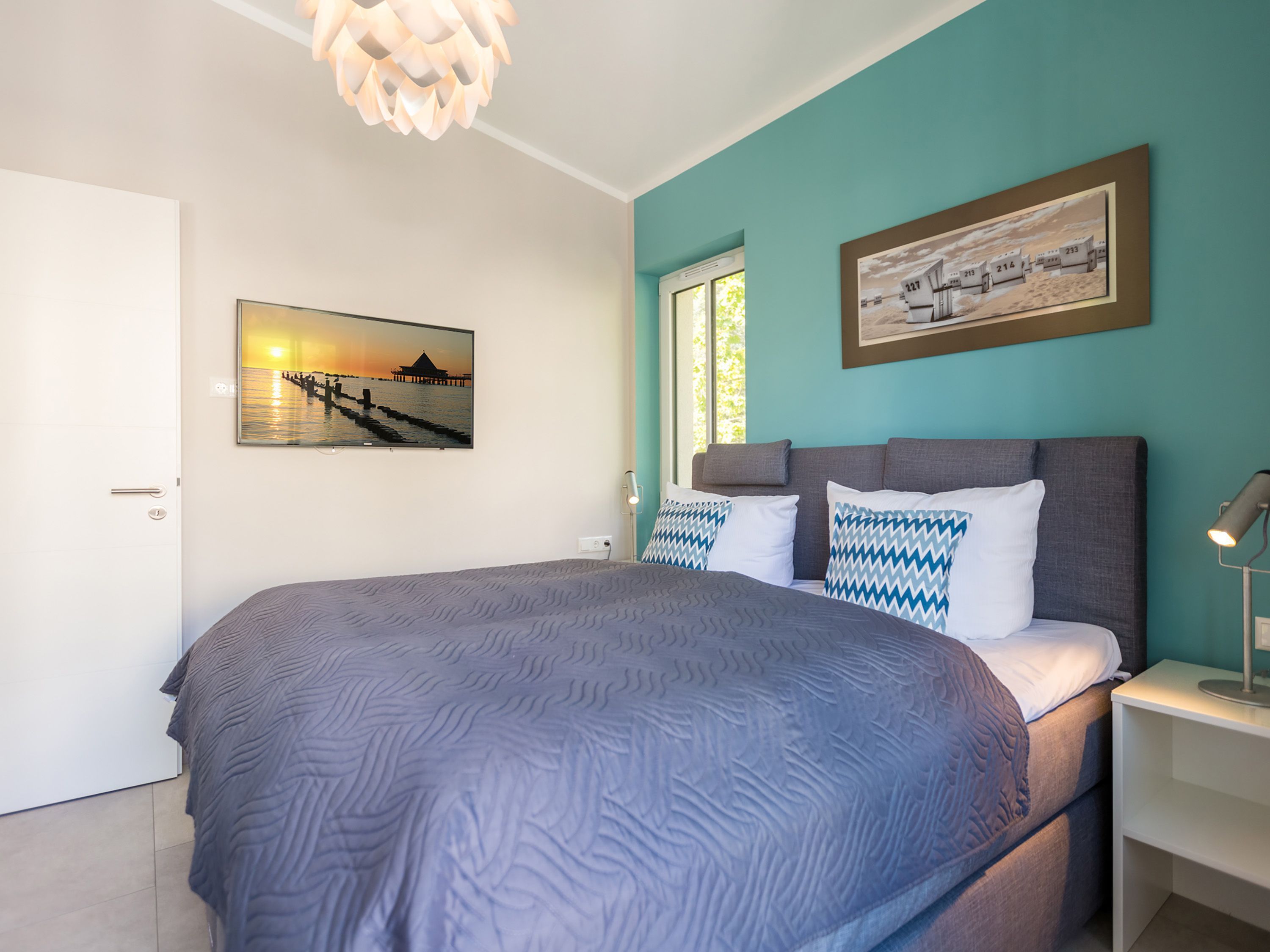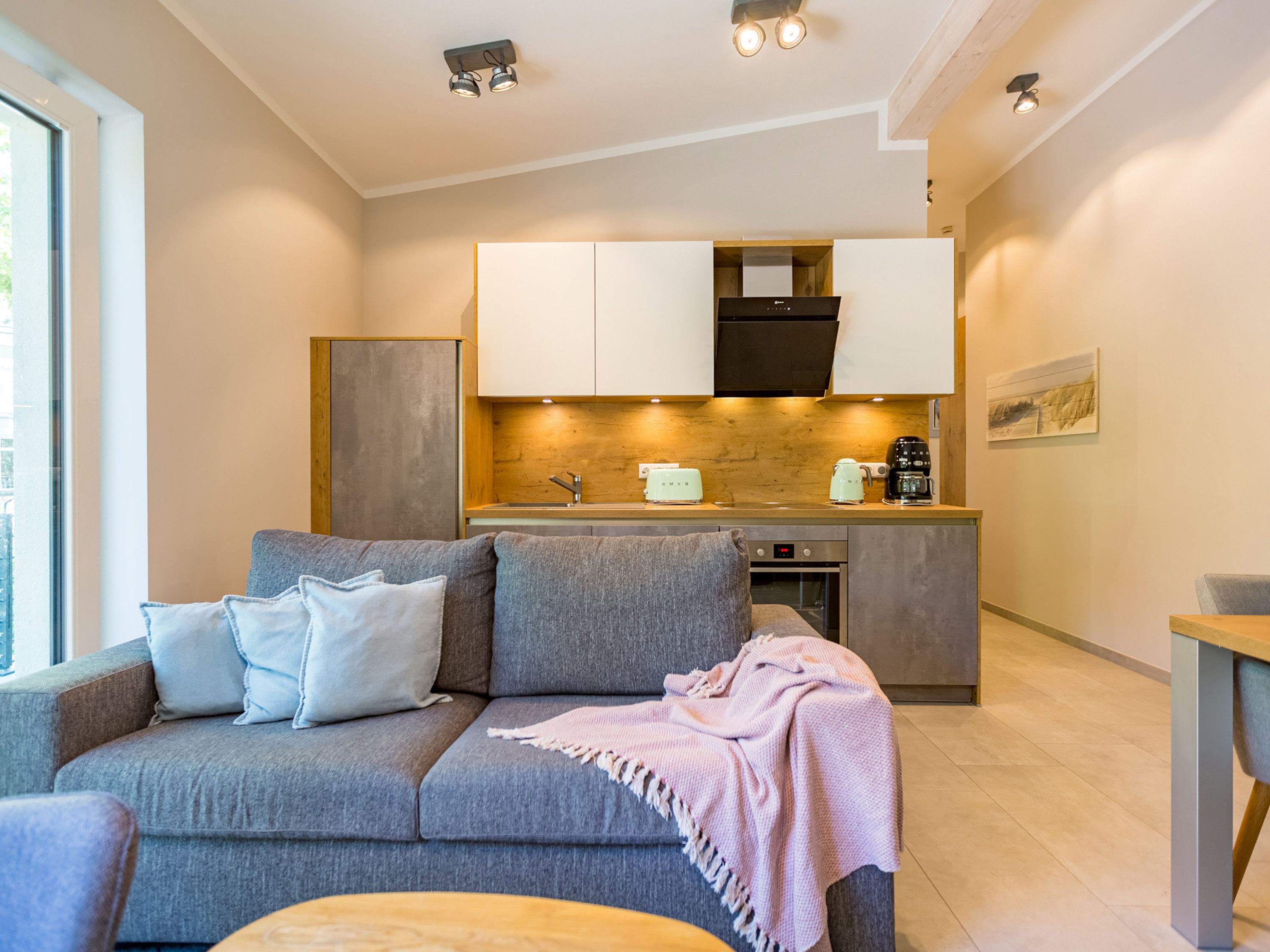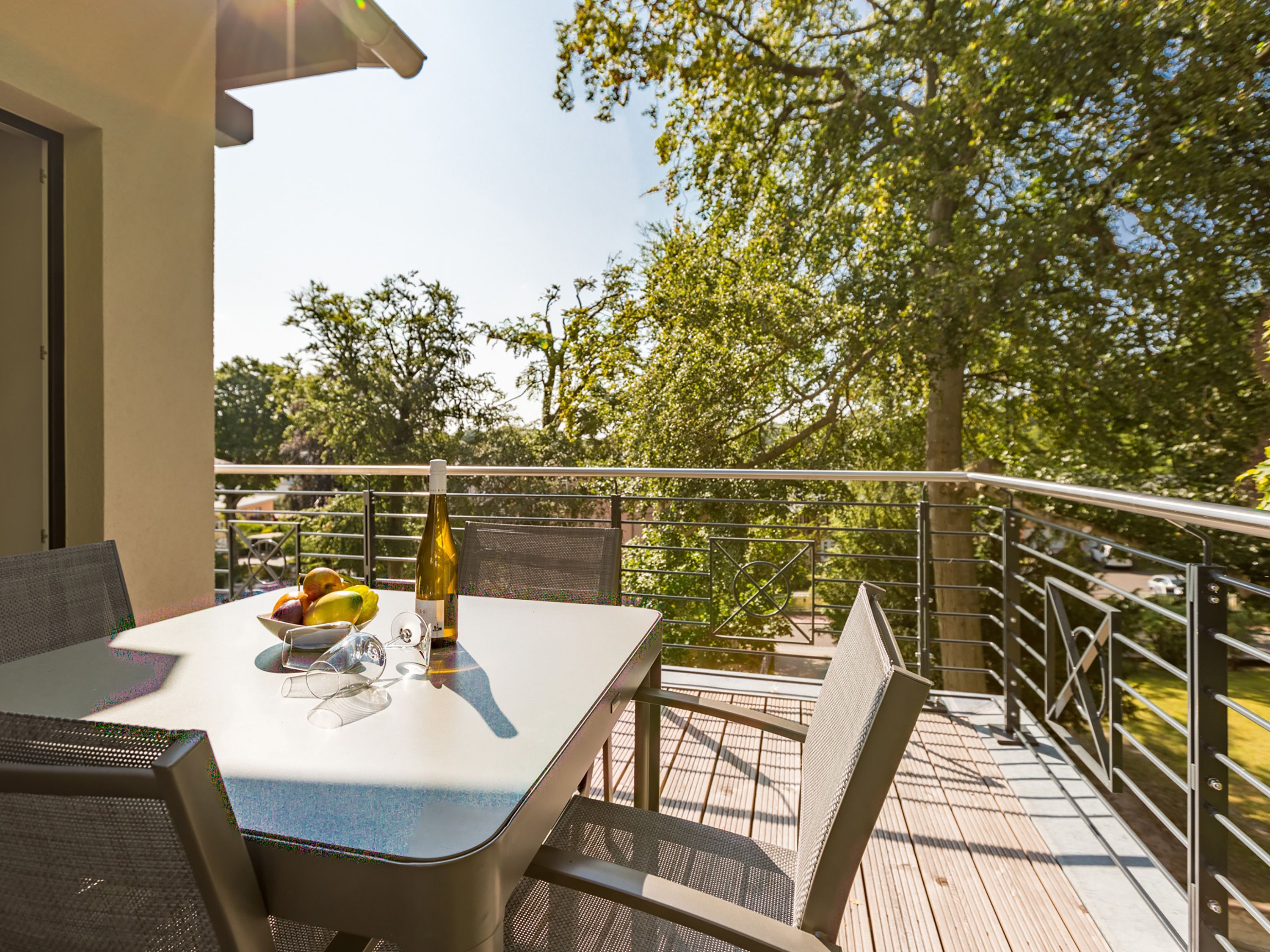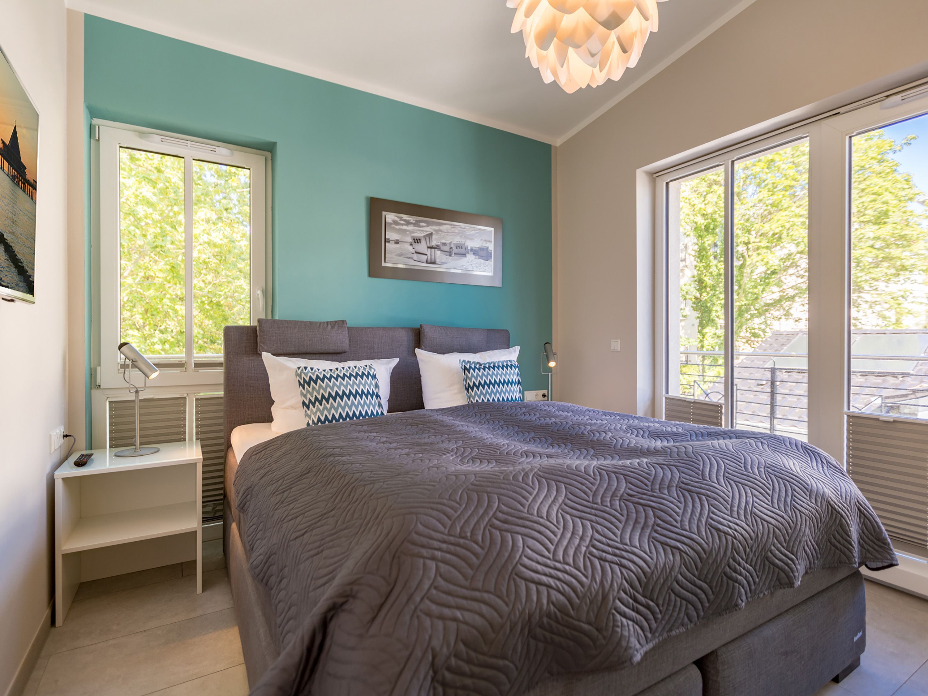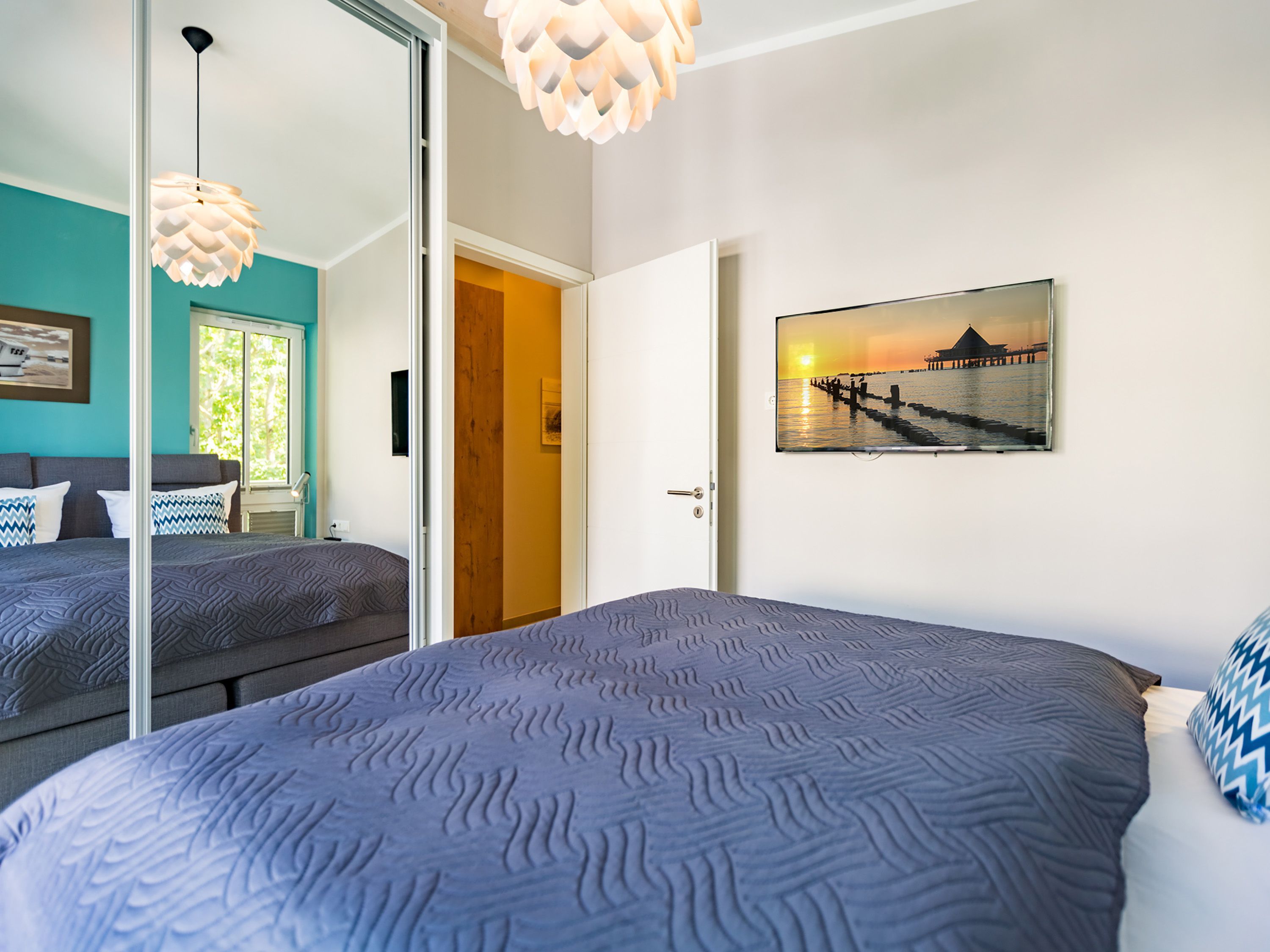 Ideal für Familien macht das 74 Quadratmeter große Appartement direkt unter dem Dach die gemeinsame Auszeit an der Ostsee zu einem unvergesslichen Urlaubserlebnis. Bis zu drei Erwachsenen und einem Kind bis 15 Jahre bietet es ausreichend Platz, den Stress und die Hektik des Alltags einfach mal loszulassen und sich fallenzulassen ins süße Nichtstun in einer angenehmen und entspannenden Atmosphäre. Die drei Räume sind stilvoll und stylisch modern eingerichtet. Es ist alles zu finden, was man sich für einen Urlaub nur wünscht. Inklusive großer Sonnenterrasse. Die ist mit ihren 58 Quadratmetern und der Ausrichtung nach Süd-Ost und Süd-West ein absoluter Traum für Sonnenanbeter. Das Wohn-Esszimmer ist geräumig und strahlt durch den hohen offenen Dachstuhl eine luftig leichte Atmosphäre aus. Ob Kaminofen, Flat-TV, gemütliches Schlafsofa oder bequemer Sessel Wohnkomfort der Extra-Klasse erwartet Sie. Zum Wohnzimmer gehören eine offene Küche und ein schöner Essplatz, an dem die ganze Familie Platz findet. Die Küche ist zudem mit hochwertigen Geräten wie einem Induktionsherd oder einer Geschirrspülmaschine und edlem Geschirr voll ausgestattet. Zwei Schlafzimmer wollen erholungshungrige Auszeitler mit schönen Träumen verwöhnen. Ein Schlafzimmer beherbergt ein komfortables Boxspringdoppelbett (1,80 m x 2,00 m), einen Flat-TV und einen großen Schrank für die Urlaubsgarderobe. Das zweite Schlafzimmer verfügt über ein Hochbett (1x 0,90m x 1,90m sowie 1x 0,90m 2,00m), hat ebenfalls einen Flat-TV und einen Schrank und ist mit einem kleinen Schreibtisch eingerichtet. Da schreiben sich die Urlaubsgrüße gleich noch einmal so schön. Das Tageslichtbad hat eine geräumige Regendusche, einen Waschtisch, ein WC und einen Wasch-Trockner. An kühlen Tagen und Abenden wird dieser Raum garantiert Ihr Lieblingsraum werden. Denn er besitzt eine eigene, kleine Finnische Sauna. Das verspricht kuschelige Entspannung. Das Appartement verfügt außerdem über ein separates Gäste-WC. Für einen rundum entspannten Urlaub sind die Betten bei der Ankunft bezogen und Handtücher liegen für Sie bereit. In der Tiefgarage ist ein Stellplatz reserviert.