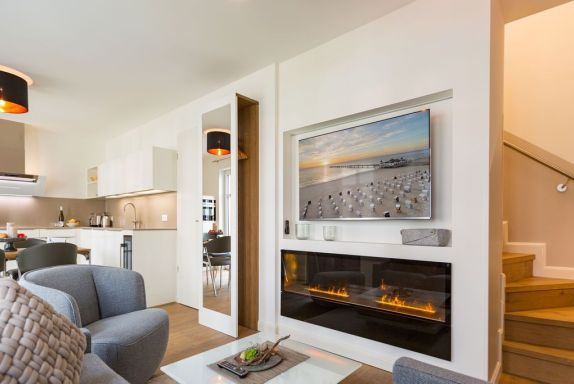 in dieses wunderschöne, 66 Quadratmeter große Urlaubsparadies. Das kleine Studio für bis zu vier Personen wartet nur darauf, auf seinen zwei Etagen Ihre Urlaubsträume wahr werden zu lassen. Über eine Sonnenterrasse mit Gartenmöbeln und großem Sonnenschirm betreten Sie das geräumige und geschmackvoll eingerichtete Wohn-Esszimmer. Eine offene Wohnküche mit allem Schnick und Schnack, hochwertigen Geräten und erlesenem Geschirr schließt sich dem Wohnbereich im Erdgeschoss an. Absolutes Highlight des Wohnzimmers sind nicht die großen, bodentiefen Fenster, die viel Licht einlassen, oder die bequeme Sofalandschaft mit Couch und Sessel, der große Flat-TV oder der großzügige Esstisch. Es ist der riesige Elektro-Kamin, der per Knopfdruck eine romantische Atmosphäre zaubern kann. In den Accessoires wird die Liebe zum Detail sichtbar. Im Erdgeschoss erwartet Entspannungshungrige zudem ein kleiner Wellness-Himmel. Im Badezimmer gibt es neben einer Dusche und einem WC eine Finnische Sauna. Schietwetter-Tage? In diesem Appartement werden solche Tage zu den wahren Erholungstagen. Über eine Treppe gehts ab in den 1. Stock. Zwei Schlafzimmer und ein Bad mit Dusche und WC sind Rückzugsorte ins Traum- und Kuschelland. Beide Schlafzimmer je nach Geschmack in frischem und in warmem Farbton gehalten verfügen über ein bequemes Boxspringdoppelbett (1,80 m x 2,00 m), einen geräumigen Schrank bzw. eine Kommode mit viel Ablageflächen und einen Flat-TV. In einem Abstellraum befindet sich eine Waschmaschine. Bei Anreise sind die Betten bereits bezogen und Handtücher liegen bereit. Der Tiefgaragenplatz Nummer 11 ist für Ihr Auto reserviert.