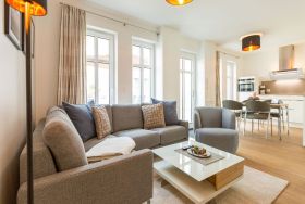 Mitten im Herzen des alten Seebades Ahlbeck wartet das neu gebaute Quartier gegenüber dem alten Kurpark nur darauf ostseehungrigen Auszeitlern mit einem exquisiten und komfortablen Domizil den ersehnten Urlaub zu verschönern. Und das in unmittelbarer Nähe zum Strand, zur Ostseeweite, zum Meeresrauschen. Nur ein paar Schritte entfernt ist das grenzenlose Meeres-Blau. Die berühmte Bäderarchitektur at its best umgibt das schmucke Ferienareal mit seinen 13 Appartements und verleiht dem Viertel mondänen Charme. Denn hier hat schon in den 1920er Jahren die Berliner Oberschicht die Sommerzeit verbracht. Das Quartier am Kurpark bietet mit seinen Zwei- und Drei-Zimmer-Appartements modernen Wohnkomfort in einem stylischen Ambiente. Jedes einzelne ist großzügig konzipiert und hat eine helle und gemütliche Atmosphäre. Die Einrichtungen sind geschmack- und stilvoll. Naturmaterialien und eine hochwertige Ausstattung zeichnen jedes einzelne Ferien-Appartement aus. In die Wohnungen in den Obergeschossen des Haupthauses gelangen Sie bequem mit dem Fahrstuhl. Alle Appartements besitzen Balkone oder Terrassen. Zur Ausstattung gehört zudem bei allen eine vollausgestattete und hochwertige Küche, ein Kamin, eine Sauna, teilweise ein separates WC oder sogar Badezimmer sowie ein Tiefgaragenstellplatz (Tiefgarageneinfahrt/Höhe 2,05 m). Aus den oberen Etagen haben Sie zum Teil Meerblick. Das an das Haupthaus angrenzende Gartenhaus verfügt über großzügig geschnittene Studios, die sich über zwei Etagen erstrecken. Wer nicht einfach nur eine Bleibe sucht, sondern sich im Urlaub mit Schönem umgeben möchte, findet im Quartier am Kurpark ein kleines Paradies auf Zeit.