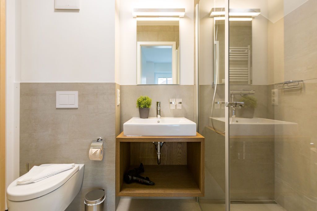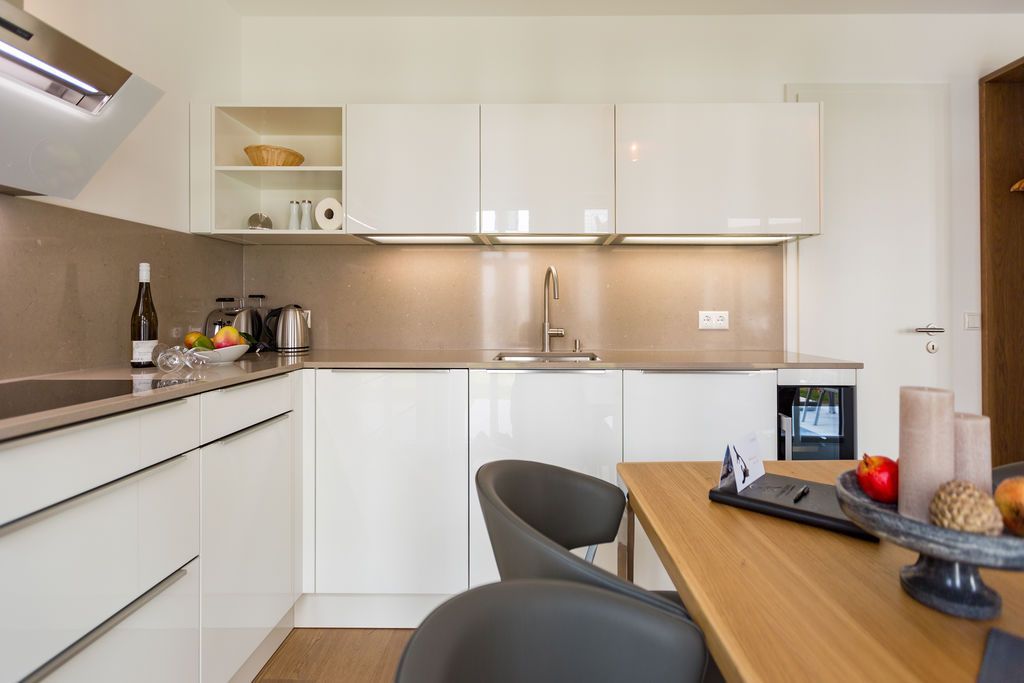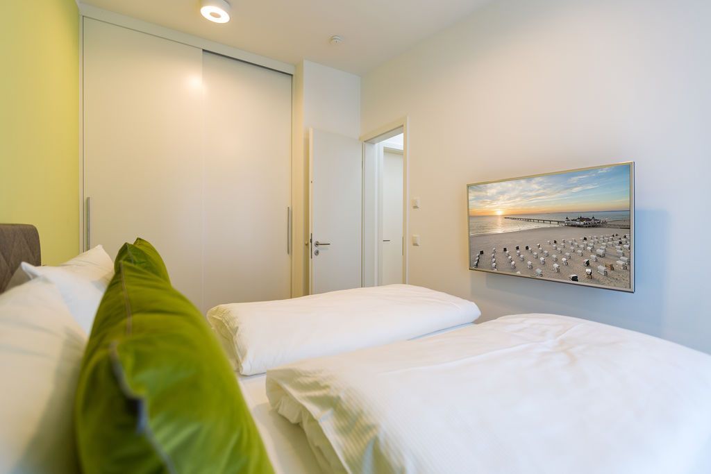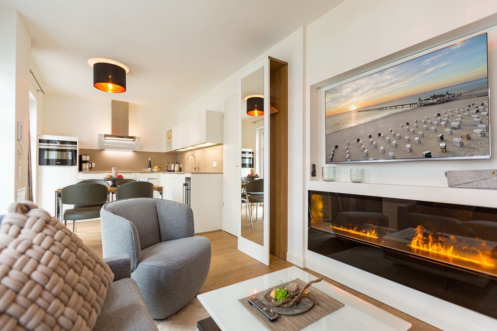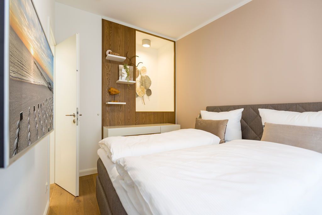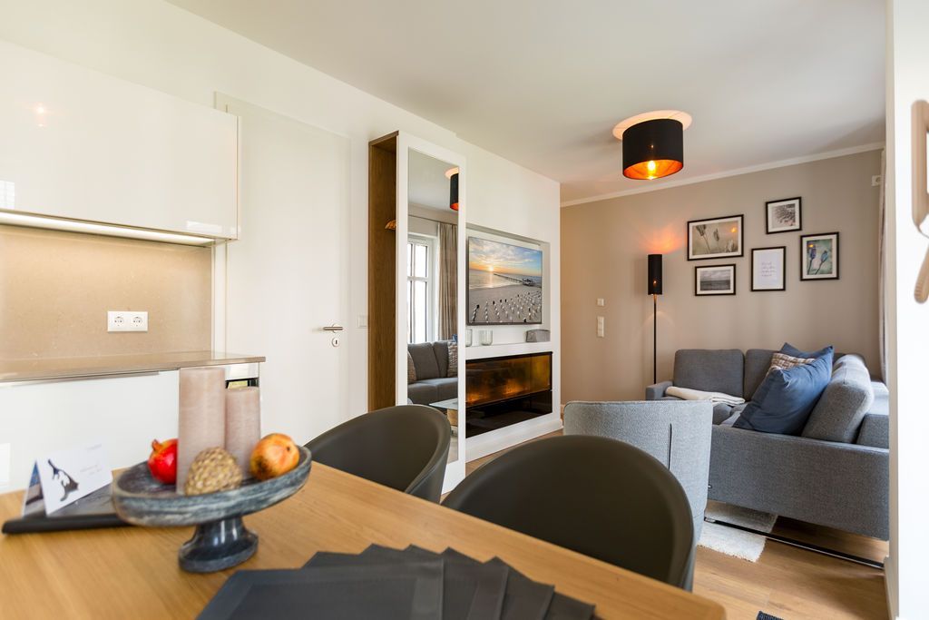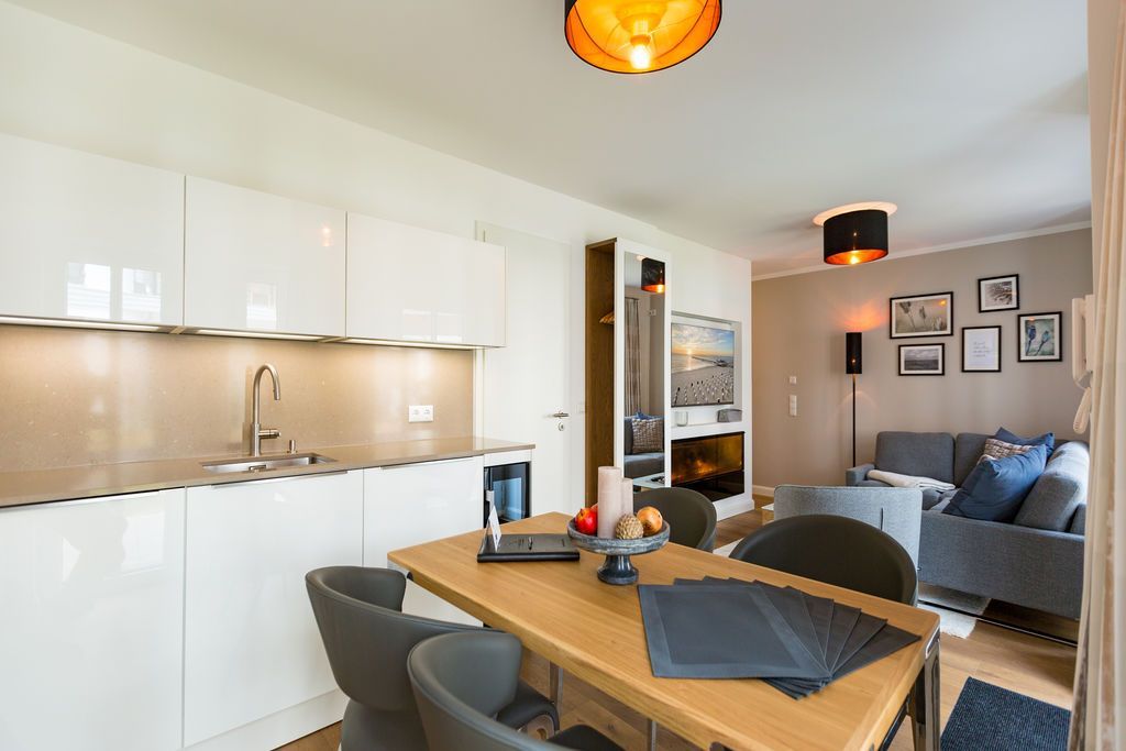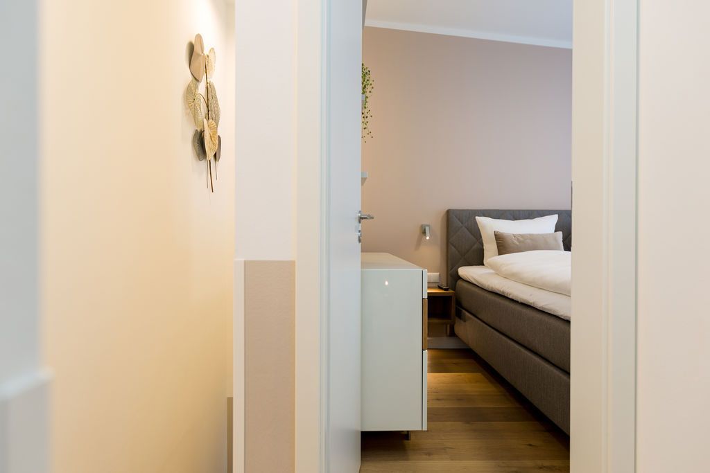 Kommen Sie rein! …in dieses wunderschöne, 66 Quadratmeter große Urlaubsparadies. Das kleine Studio für bis zu vier Personen wartet nur darauf, auf seinen zwei Etagen Ihre Urlaubsträume wahr werden zu lassen. Über eine Sonnenterrasse mit Gartenmöbeln und großem Sonnenschirm betreten Sie das geräumige und geschmackvoll eingerichtete Wohn-Esszimmer. Eine offene Wohnküche mit allem Schnick und Schnack, hochwertigen Geräten und erlesenem Geschirr schließt sich dem Wohnbereich im Erdgeschoss an. Absolutes Highlight des Wohnzimmers sind nicht die großen, bodentiefen Fenster, die viel Licht einlassen, oder die bequeme Sofalandschaft mit Couch und Sessel, der große Flat-TV oder der großzügige Esstisch. Es ist der riesige Elektro-Kamin, der per Knopfdruck eine romantische Atmosphäre zaubern kann. In den Accessoires wird die Liebe zum Detail sichtbar. Im Erdgeschoss erwartet Entspannungshungrige zudem ein kleiner Wellness-Himmel. Im Badezimmer gibt es neben einer Dusche und einem WC eine Finnische Sauna. Schietwetter-Tage? In diesem Appartement werden solche Tage zu den wahren Erholungstagen. Über eine Treppe gehts ab in den 1. Stock. Zwei Schlafzimmer und ein Bad mit Dusche und WC sind Rückzugsorte ins Traum- und Kuschelland. Beide Schlafzimmer je nach Geschmack in frischem und in warmem Farbton gehalten verfügen über ein bequemes Boxspringdoppelbett (1,80 m x 2,00 m), einen geräumigen Schrank bzw. eine Kommode mit viel Ablageflächen und einen Flat-TV. In einem Abstellraum befindet sich eine Waschmaschine. Bei Anreise sind die Betten bereits bezogen und Handtücher liegen bereit. Der Tiefgaragenplatz Nummer 11 ist für Ihr Auto reserviert.