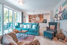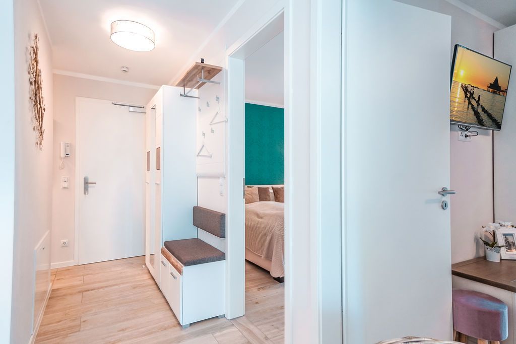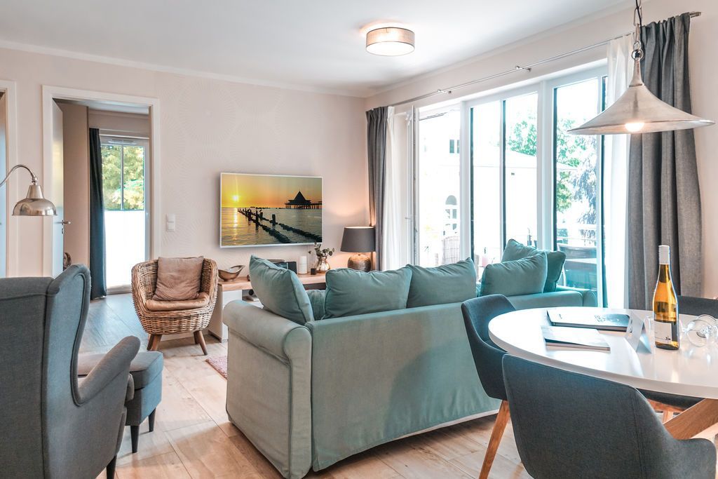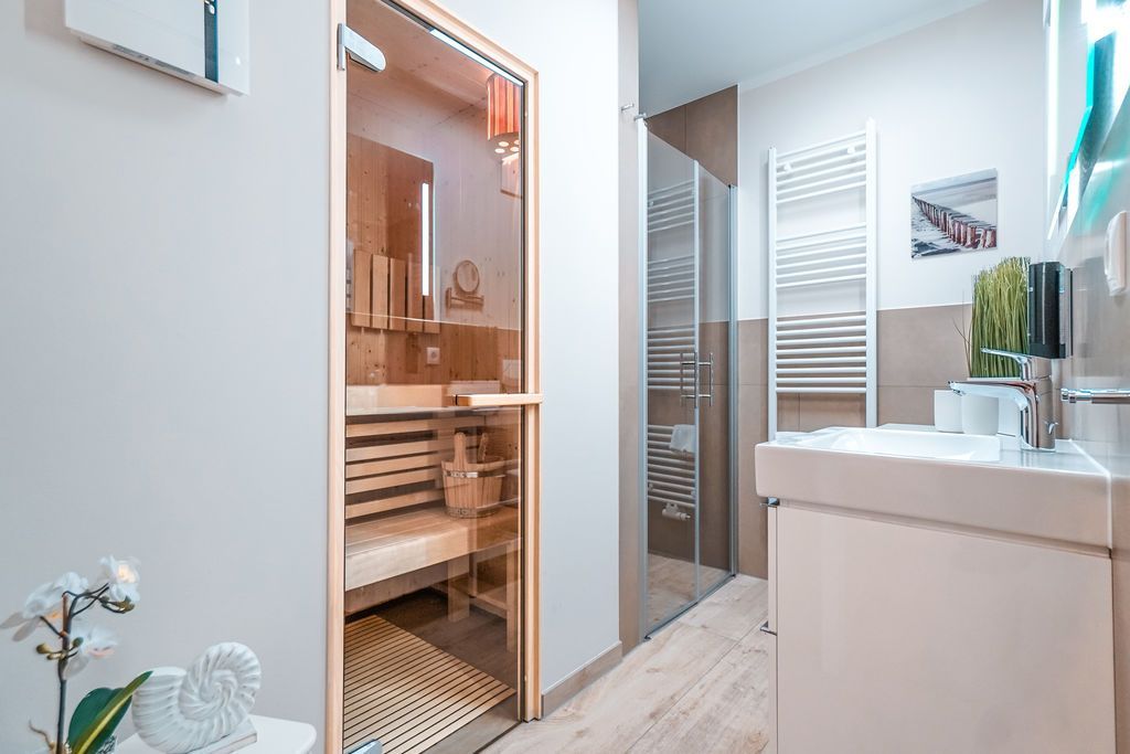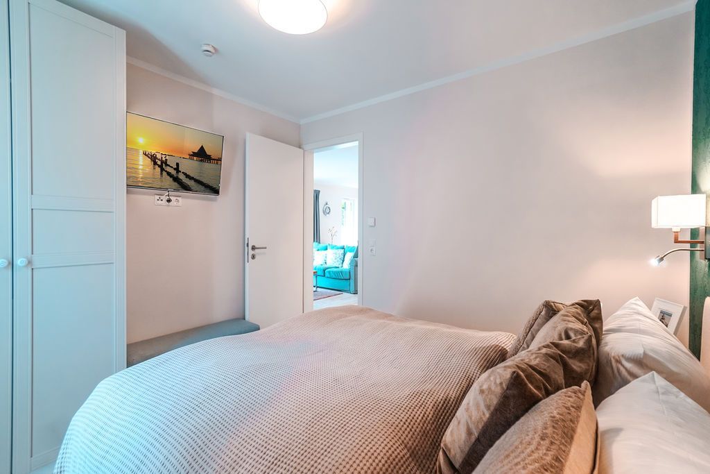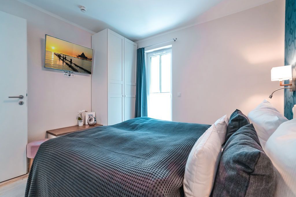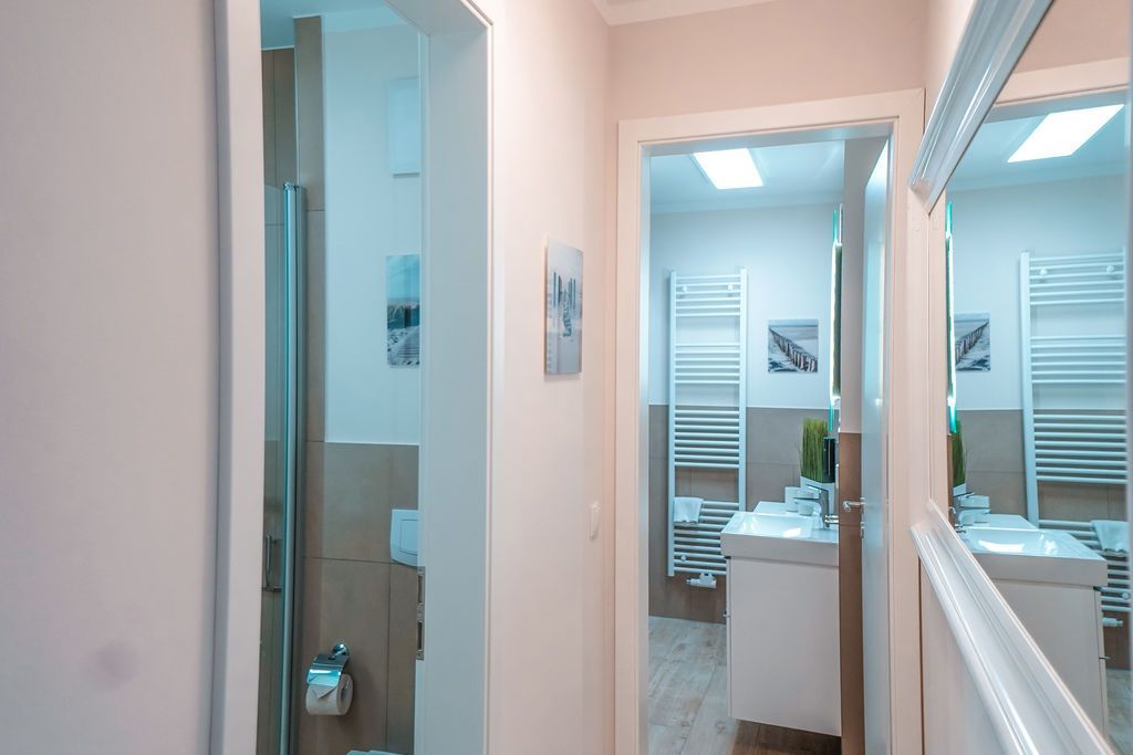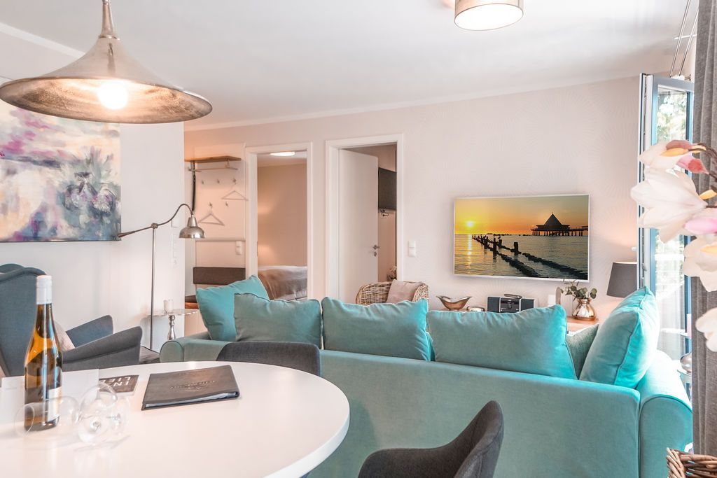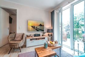 Auf 73 Quadratmetern bietet das Drei-Zimmer-Appartement Nummer 3 im 1. Obergeschoss alles, was man sich für einen entspannten Urlaub an der Ostsee nur wünschen kann. Viel Platz und eine Einrichtung zum Pudelwohlfühlen ein kleines Paradies für bis zu vier Personen wartet auf Sie. Das helle und geräumige Wohn-Esszimmer ist mit viel Geschmack und Zeitgeist eingerichtet. Hier spürt man die Liebe zum Interieur und zum Detail. Nordisches Landhaus-Design durchzieht jeden Raum. Naturmaterialien, ausgesuchte Accessoires und viel Komfort bestimmen die Ausstattung. Ob Sofa, Ohrensessel oder uriger Korbstuhl lassen Sie sich fallen und entspannen Sie einfach mal drauf los. Hier wird es Ihnen sicher leicht fallen. Vom Wohnzimmer gehts auf einen schönen Süd-Balkon. Sonnenhungrige können hier neue Energie tanken. Ob Großer Flat-TV, hochwertige Musikanlage oder Kamin Unterhaltung wird hier zur puren Entspannung. Das offene Wohn-Esszimmer bietet mit seinem großen, runden Tisch und den bequemen Stühlen einen schönen Essplatz für genüssliche und gesellige Stunden. Die offene Küche ist mit allem ausgestattet, das Sie zum Kochen, Braten oder Backen brauchen. Hochwertige Markengeräte sind Ihnen fleißige Küchenhelfer. Vom Backofen, über den Geschirrspüler bis hin zur Kaffeemaschine ist alles da. Zwei Schlafzimmer schenken echtes Schlafvergnügen mit ihren komfortablen Boxspringdoppelbetten (1,80 m x 2,00 m). Ein zweiter Balkon in Ostausrichtung ist von beiden Zimmern aus begehbar. Genießen Sie hier schon morgens die aufgehende Sonne. In jedem Schlafzimmer gibt es einen Flat-TV. Viel Ablagefläche bieten die geräumigen Schränke. Ebenfalls zweifach vorhanden, ist das Badezimmer. Dusche, Waschtisch und WC gehören zur Ausstattung in beiden Räumen. Im Masterbad erwartet Sie darüber hinaus eine Finnische Sauna, in der Sie nach Herzenslust bei kuschelig warmen Temperaturen entspannen können. Handtücher liegen bei Anreise bereit und die Betten sind frisch bezogen. In der Tiefgarage ist für Sie ein Stellplatz reserviert. In dieser Wohnung sind Haustiere nicht erlaubt - jedoch ist diese nicht garantiert allergikerfreundlich.