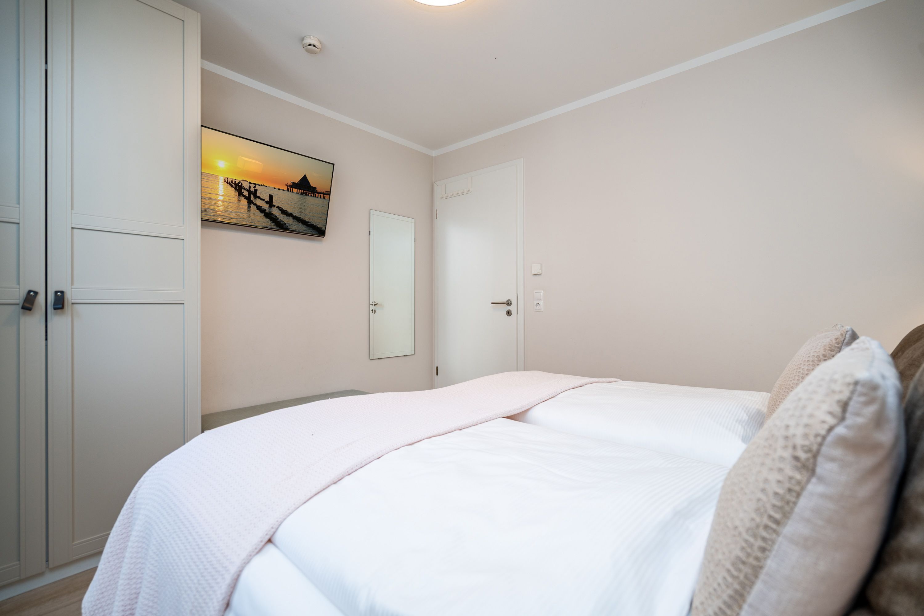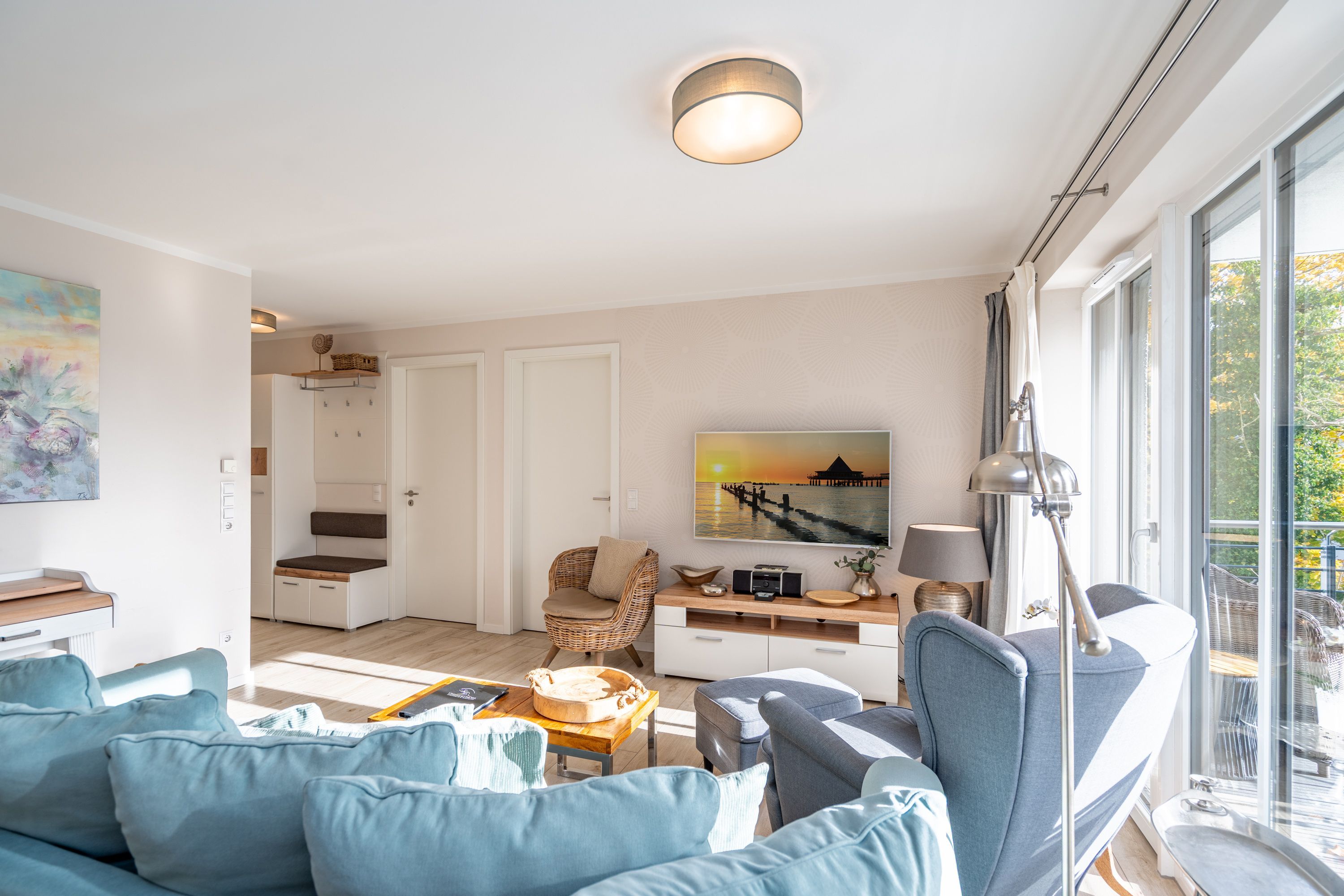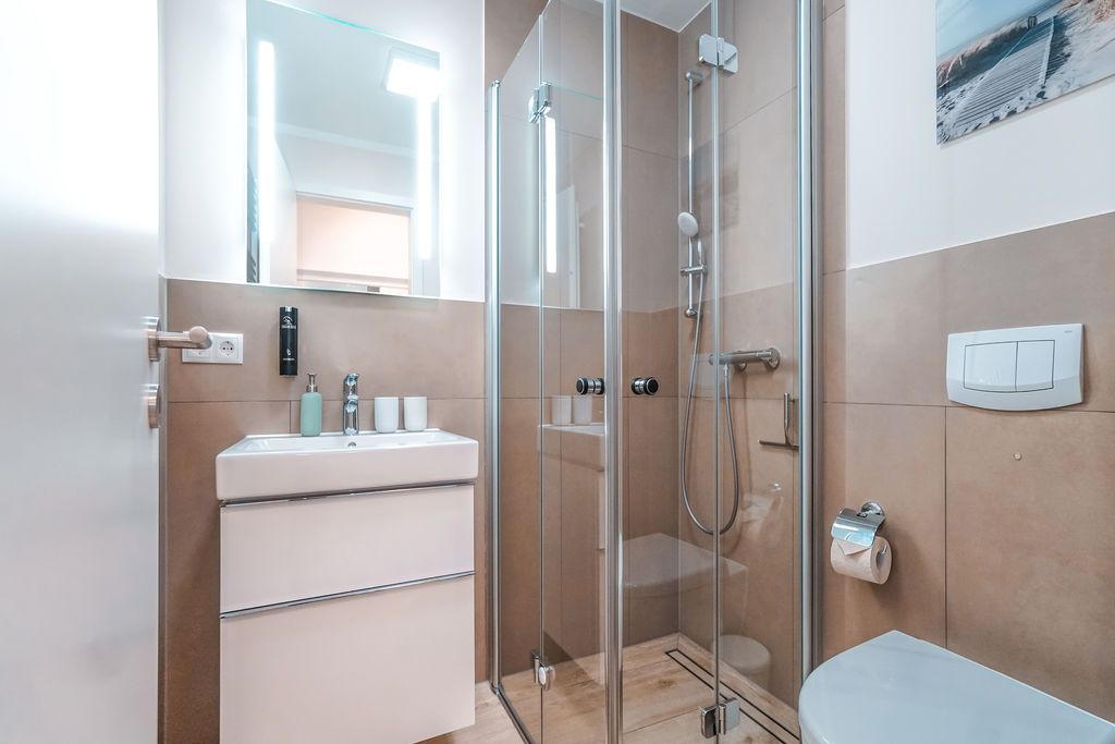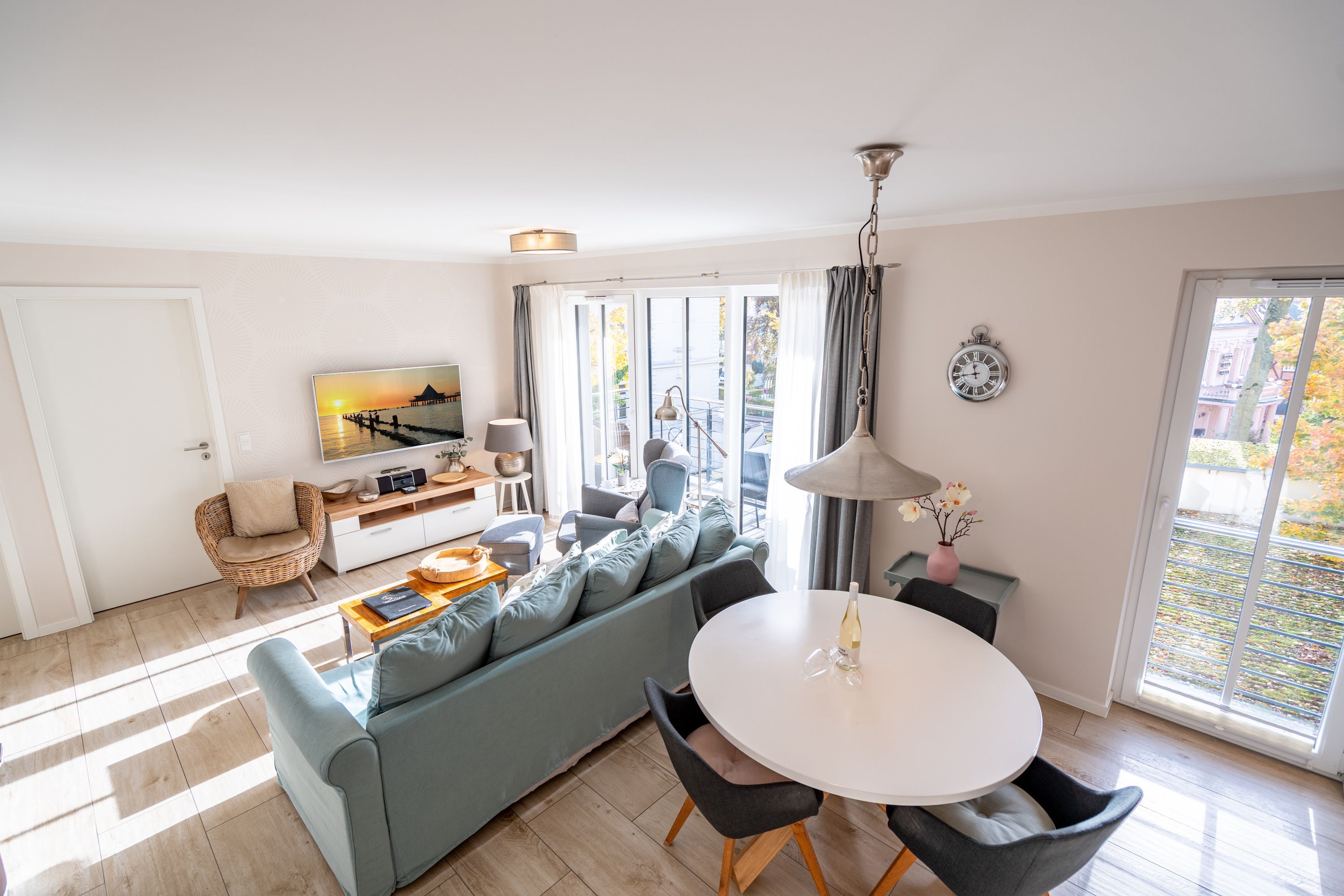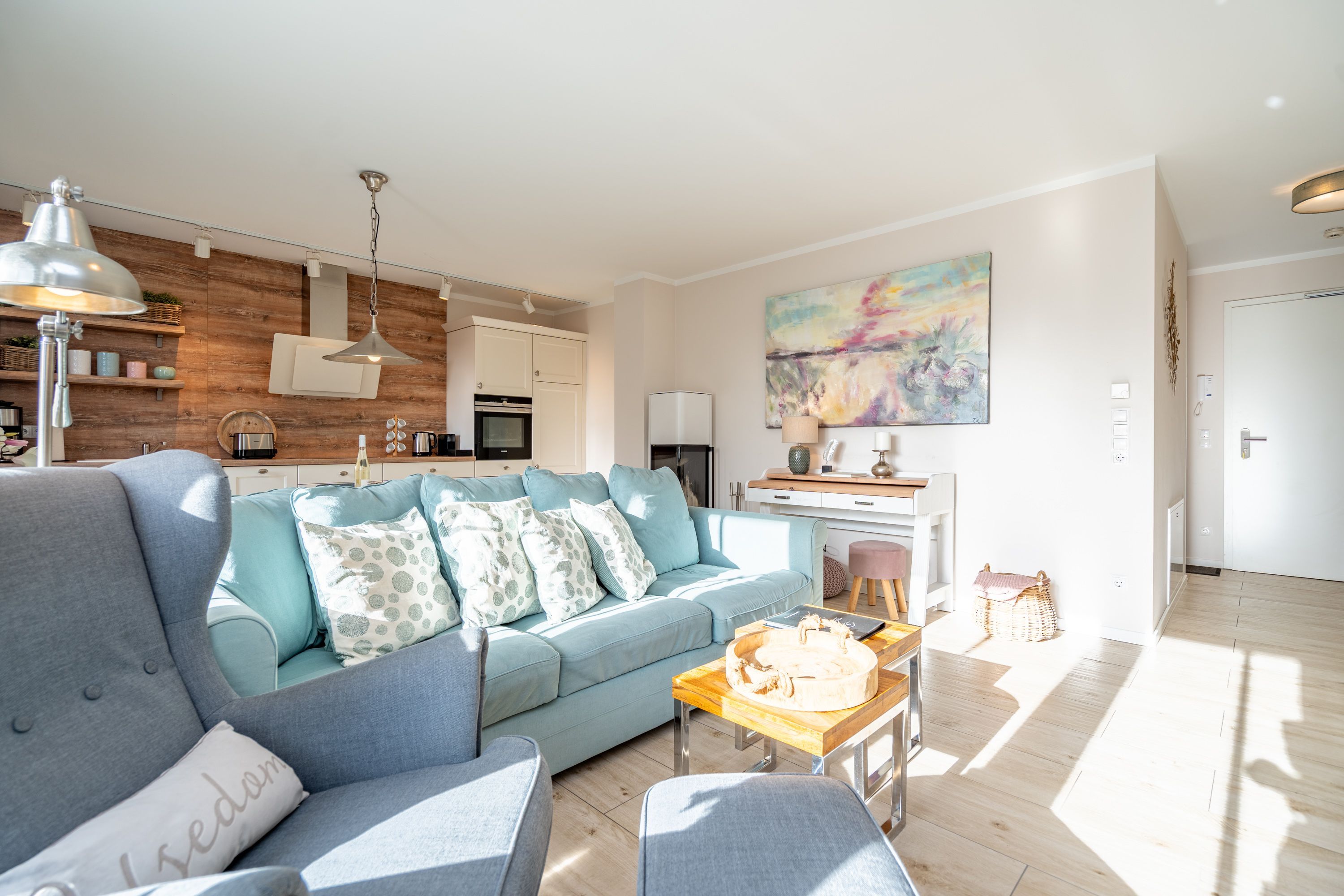 Auf 73 Quadratmetern bietet das Drei-Zimmer-Appartement Nummer 3 im 1. Obergeschoss alles, was man sich für einen entspannten Urlaub an der Ostsee nur wünschen kann. Viel Platz und eine Einrichtung zum Pudelwohlfühlen ein kleines Paradies für bis zu vier Personen wartet auf Sie. Das helle und geräumige Wohn-Esszimmer ist mit viel Geschmack und Zeitgeist eingerichtet. Hier spürt man die Liebe zum Interieur und zum Detail. Nordisches Landhaus-Design durchzieht jeden Raum. Naturmaterialien, ausgesuchte Accessoires und viel Komfort bestimmen die Ausstattung. Ob Sofa, Ohrensessel oder uriger Korbstuhl lassen Sie sich fallen und entspannen Sie einfach mal drauf los. Hier wird es Ihnen sicher leicht fallen. Vom Wohnzimmer gehts auf einen schönen Süd-Balkon. Sonnenhungrige können hier neue Energie tanken. Ob Großer Flat-TV, hochwertige Musikanlage oder Kamin Unterhaltung wird hier zur puren Entspannung. Das offene Wohn-Esszimmer bietet mit seinem großen, runden Tisch und den bequemen Stühlen einen schönen Essplatz für genüssliche und gesellige Stunden. Die offene Küche ist mit allem ausgestattet, das Sie zum Kochen, Braten oder Backen brauchen. Hochwertige Markengeräte sind Ihnen fleißige Küchenhelfer. Vom Backofen, über den Geschirrspüler bis hin zur Kaffeemaschine ist alles da. Zwei Schlafzimmer schenken echtes Schlafvergnügen mit ihren komfortablen Boxspringdoppelbetten (1,80 m x 2,00 m). Ein zweiter Balkon in Ostausrichtung ist von beiden Zimmern aus begehbar. Genießen Sie hier schon morgens die aufgehende Sonne. In jedem Schlafzimmer gibt es einen Flat-TV. Viel Ablagefläche bieten die geräumigen Schränke. Ebenfalls zweifach vorhanden, ist das Badezimmer. Dusche, Waschtisch und WC gehören zur Ausstattung in beiden Räumen. Im Masterbad erwartet Sie darüber hinaus eine Finnische Sauna, in der Sie nach Herzenslust bei kuschelig warmen Temperaturen entspannen können. Handtücher liegen bei Anreise bereit und die Betten sind frisch bezogen. In der Tiefgarage ist für Sie ein Stellplatz reserviert. In dieser Wohnung sind Haustiere nicht erlaubt - jedoch ist diese nicht garantiert allergikerfreundlich.