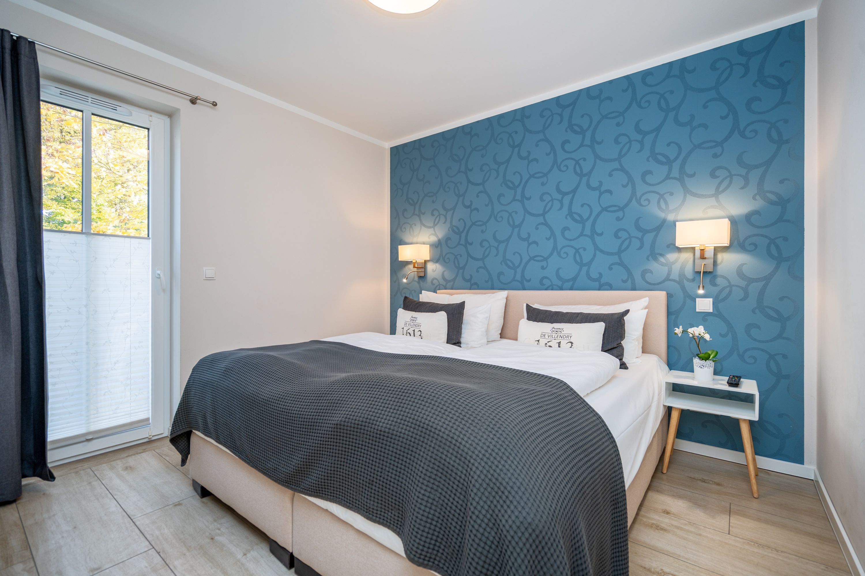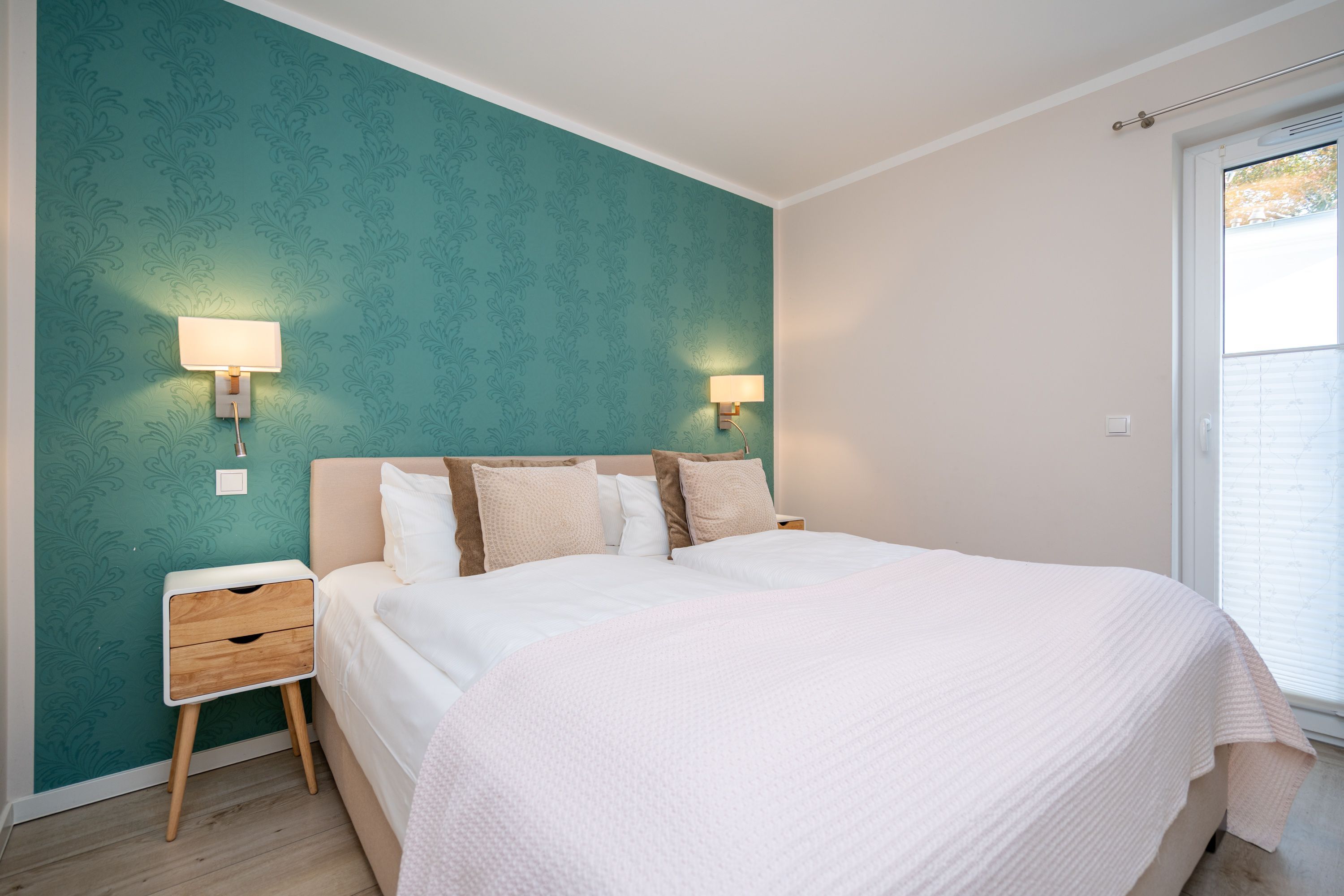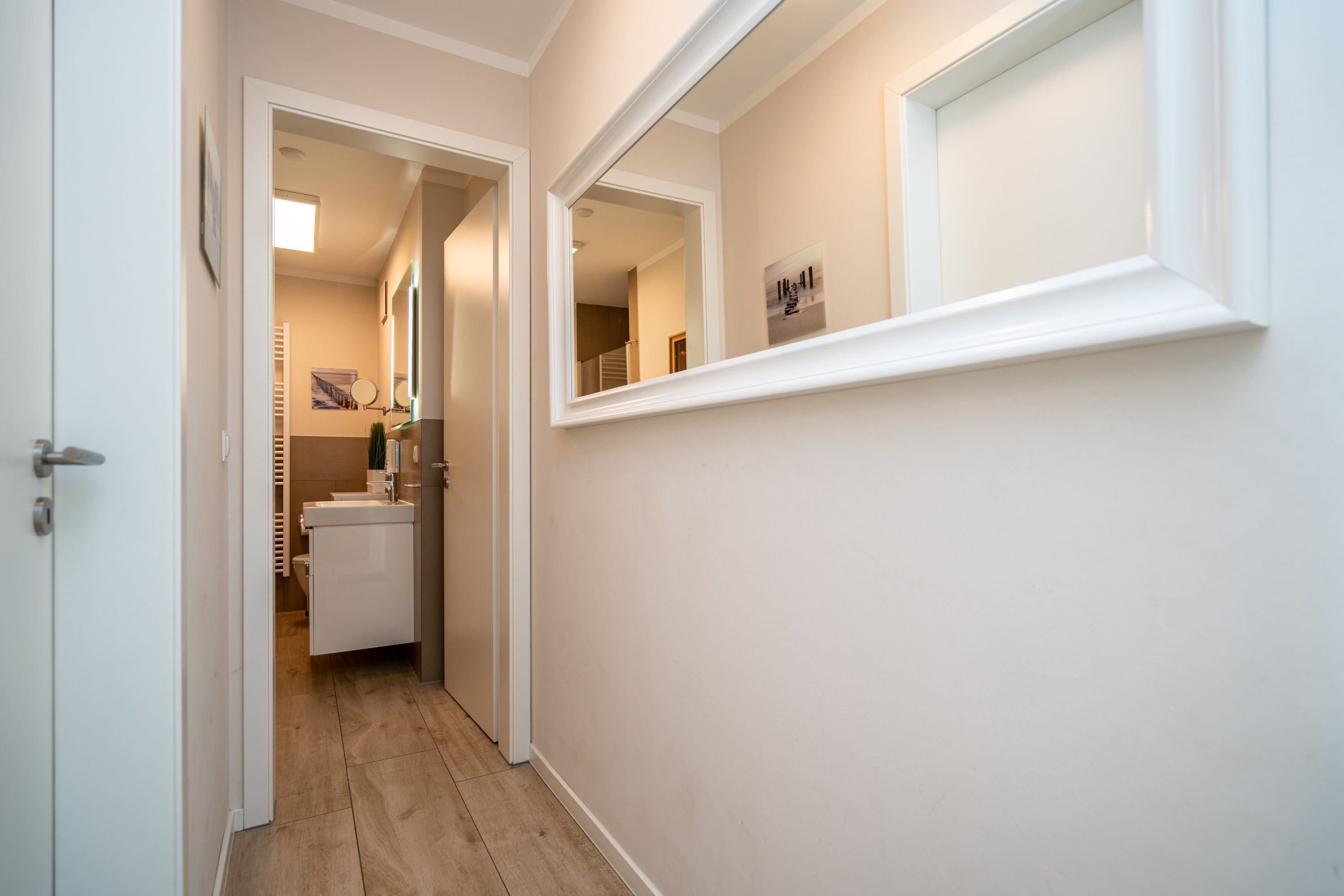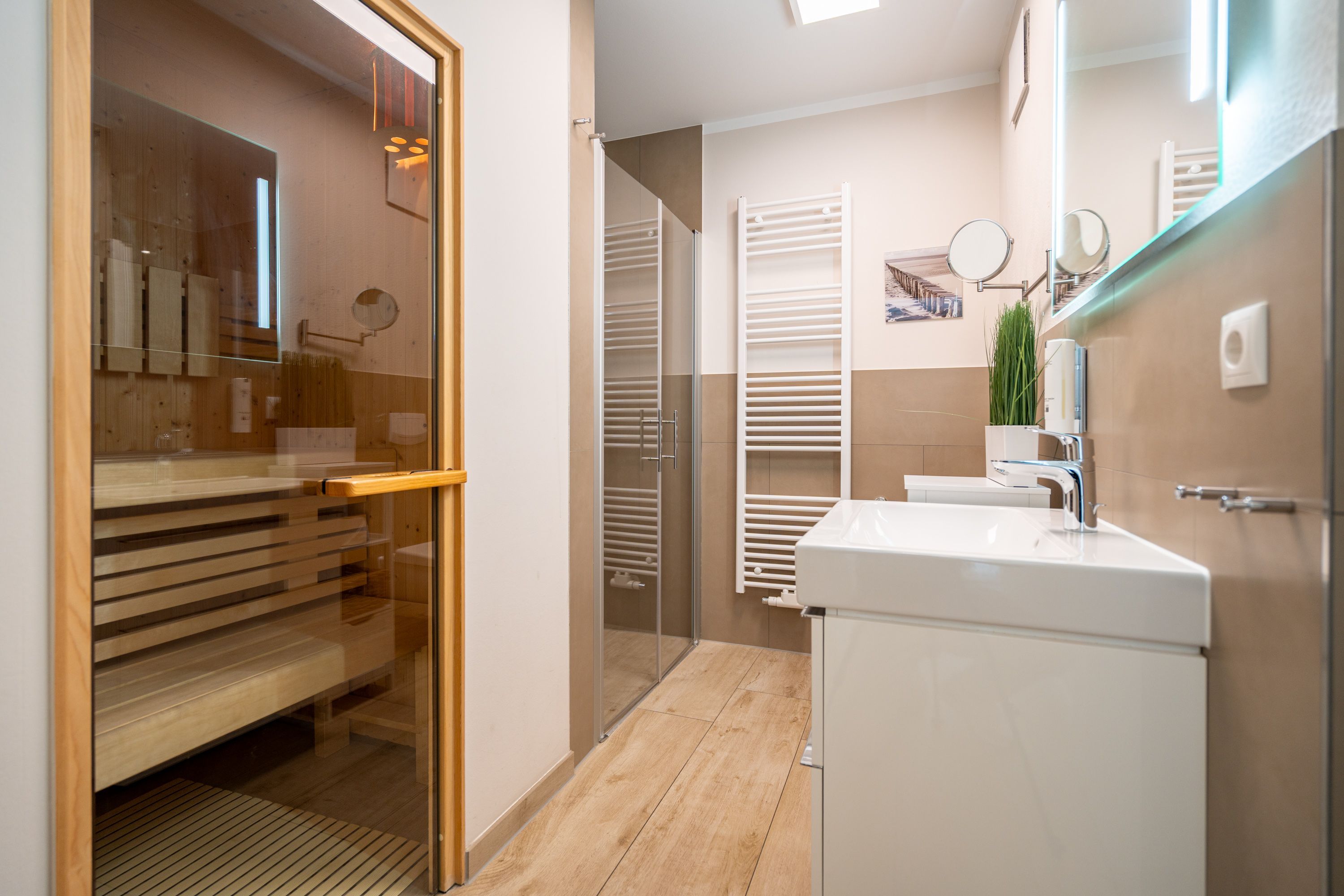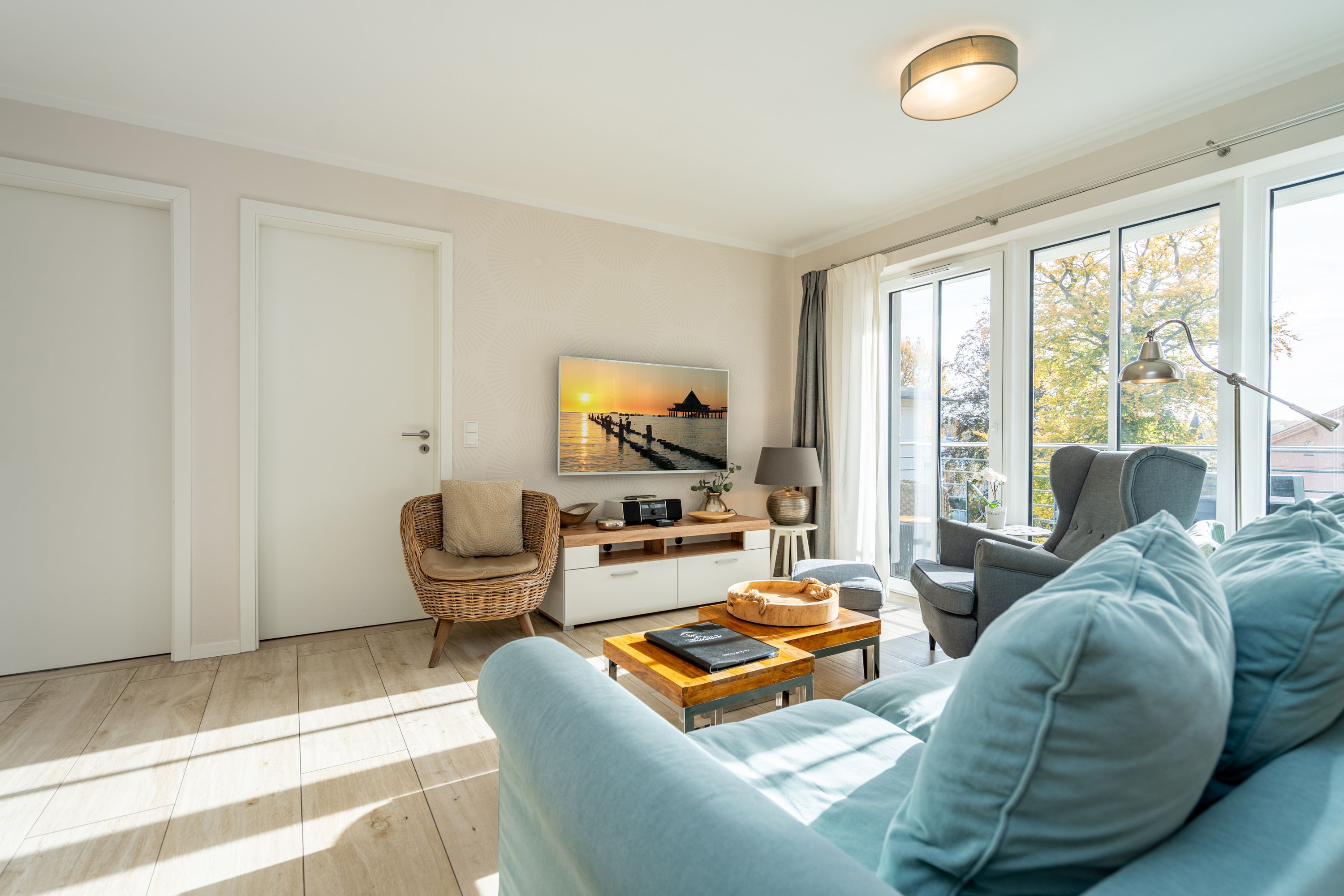 Auf 73 Quadratmetern bietet das Drei-Zimmer-Appartement Nummer 3 im 1. Obergeschoss alles, was man sich für einen entspannten Urlaub an der Ostsee nur wünschen kann. Viel Platz und eine Einrichtung zum Pudelwohlfühlen ein kleines Paradies für bis zu vier Personen wartet auf Sie. Das helle und geräumige Wohn-Esszimmer ist mit viel Geschmack und Zeitgeist eingerichtet. Hier spürt man die Liebe zum Interieur und zum Detail. Nordisches Landhaus-Design durchzieht jeden Raum. Naturmaterialien, ausgesuchte Accessoires und viel Komfort bestimmen die Ausstattung. Ob Sofa, Ohrensessel oder uriger Korbstuhl lassen Sie sich fallen und entspannen Sie einfach mal drauf los. Hier wird es Ihnen sicher leicht fallen. Vom Wohnzimmer gehts auf einen schönen Süd-Balkon. Sonnenhungrige können hier neue Energie tanken. Ob Großer Flat-TV, hochwertige Musikanlage oder Kamin Unterhaltung wird hier zur puren Entspannung. Das offene Wohn-Esszimmer bietet mit seinem großen, runden Tisch und den bequemen Stühlen einen schönen Essplatz für genüssliche und gesellige Stunden. Die offene Küche ist mit allem ausgestattet, das Sie zum Kochen, Braten oder Backen brauchen. Hochwertige Markengeräte sind Ihnen fleißige Küchenhelfer. Vom Backofen, über den Geschirrspüler bis hin zur Kaffeemaschine ist alles da. Zwei Schlafzimmer schenken echtes Schlafvergnügen mit ihren komfortablen Boxspringdoppelbetten (1,80 m x 2,00 m). Ein zweiter Balkon in Ostausrichtung ist von beiden Zimmern aus begehbar. Genießen Sie hier schon morgens die aufgehende Sonne. In jedem Schlafzimmer gibt es einen Flat-TV. Viel Ablagefläche bieten die geräumigen Schränke. Ebenfalls zweifach vorhanden, ist das Badezimmer. Dusche, Waschtisch und WC gehören zur Ausstattung in beiden Räumen. Im Masterbad erwartet Sie darüber hinaus eine Finnische Sauna, in der Sie nach Herzenslust bei kuschelig warmen Temperaturen entspannen können. Handtücher liegen bei Anreise bereit und die Betten sind frisch bezogen. In der Tiefgarage ist für Sie ein Stellplatz reserviert. In dieser Wohnung sind Haustiere nicht erlaubt - jedoch ist diese nicht garantiert allergikerfreundlich.