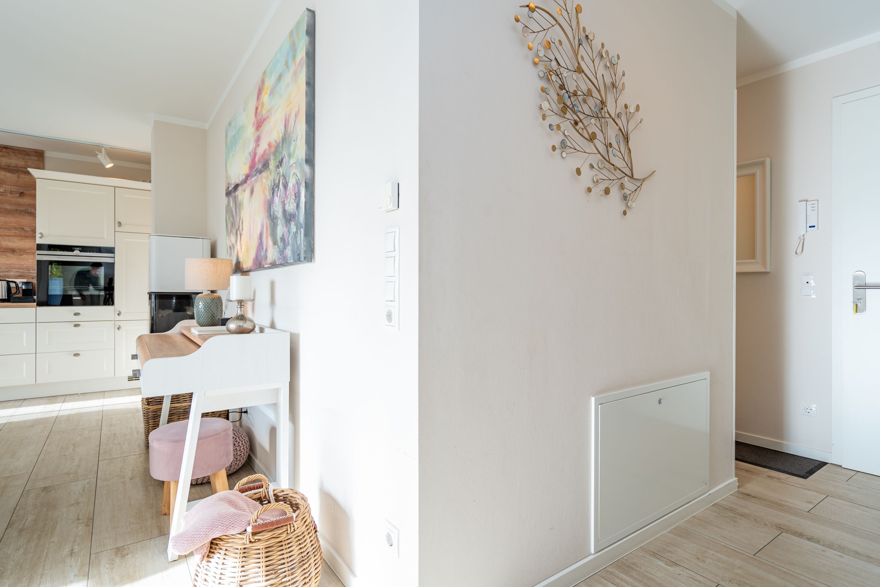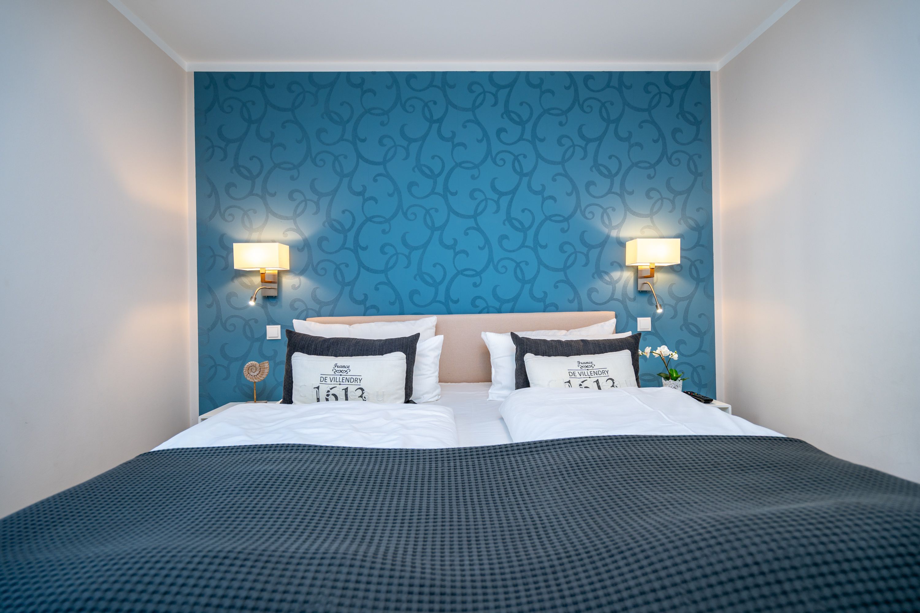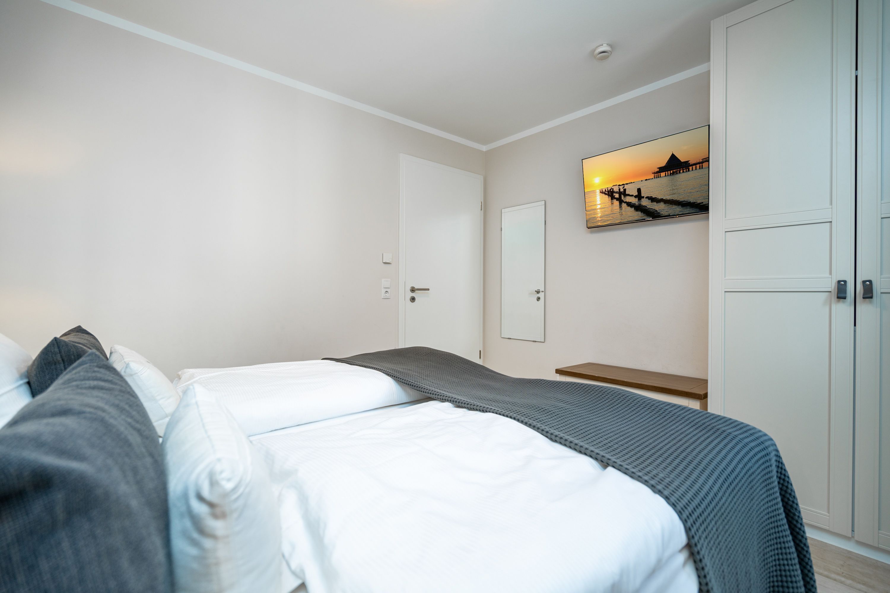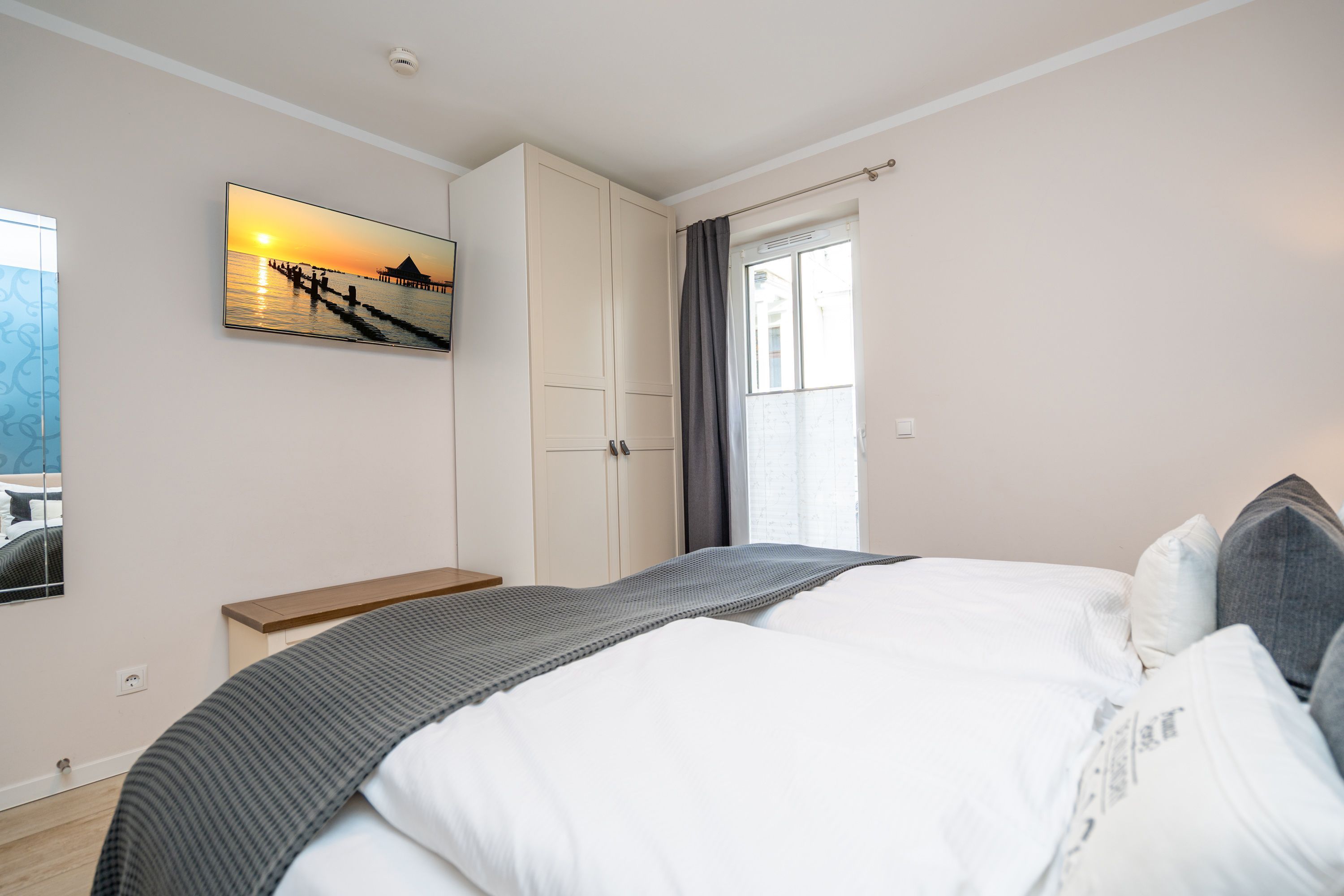 Auf 73 Quadratmetern bietet das Drei-Zimmer-Appartement Nummer 3 im 1. Obergeschoss alles, was man sich für einen entspannten Urlaub an der Ostsee nur wünschen kann. Viel Platz und eine Einrichtung zum Pudelwohlfühlen ein kleines Paradies für bis zu vier Personen wartet auf Sie. Das helle und geräumige Wohn-Esszimmer ist mit viel Geschmack und Zeitgeist eingerichtet. Hier spürt man die Liebe zum Interieur und zum Detail. Nordisches Landhaus-Design durchzieht jeden Raum. Naturmaterialien, ausgesuchte Accessoires und viel Komfort bestimmen die Ausstattung. Ob Sofa, Ohrensessel oder uriger Korbstuhl lassen Sie sich fallen und entspannen Sie einfach mal drauf los. Hier wird es Ihnen sicher leicht fallen. Vom Wohnzimmer gehts auf einen schönen Süd-Balkon. Sonnenhungrige können hier neue Energie tanken. Ob Großer Flat-TV, hochwertige Musikanlage oder Kamin Unterhaltung wird hier zur puren Entspannung. Das offene Wohn-Esszimmer bietet mit seinem großen, runden Tisch und den bequemen Stühlen einen schönen Essplatz für genüssliche und gesellige Stunden. Die offene Küche ist mit allem ausgestattet, das Sie zum Kochen, Braten oder Backen brauchen. Hochwertige Markengeräte sind Ihnen fleißige Küchenhelfer. Vom Backofen, über den Geschirrspüler bis hin zur Kaffeemaschine ist alles da. Zwei Schlafzimmer schenken echtes Schlafvergnügen mit ihren komfortablen Boxspringdoppelbetten (1,80 m x 2,00 m). Ein zweiter Balkon in Ostausrichtung ist von beiden Zimmern aus begehbar. Genießen Sie hier schon morgens die aufgehende Sonne. In jedem Schlafzimmer gibt es einen Flat-TV. Viel Ablagefläche bieten die geräumigen Schränke. Ebenfalls zweifach vorhanden, ist das Badezimmer. Dusche, Waschtisch und WC gehören zur Ausstattung in beiden Räumen. Im Masterbad erwartet Sie darüber hinaus eine Finnische Sauna, in der Sie nach Herzenslust bei kuschelig warmen Temperaturen entspannen können. Handtücher liegen bei Anreise bereit und die Betten sind frisch bezogen. In der Tiefgarage ist für Sie ein Stellplatz reserviert. In dieser Wohnung sind Haustiere nicht erlaubt - jedoch ist diese nicht garantiert allergikerfreundlich.