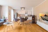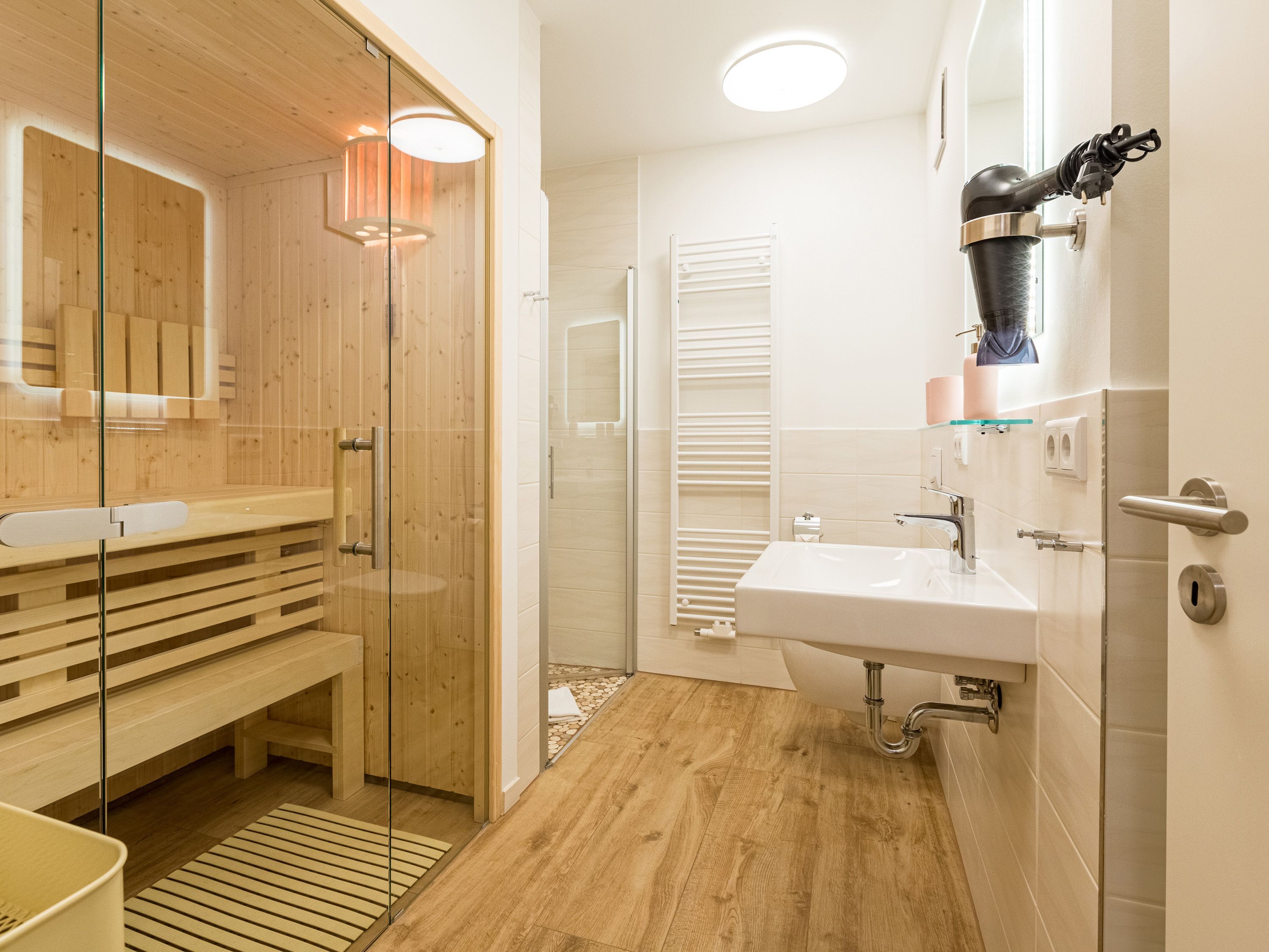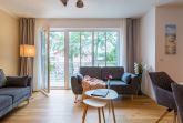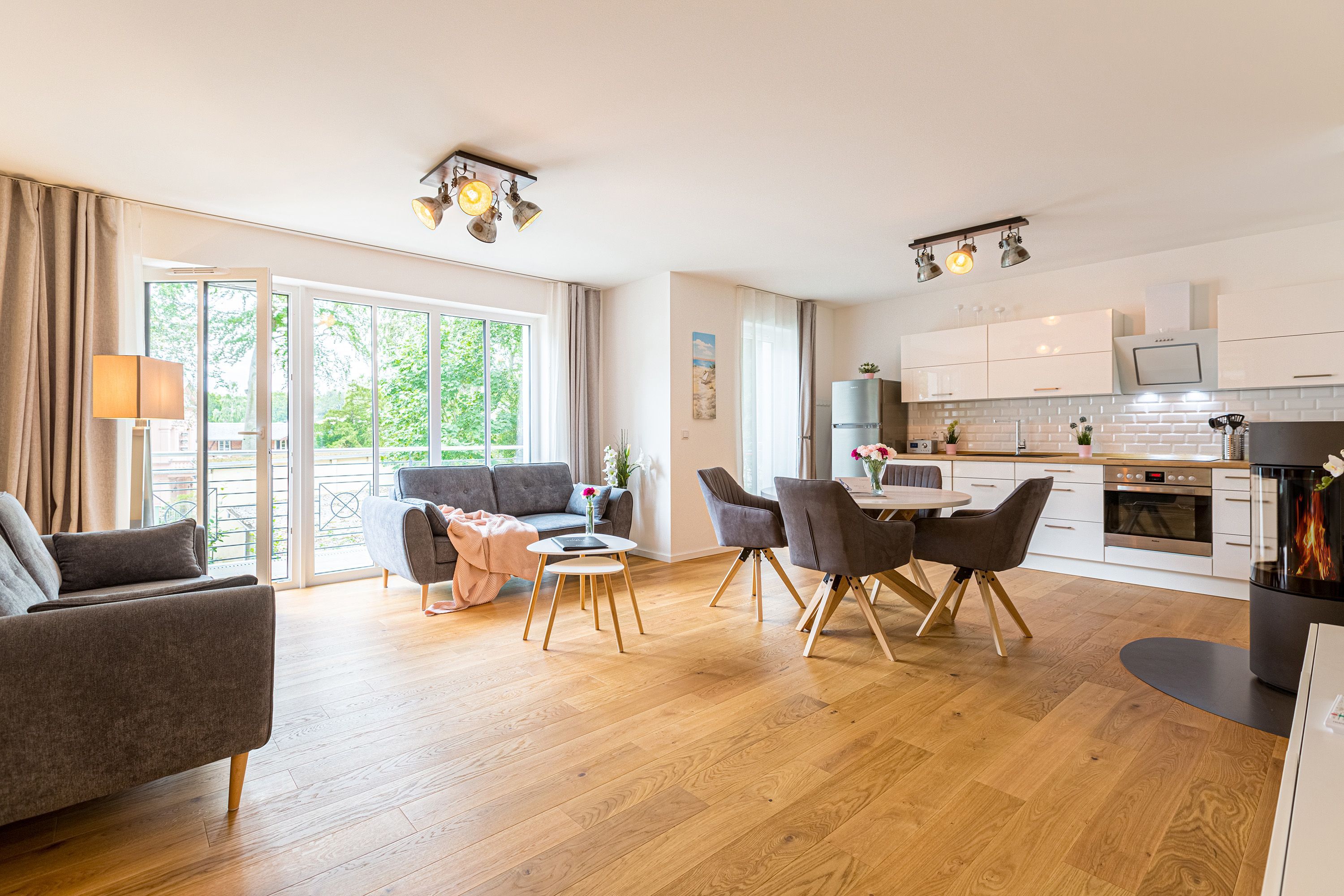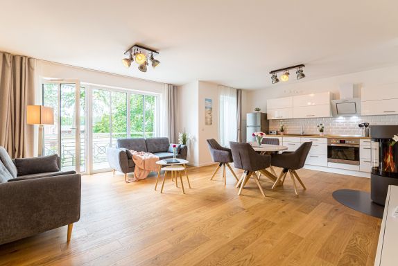 Großzügig, licht und elegant ist dieser Drei-Zimmer-Ferientraum im Erdgeschoss. Das Appartement 1 bietet auf seinen 83 Quadratmetern viel Platz für vier Personen und ein Kleinkind bis zwei Jahre (im Kinderreisebett). Die Einrichtung ist modern, stylisch und ausgewählt. Helle, lichtdurchflutete Räume sorgen für eine harmonische Atmosphäre, in der sich jeder Moment leicht anfühlt. Geben Sie Ihrer Seele und Ihrem Körper einmal wieder Raum und tanken Sie neue Energie auf den komfortablen Nordic Design-Sofas in maritimem Blau, beim Entspannen vor dem großen Flat-TV, einem gemeinsamen Essen in den bequemen Sesseln am schönen Esstisch, beim Blick auf das Flammenspiel des Kamins oder draußen in der Sonne auf einer der beiden Terrassen (5 Quadratmeter und 6 Quadratmeter groß). Die offene Küche ist mit hochwertigen Geräten voll ausgestattet. Im amerikanischen Kühlschrank lässt sich so manche Leckerei unterbringen. Platzprobleme brauchen sie hier wie im gesamten Appartement nicht zu fürchten. Passend zum eleganten Interieur finden Sie in den Küchenschränken stilvolles Geschirr. Hier stimmt einfach alles. Auch in den beiden Schlafzimmern. Schlafvergnügen der Extra-Klasse versprechen die großen Boxspringdoppelbetten (1,80 m x 2,00 m). Flat-TV und ein geräumiger Einbauschrank fehlen natürlich in keinem der beiden Zimmer. Der Wohn- und Schlafbereich ist mit Parkettboden ausgestattet. Für eine entspannte Auszeit stehen zwei Bäder zur Verfügung. Beide haben eine Dusche, ein Waschbecken und ein WC. Eine Waschmaschine gibt es auch. Das Masterbad hält zudem noch ein ganz besonderes Highlight für Sie bereit: eine Finnische Sauna. Graue und triste Tage an der Ostsee gehören damit der Vergangenheit an. Denn was gibt es schöneres, als sich nach einem langen Strandspaziergang im Winter in die wohlige Wärme einer Sauna zu kuscheln. Handtücher liegen bereit und die Betten sind bei Anreise bezogen. Für den Tag am Meer steht Ihnen als besonderes Bonbon von Mitte Mai bis Ende September (je nach Witterung) ein Strandkorb am Strand kostenlos zur Verfügung. Sie brauchen also nur noch Ihr Auto in der Tiefgarage abstellen und loslassen.