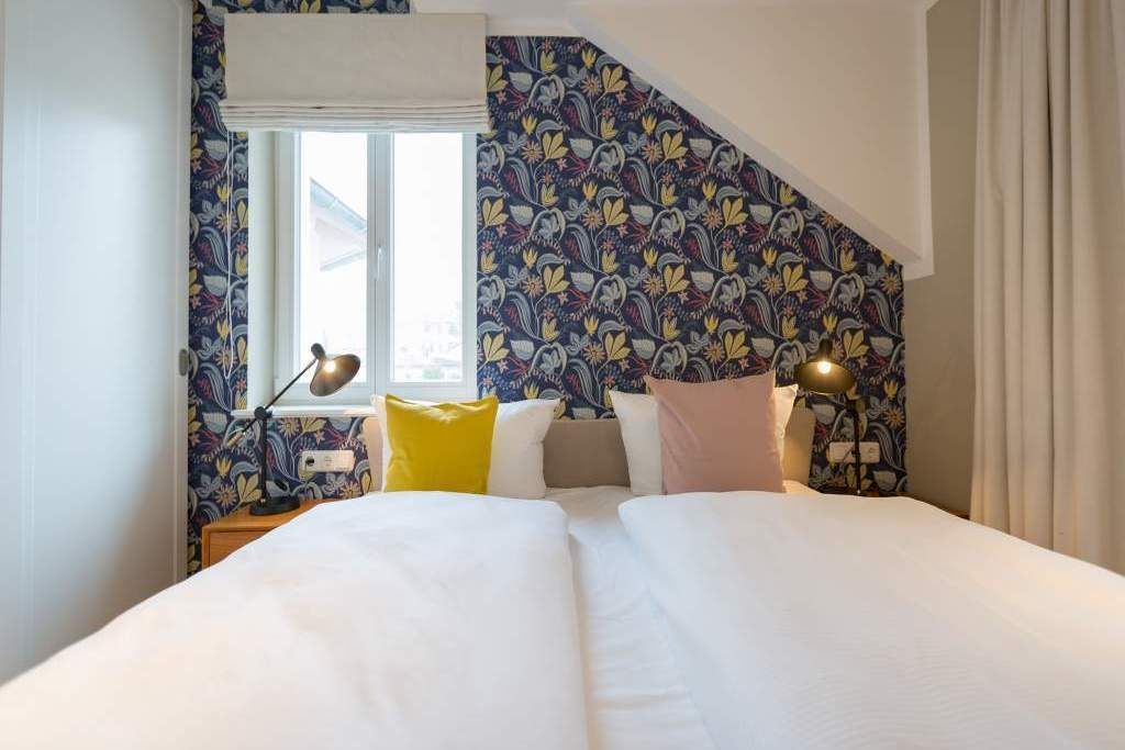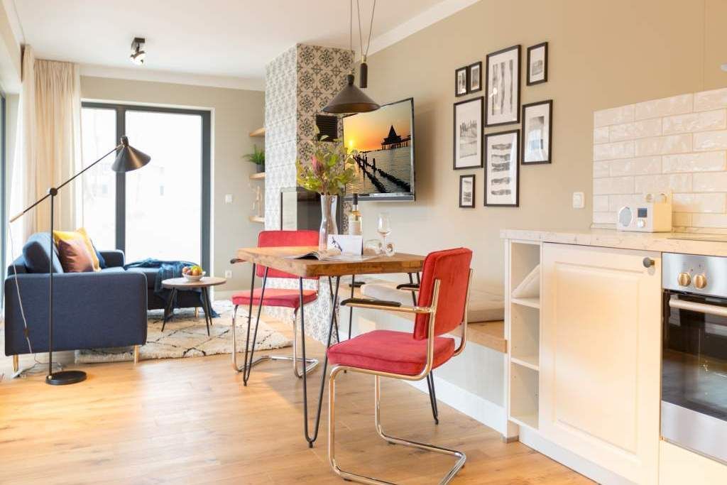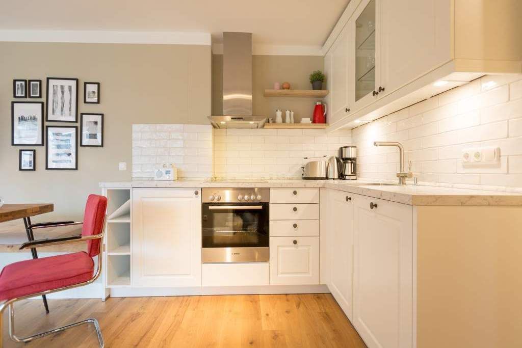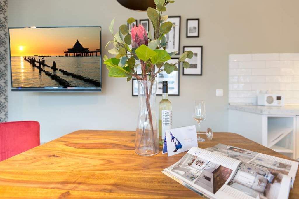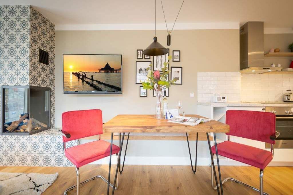 Endlich einmal wieder Zeit zu zweit oder einfach nur für sich dieses kleine und kuschelige Urlaubsparadies im Dachgeschoss der Villa Bellevue ist der ideale Ort, auszuspannen und sich zu erholen. Das Zwei-Zimmer-Appartement bietet mit seinen 50 Quadratmetern Platz für zwei Personen. Hell und stilvoll von einer Innenarchitektin konzipiert, sind der Stress und die Hektik des Alltags binnen kurzer Zeit vergessen. Vom ausgewogenen Farbkonzept bis zu den Design-Möbeln ist alles harmonisch aufeinander abgestimmt. Der offene Wohn-Essbereich lädt mit einer gemütlichen Sofalandschaft zum Loslassen ein. Ein wunderschöner Gas-Kamin mit Vintage-Fliesenoptik spendet an kühlen Abenden und stürmischen Tagen Wärme und Geborgenheit. Ganze 42 Zoll misst der Flat-TV. Vom Wohnzimmer aus haben Sie Zugang zum Balkon. Was gibt es schöneres als unter freiem Himmel in der Morgensonne zu frühstücken. Zum Essen können Sie sich natürlich an den schönen Echtholztisch mit den trendig roten Freischwingern setzen. Die Küche ist mit allem ausgestattet, was Sie zur Zubereitung eines genussvollen Menü benötigen könnten inklusive elegantem Geschirr. Vergnügen bereitet das große und komfortable Boxspringdoppelbett (1,80 m x 2,00 m) im Schlafzimmer. Viel Platz für die Urlaubsgarderobe bietet hier der hochwertige Einbauschrank. Das Badezimmer verfügt über eine geräumige Dusche, einen Waschtisch und ein WC. Die Handtücher liegen bei der Anreise bereit und die Betten sind bezogen. Das WLAN ist kostenfrei. Für Ihr Auto gibt es am Haus einen Stellplatz.