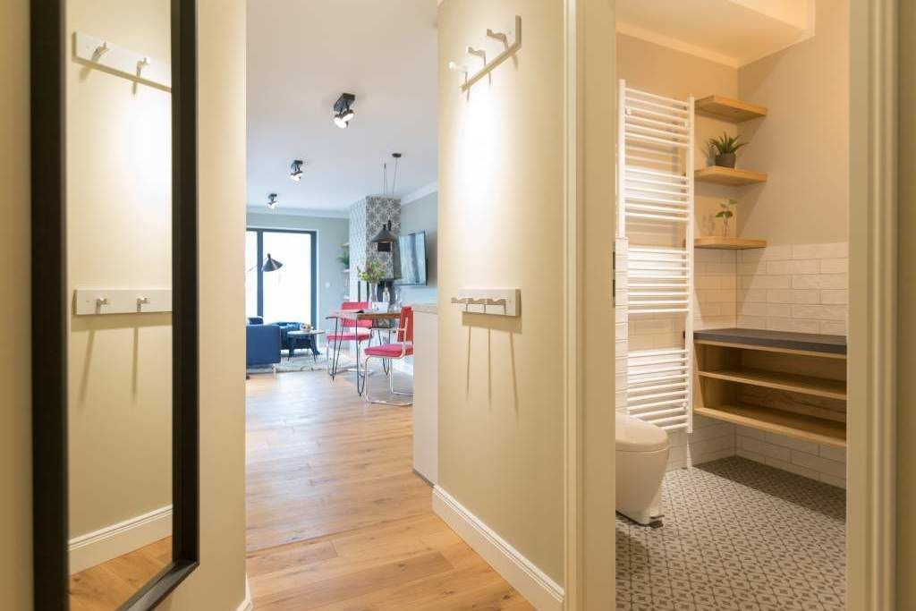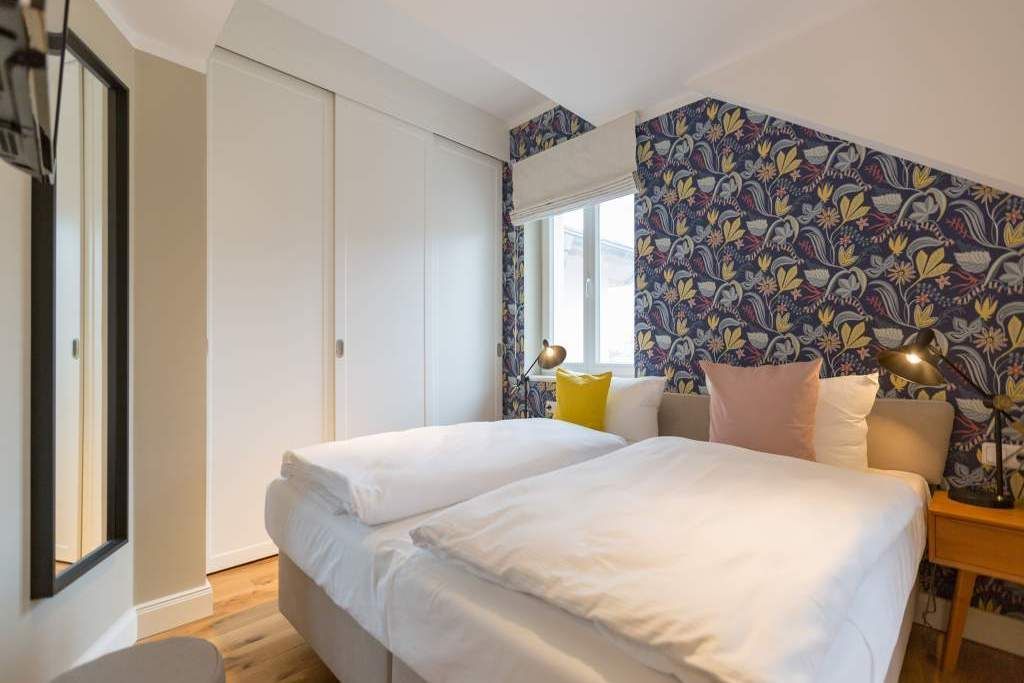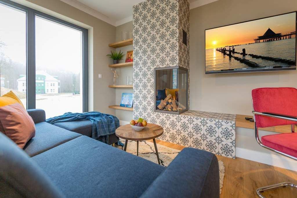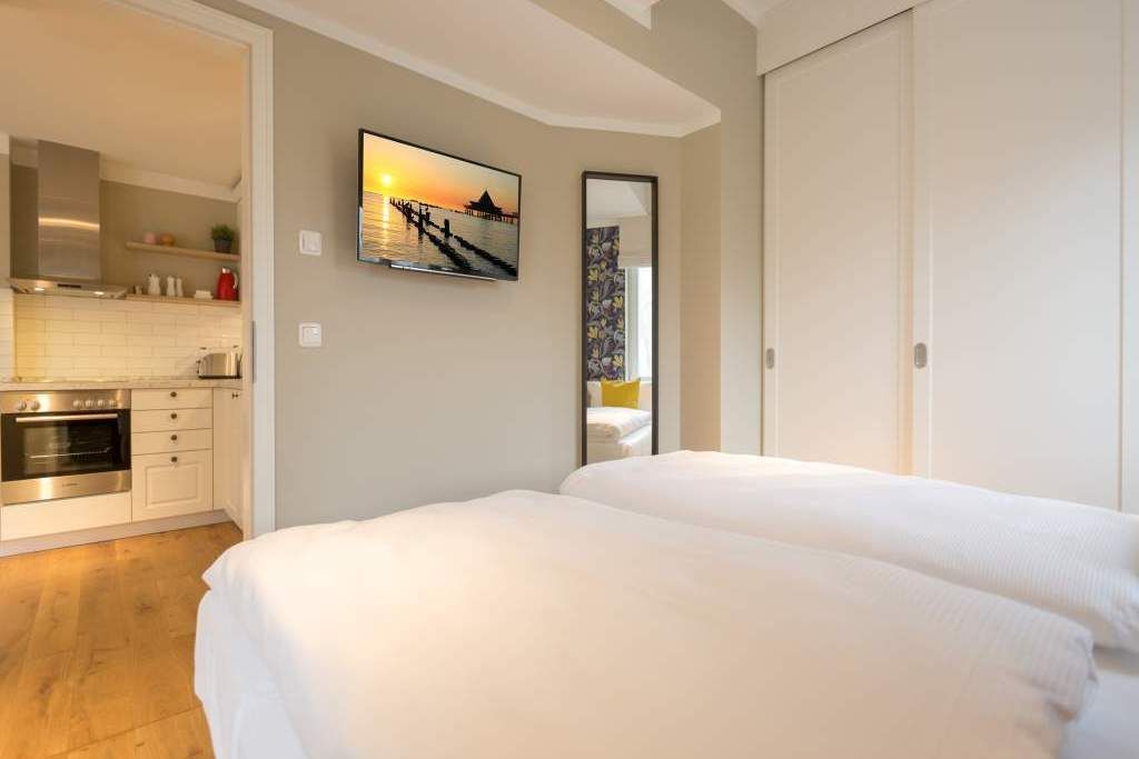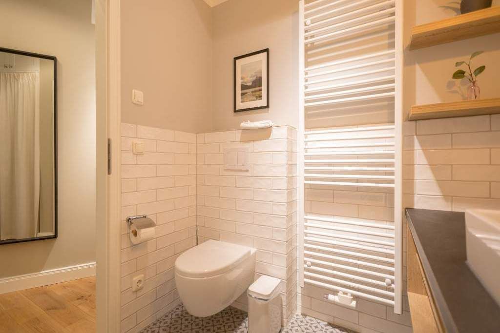 Endlich einmal wieder Zeit zu zweit oder einfach nur für sich dieses kleine und kuschelige Urlaubsparadies im Dachgeschoss der Villa Bellevue ist der ideale Ort, auszuspannen und sich zu erholen. Das Zwei-Zimmer-Appartement bietet mit seinen 50 Quadratmetern Platz für zwei Personen. Hell und stilvoll von einer Innenarchitektin konzipiert, sind der Stress und die Hektik des Alltags binnen kurzer Zeit vergessen. Vom ausgewogenen Farbkonzept bis zu den Design-Möbeln ist alles harmonisch aufeinander abgestimmt. Der offene Wohn-Essbereich lädt mit einer gemütlichen Sofalandschaft zum Loslassen ein. Ein wunderschöner Gas-Kamin mit Vintage-Fliesenoptik spendet an kühlen Abenden und stürmischen Tagen Wärme und Geborgenheit. Ganze 42 Zoll misst der Flat-TV. Vom Wohnzimmer aus haben Sie Zugang zum Balkon. Was gibt es schöneres als unter freiem Himmel in der Morgensonne zu frühstücken. Zum Essen können Sie sich natürlich an den schönen Echtholztisch mit den trendig roten Freischwingern setzen. Die Küche ist mit allem ausgestattet, was Sie zur Zubereitung eines genussvollen Menü benötigen könnten inklusive elegantem Geschirr. Vergnügen bereitet das große und komfortable Boxspringdoppelbett (1,80 m x 2,00 m) im Schlafzimmer. Viel Platz für die Urlaubsgarderobe bietet hier der hochwertige Einbauschrank. Das Badezimmer verfügt über eine geräumige Dusche, einen Waschtisch und ein WC. Die Handtücher liegen bei der Anreise bereit und die Betten sind bezogen. Das WLAN ist kostenfrei. Für Ihr Auto gibt es am Haus einen Stellplatz.