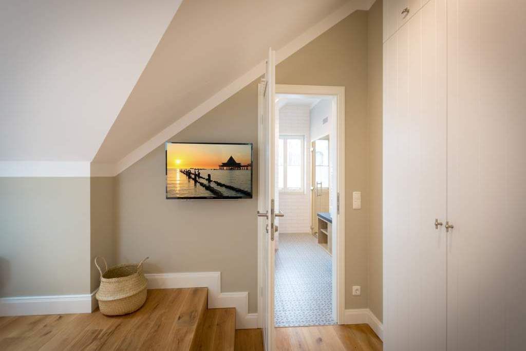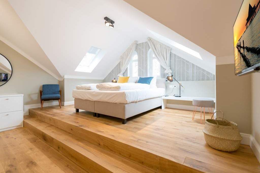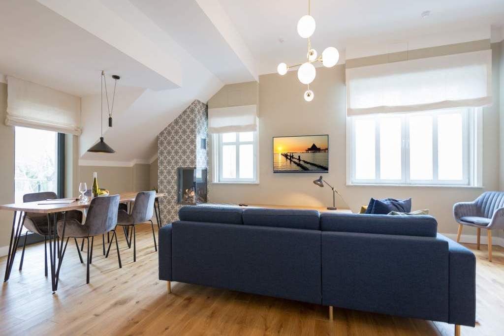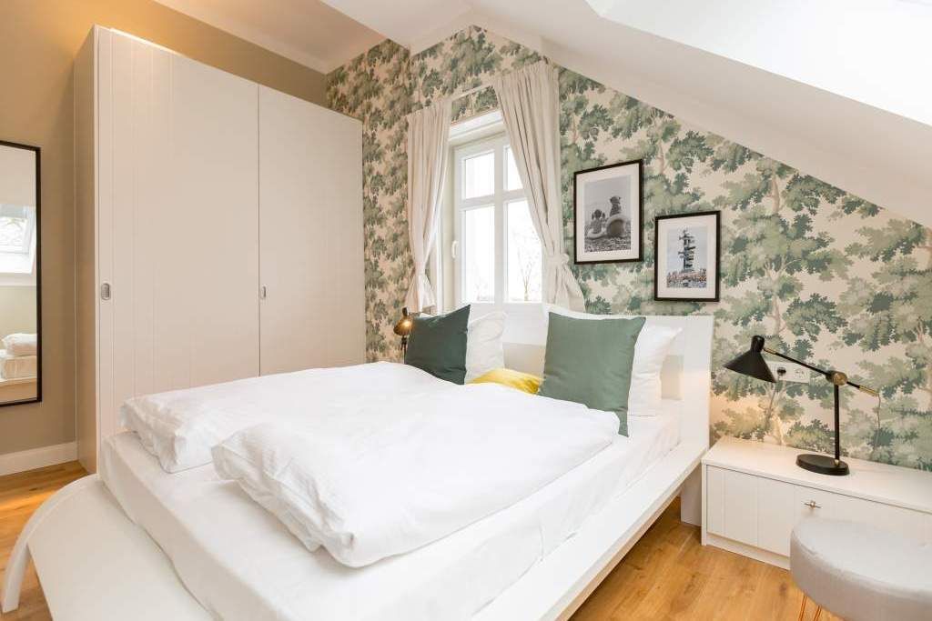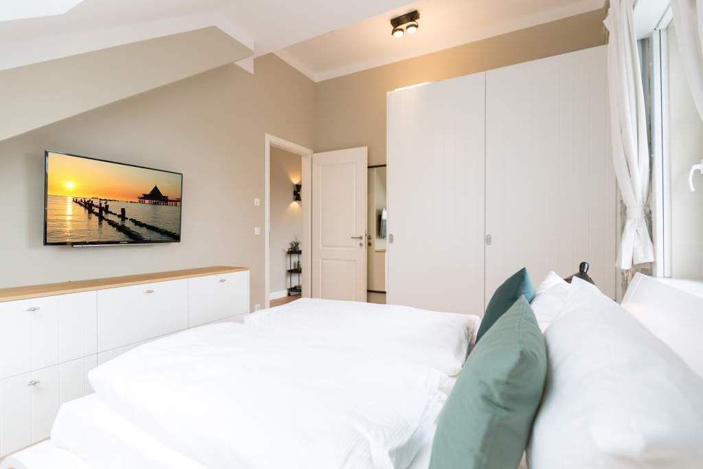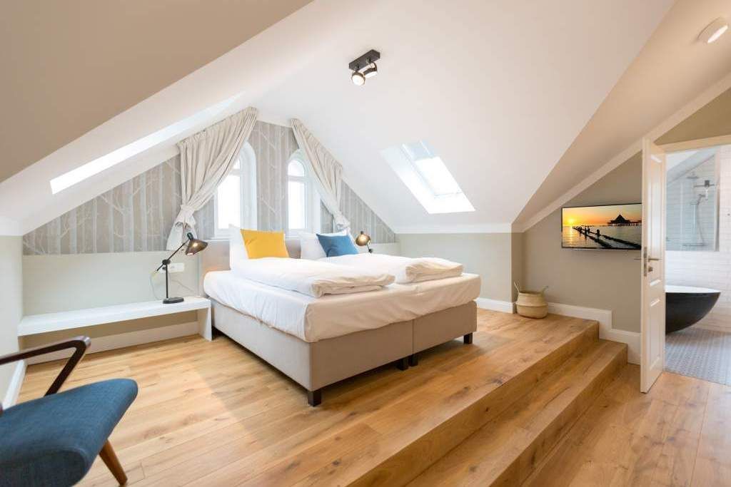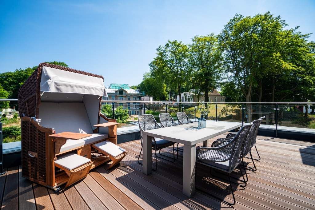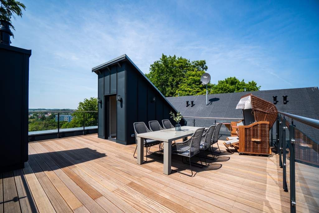 Sie wünschen sich mit Ihrer Familie oder Ihren Freunden eine wirklich exklusive Auszeit mitten im Herzen des Kaiserbades Heringsdorf? Ein Urlaubsdomizil der Extra-Klasse ist die Wohnung 7 im Dachgeschoss der aufwendig sanierten Bädervilla Bellevue. Hier werden Ferienträume wahr! Denn dieser stilvoll eingerichtete Wohntraum bietet auf seinen großzügigen 153 Quadratmetern Raum für vier Erwachsene und zwei Kinder bis drei Jahre (im Kinderreisebett). Jetzt müssen Sie sich nur noch einig werden, wer wo schläft. Denn das Drei-Raum-Appartement wartet mit zwei wunderschönen Schlafzimmern auf. Durch zwei große Flügeltüren gelangt man in das erste Schlafreich. Ein wenig erhöht, auf einem Podest wartet ein komfortables Boxspringdoppelbett (1,80 m x 2,00 m) darauf, Ihnen erholsames Schlafvergnügen zu bereiten. Wie ein Himmel öffnet sich über dem Bett der Giebel bis ins Dach hinein. Von diesem Zimmer aus haben Sie Zugang zum luxuriösen Masterbad. Die wunderschöne Vintagefliesen-Optik, eine frei stehende Badewanne in extravagantem Ei-Design, eine äußerst geräumige Dusche und die Panorama-Sauna definieren den Begriff Wellness neu. Auch das zweite Schlafzimmer ist elegant und exquisit eingerichtet. In dem schicken und bequemen Designer-Doppelbett (1,60 m x 2,00 m) macht nicht nur das Schlafen Spaß. Eine edle Tapete und die hellen Möbel verleihen dem Zimmer ein elegantes Flair. Ein zweites Bad ebenfalls mit Dusche, Waschtisch und WC ausgestattet sorgt für ein entspanntes Frischmachen. Der Wohnbereich ist eine Oase für Entspannungshungrige und Auszeitfreunde. Offen, hell und geschmackvoll designt hier stimmt alles. Angefangen von der großen Sofalandschaft, über die Mid-Century-Design-Klassiker, den schönen, großen Echtholztisch und den von Vintagefliesen eingerahmten Gas-Kamin bis hin zur stylischen und modernen Küche. Hochwertige Geräte und feinstes ASA-Geschirr machen das Kochen und gemeinsame Essen zu einem Erlebnis. In lockerer Atmosphäre können Sie sich am frei stehenden Küchentresen mit Barhockern unterhalten. Entertainment bietet zudem der 42-Zoll-Flat-TV. An das Wohnzimmer angeschlossen ist ein sonnenüberfluteter West-Balkon. Doch wenn Sie richtig Sonne tanken wollen, dann steigen Sie bitte aufs Dach. Über dem Appartement erstreckt sich eine 56 Quadratmeter große Dachterrasse. Hier oben, mit einem grandiosen Blick über die Dächer der schönen Bädervillen des Kulmbergs, vergessen Sie in Windeseile jede Hektik, jeden Stress. Sonnenbaden oder Dinieren beides ist hier möglich. Zur Wohnung gehören außerdem 2 Pkw-Stellplätze dazu. Das WLAN ist kostenfrei nutzbar. Und damit Sie sich wirklich um nichts zu kümmern brauchen, sind die Betten bei der Anreise bezogen und Handtücher liegen bereit.